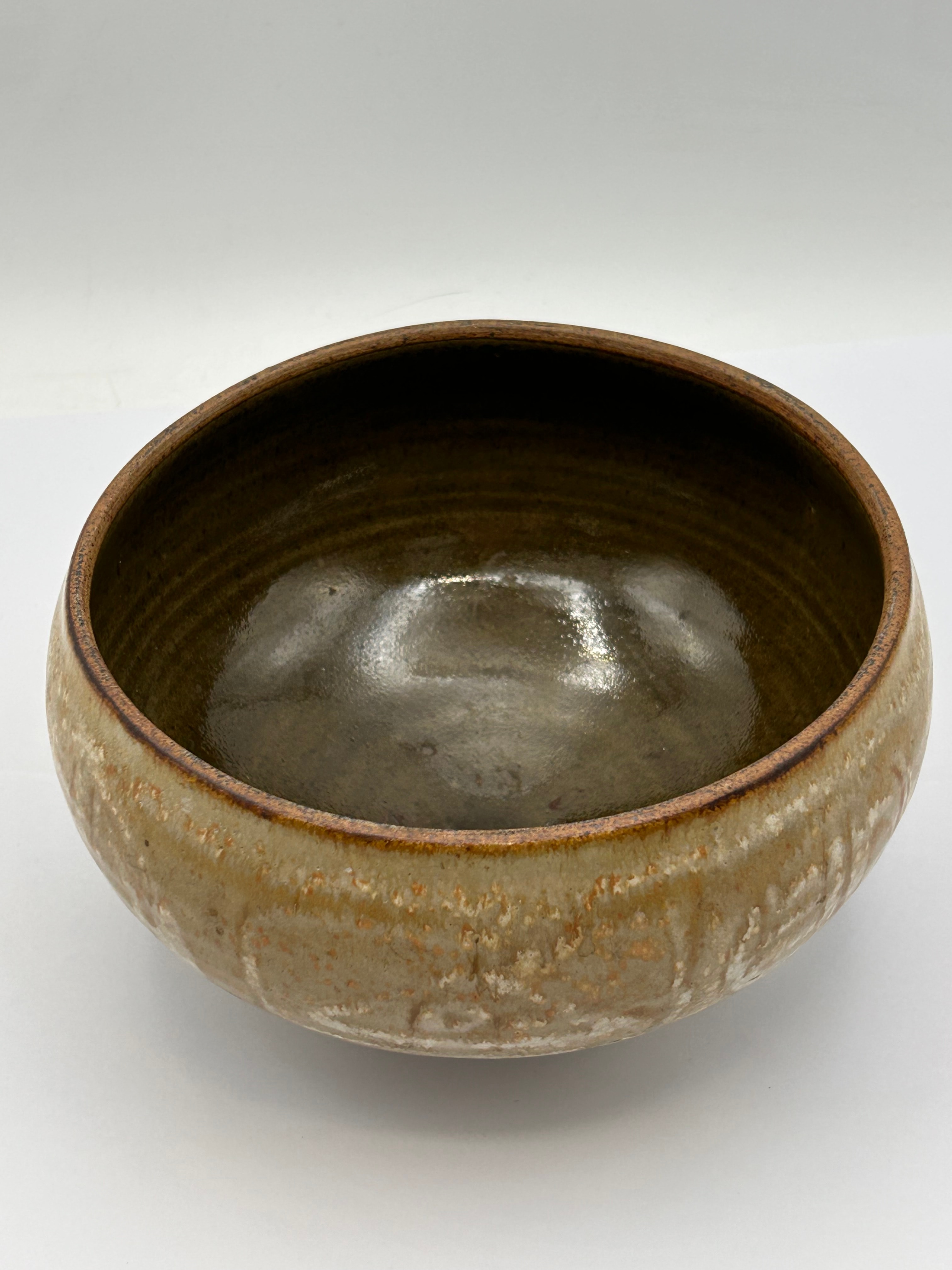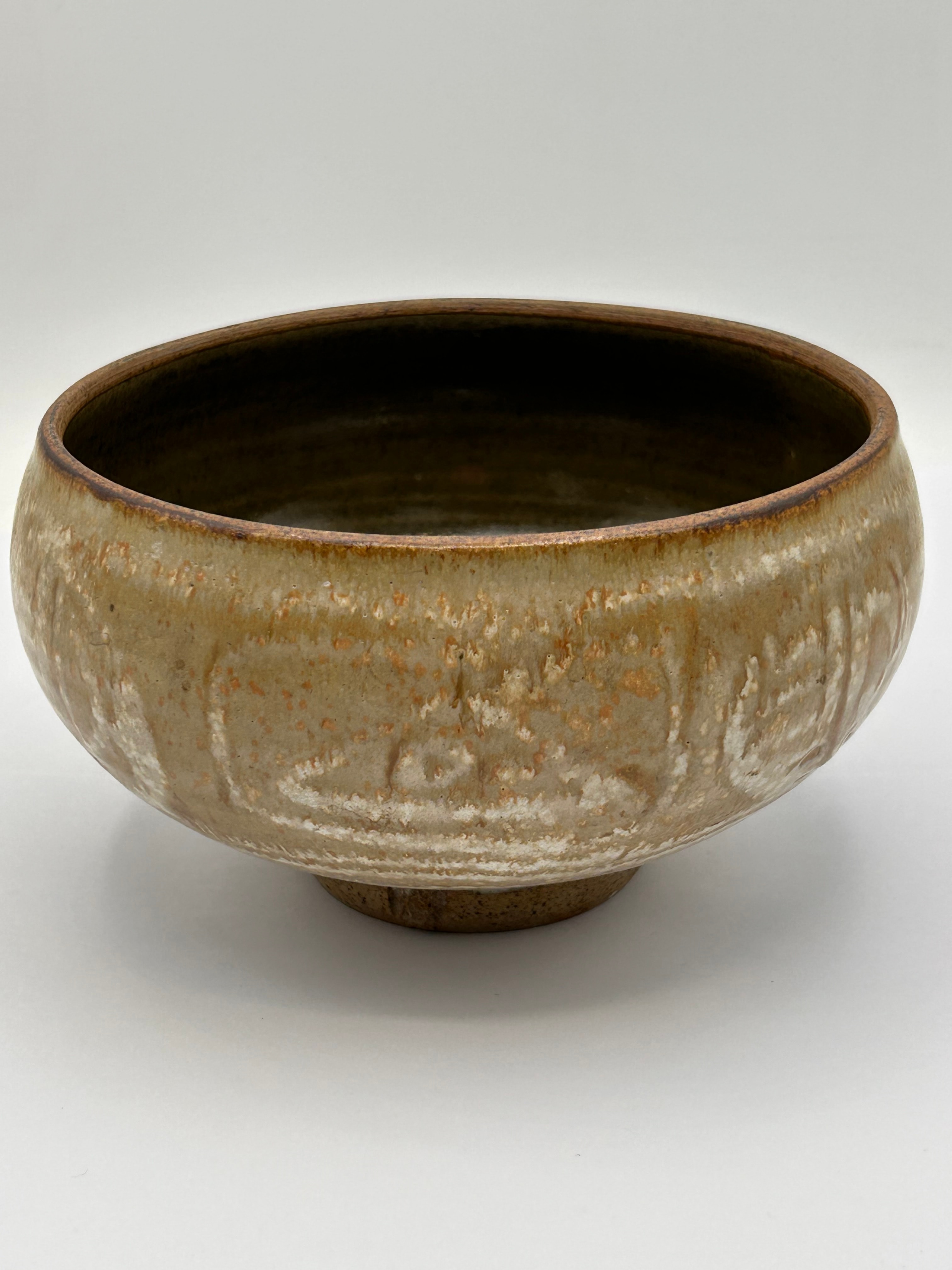 A ceramic stoneware bowl featuring a wide mouth and a gently tapering body set on a recessed foot. The exterior is adorned with a multi-tonal, textured glaze in shades of earthy beige, cream, and russet brown, exhibiting vertical drips and speckling characteristic of studio pottery. The interior features a contrasting dark, glossy brown glaze with visible throwing lines. An impressed maker’s mark, resembling stylized initials or a chop, is present on the lower exterior.