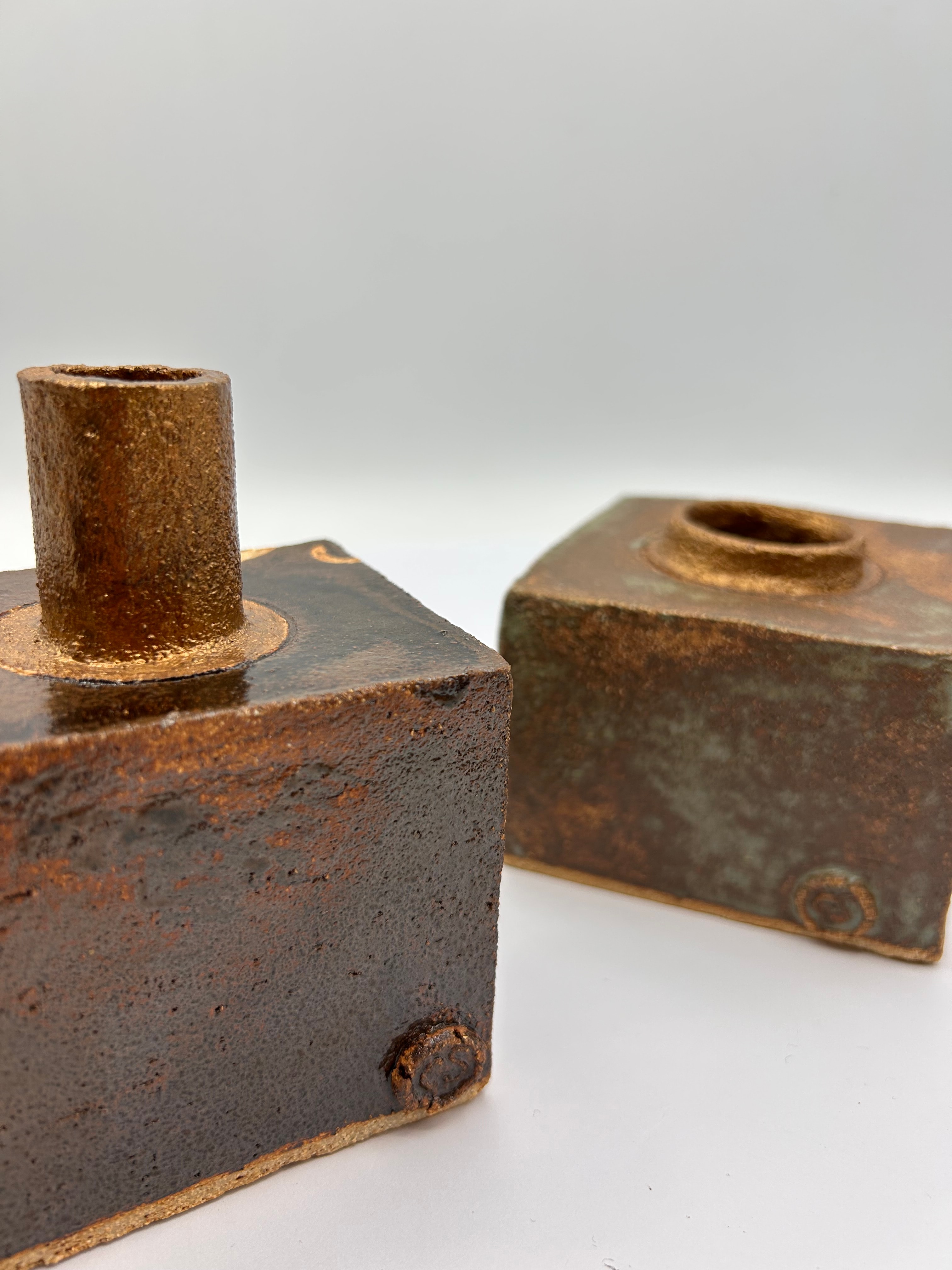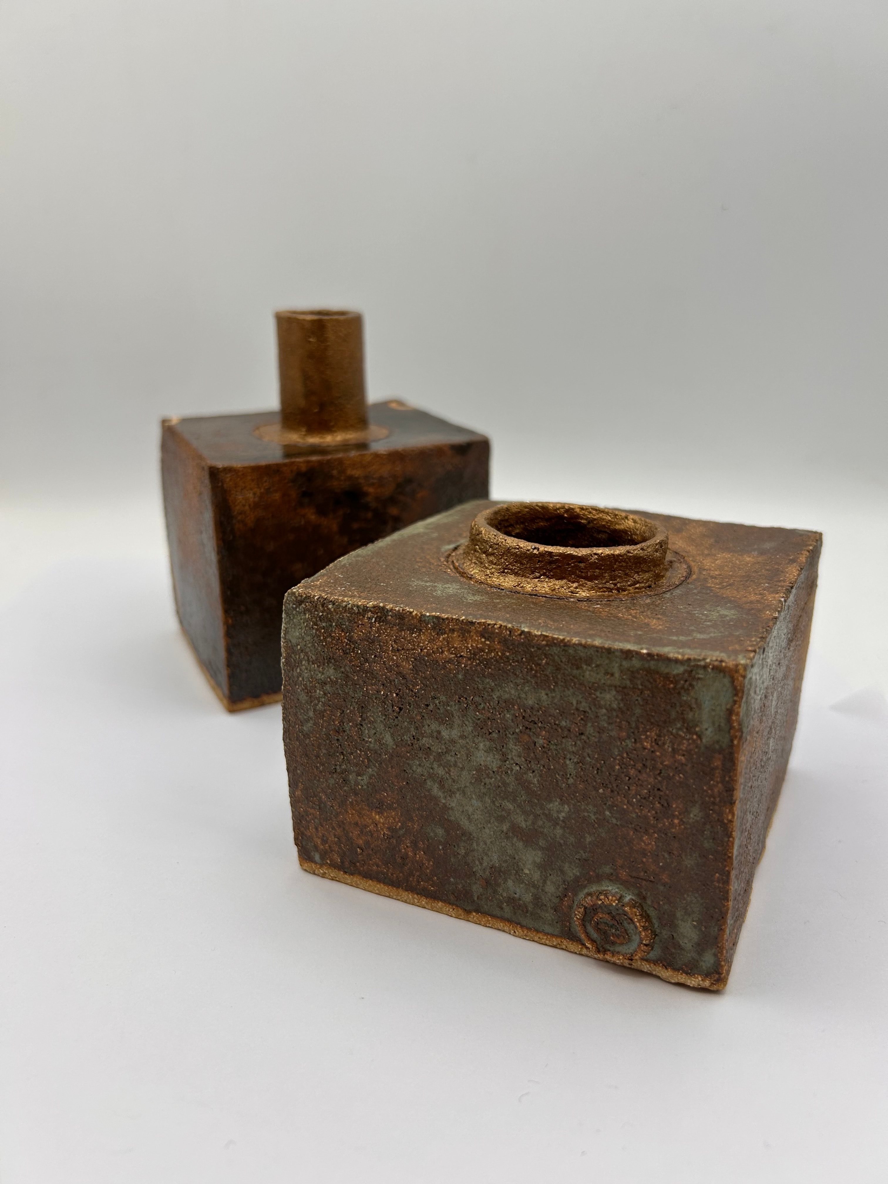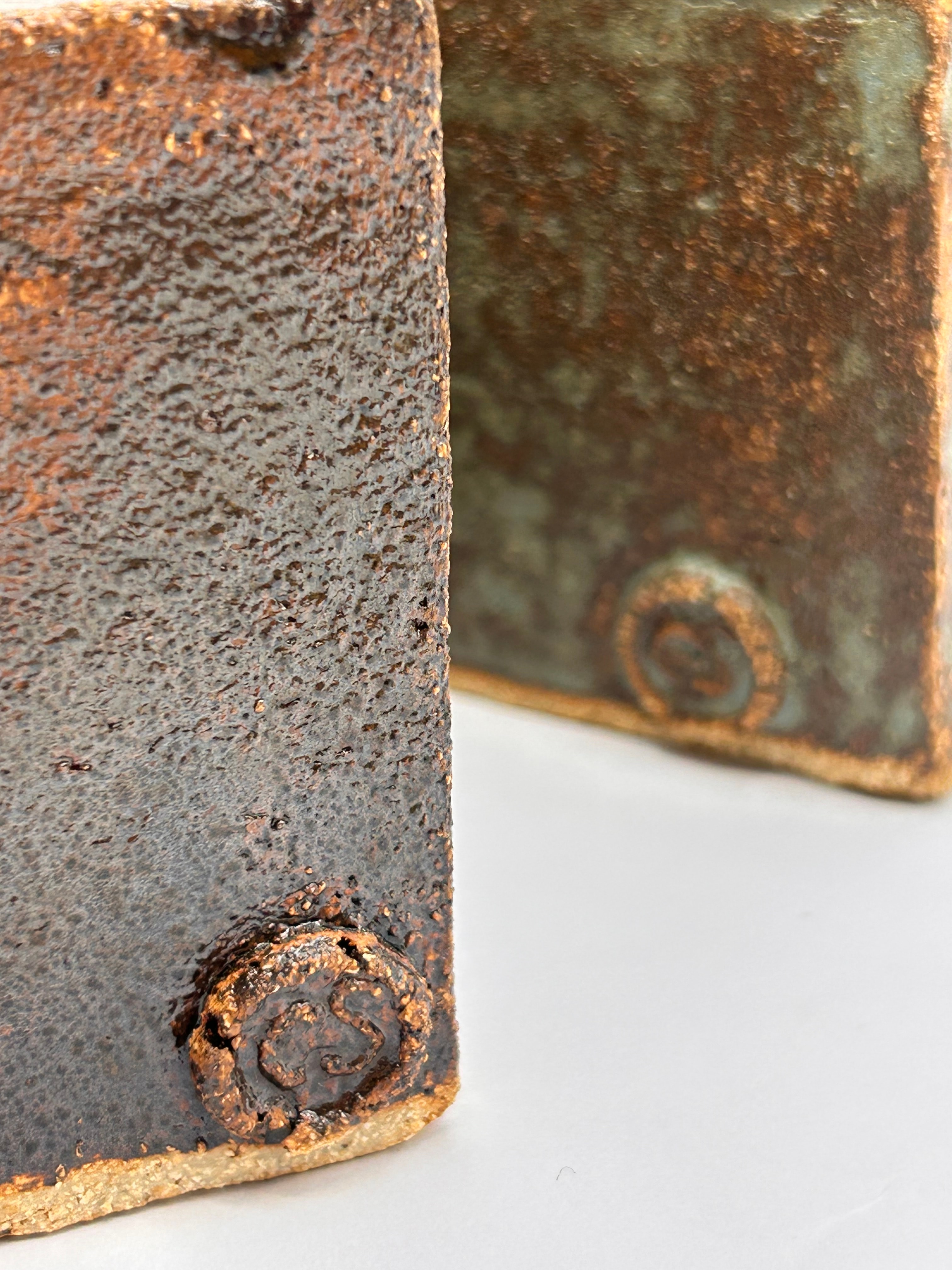 A pair of Mid-20th Century Brutalist ceramic vases. These square-form vessels are characterized by a handcrafted, studio pottery style. They feature a coarse, unrefined clay body finished with a variegated, textured glaze exhibiting rich tones of dark brown, bronze, and muted green/blue, giving a somewhat granular or bubbly surface. Each vessel is designed with a central cylindrical opening at the top; one is significantly taller and narrower, the other shorter and wider. An impressed circular maker’s mark, resembling a stylized ‘S’ or an abstract symbol, is visible on the lower front corner of both pieces.