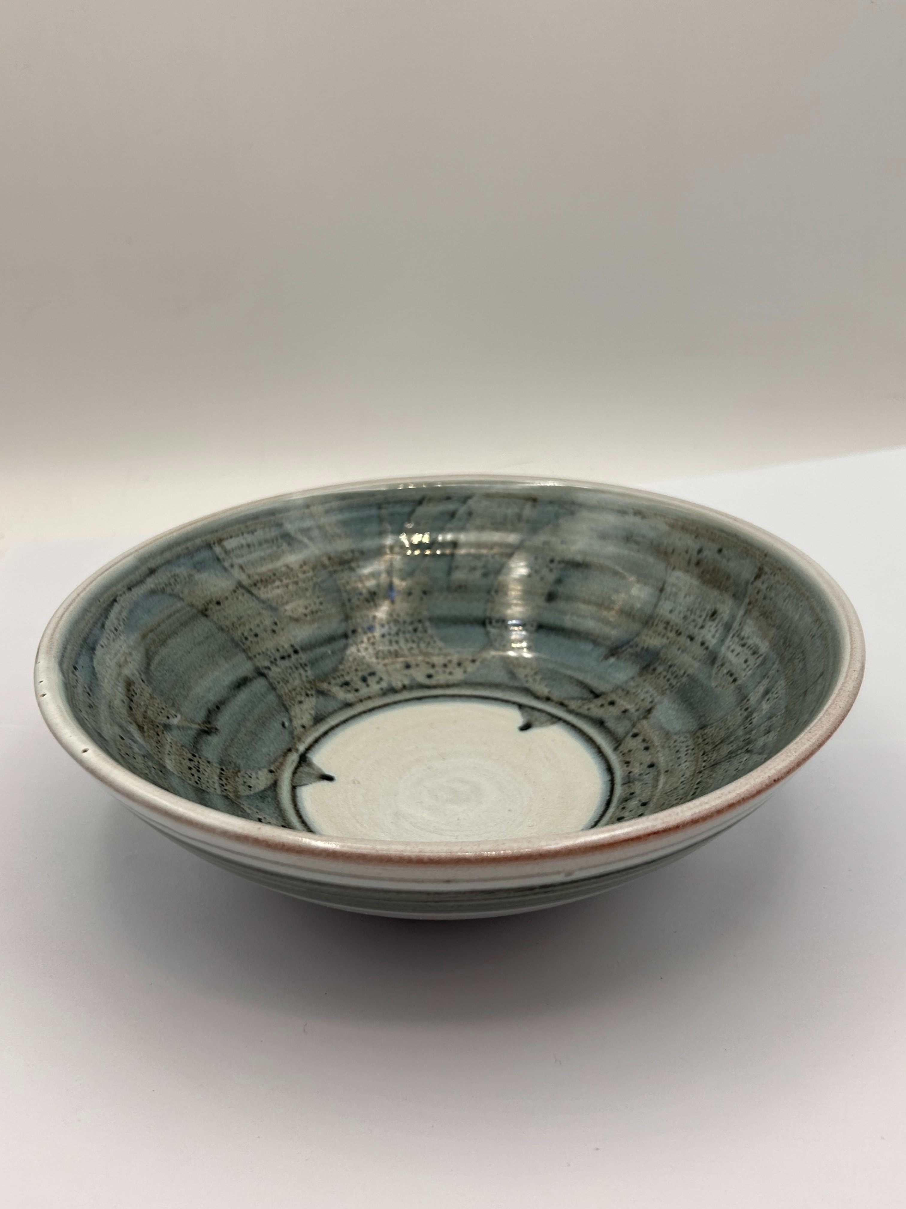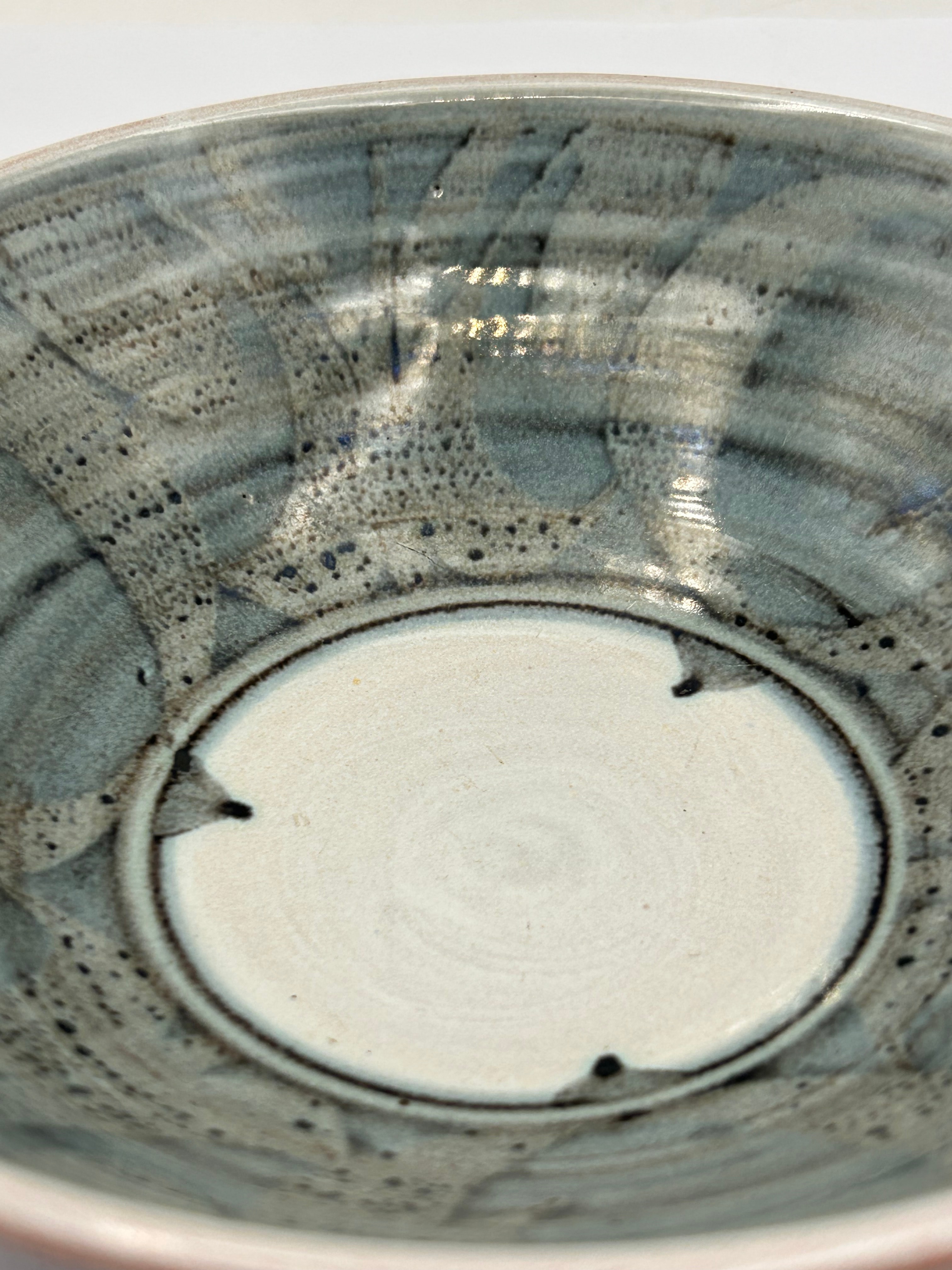 A studio pottery bowl, featuring an unglazed reddish-brown rim and base. The interior is glazed with a mottled blue-grey and speckled black pattern, showcasing visible brushwork, surrounding a lighter off-white circular center with concentric lines and four small black marks. The underside bears a distinct black, stylized ‘PR’ signature or artist’s mark, along with a faint blue circular smudge.