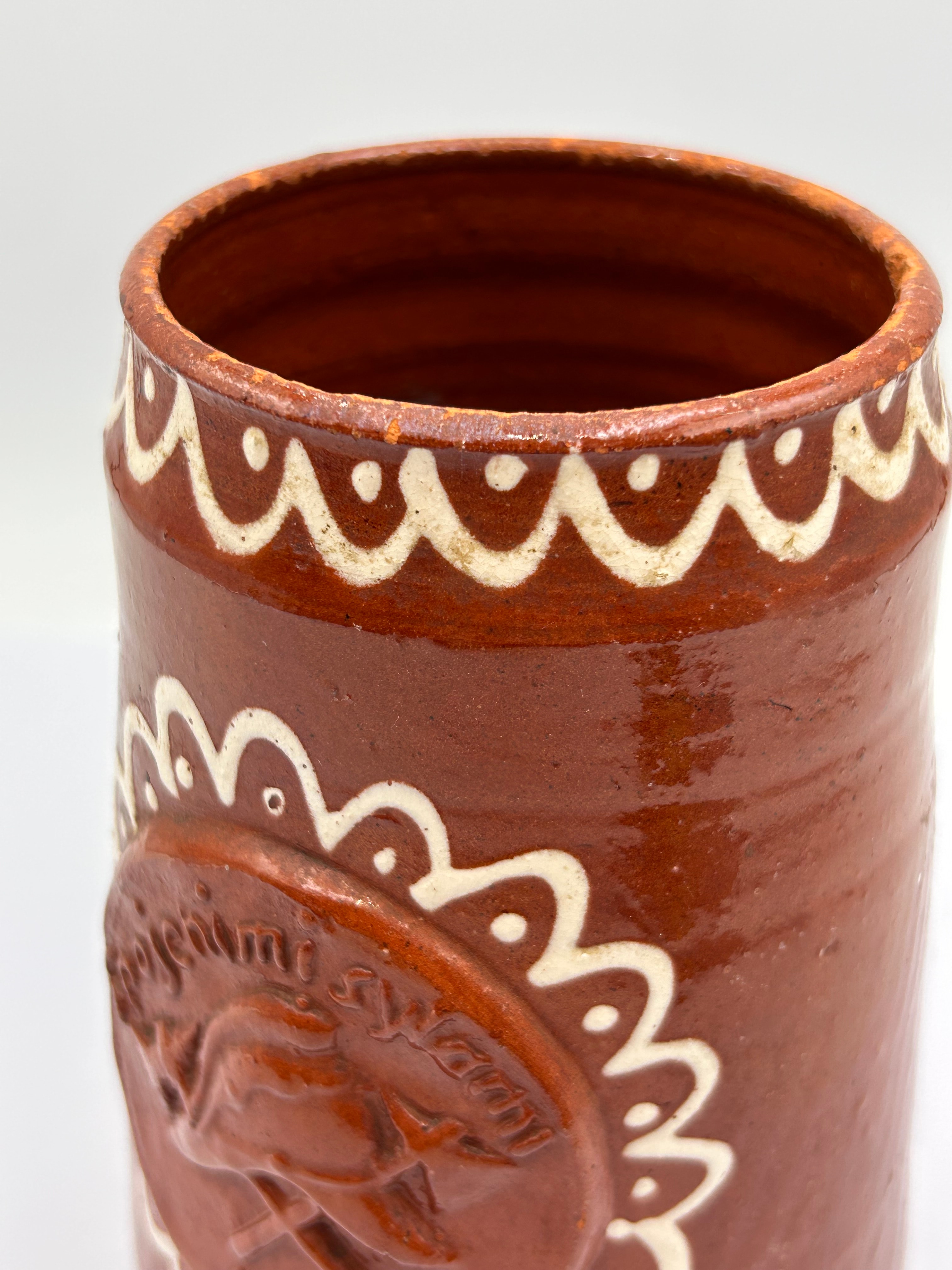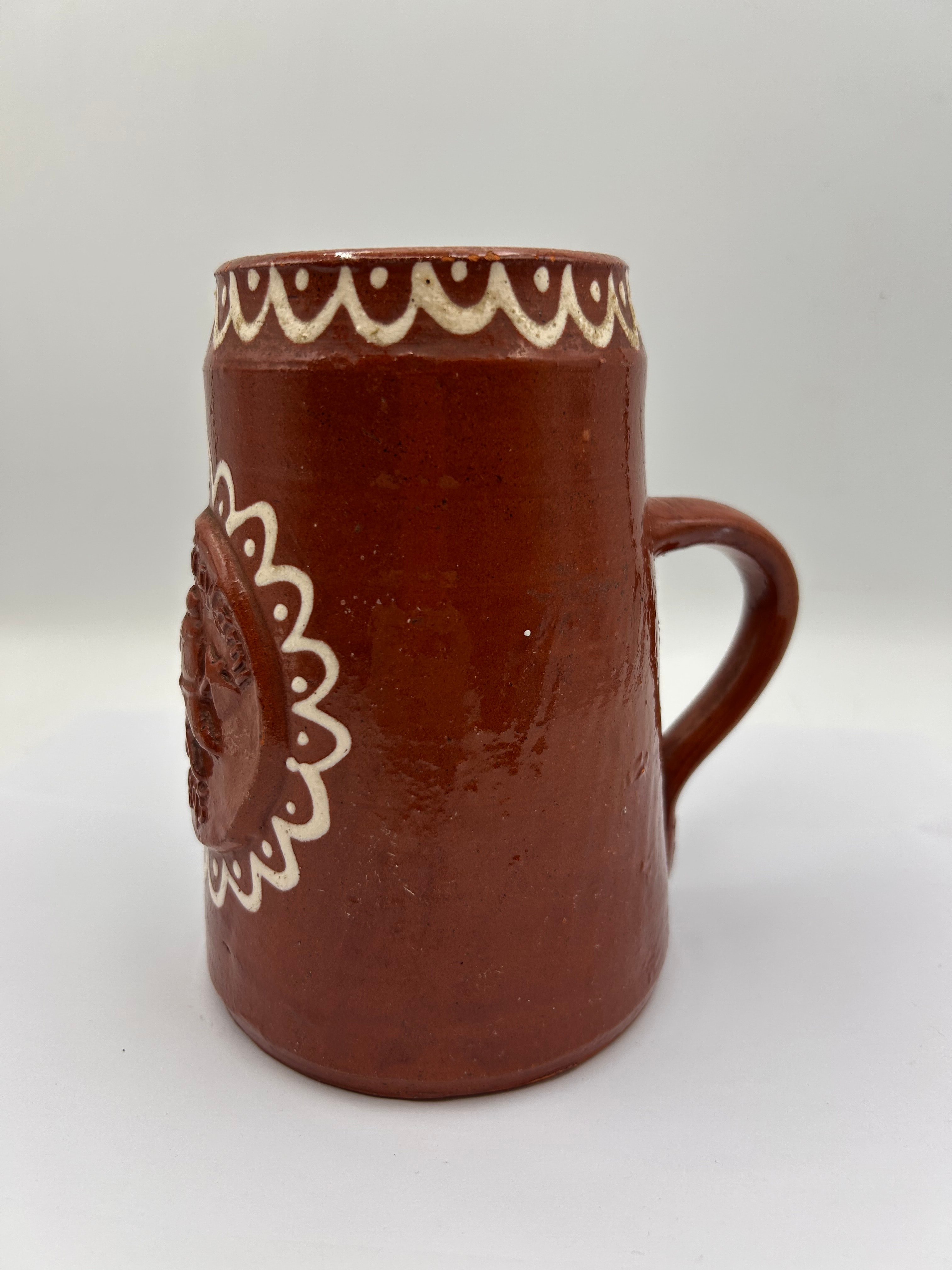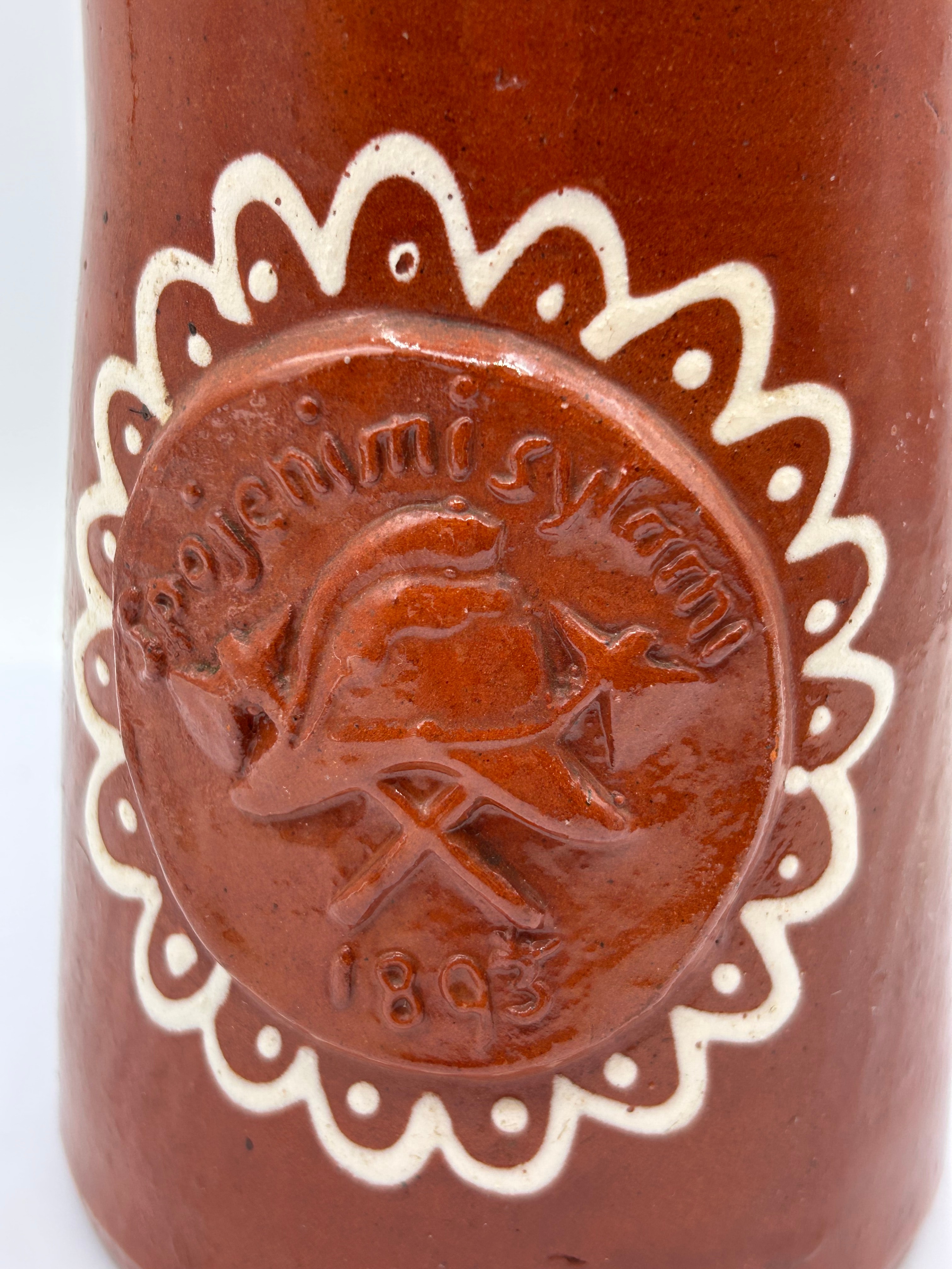 A brown glazed earthenware tankard or mug with a single handle and decorative white slip-trailing. The cylindrical body features a central applied circular medallion, framed by a white scalloped border, containing embossed text “POJENI SI SVAMI” (Czech/Slovak for “Drinking with you” or “Toast with you”) above an emblem of a bird or eagle surmounting two crossed tools, and the date “1803”. A matching white slip-trailed scalloped border also decorates the rim. The style is traditional or folk art.