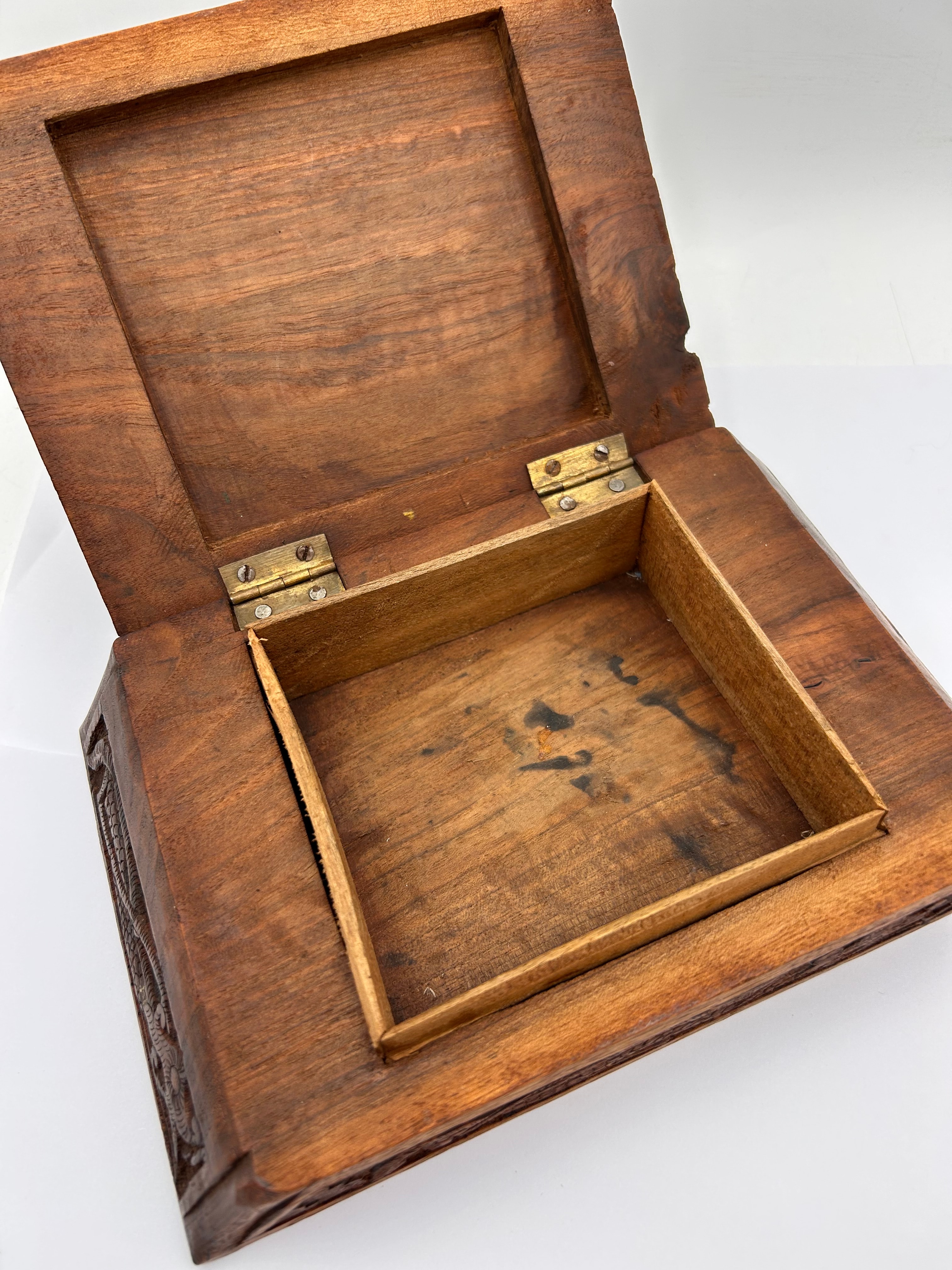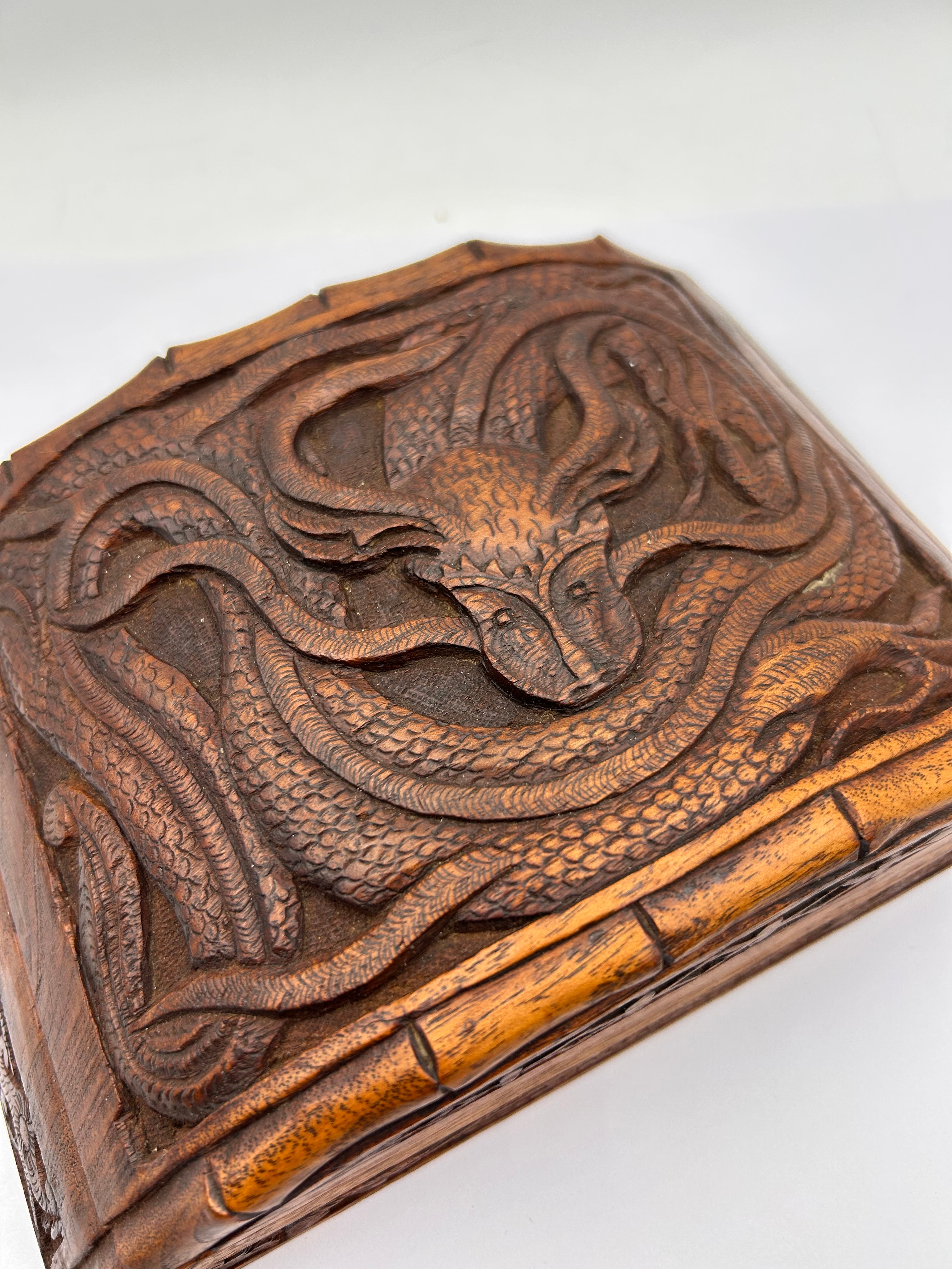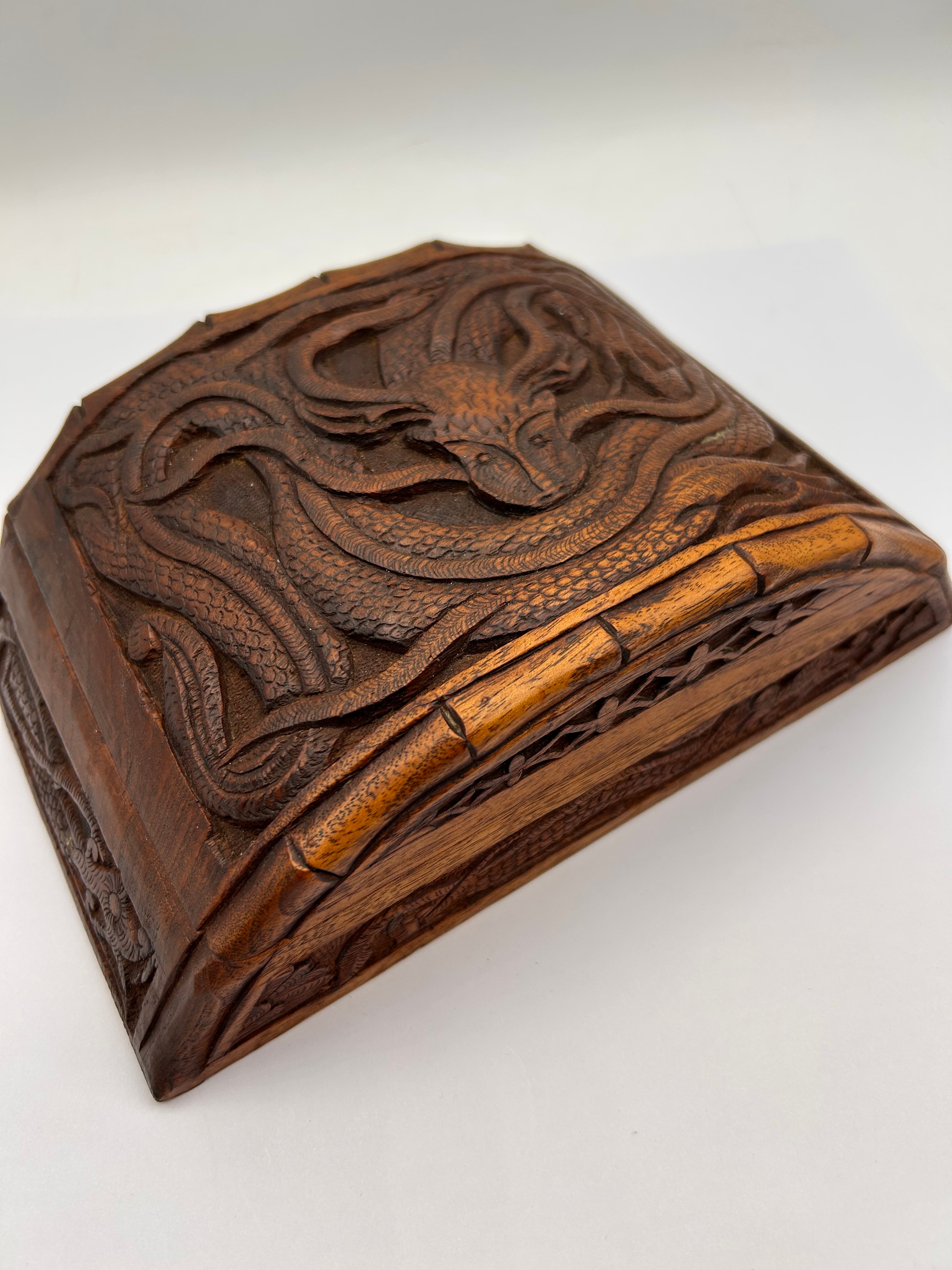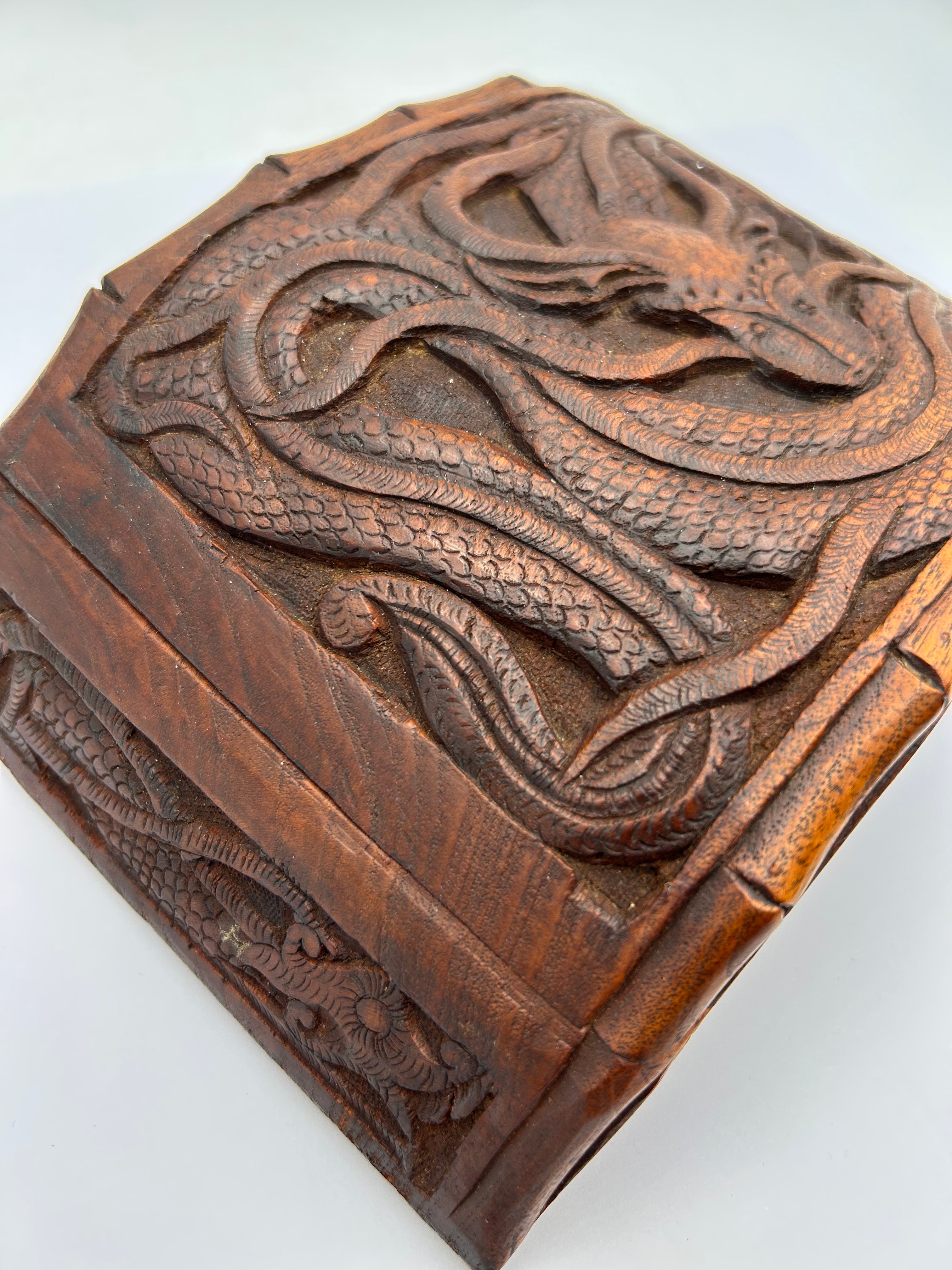 A rectangular carved wooden box with a hinged lid, crafted from a dark, reddish-brown hardwood. The lid features a prominent, deeply carved relief depicting a mythological serpentine creature, likely a dragon, surrounded by intricate scales and flowing patterns, characteristic of East Asian or Southeast Asian carving styles. The sides of the box also display carved decorative motifs. The interior is unlined. The lid is secured by two brass hinges.