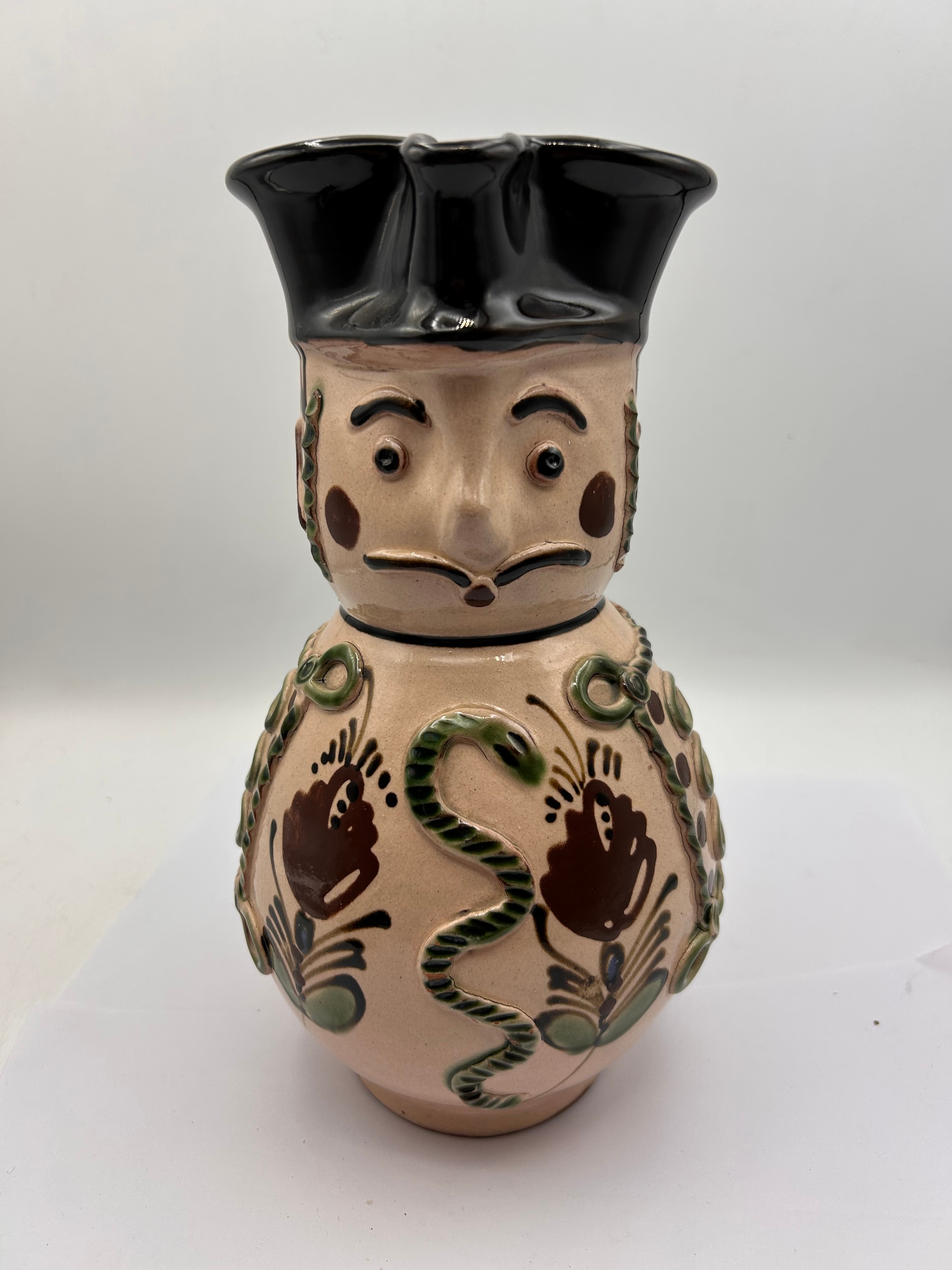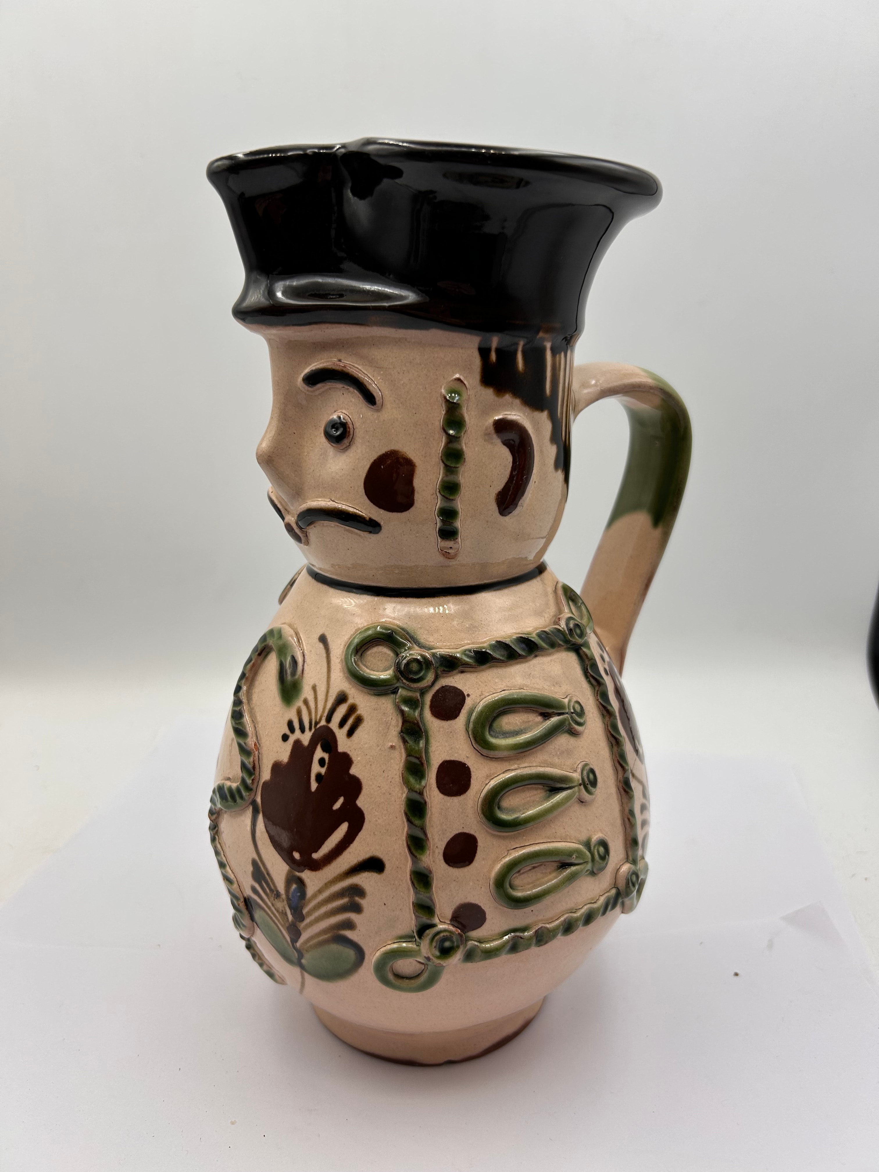 A Hungarian Karcag Folk Art Redware Miska Soldier Jug or Pitcher, crafted from glazed earthenware in an anthropomorphic folk art style. The vessel depicts a man in what appears to be a uniform, featuring a black glazed hat that forms the pour spout. The face is painted with a mustache, and the body is decorated with relief elements suggesting a military-style jacket with buttons and ropes, rendered in green and brown glazes on a light beige ground. A stylized snake motif is visible on the back. The unglazed terracotta base displays a handwritten numeral ‘9’.