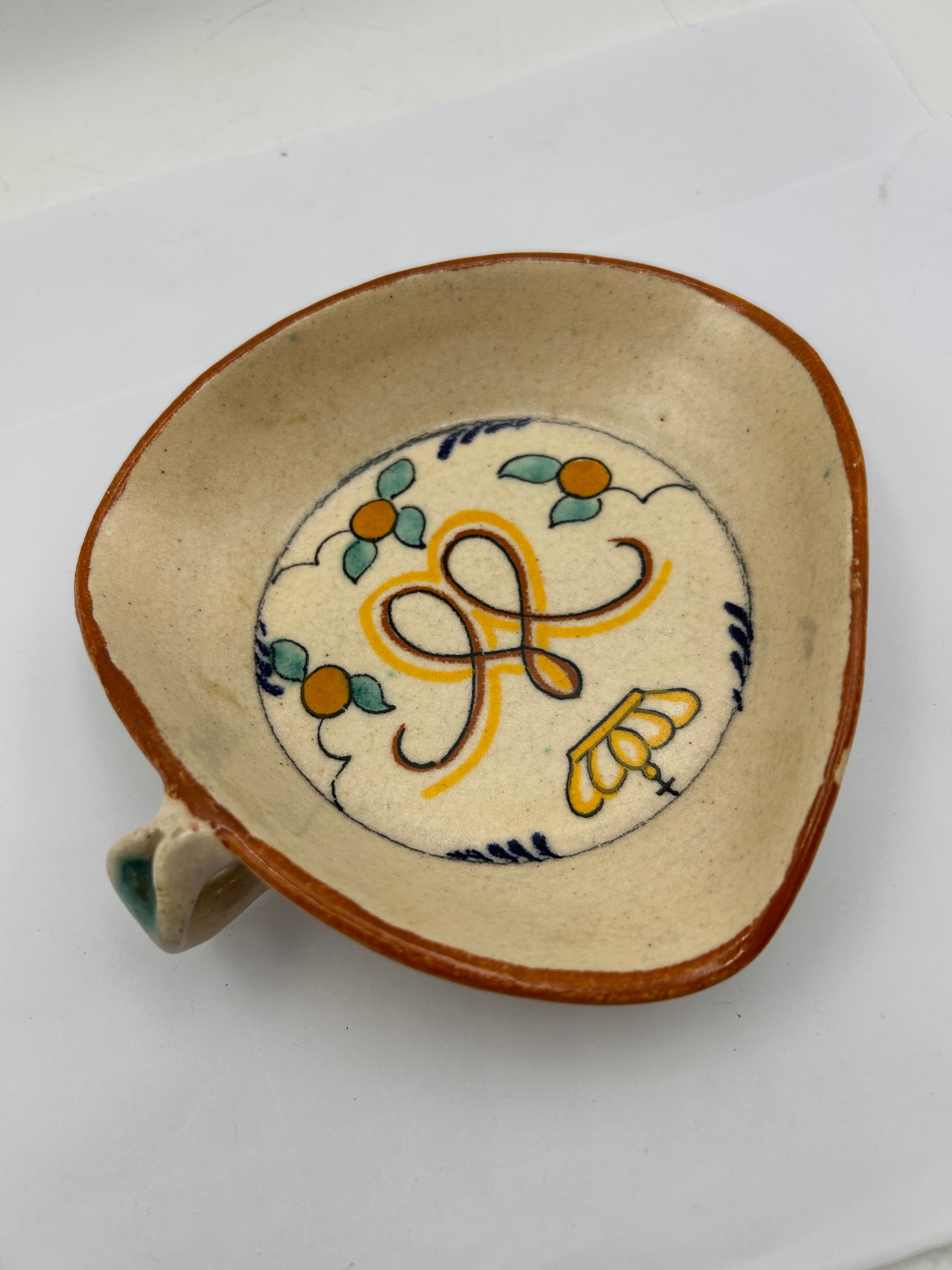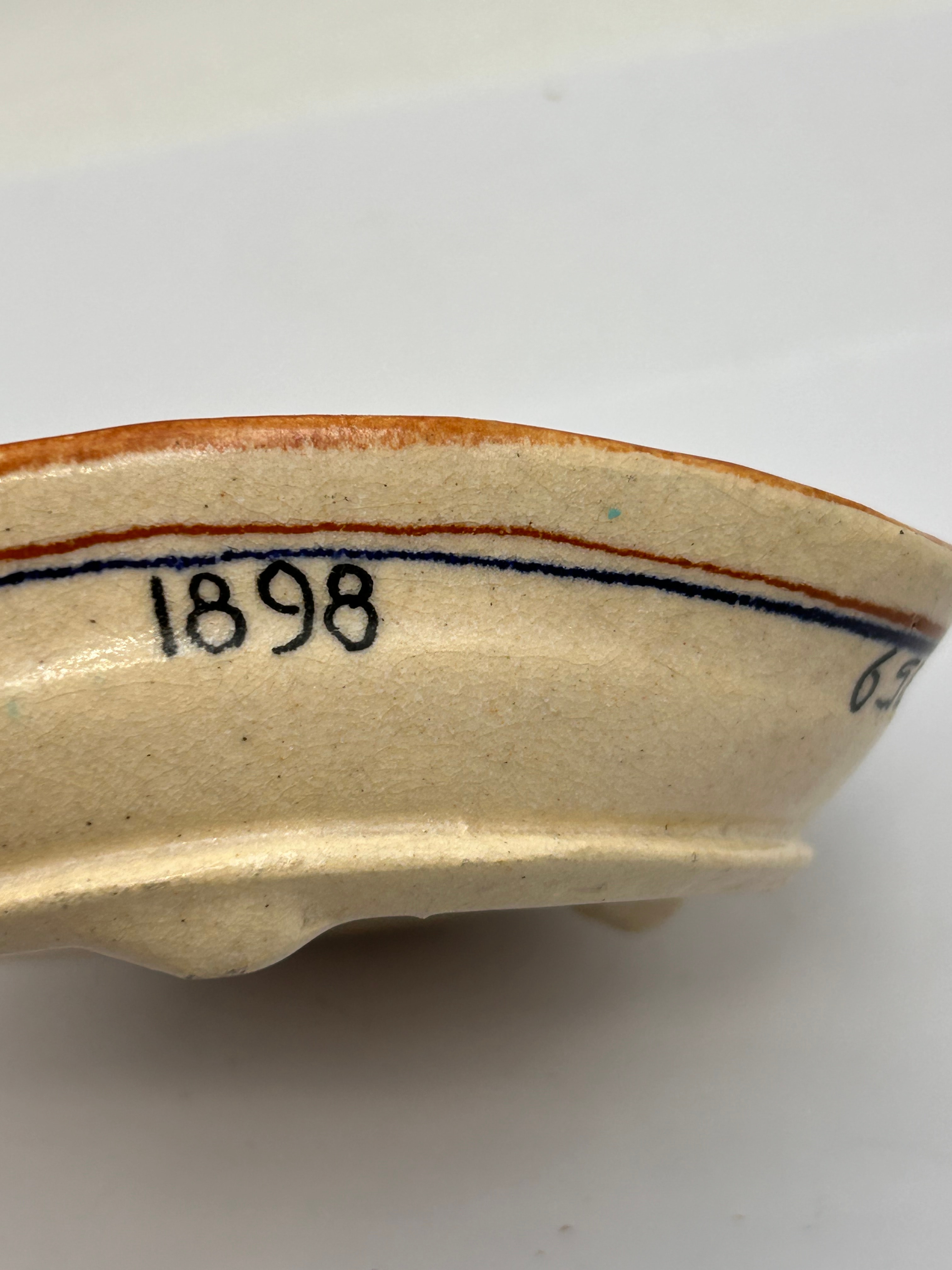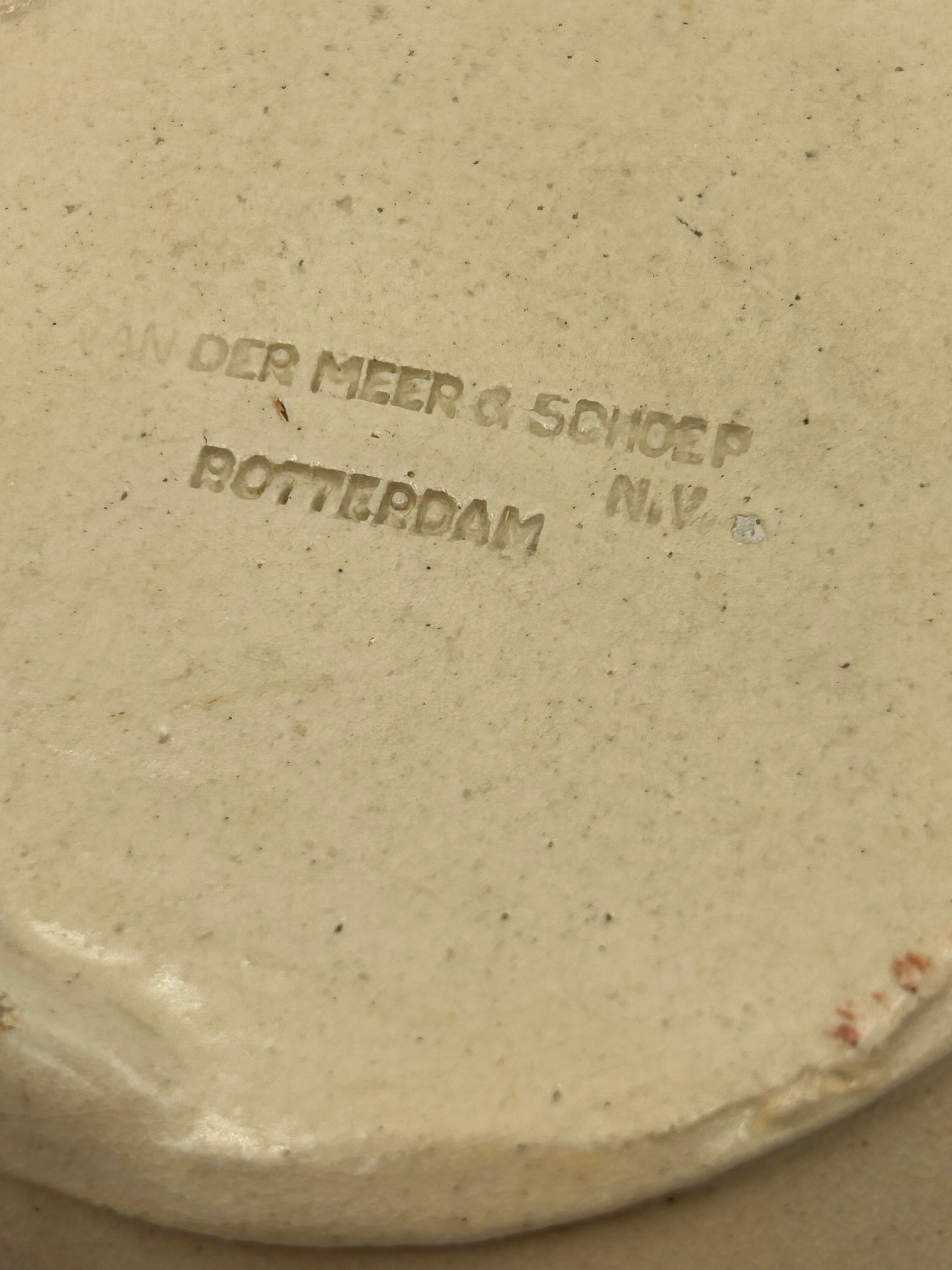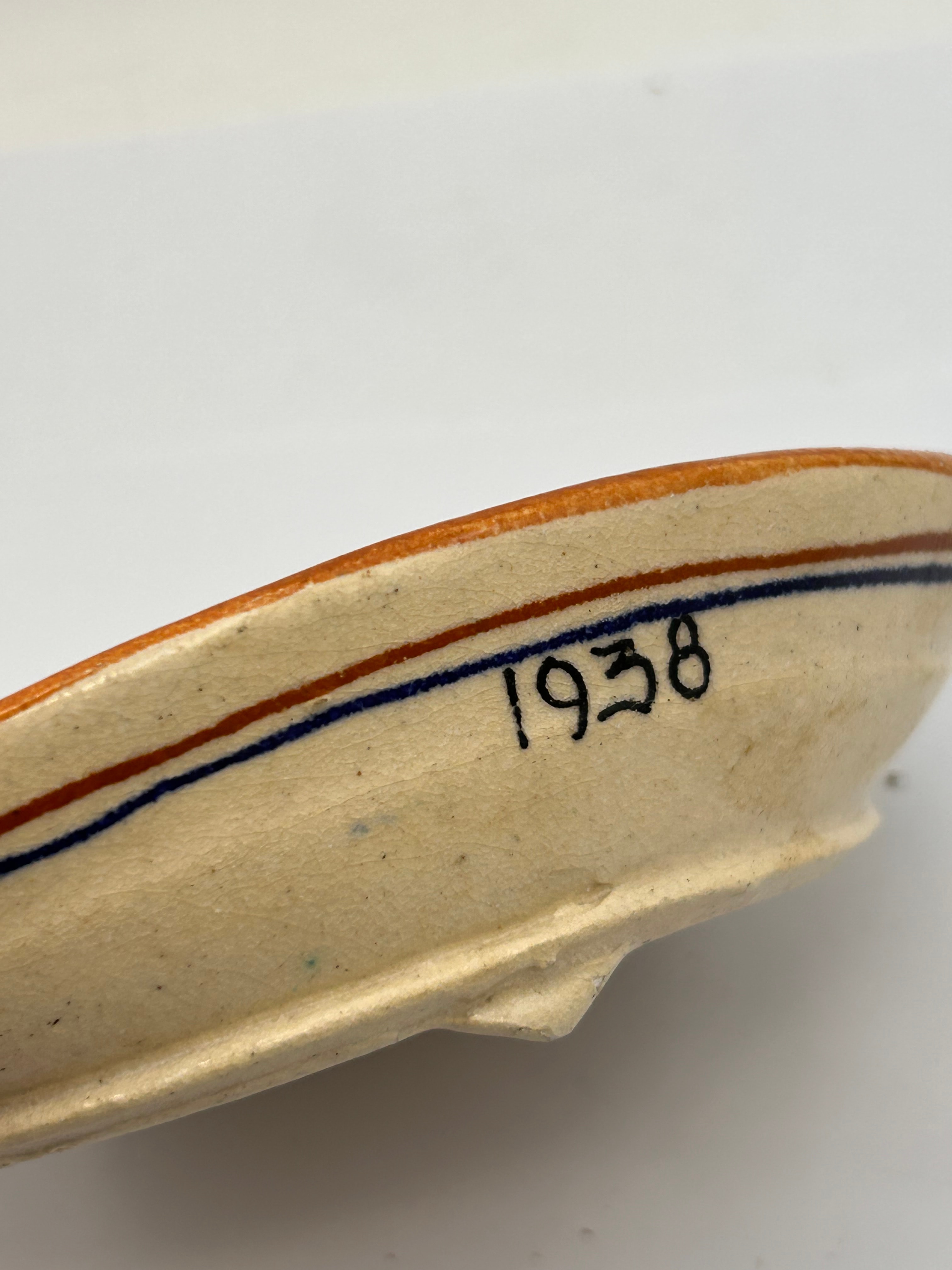 An irregularly shaped, small ceramic dish by Van der Meer & Schoep N.V. of Rotterdam, Netherlands, featuring a hand-painted folk art style design. The interior displays a central yellow scroll motif surrounded by small teal and orange floral elements, all bordered by a dark blue dashed line, set against a creamy, speckled ground. The off-white exterior exhibits visible crazing throughout the glaze and is accented by a reddish-brown painted rim and thin blue and red lines. The dates “1898” and “1938” are hand-painted in black on the exterior. The underside bears a clear impressed mark reading “VAN DER MEER & SCHOEP N.V.” and “ROTTERDAM.” This piece was likely intended as a trinket dish or spoon rest.