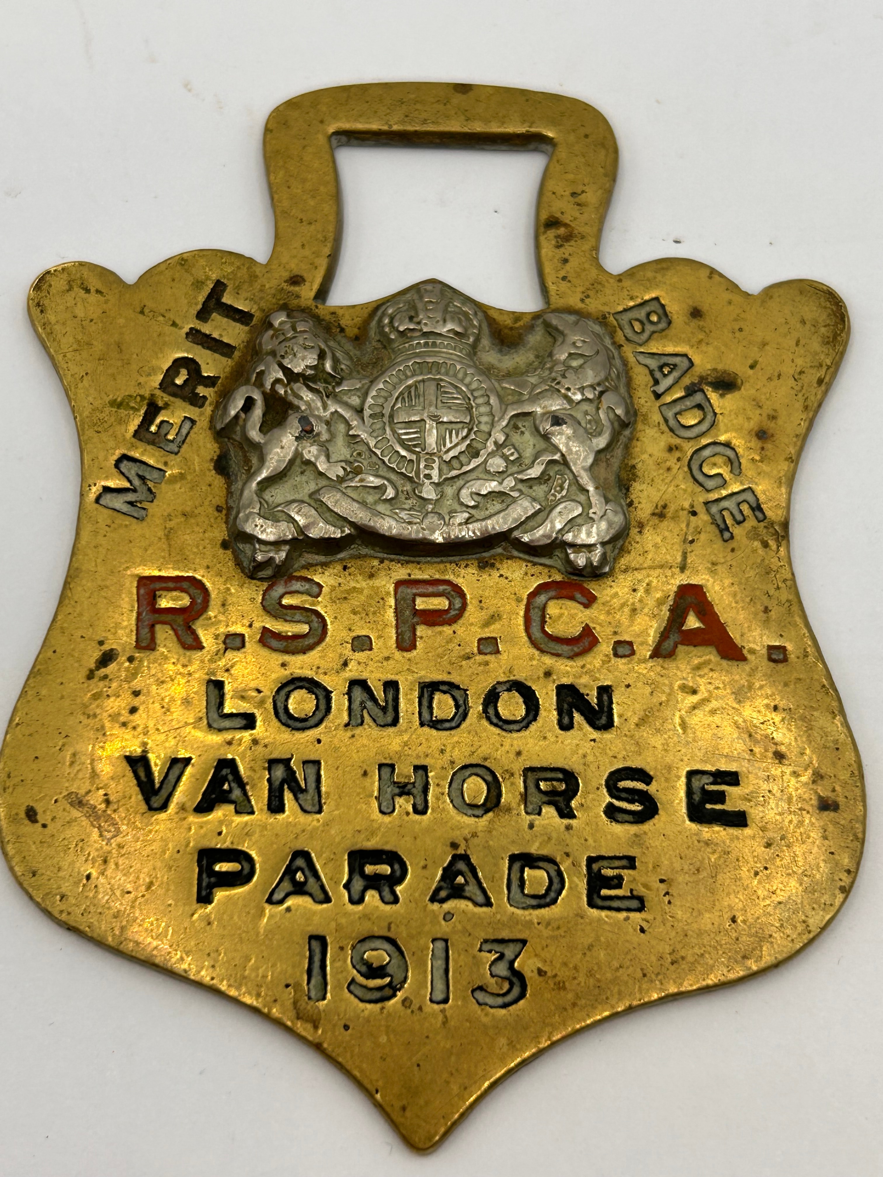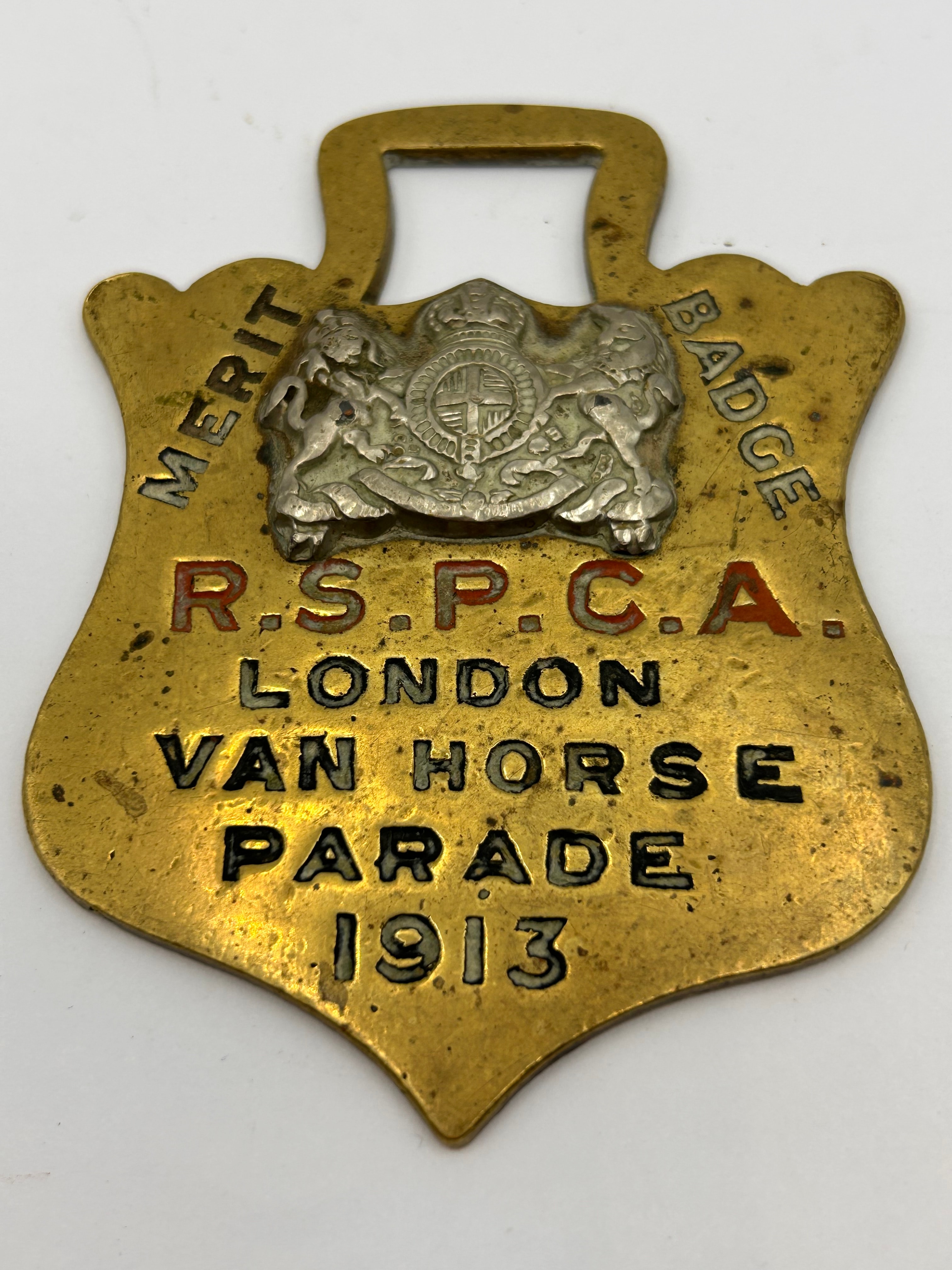 An R.S.P.C.A. Merit Award Horse Brass, commemorating the London Van Horse Parade of 1913. This gilt-metal badge or fob is shield-shaped with an integrated suspension loop. It features a silver-toned applied crest at the top center depicting a crowned shield flanked by heraldic supporters. The main body is engraved with “MERIT BADGE” along the top curve, “R.S.P.C.A.” in red enamel, followed by “LONDON VAN HORSE PARADE 1913” in black enamel.