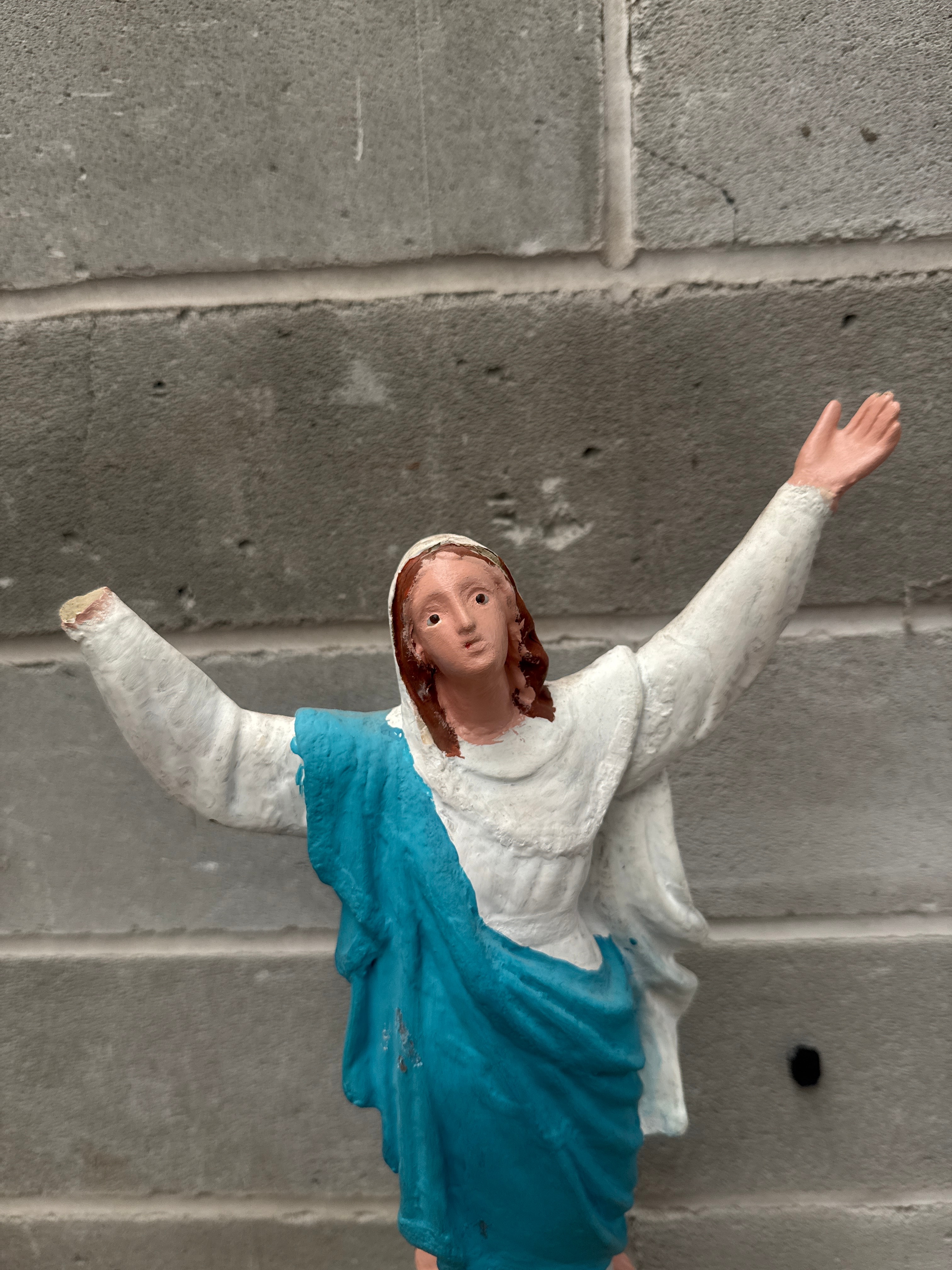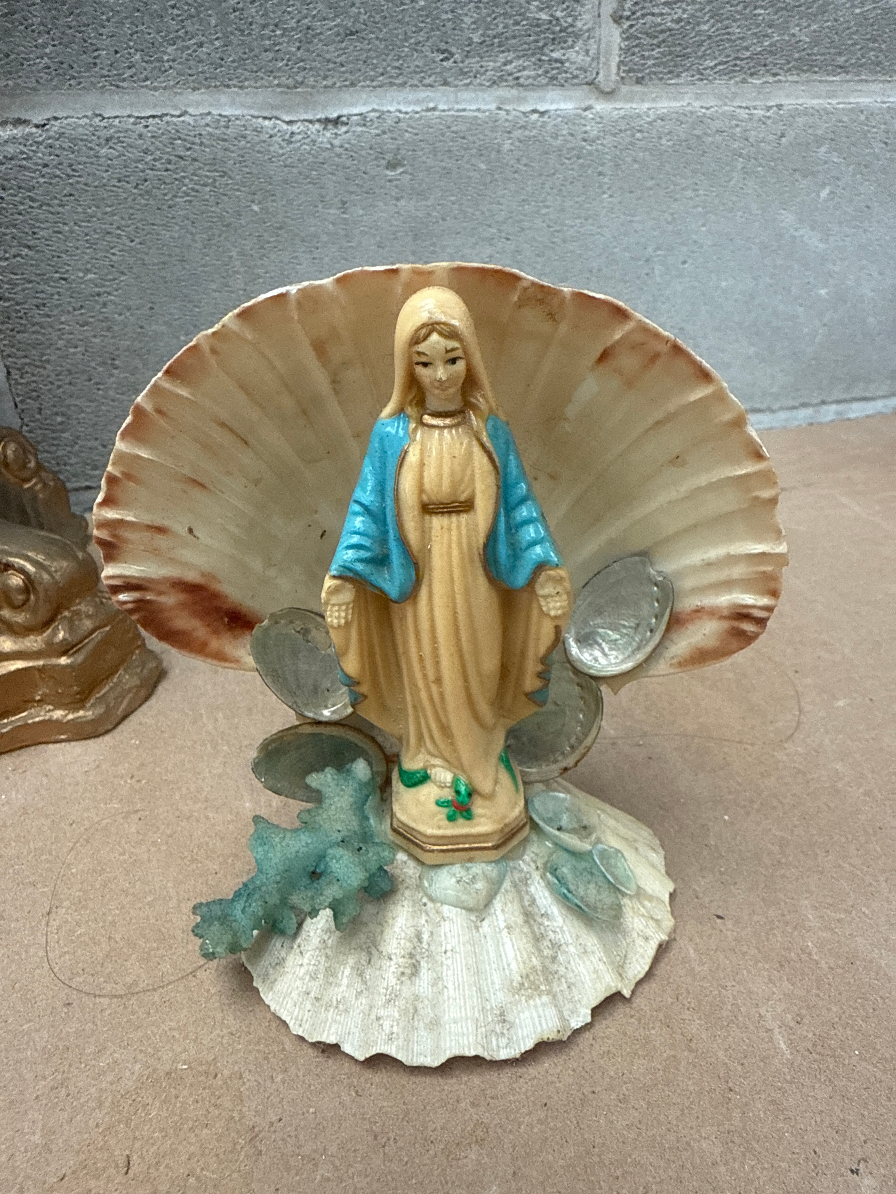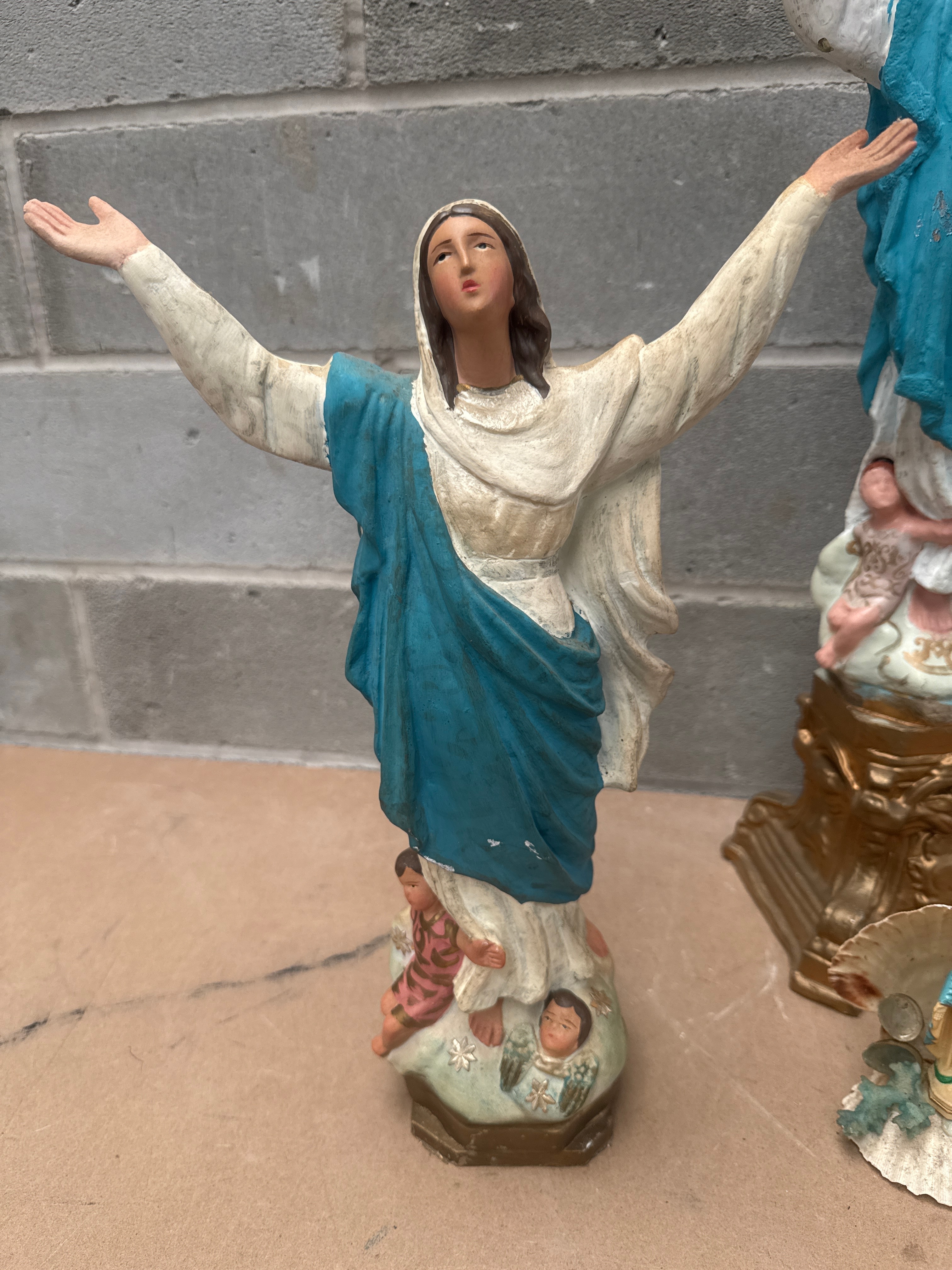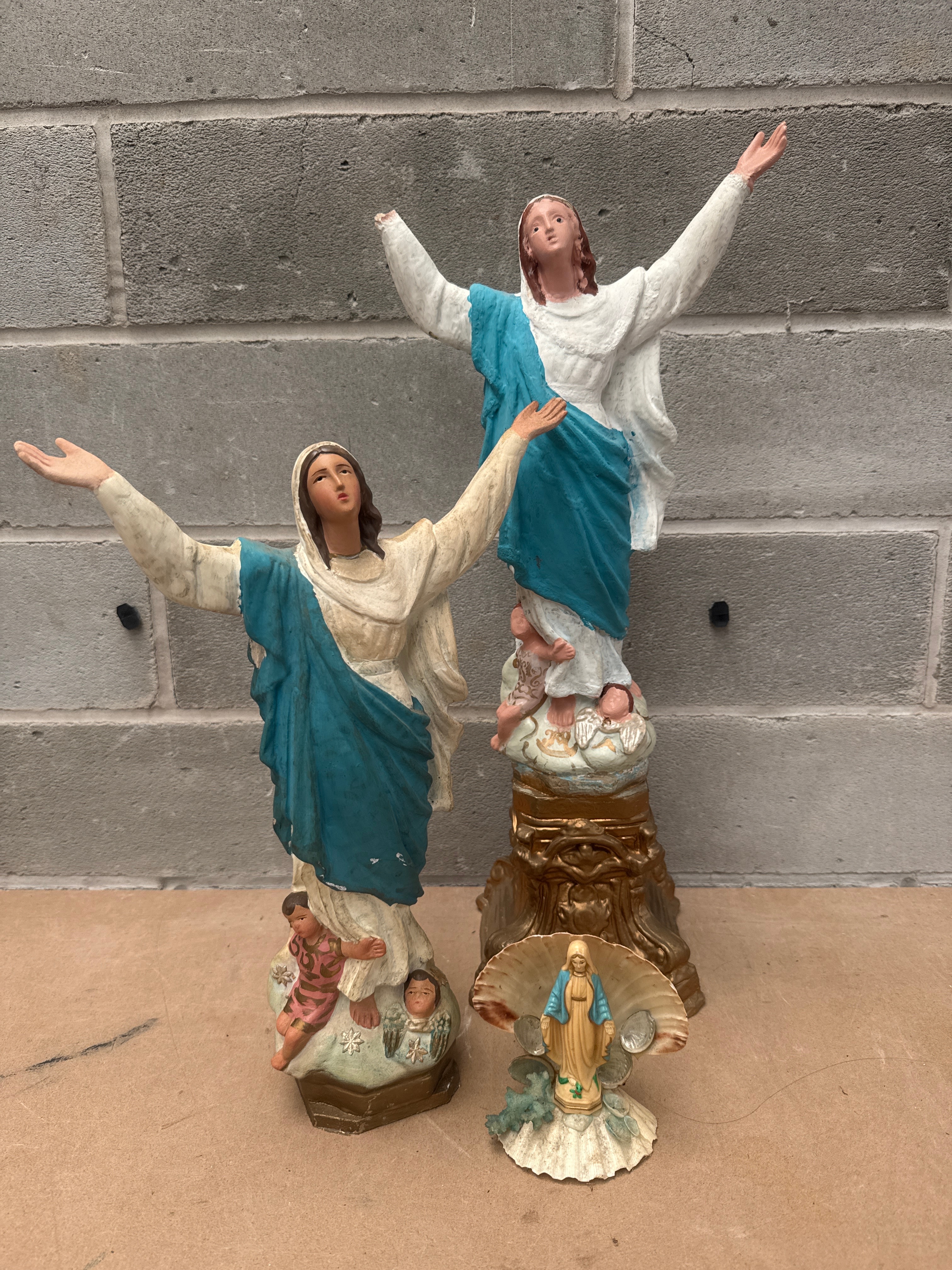 A group of chalk religious figurines. The tallest figurine, measuring approximately 22 inches, depicts Our Lady of Grace with outstretched arms, robed in white with a blue mantle, standing on an ornate, gold-painted base. The second large figurine, also depicting a Marian figure with outstretched arms, robed in white with a blue mantle, stands on a base adorned with cherubs, consistent with depictions of Our Lady of the Assumption with Angels. The third, smaller figurine is also a Marian figure, presented standing within a large scallop shell with decorative shell and coral-like elements at its base. All items are constructed from chalk, with painted finishes. The style suggests a production period from the mid-20th century onwards. No discernible text or manufacturer’s markings are visible on any of the items.