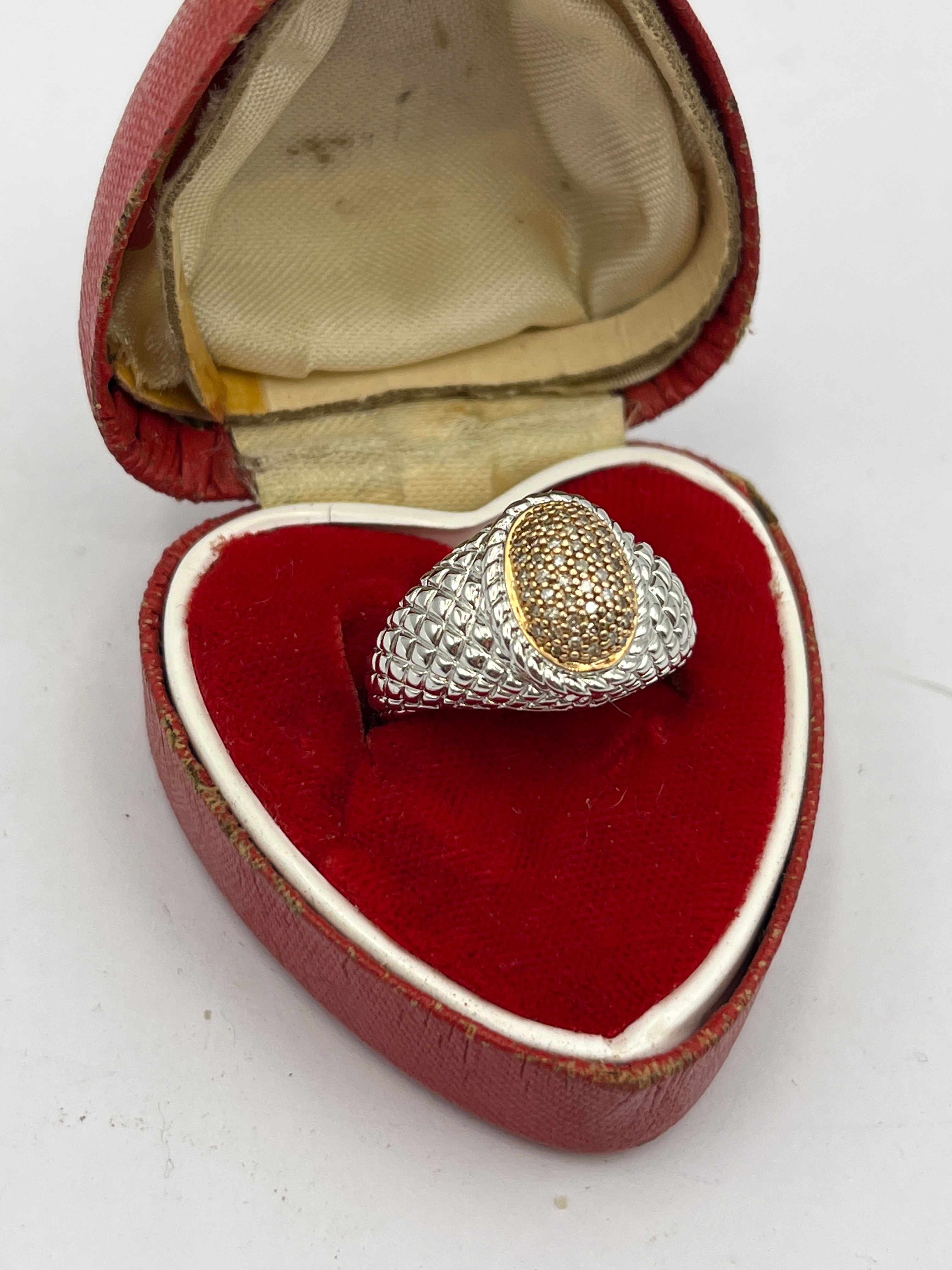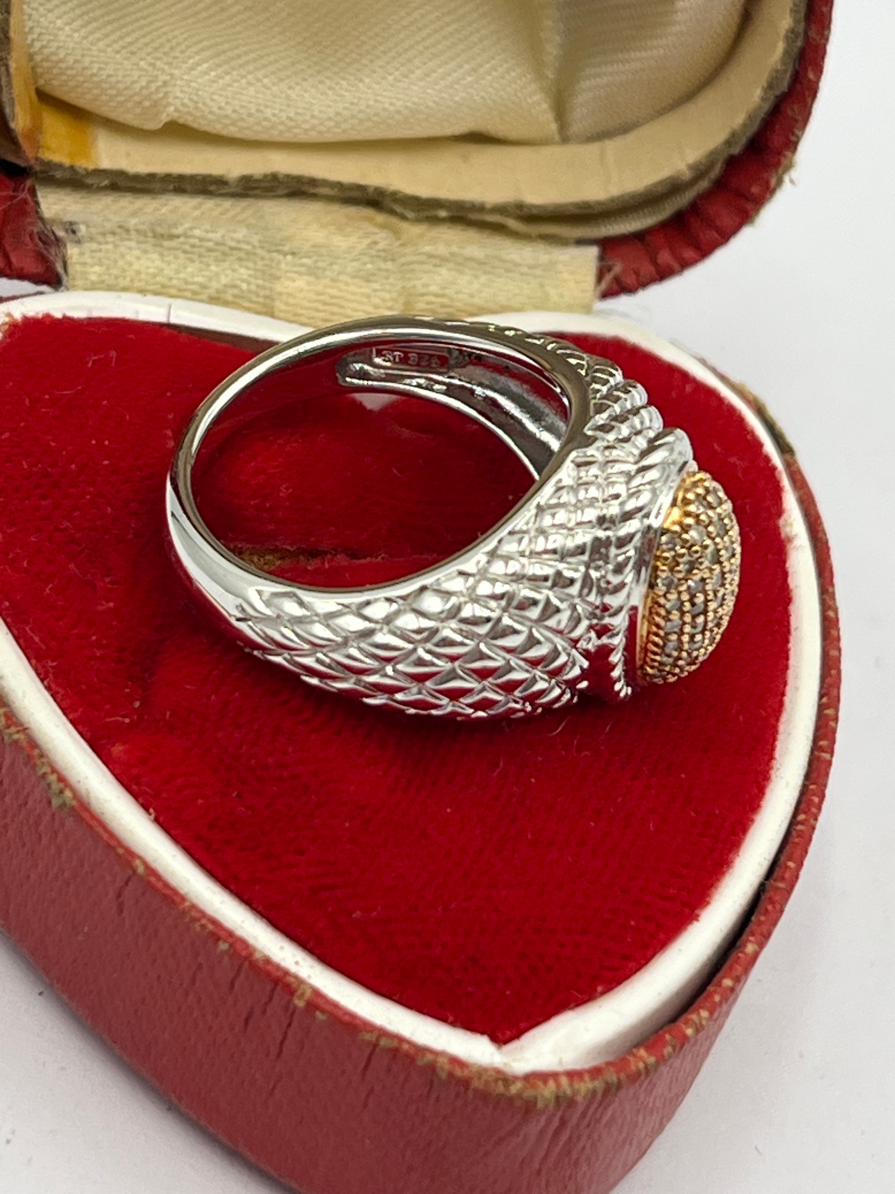 A modern-style ring featuring a two-tone design, commonly referred to in the market as an ‘iced out cluster ring.’ It comprises a wide sterling silver band with a textured, scale or reptilian pattern. The interior of the band is marked “925,” indicating sterling silver. The band leads to an oval-shaped centerpiece consisting of numerous small, round, champagne or brown-toned stones, likely moissanite, pave-set within a gold-tone bezel and setting.