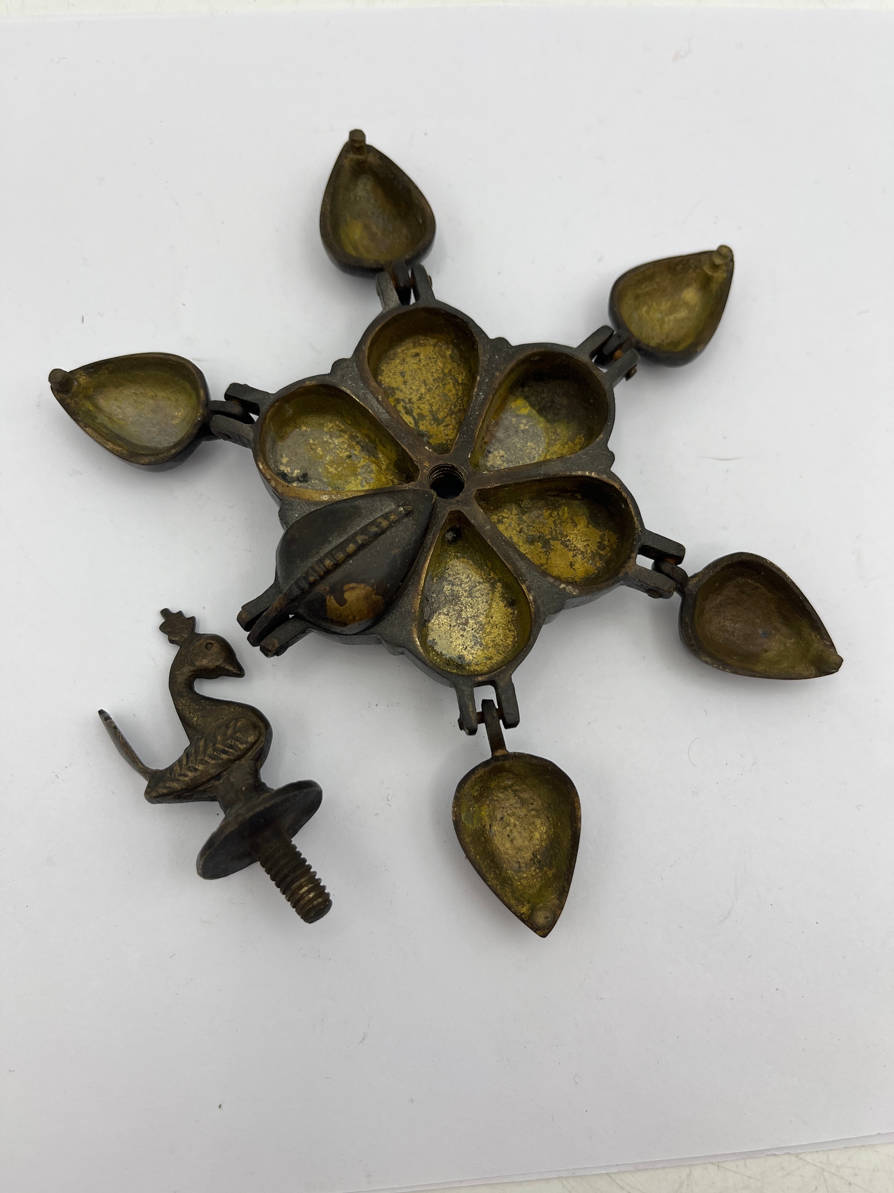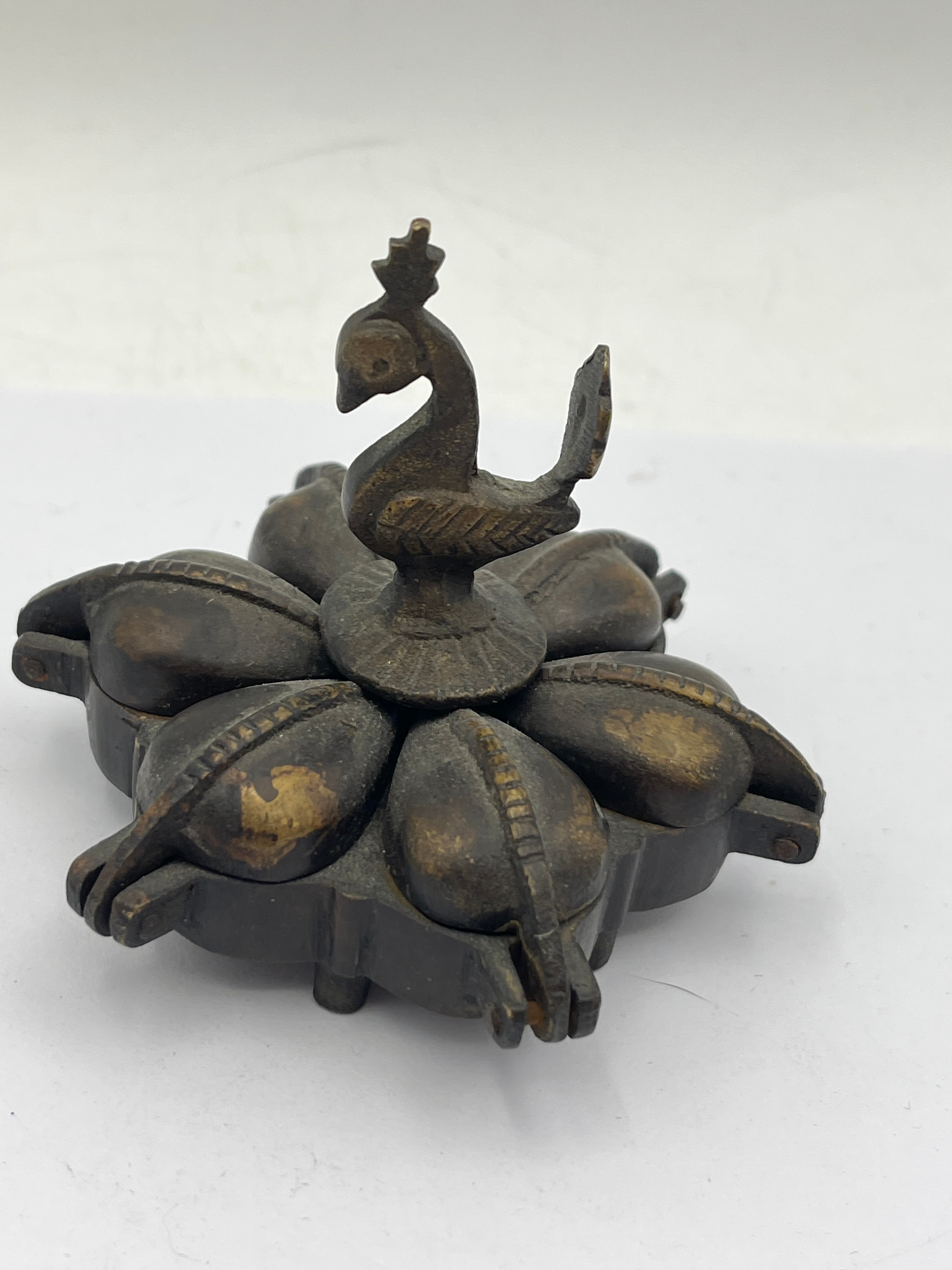 A 19th Century Southeast Asian bronze makeup holder. This patinated bronze or brass object features a central circular base supporting six hinged, radiating, teardrop-shaped receptacles, forming a floral or star-like arrangement. Each receptacle has a hinged lid. The piece is crowned by a stylized, screw-in bird finial, resembling a peacock. The interiors of the receptacles show residue from past use. It displays a dark, aged patina and wear consistent with its material and apparent age, with no visible text or maker’s marks.