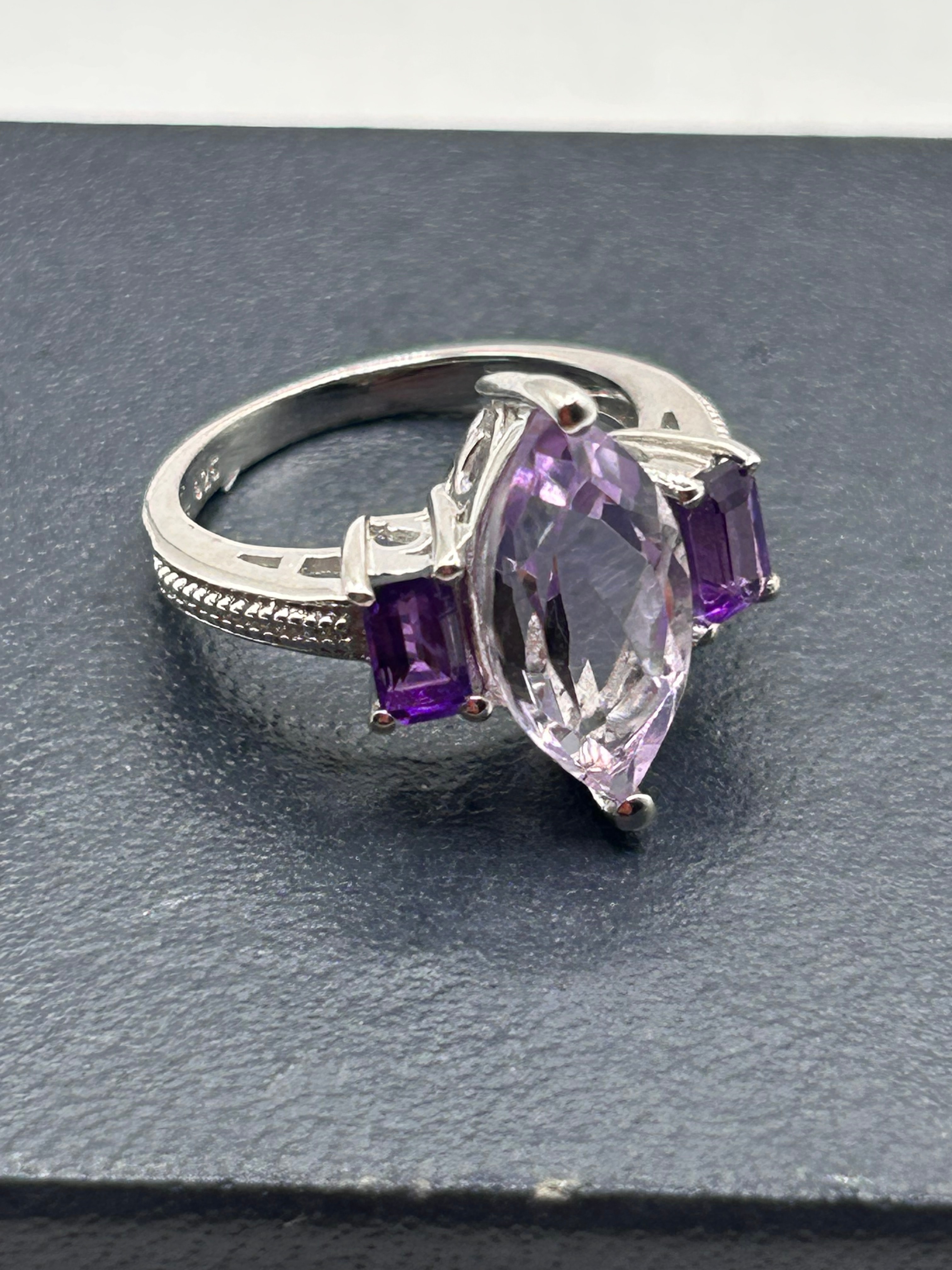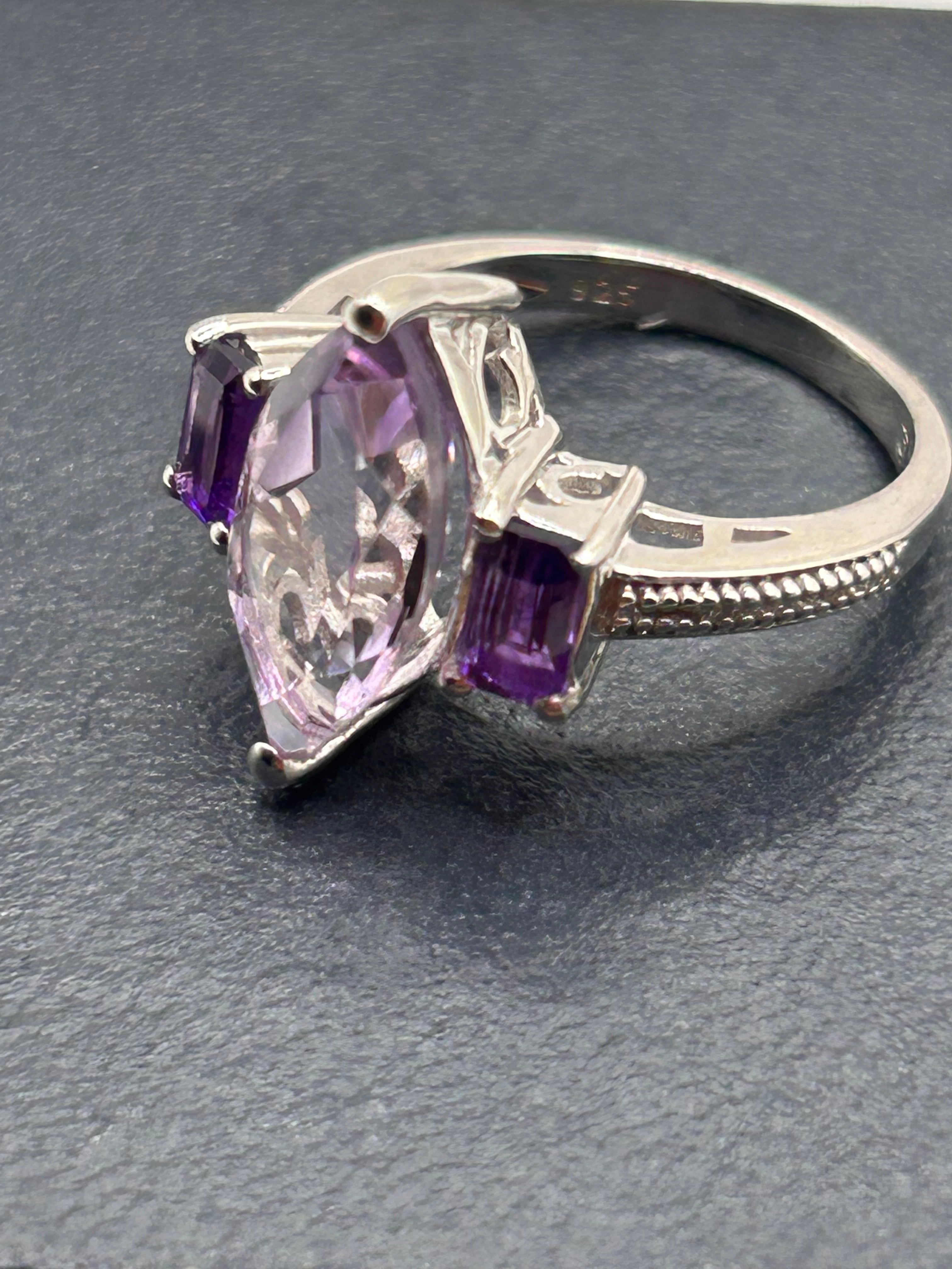A modern-style Silver ring featuring a central marquise-cut pale purple amethyst gemstone flanked by two smaller, rectangular-cut dark purple amethyst gemstones. The band exhibits a textured, decorative edge on its shoulders. An ‘925’ hallmark is visible on the inner band, confirming its silver purity.