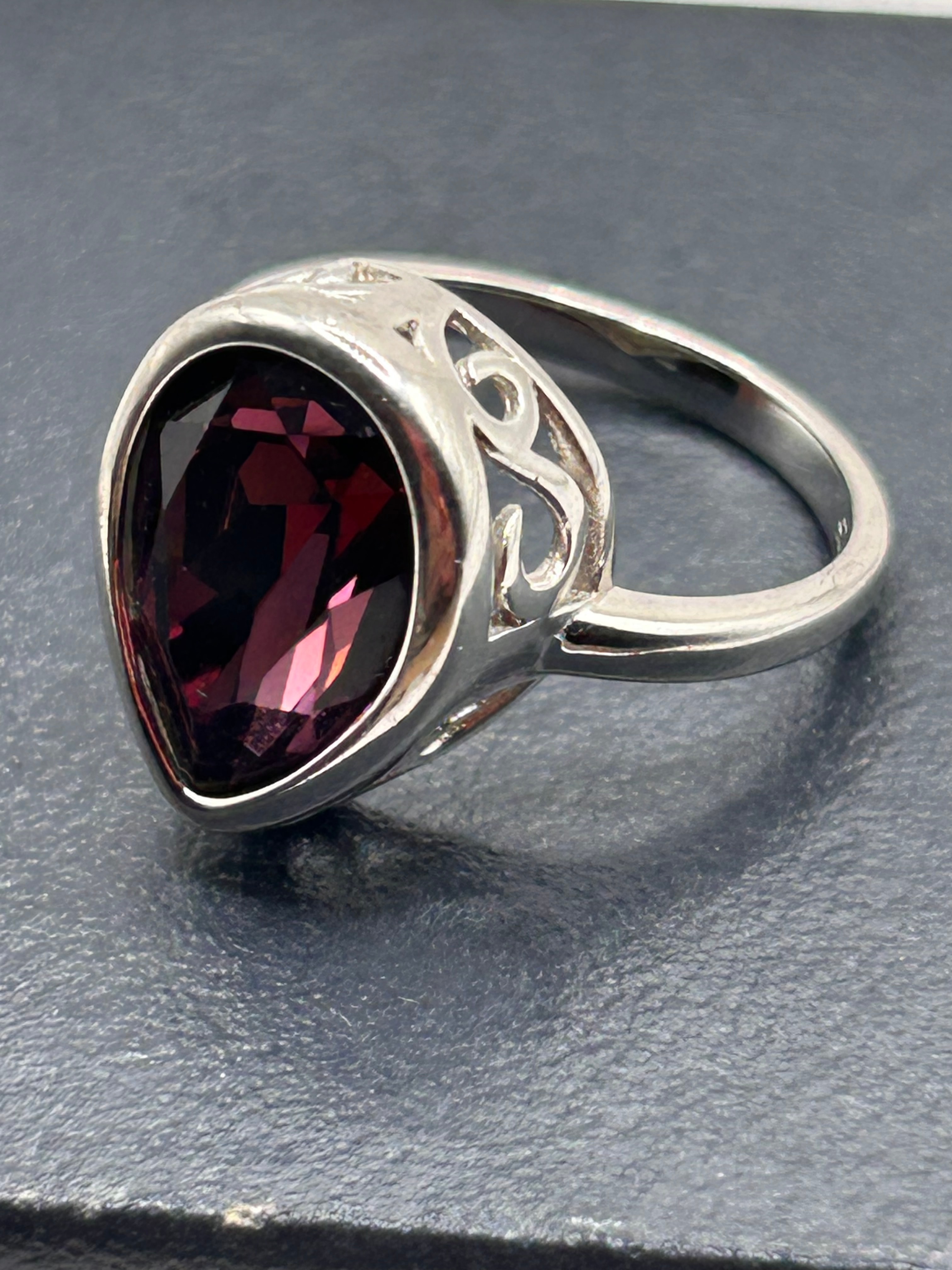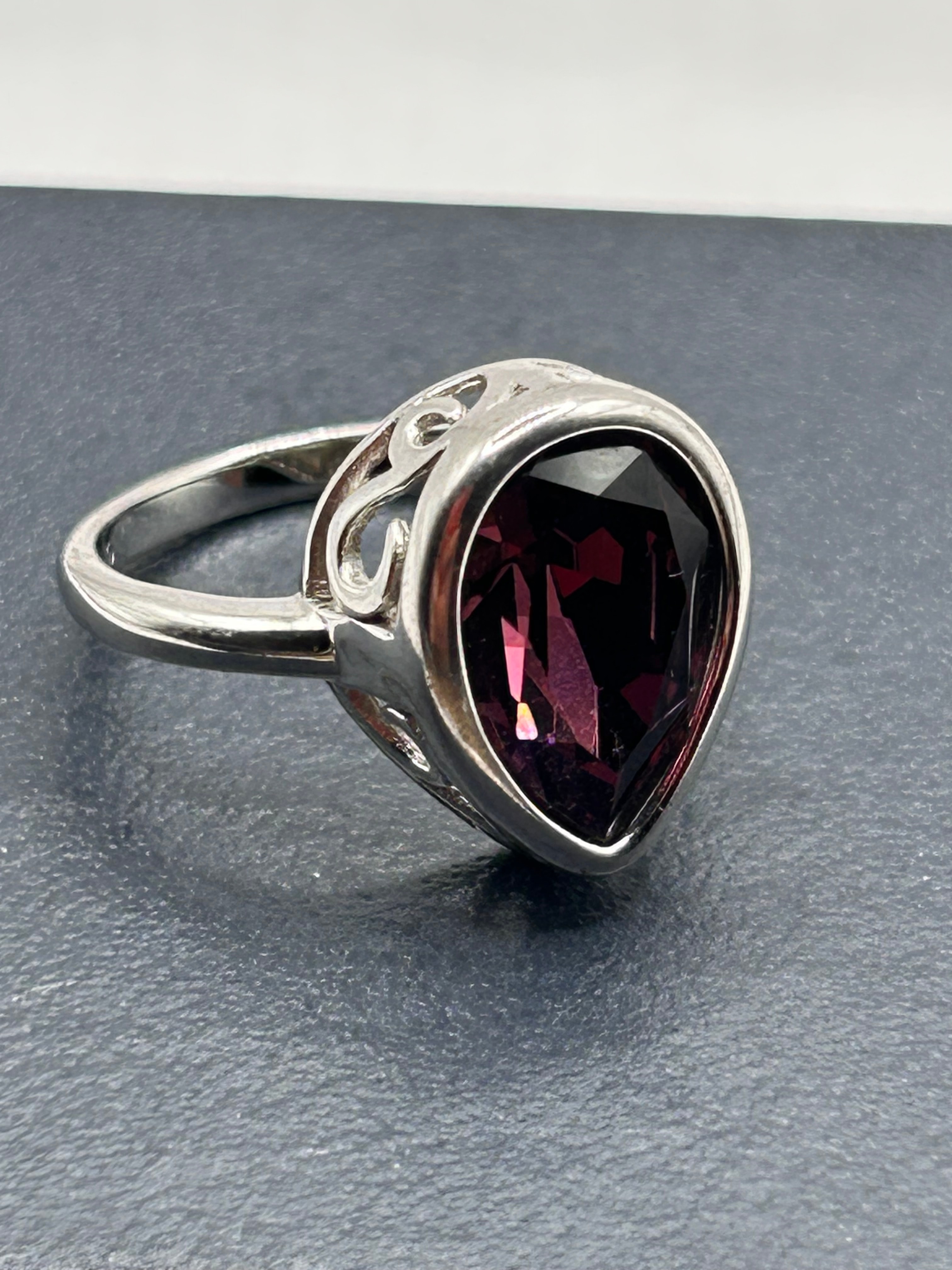 A contemporary ring crafted from Sterling Silver, featuring a prominent faceted, heart-shaped rhodolite garnet. The stone exhibits a deep plum to reddish-purple hue and is secured in a full bezel setting. The shoulders of the ring display openwork, curvilinear scroll or foliate-inspired designs. No visible text, hallmarks, or manufacturer’s markings are discernible on the piece.