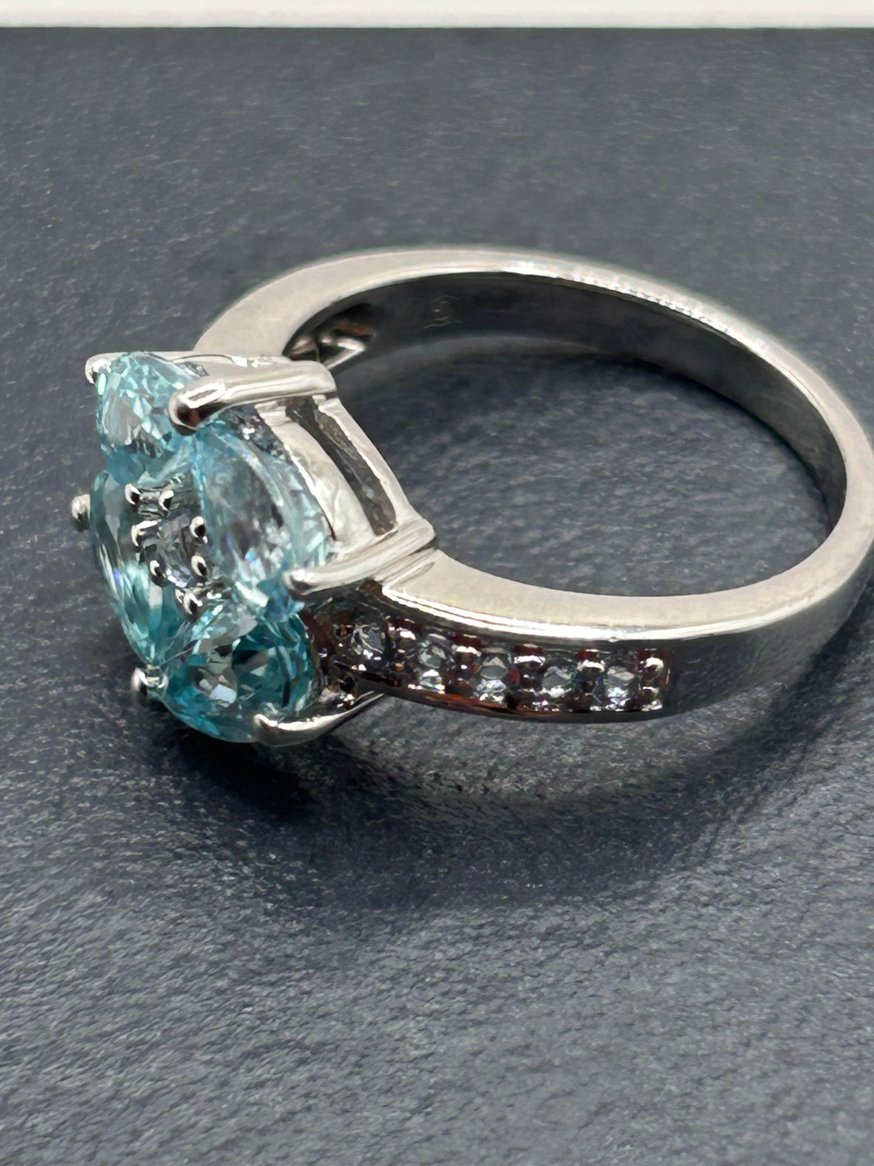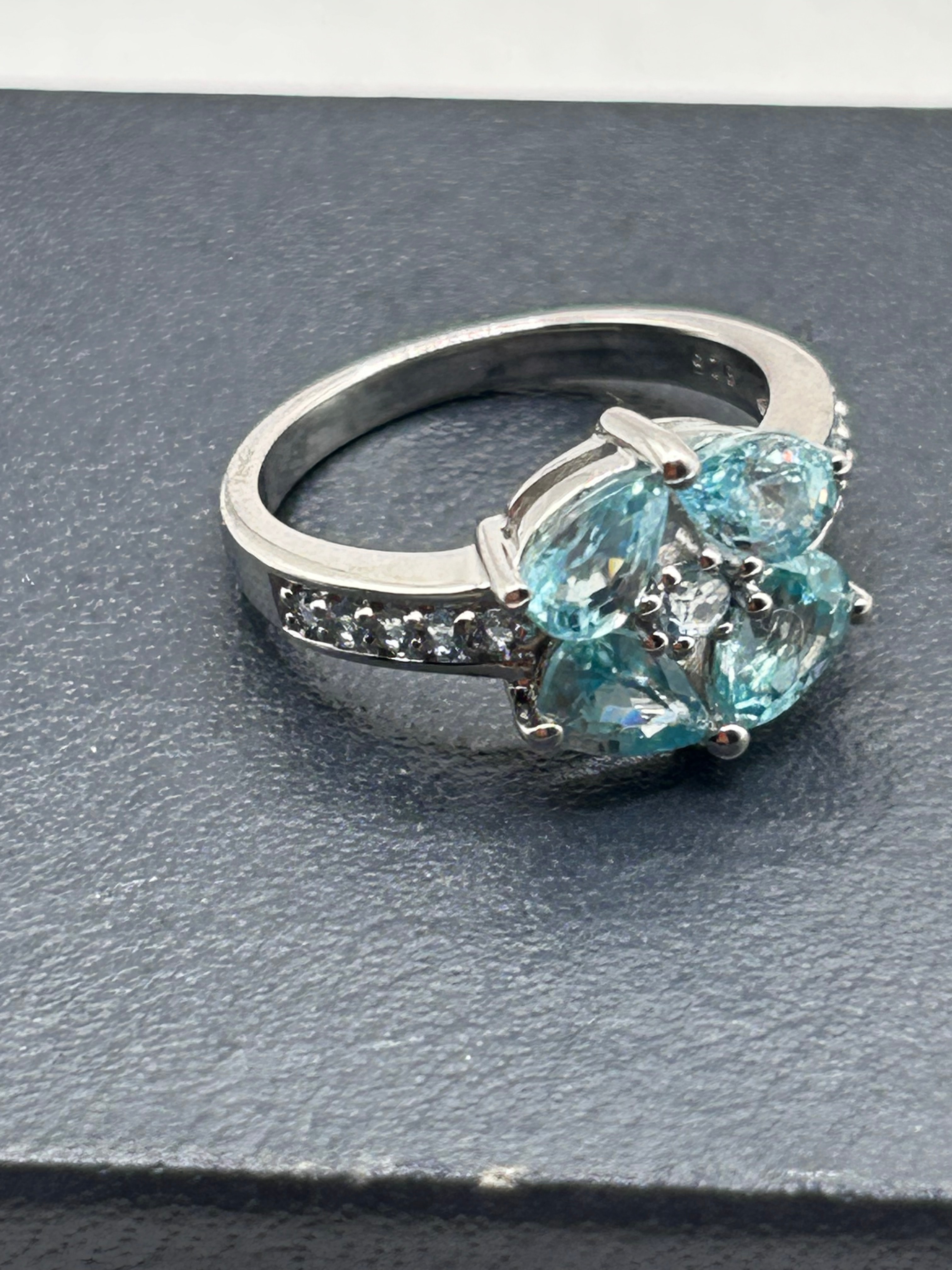 A contemporary Silver (925 Sterling) cluster ring, featuring four prong-set, pear-cut Sky Blue Topaz gemstones arranged to form a floral-like cluster. These are surrounded and accented by small round White Topaz stones. The ring’s shoulders are further embellished with channel-set small round White Topaz stones.