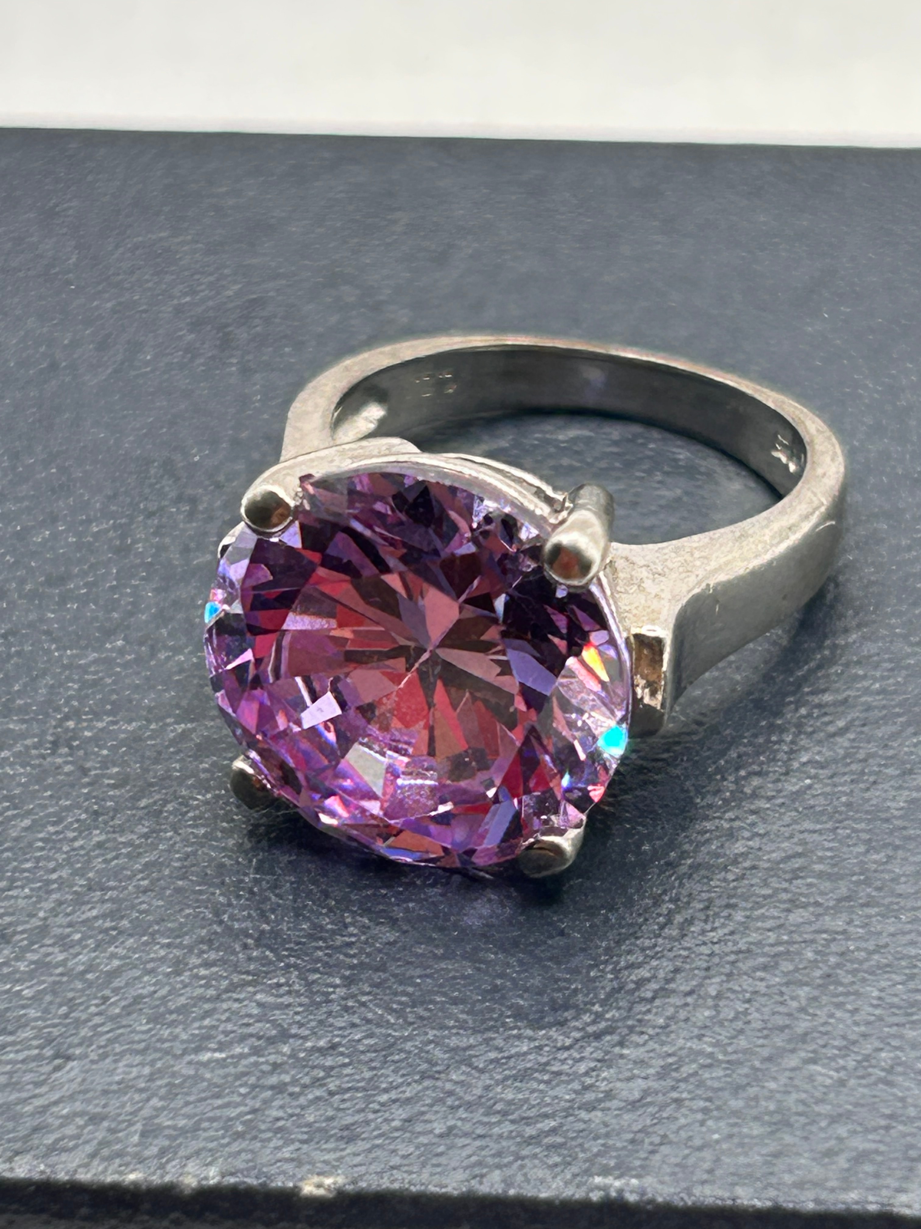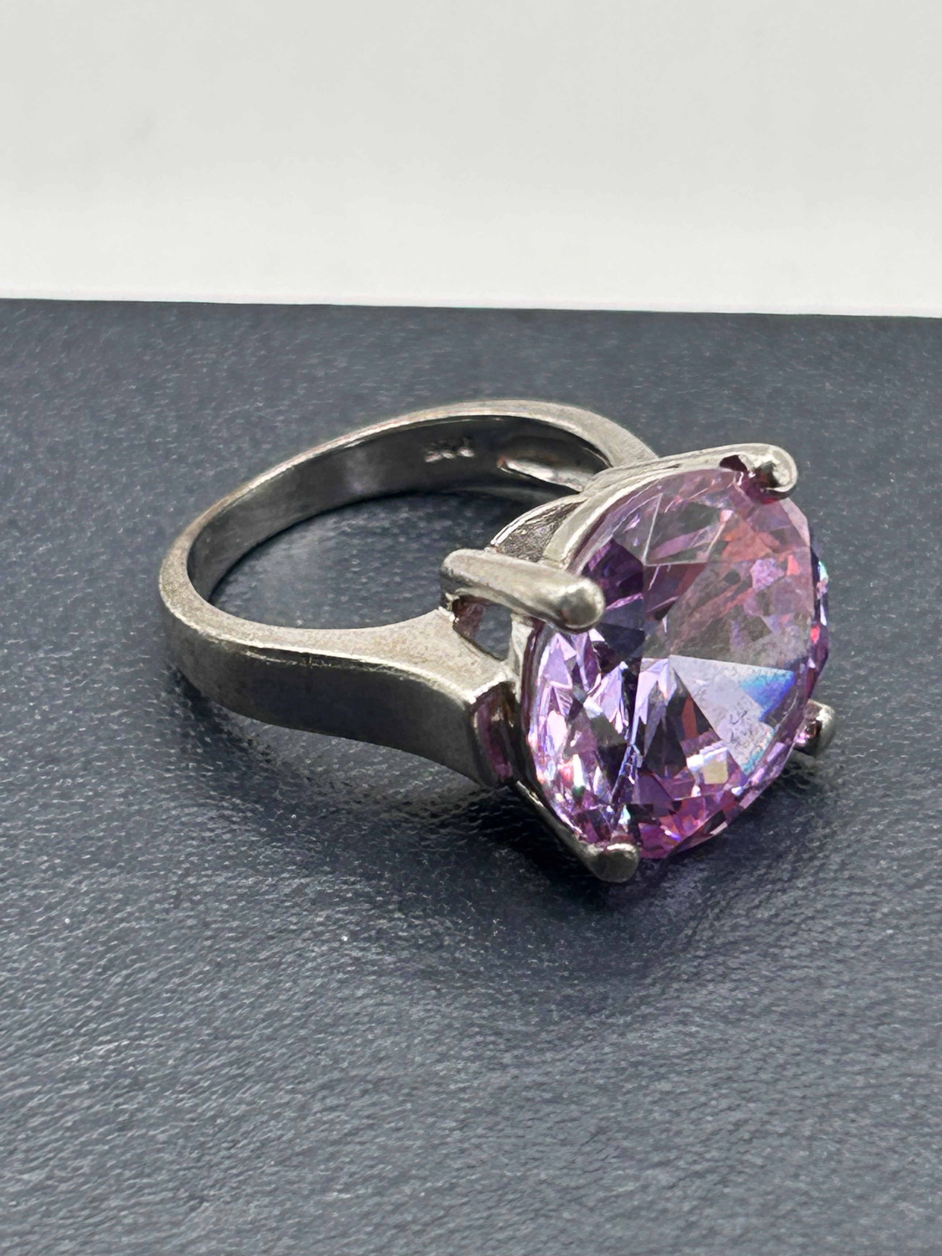 A 925 Sterling Silver ring featuring a large, round-brilliant cut purple cubic zirconia (CZ) stone. The stone is prominently set in a four-prong, solitaire-style mounting. The band is simple and unadorned. The interior of the band is faintly stamped “S925”.