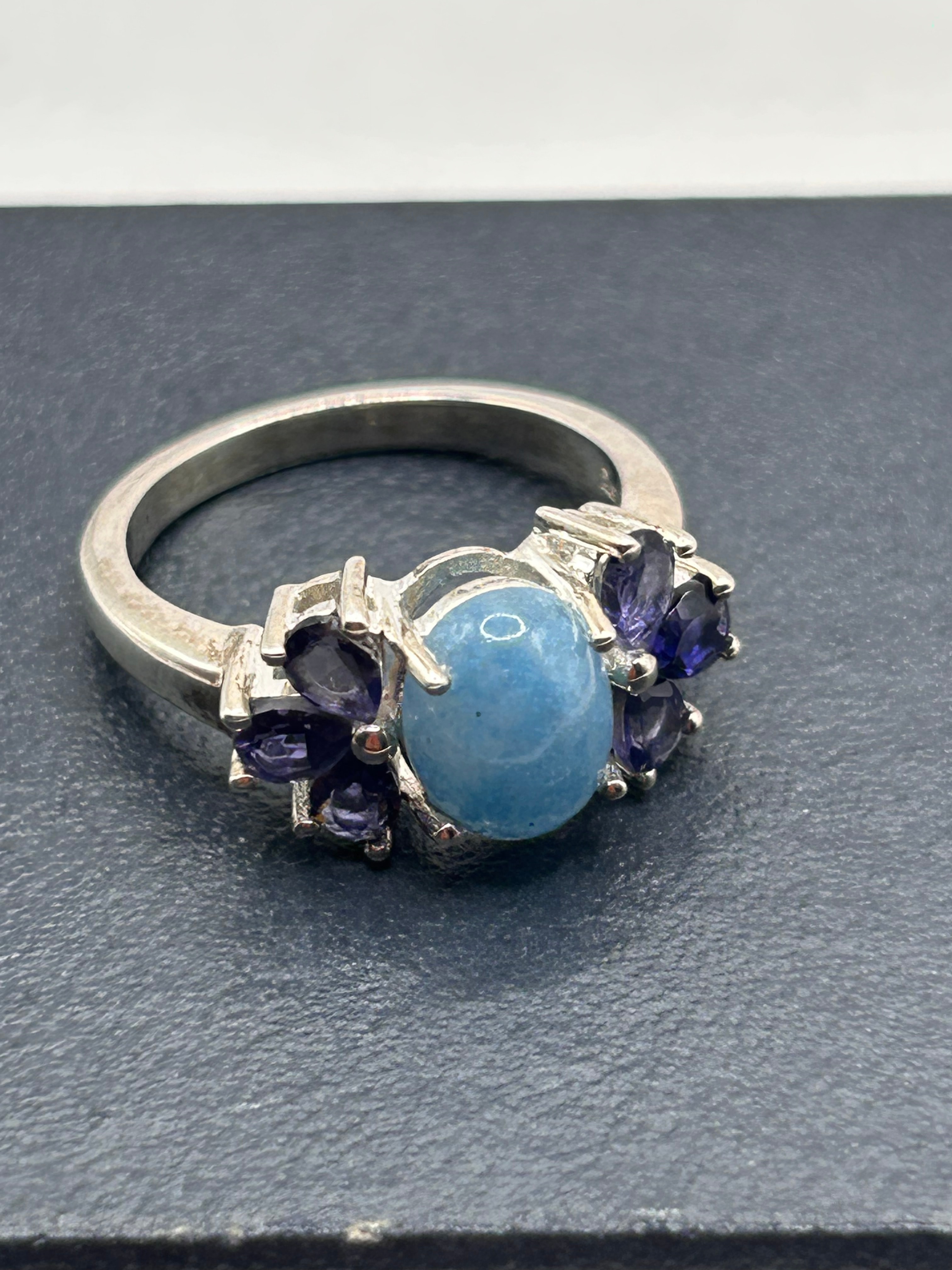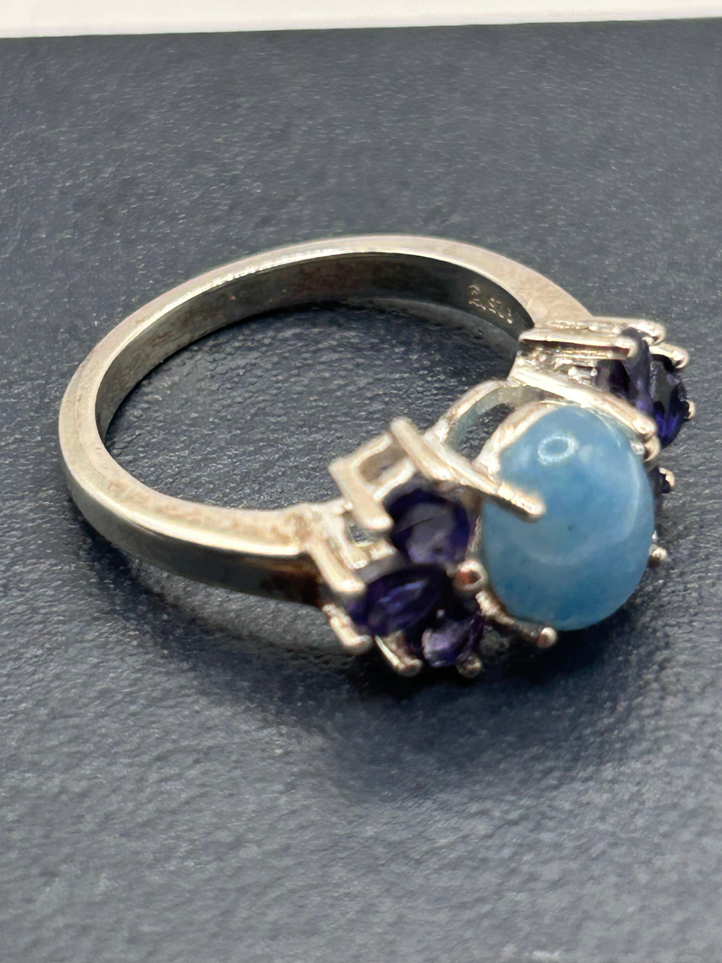A Thor Blue Quartz and Bengal Iolite Silver Ring, crafted from sterling silver and visibly marked “925” on the interior of the band. The ring features a central, round, light blue cabochon stone, flanked on either side by a cluster of three smaller, faceted, dark purple stones arranged in a decorative, somewhat floral design.