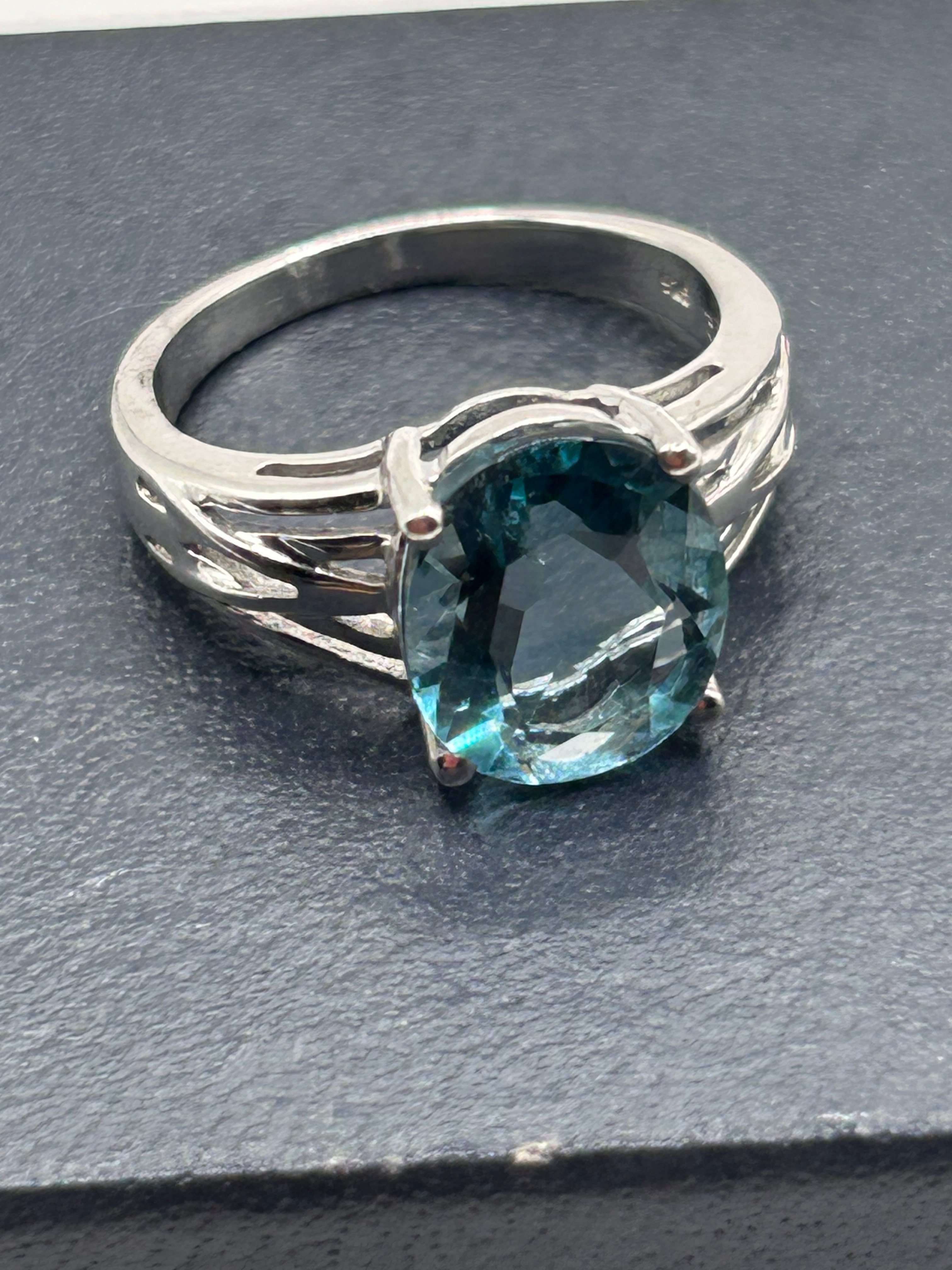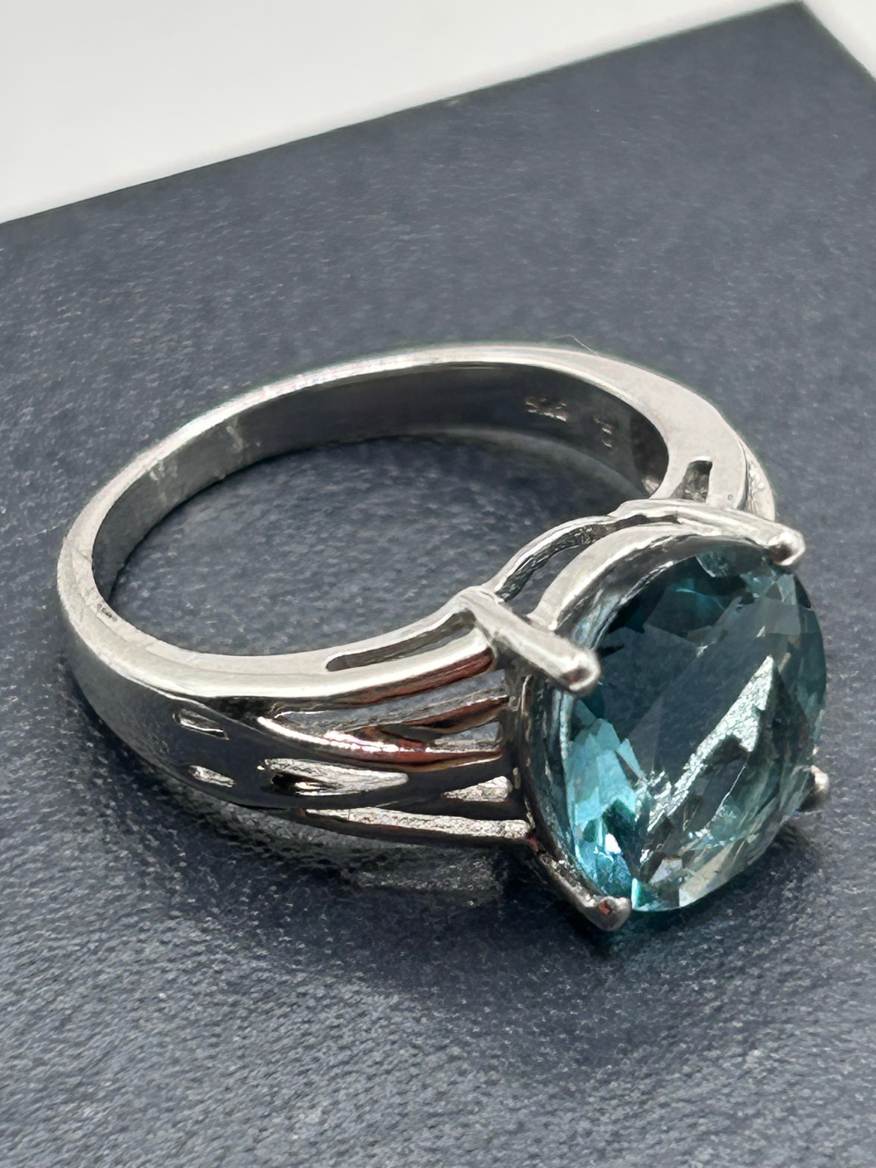 A contemporary solitaire-style ring featuring a large, faceted oval or cushion-cut blue-green Topaz gemstone prominently set in a four-prong mounting. Crafted from Silver, the shoulders of the band are adorned with an openwork, abstract design. An ‘S925’ hallmark is visible on the interior of the band.