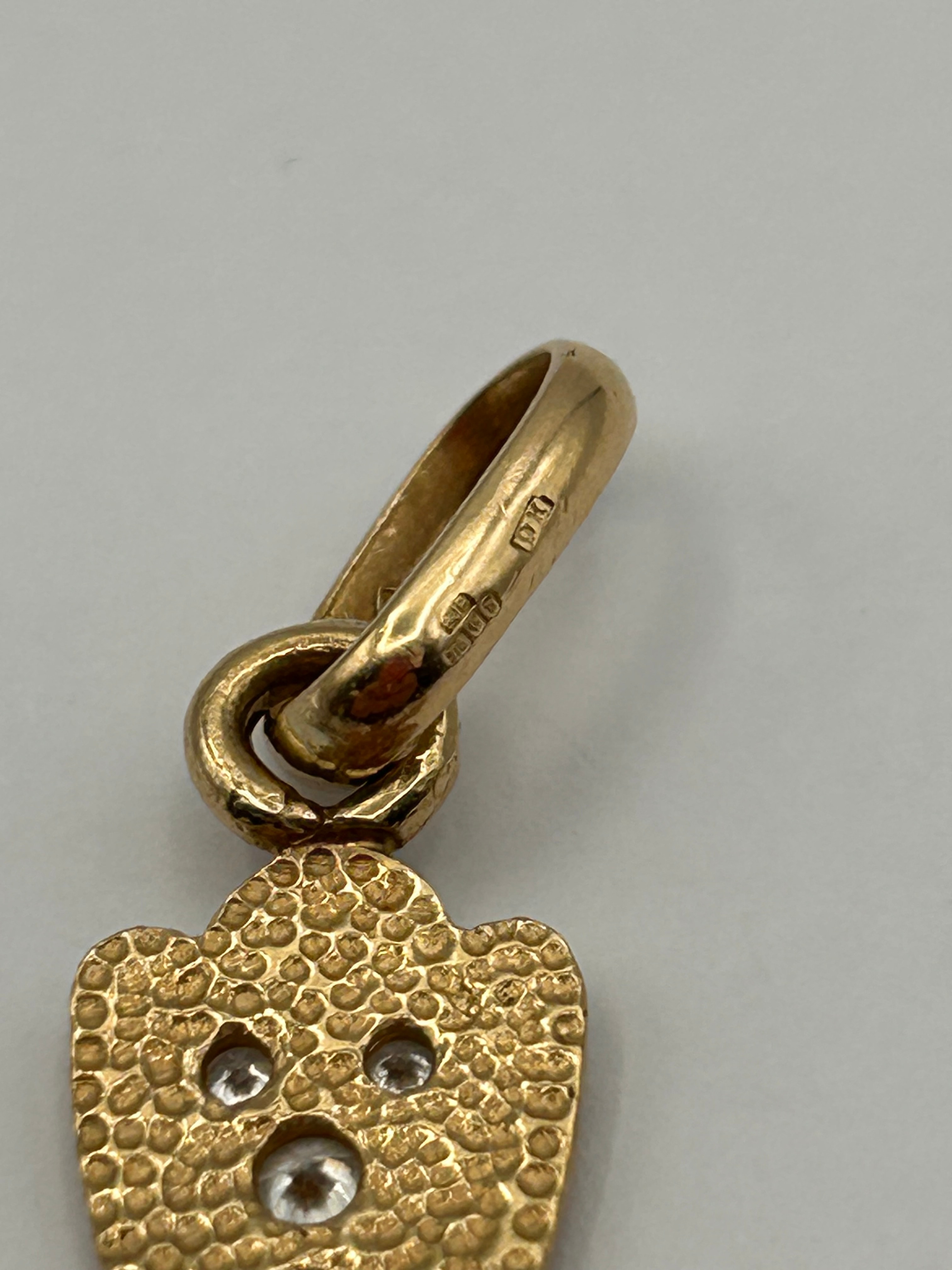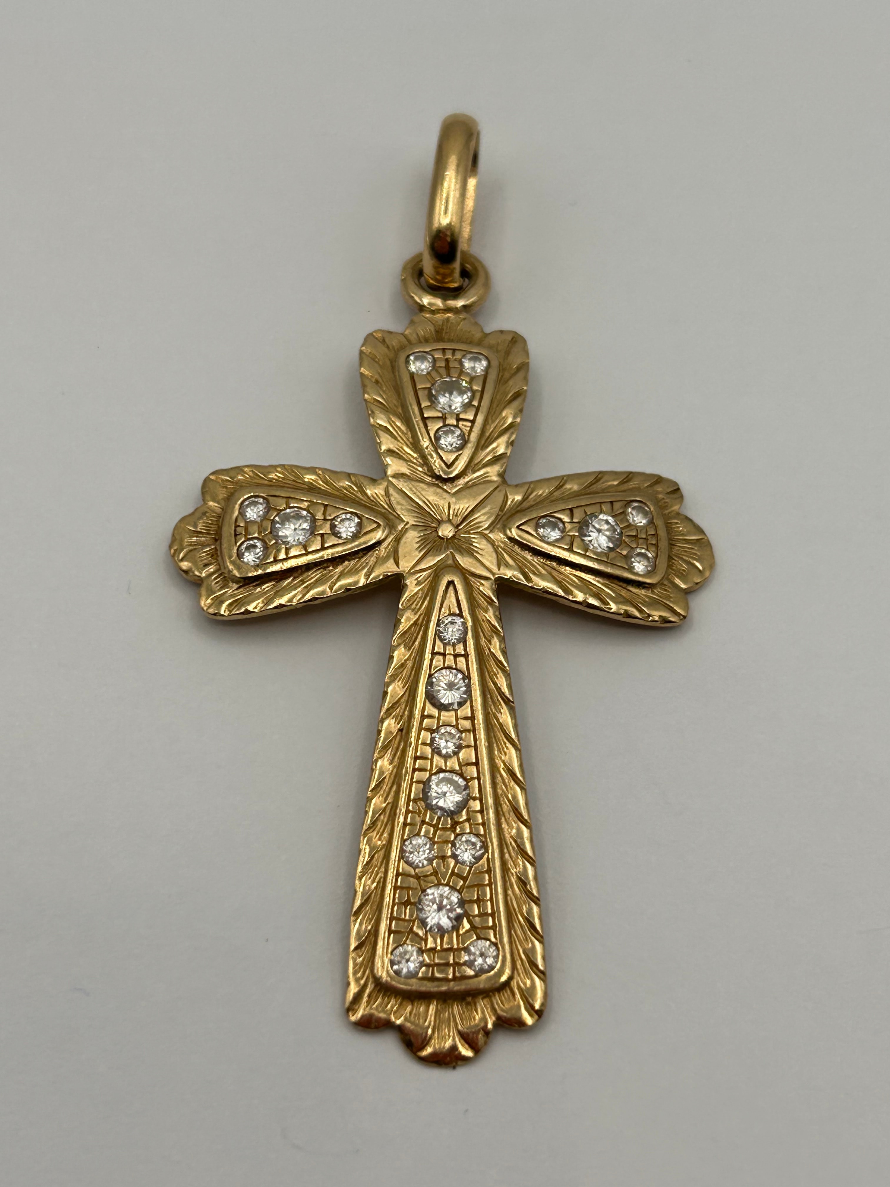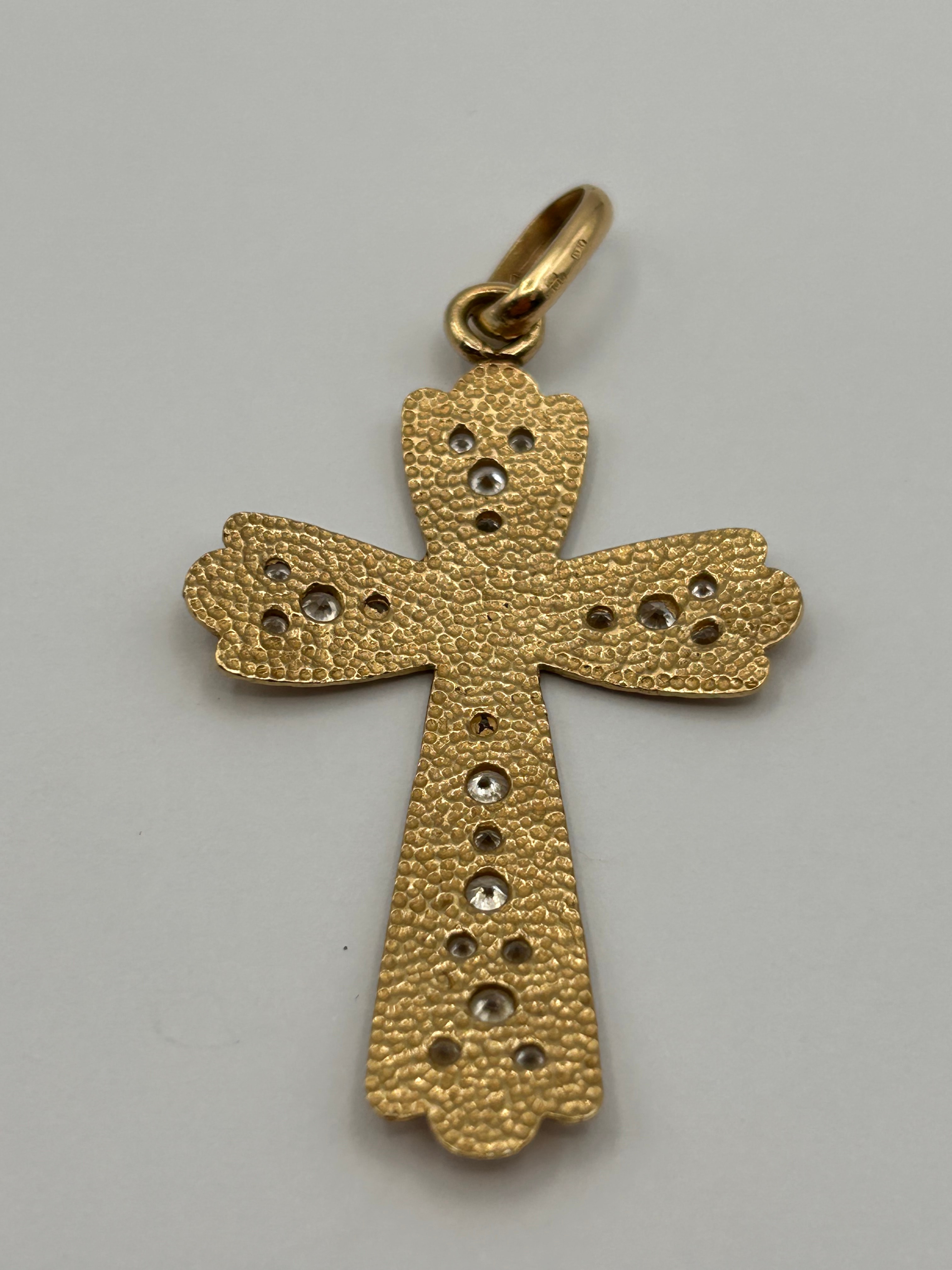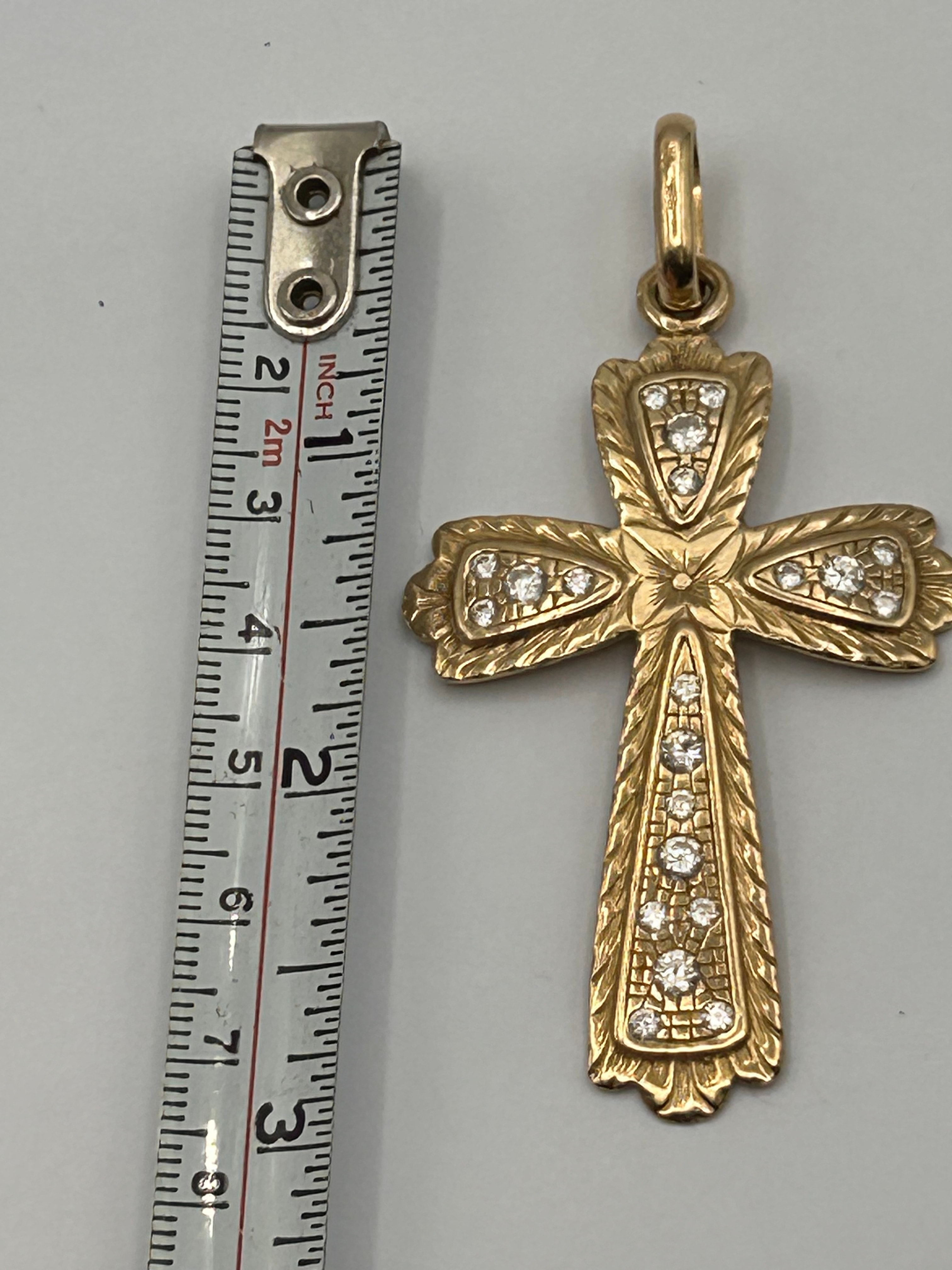 A cross-shaped Gold pendant, confirmed as 9ct Gold and weighing 11.7g. The ornate design features flared, scalloped arms decorated with a central floral motif and radial textured or engraved patterns. The front surface is embellished with numerous bezel-set, round colorless stones. The reverse of the cross exhibits a uniform hammered or textured finish. Hallmarks are visible on the bail.