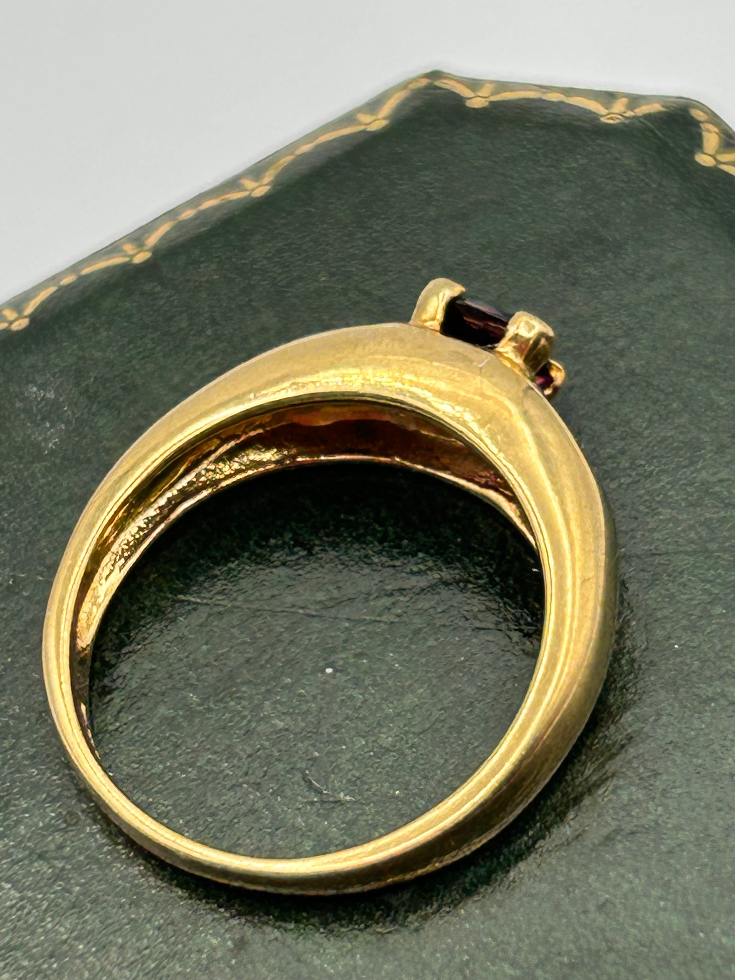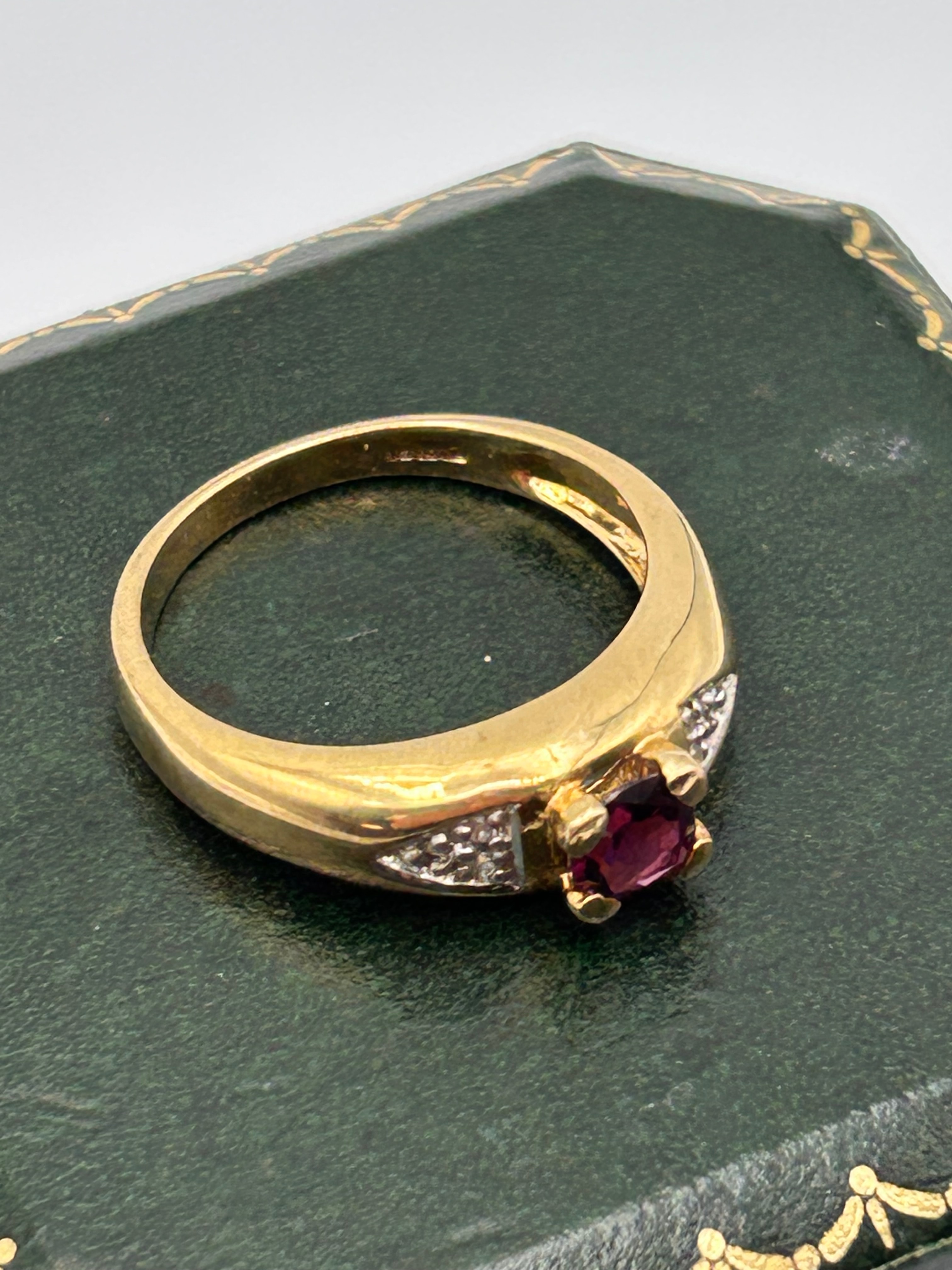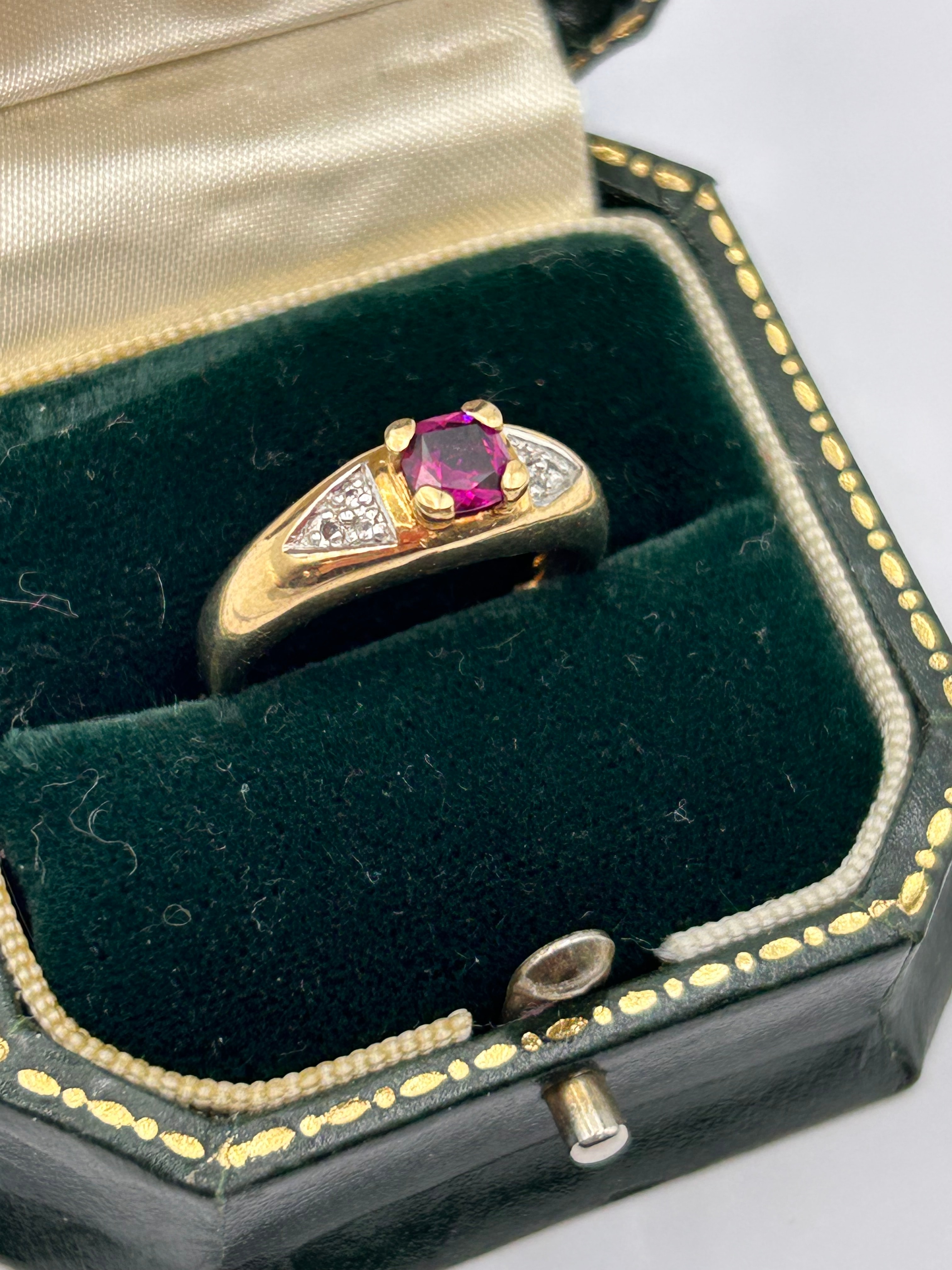 An antique 9k gold ring featuring a central round, faceted, deep purplish-red ruby, prong-set, flanked by shoulders each accented with three small, round, clear diamonds set into contrasting white gold sections. The band is smooth.