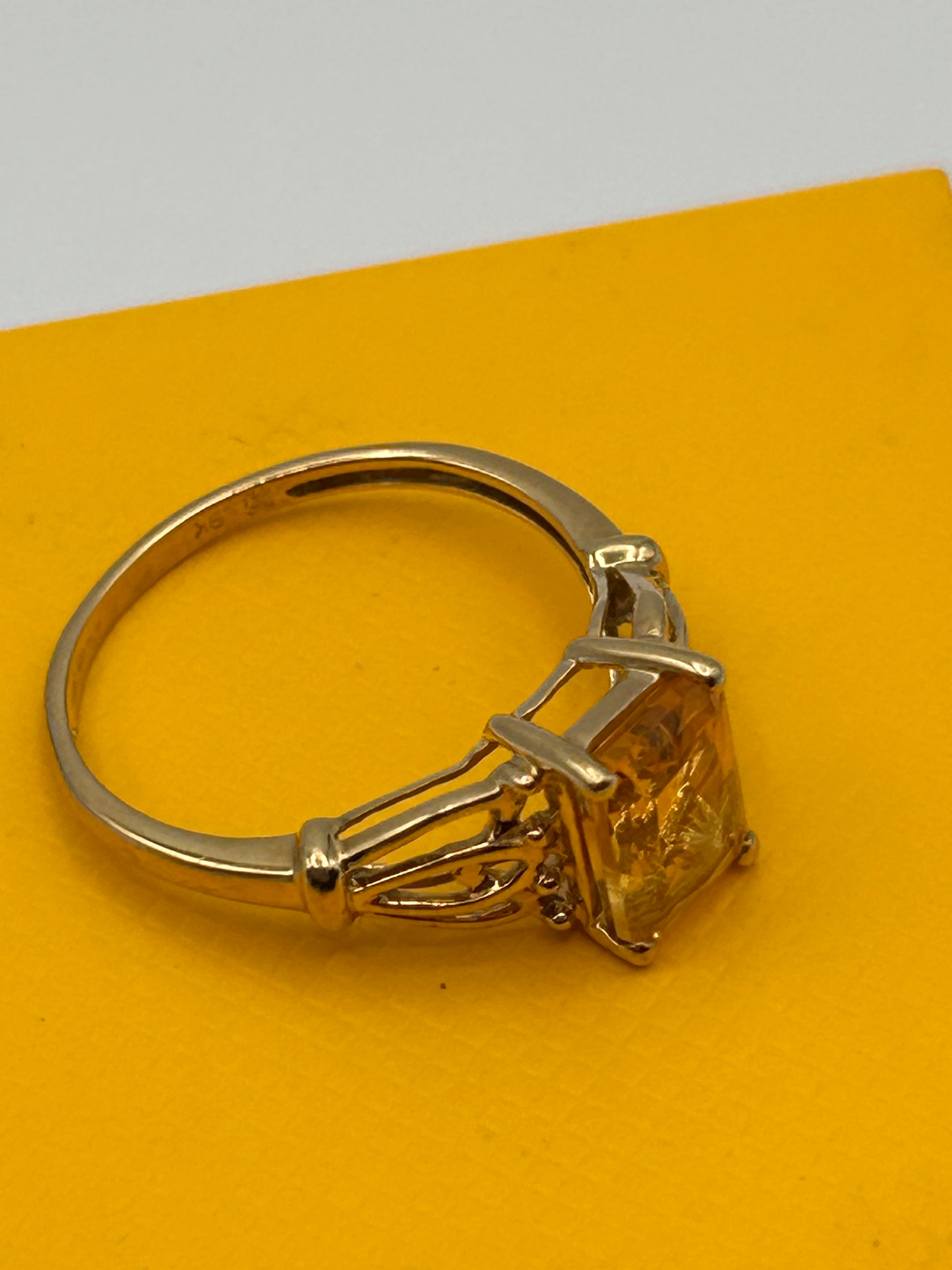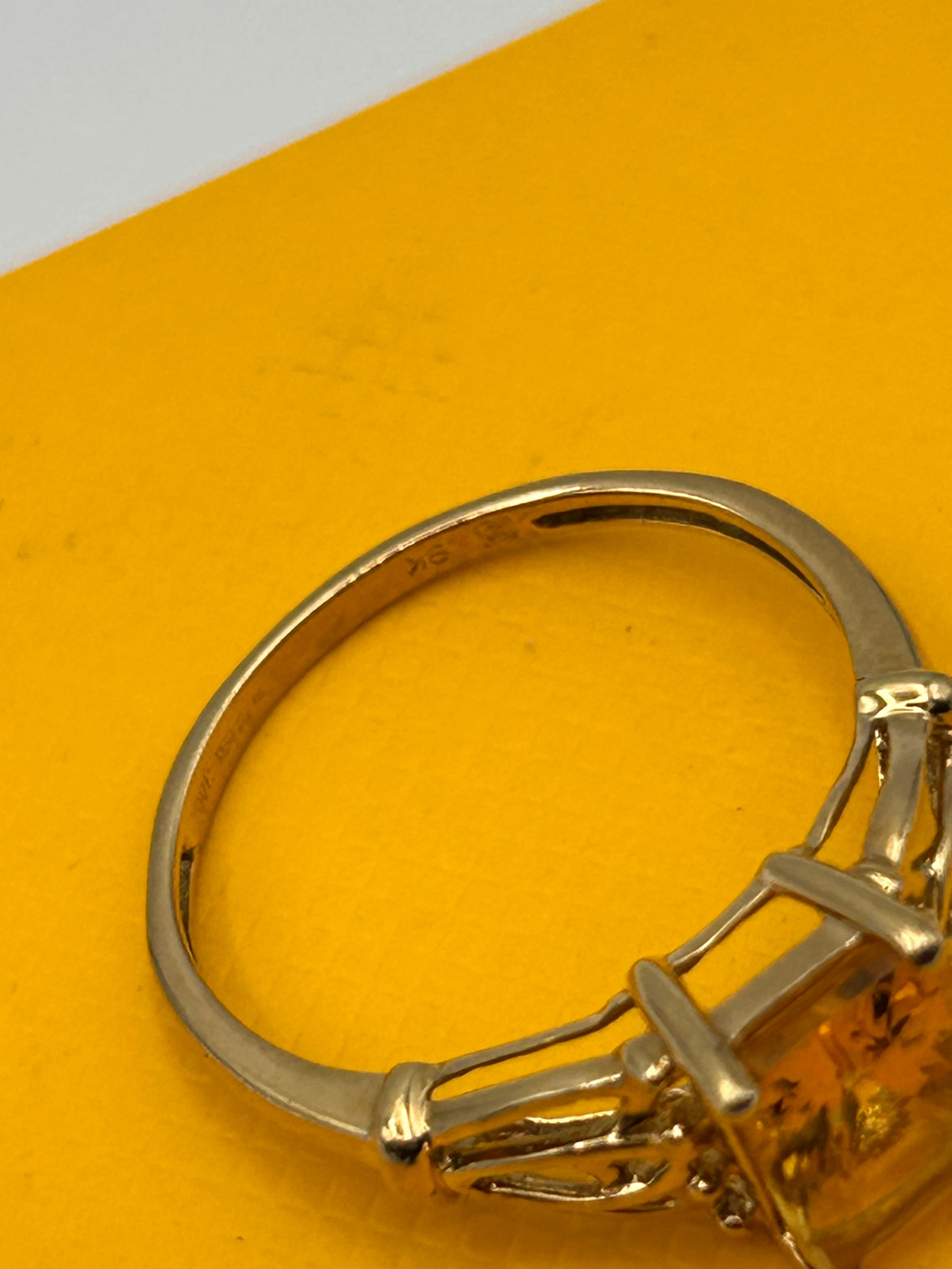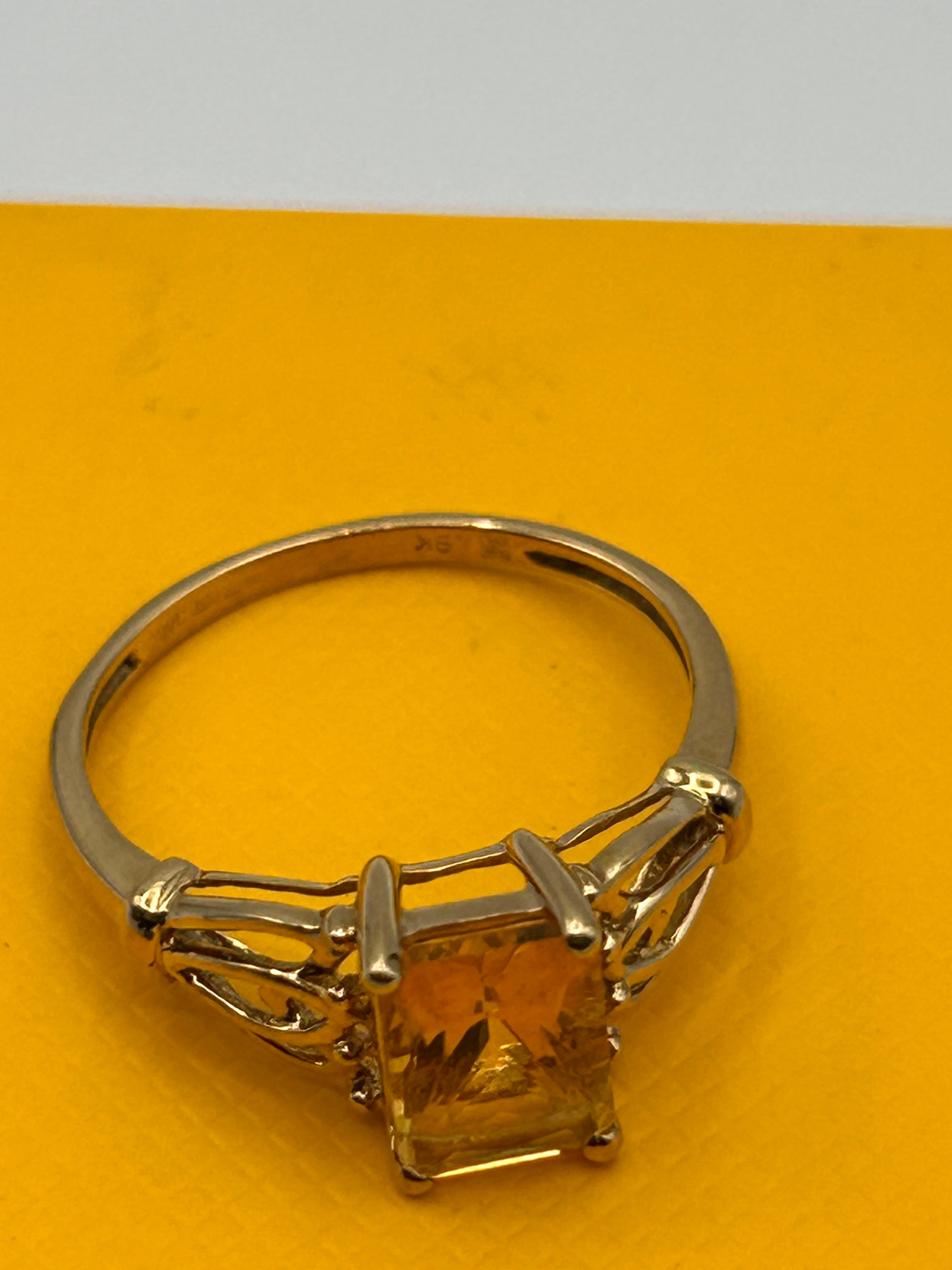 A vintage Art Deco style finger ring, crafted from 9ct gold. It features a large, centrally set, rectangular or cushion-cut citrine gemstone, secured by a four-prong elevated basket setting. The ring’s shoulders display an openwork or filigree design.