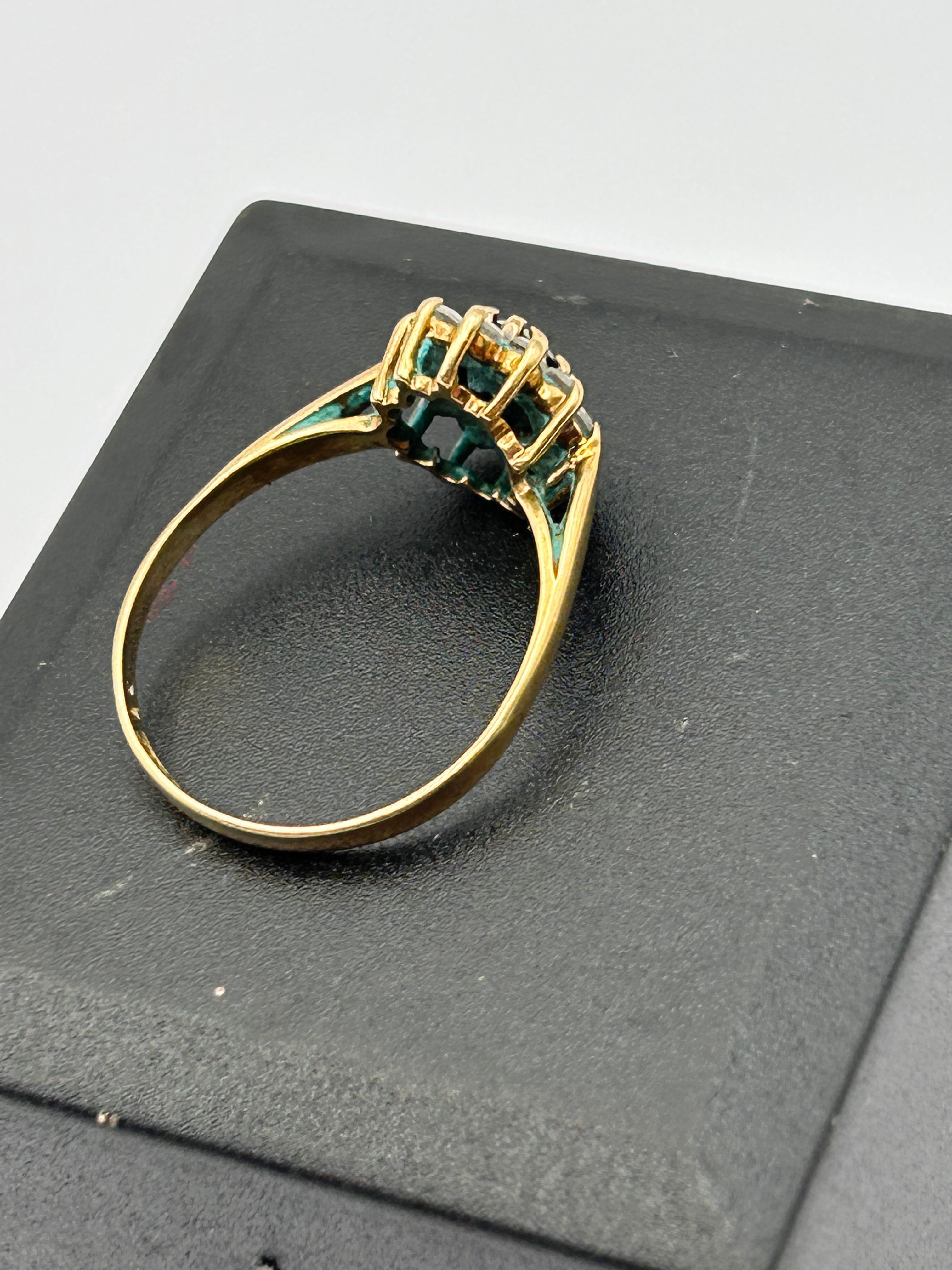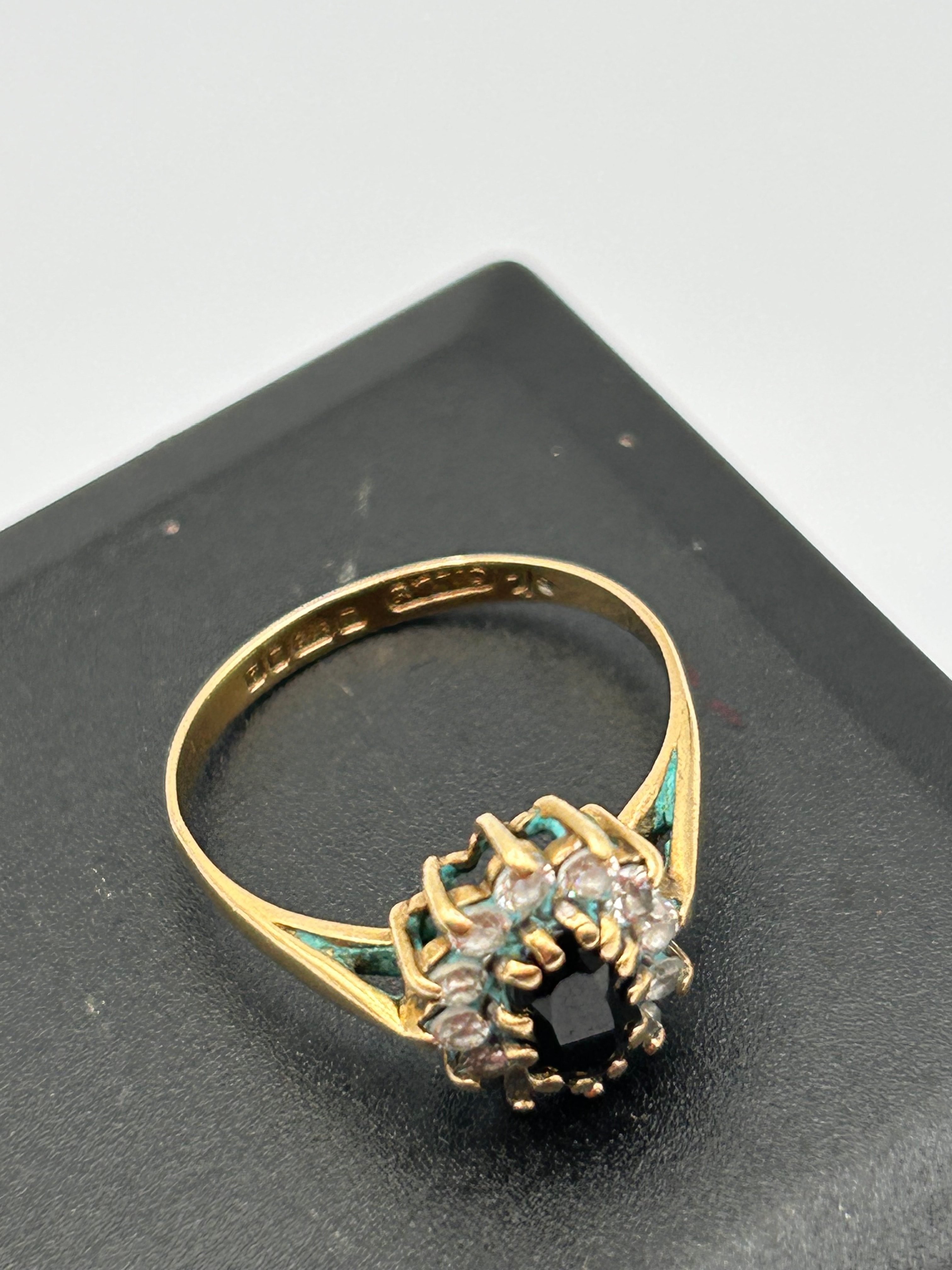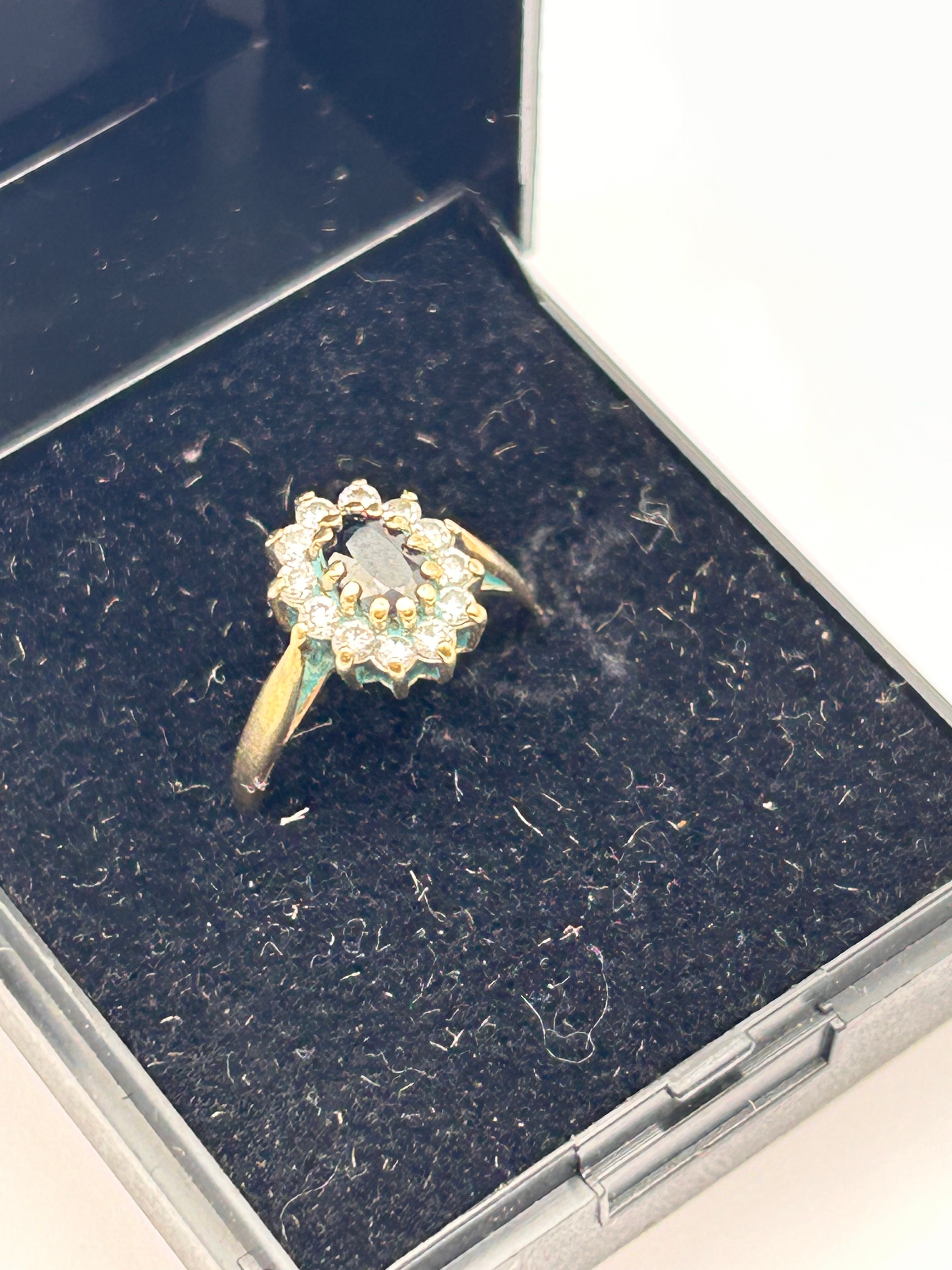 A 9ct Gold Sapphire & Diamond Cluster Ring, featuring a prominent cluster design with a central oval or cushion-cut sapphire, surrounded by a halo of approximately ten smaller, round diamonds, all set in an elevated basket mounting. The inner band is visibly marked “375,” indicating 9-carat gold, alongside another partially legible mark. The ring is presented within a black, flocked box.