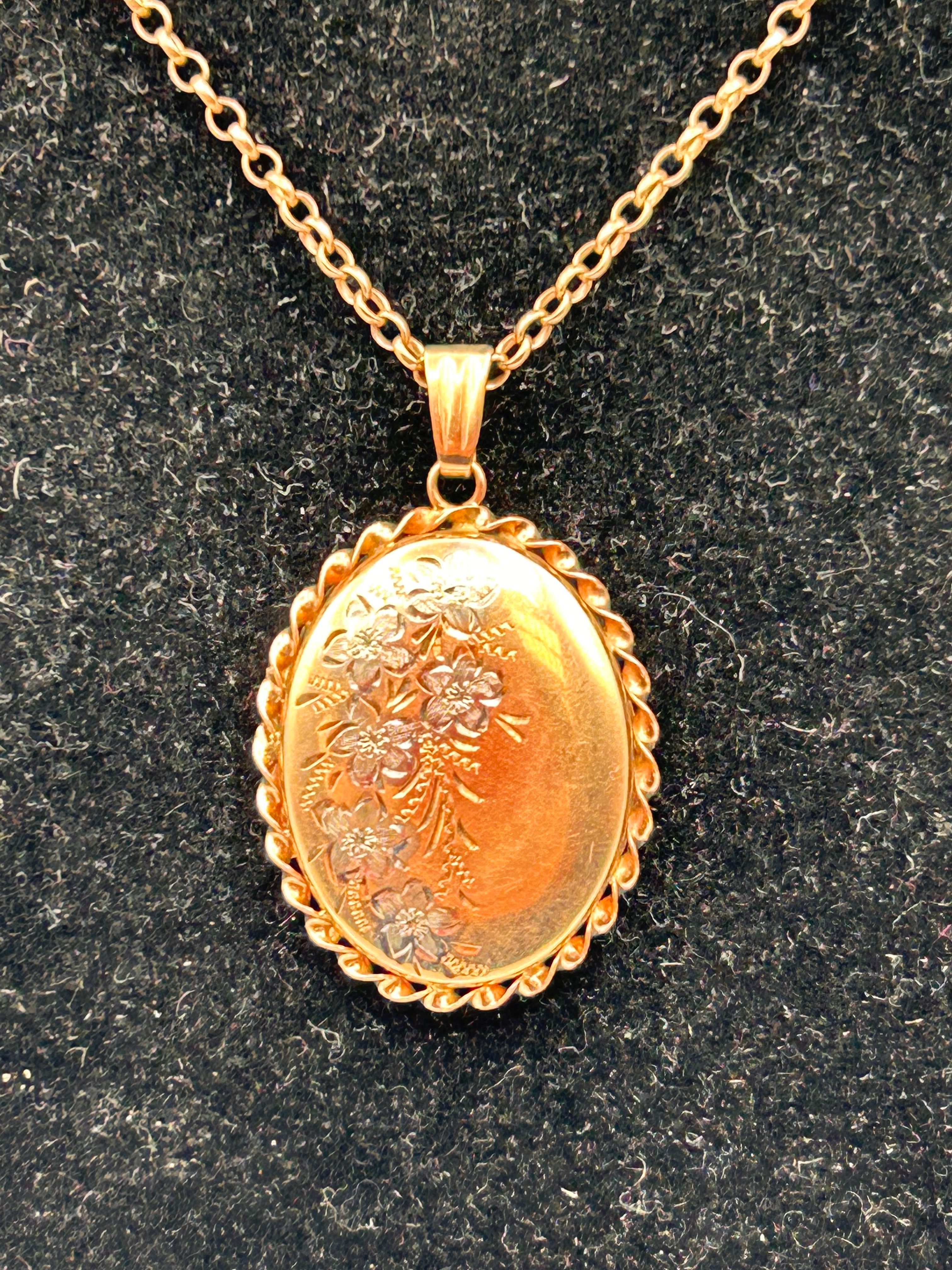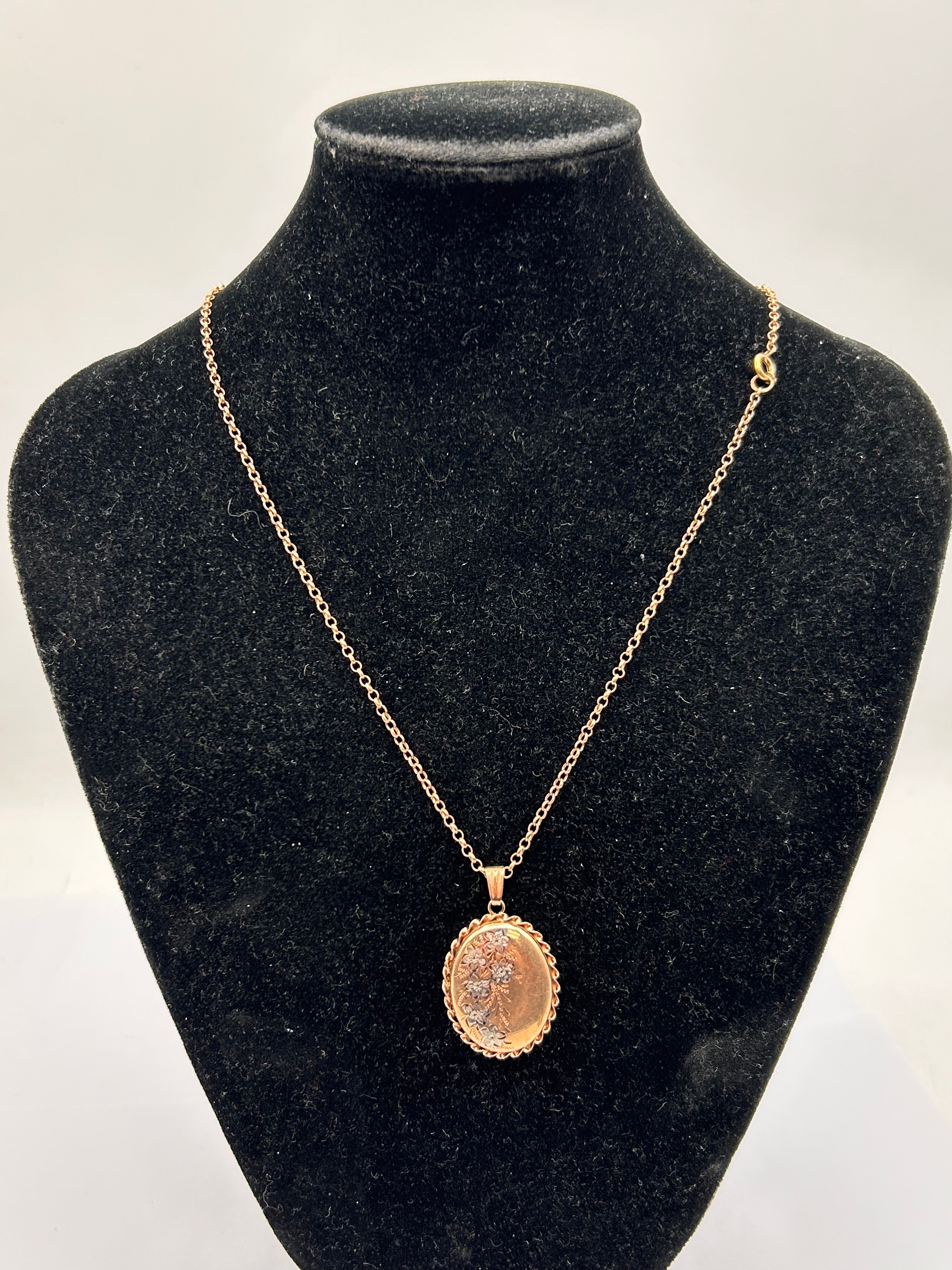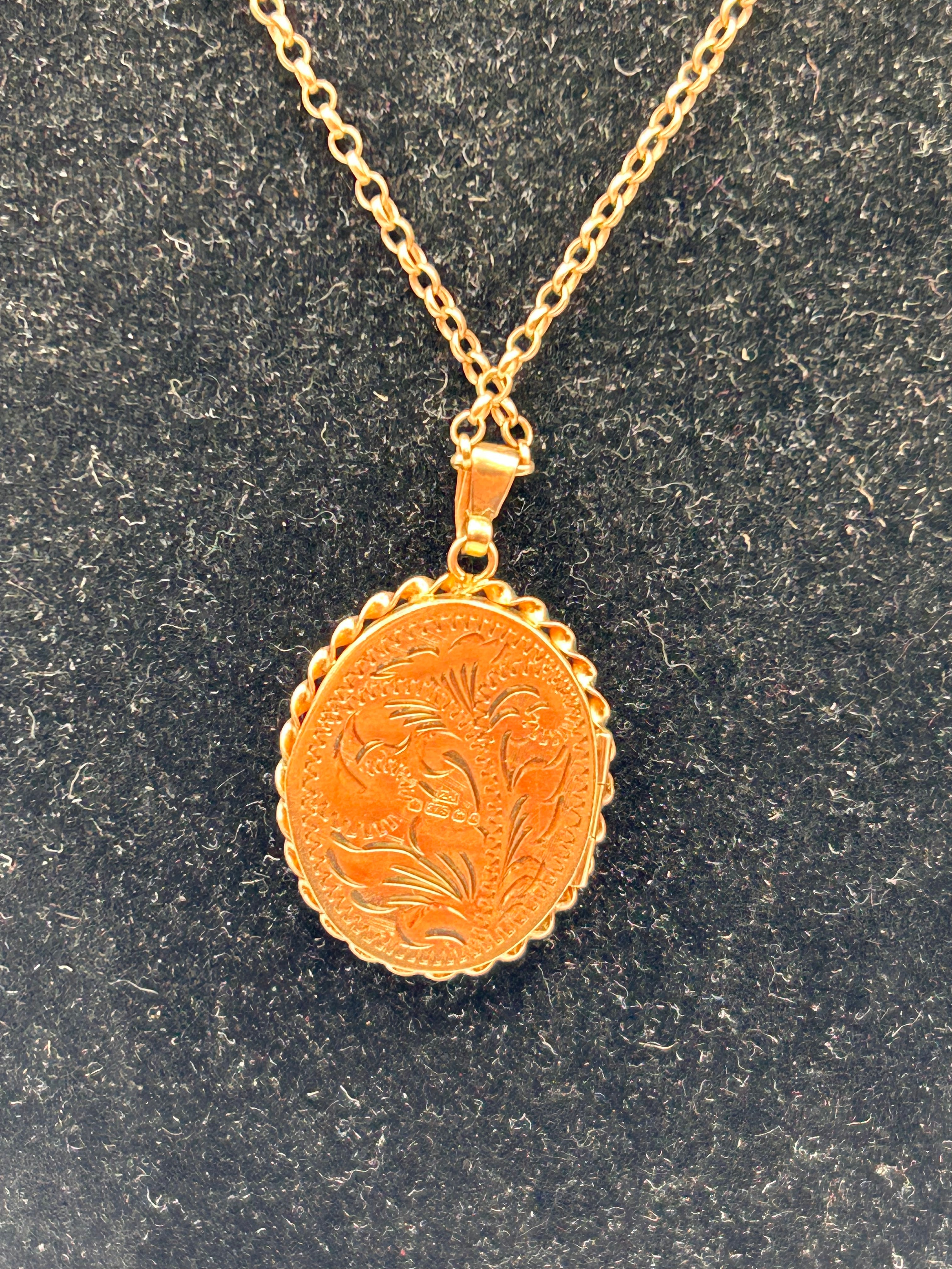 A 9ct rose gold necklace featuring a delicate link chain and an oval locket The pendant is designed with a decorative twisted-rope edge bezel surrounding a central element. . Both visible faces of the pendant exhibit intricate floral engravings, with slightly differing patterns.