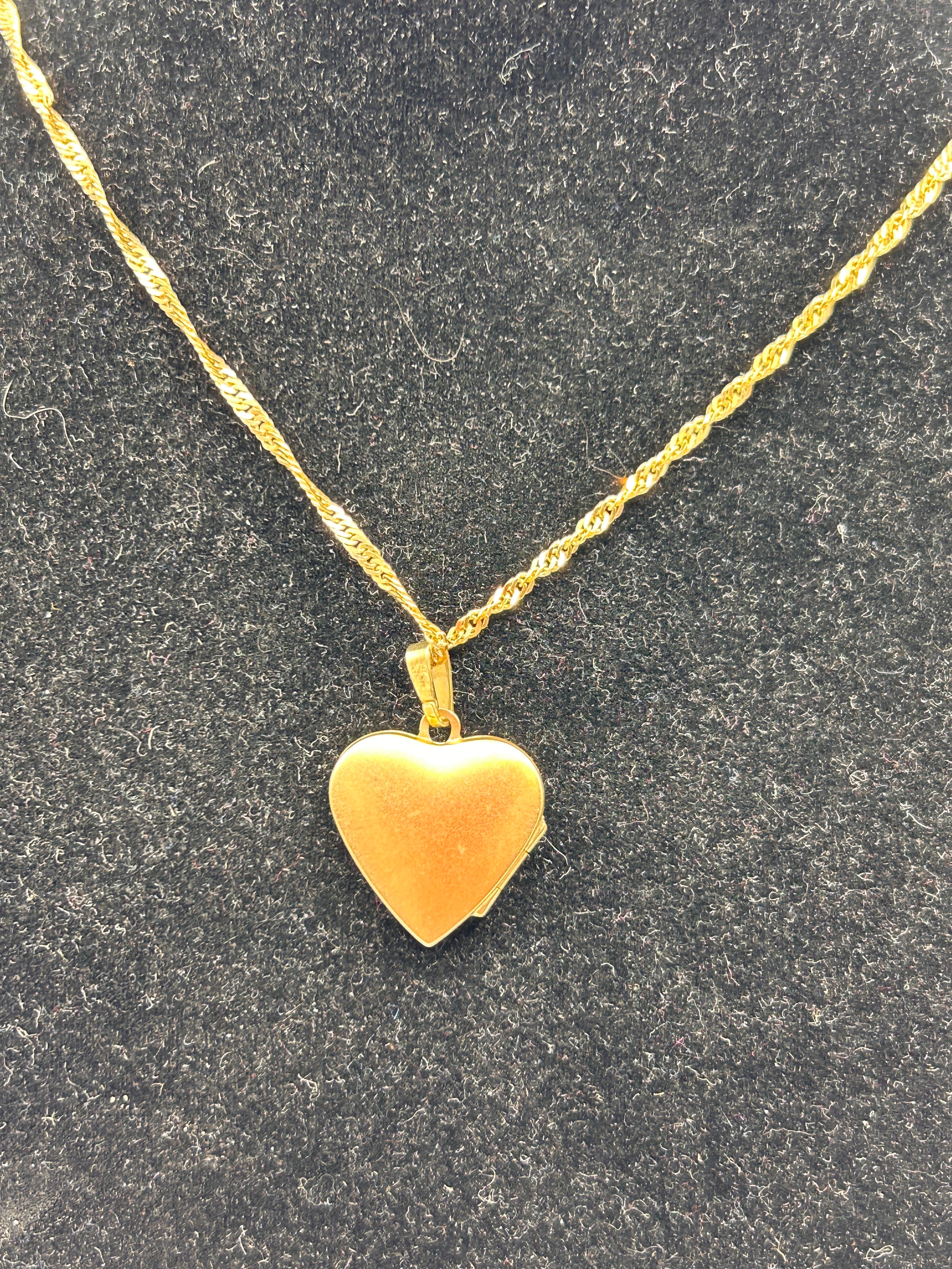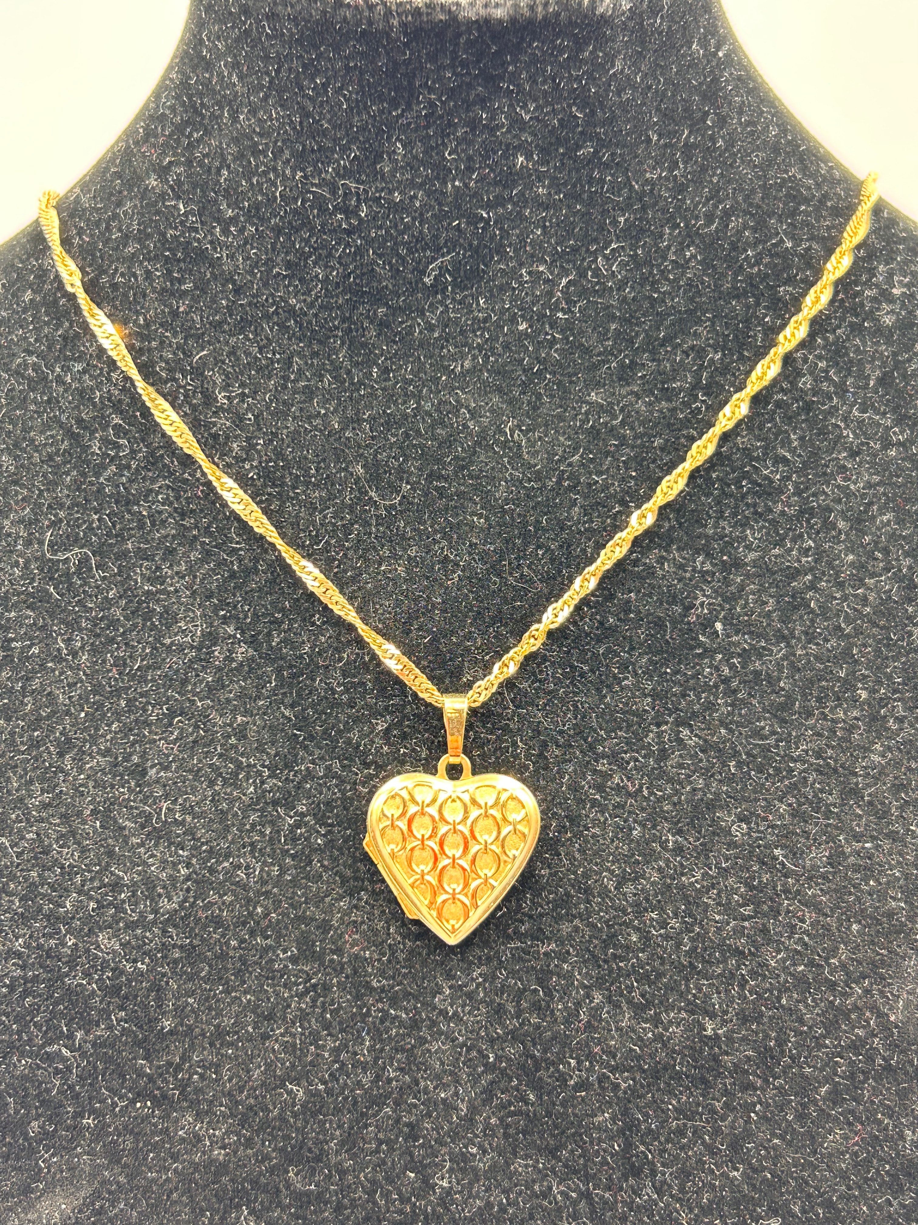 A gold-toned necklace comprising a twisted rope-style chain and a heart-shaped locket pendant. The locket’s front features a decorative open-work lattice pattern, while the reverse is plain and polished. The apparent material is a bright gold-toned metal; without visible hallmarks, its composition (e.g., solid gold, plated, filled) cannot be determined. The overall style is contemporary.