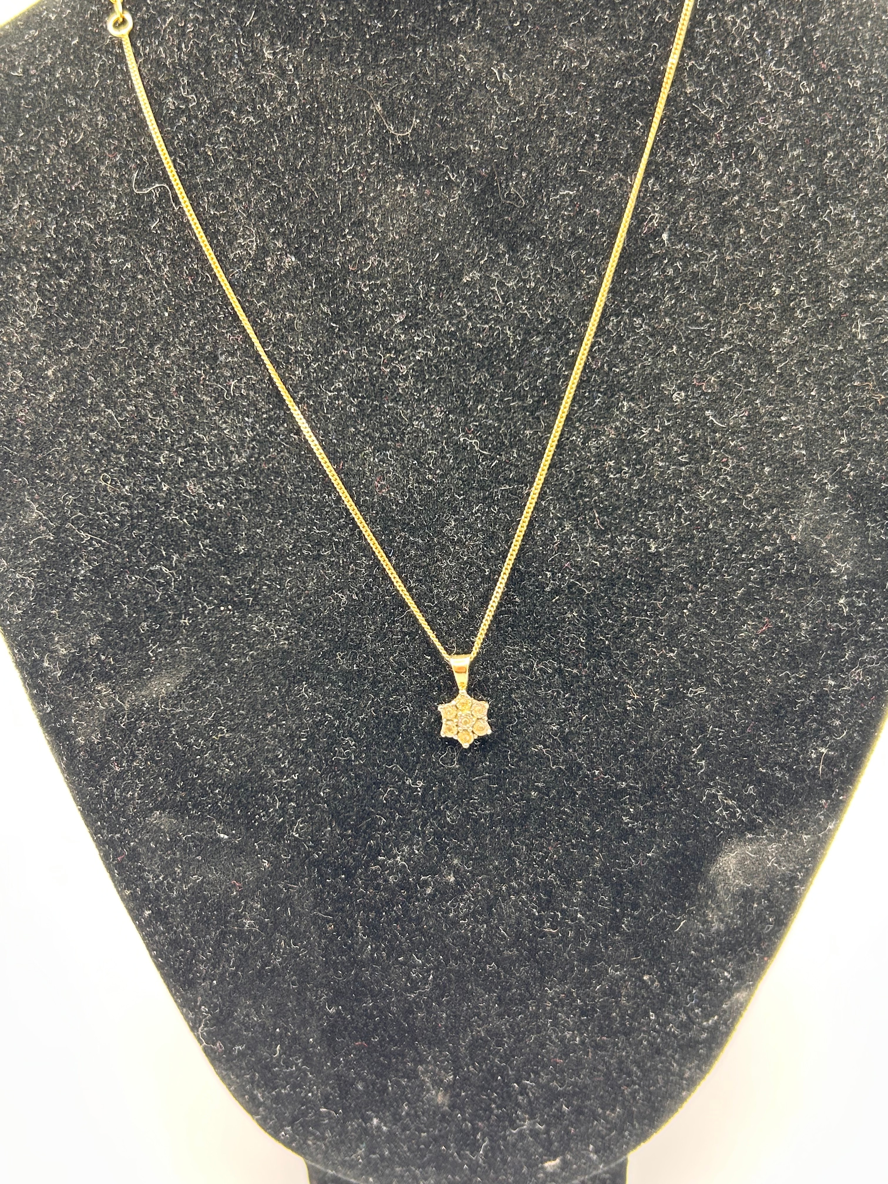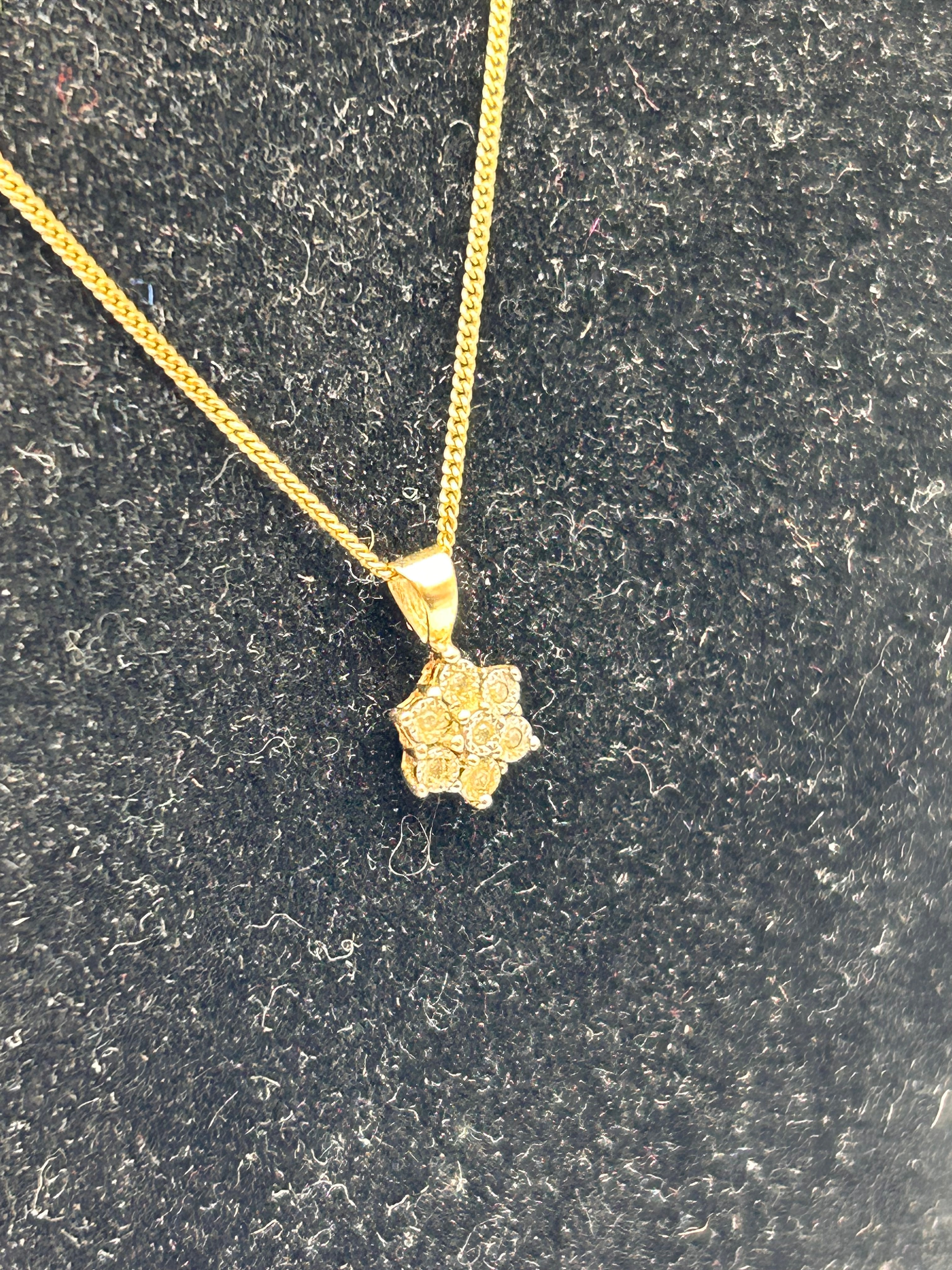 A 10ct gold chain suspending a 9ct gold Star of David pendant. The pendant is designed as a six-pointed star, set with a central round, faceted diamond surrounded by six smaller, similarly cut diamonds, appearing colorless . Each diamond is individually set, likely in a bezel or prong setting, and the pendant is suspended from the fine-link chain via a polished bail. The chain is a fine-link style, likely curb or similar textured link.