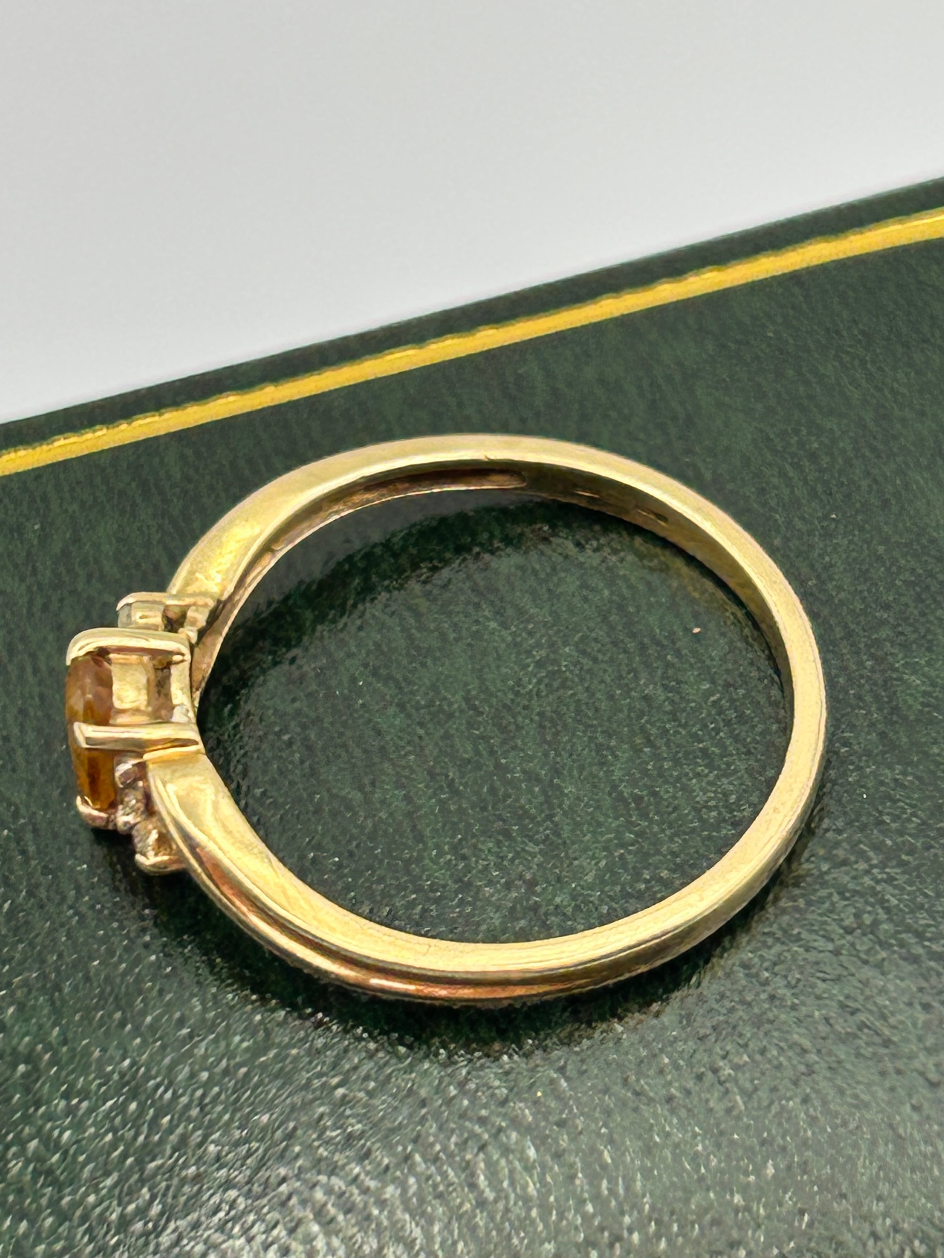 A 9ct gold three-stone ring, featuring a central oval-cut, faceted orange-yellow gemstone, flanked by two smaller round, clear stones. The ring’s band is marked ’14K’ on the interior. The item appears to be of modern or recent vintage.