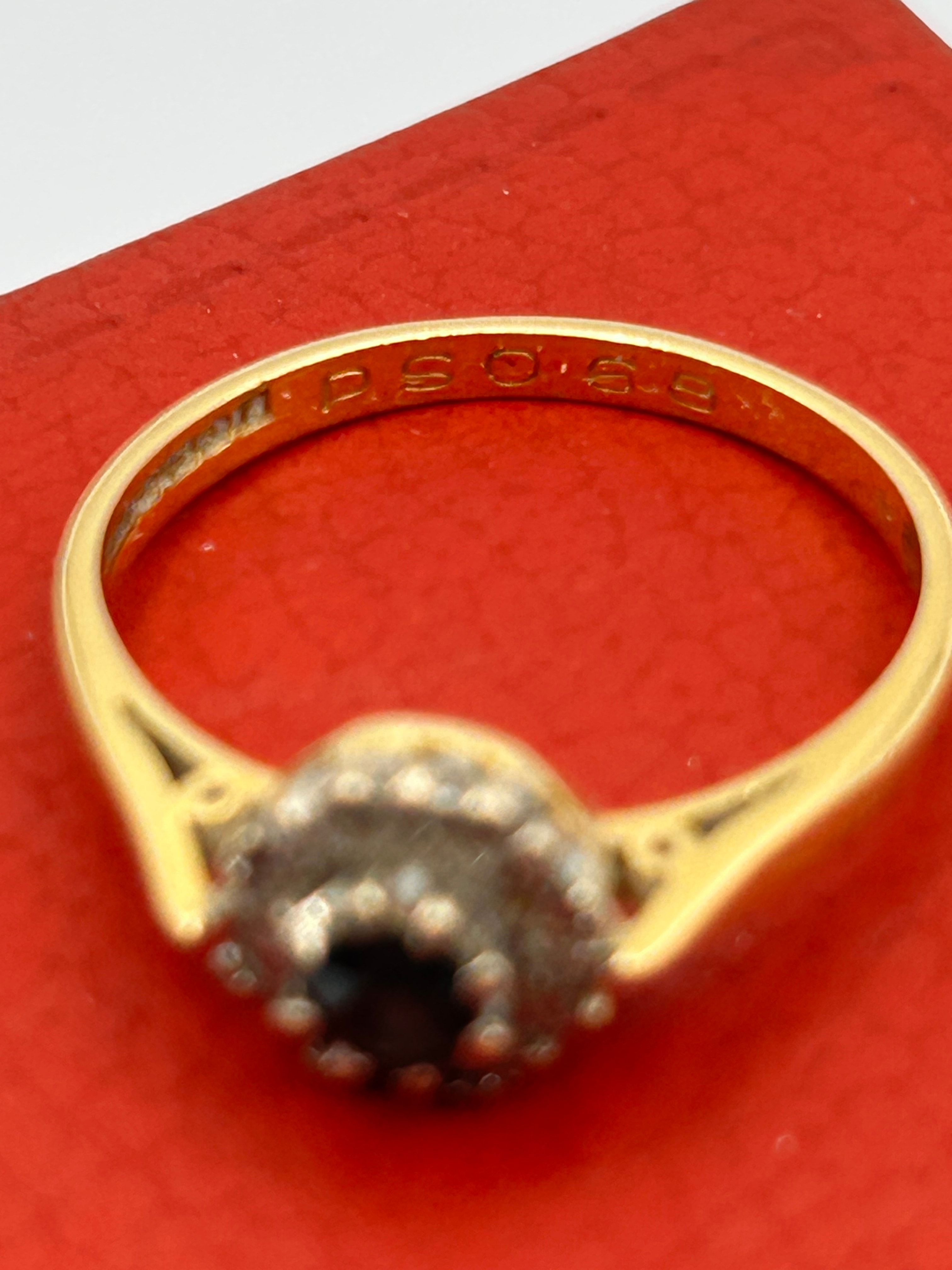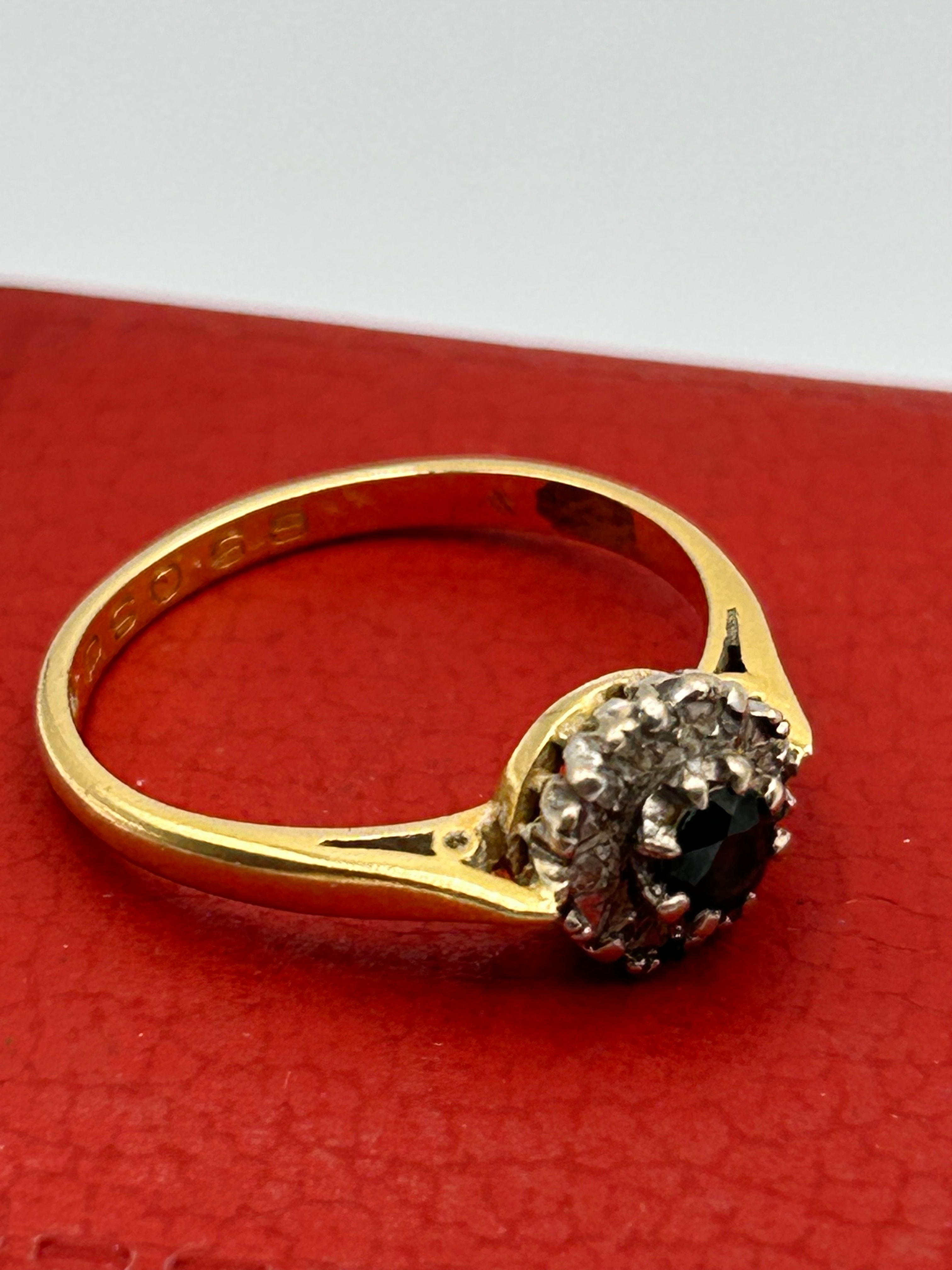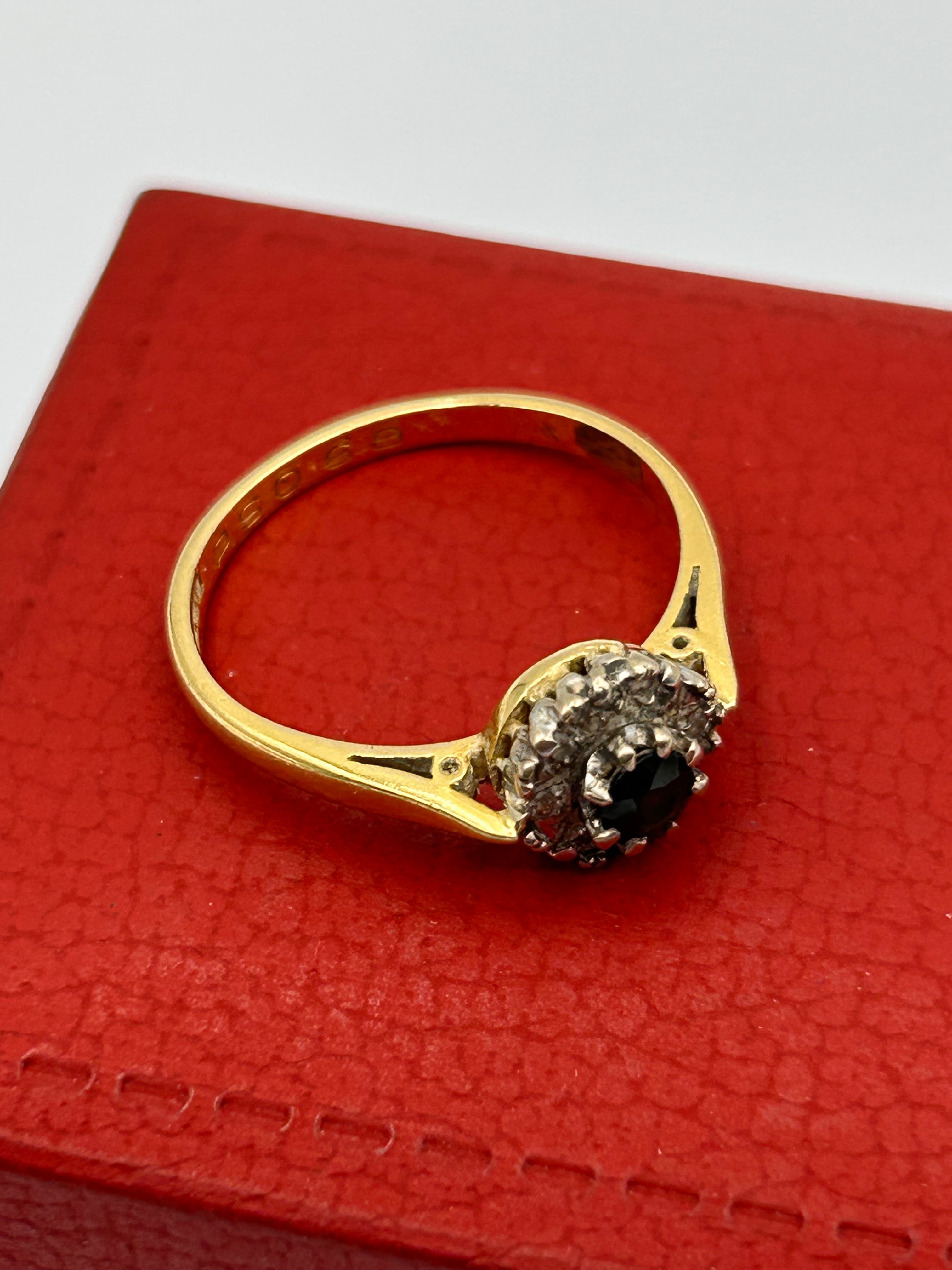 An 18ct yellow gold sapphire and diamond cluster ring. The ring features a central round faceted dark sapphire, encircled by a halo of small, clear accent diamonds, all set in a white metal cluster head. The cluster is mounted on a yellow gold band, which exhibits decorative black enamel or inlay details on the shoulders. The interior of the band is visibly stamped with the marking “250 S. G.”.