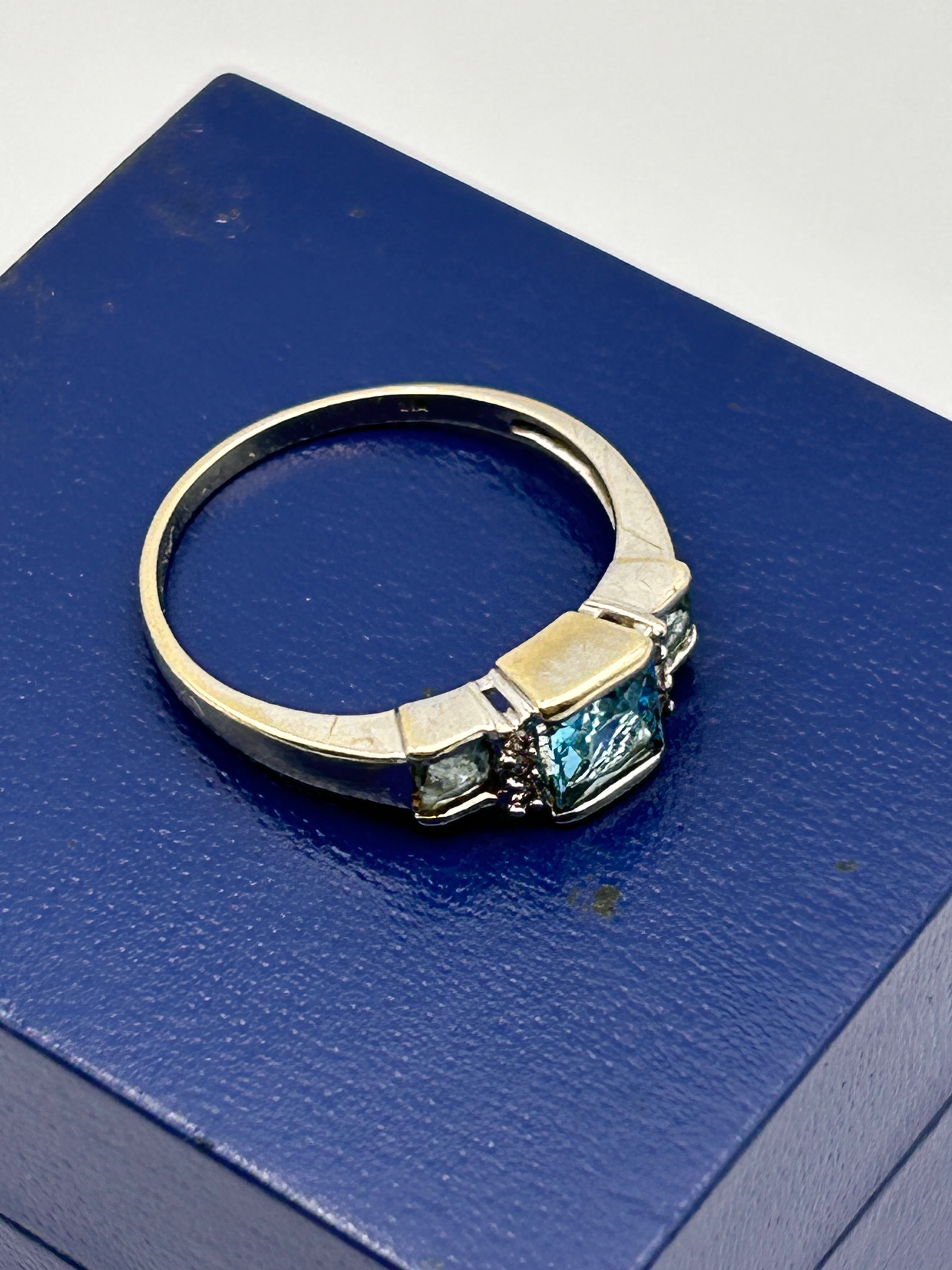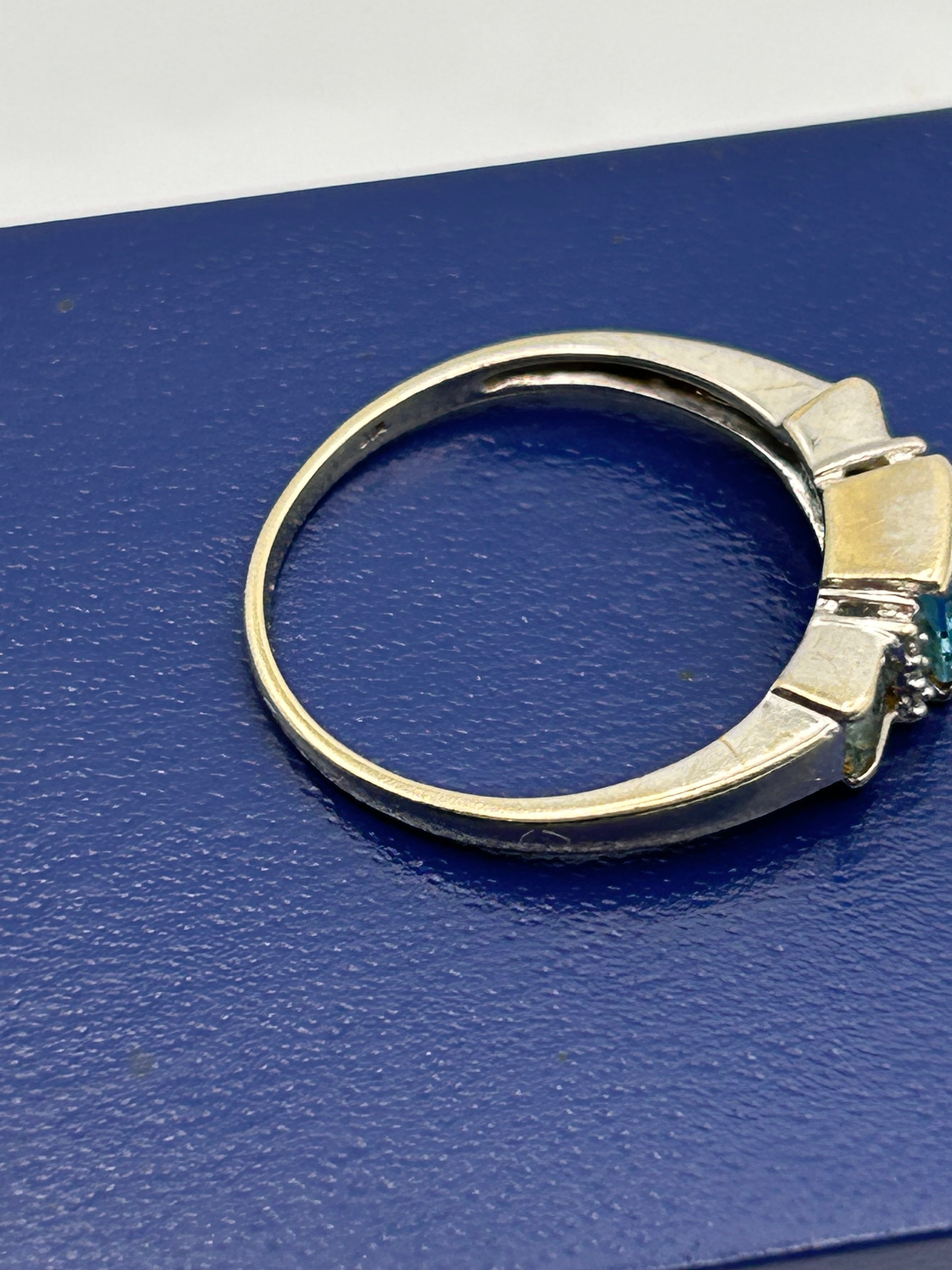 A 9ct white gold blue topaz and diamond ring, crafted from a silver-toned metal, featuring a central rectangular-cut blue-green stone flanked by two smaller, lighter-colored accent stones. The setting has a geometric design with a notable yellow-toned metal accent on the gallery surrounding the main stone.