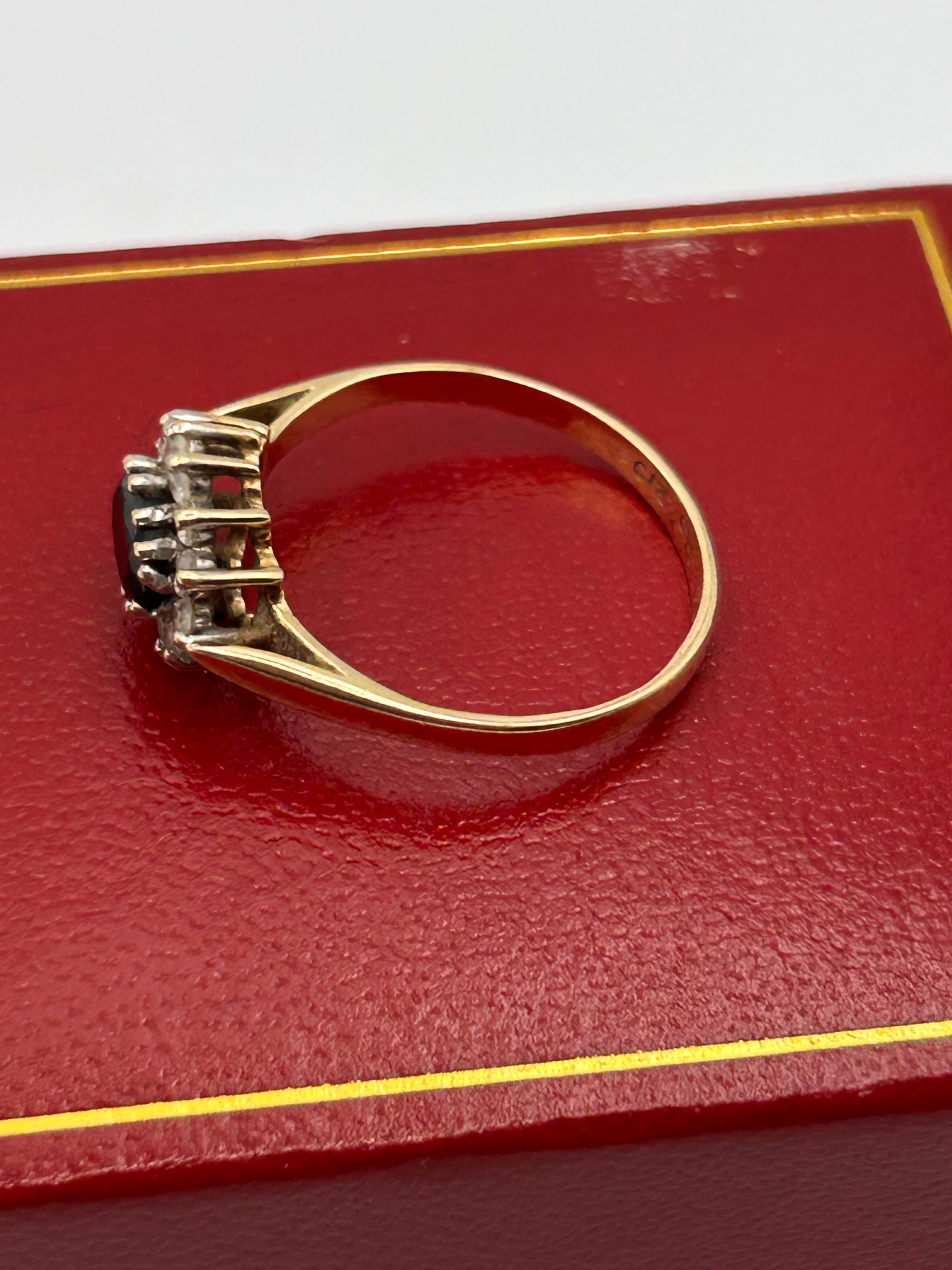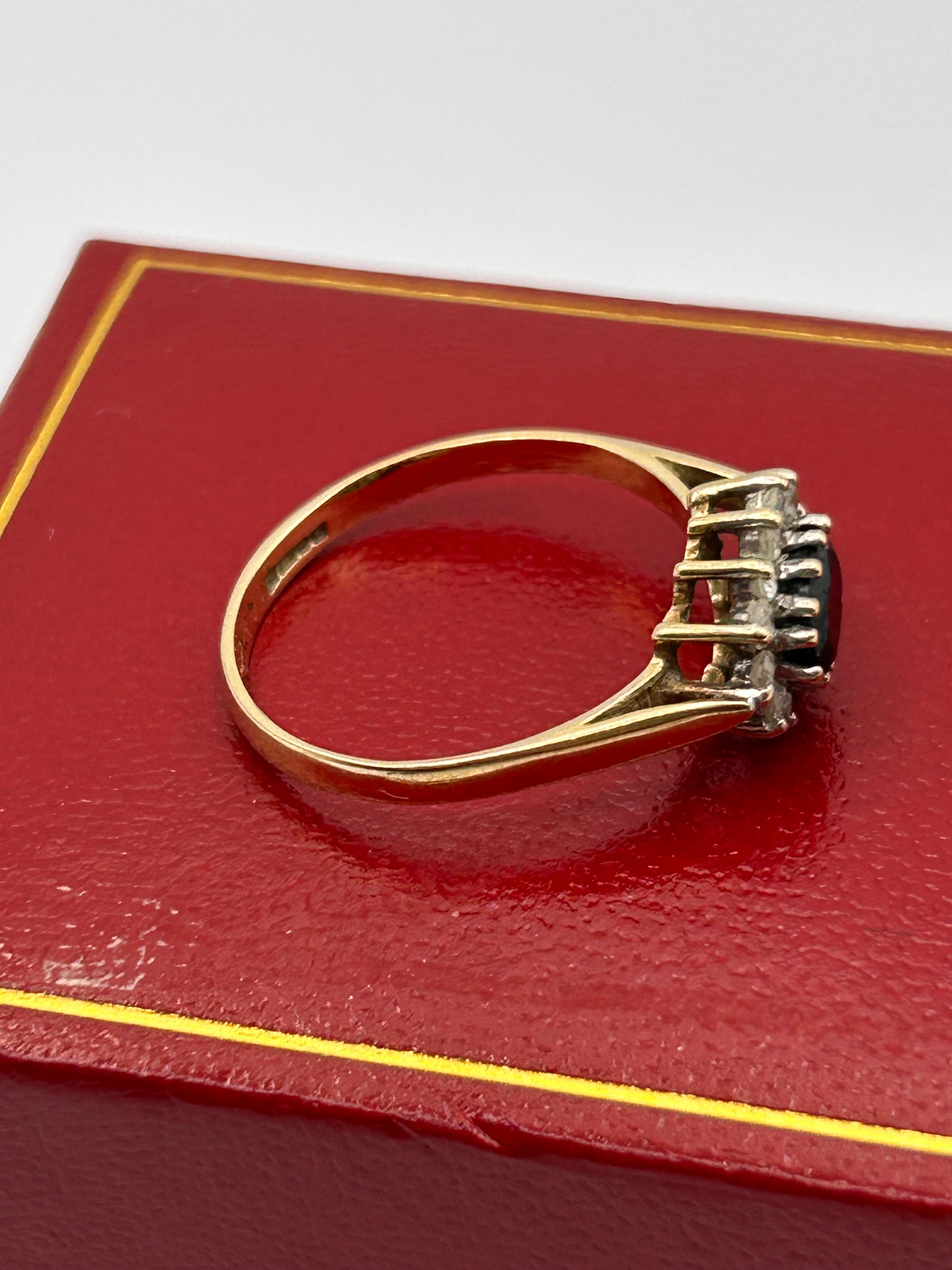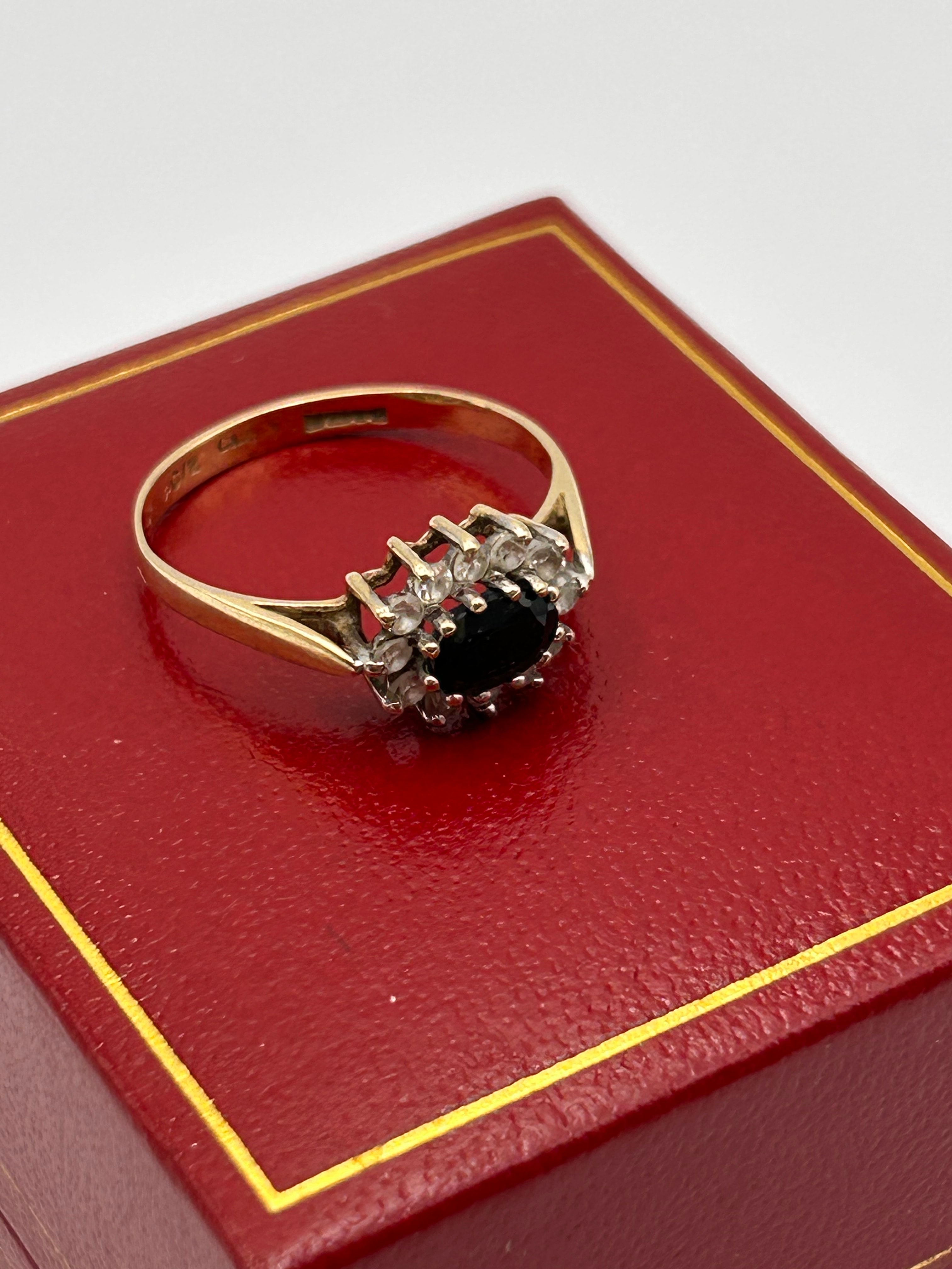A vintage 9ct yellow gold sapphire and CZ? flower cluster ring. The ring features a central oval-cut dark blue sapphire, encircled by a halo of smaller round-cut diamonds, set in a contrasting white metal. The polished yellow gold band has tapered shoulders and an openwork gallery beneath the setting. Markings on the interior of the band include ‘9CT’, British hallmarks, likely including an anchor symbol for the Birmingham Assay Office, and a maker’s mark ‘CLE’.