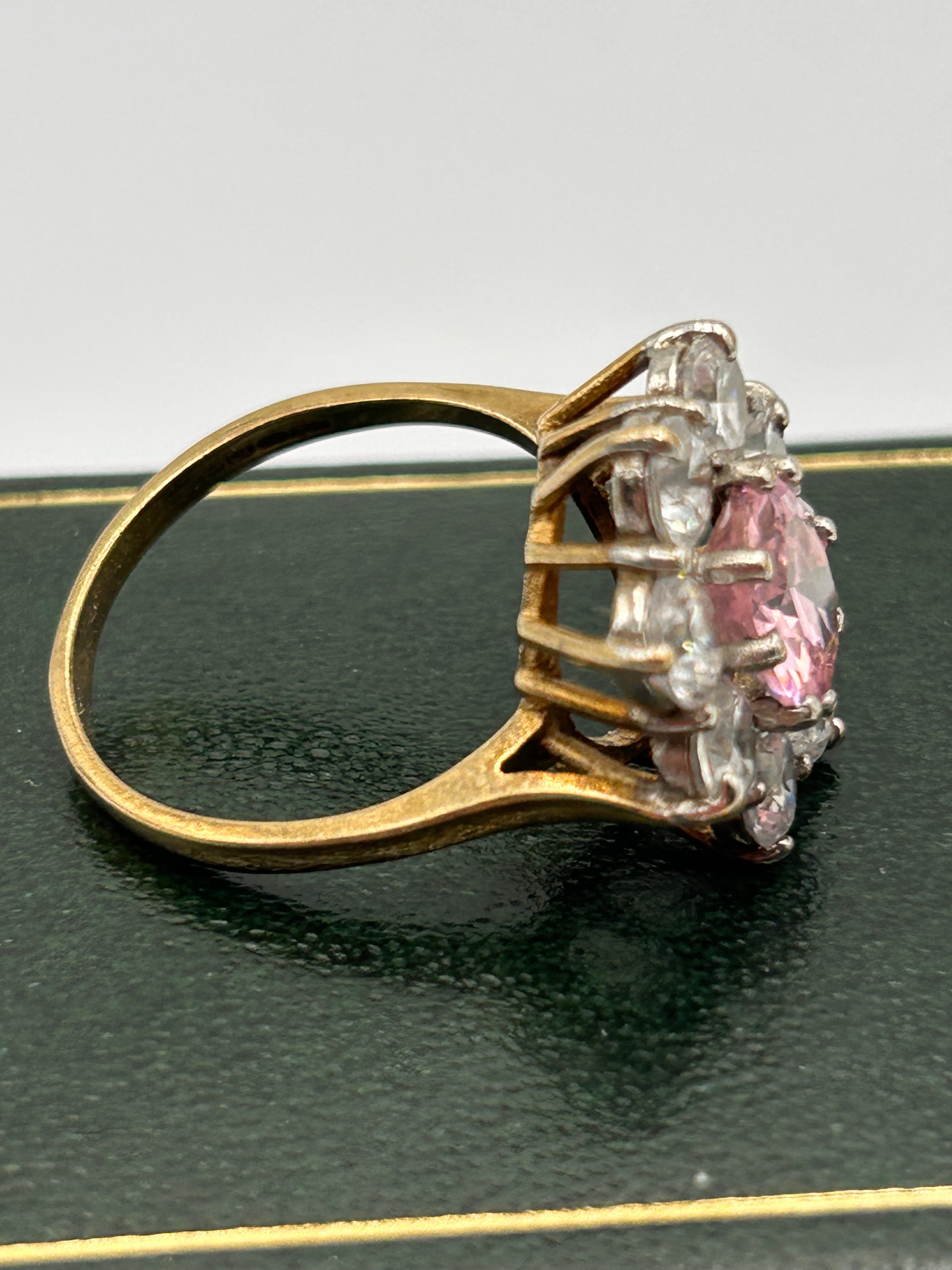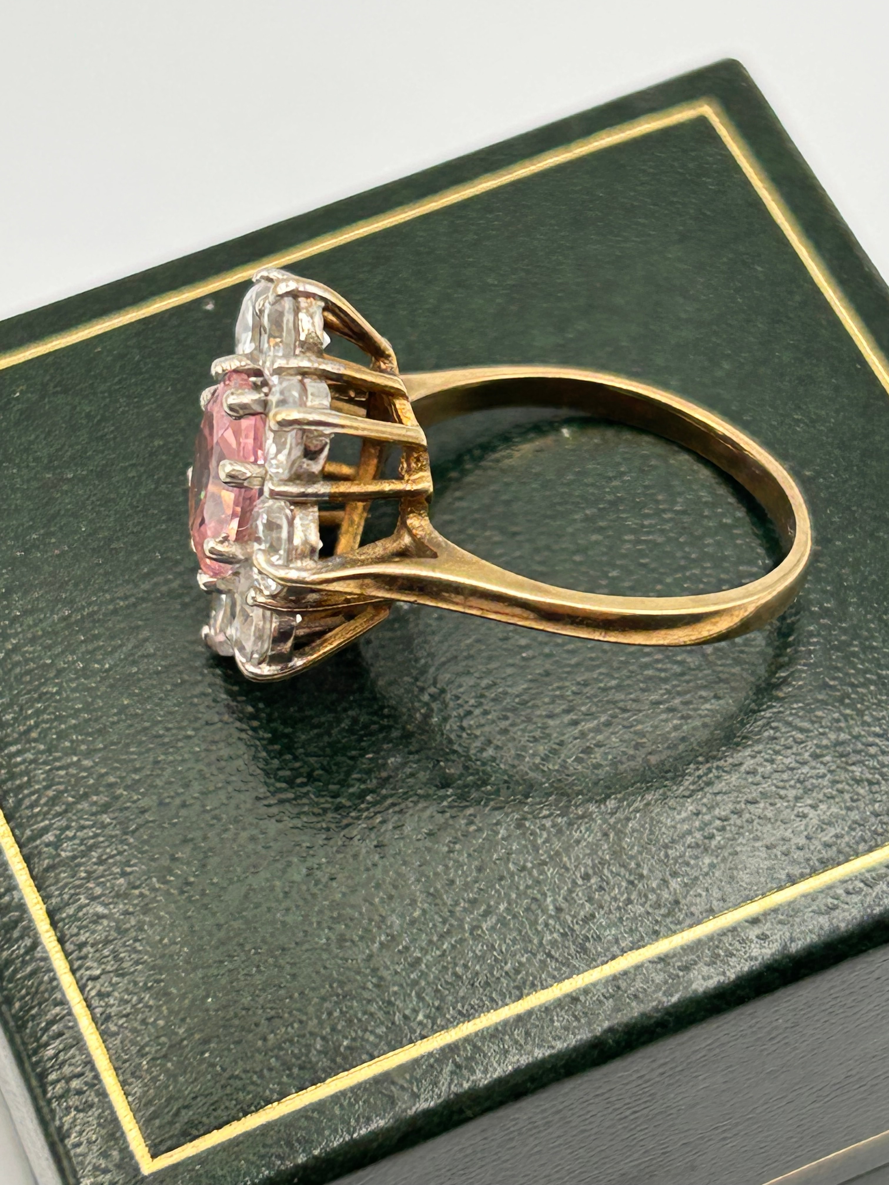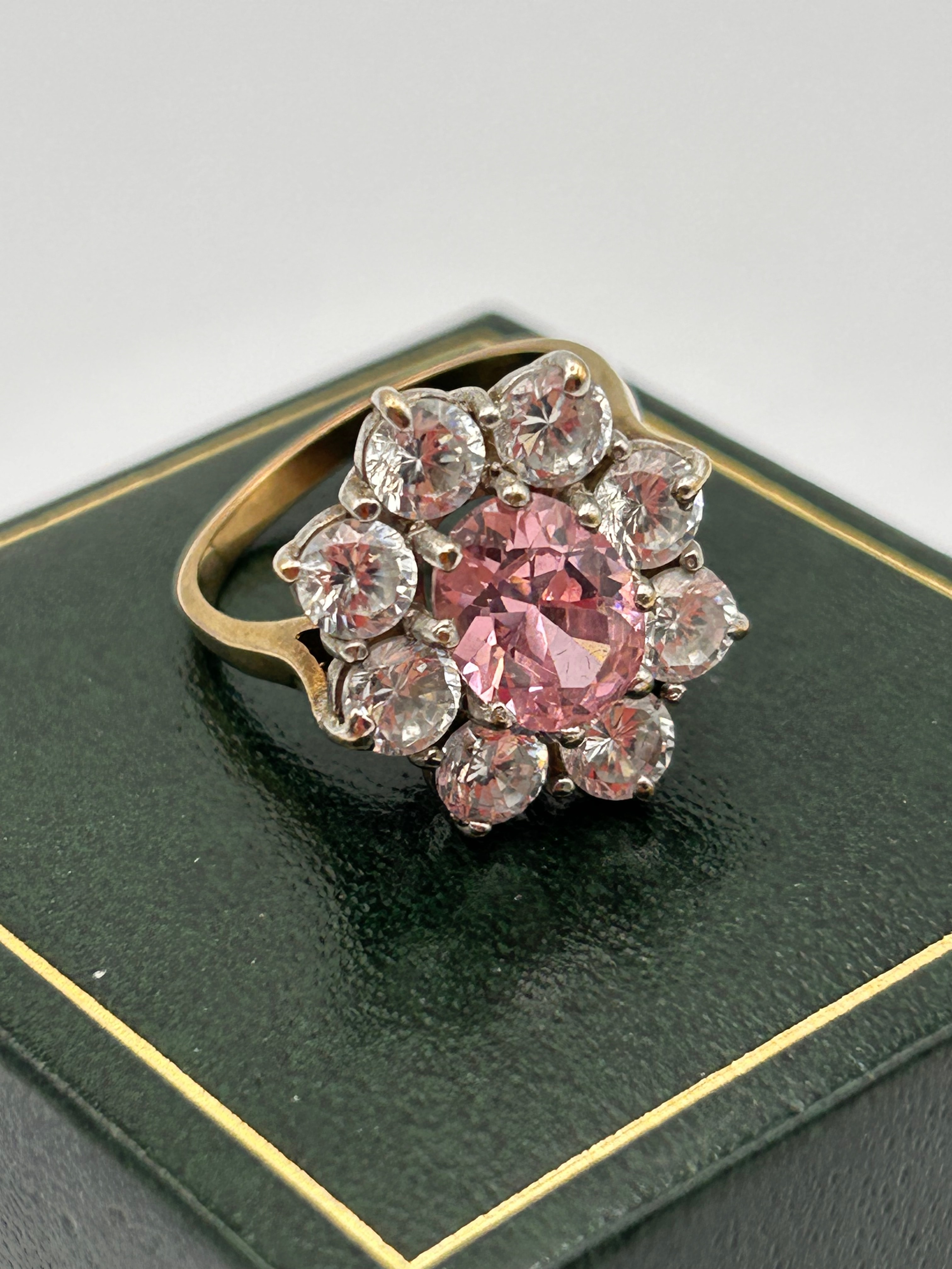 A 9ct gold pink tourmaline and CZ? cluster ring, featuring a prominent central round brilliant-cut pink tourmaline, surrounded by eight smaller round brilliant-cut diamonds forming a floral-like design. The ring band is crafted from yellow gold, with the cluster setting for the diamonds in a silver-tone metal.