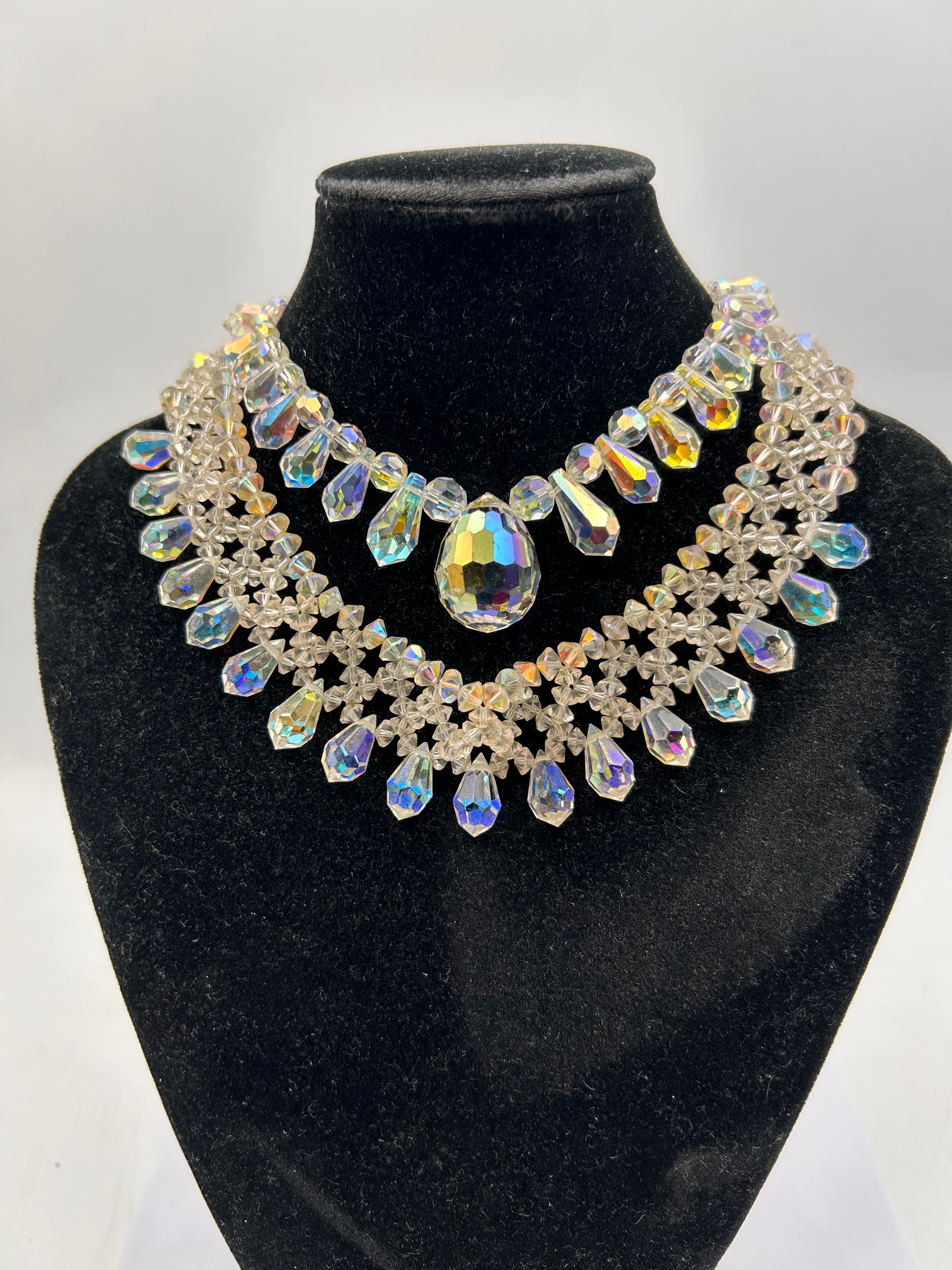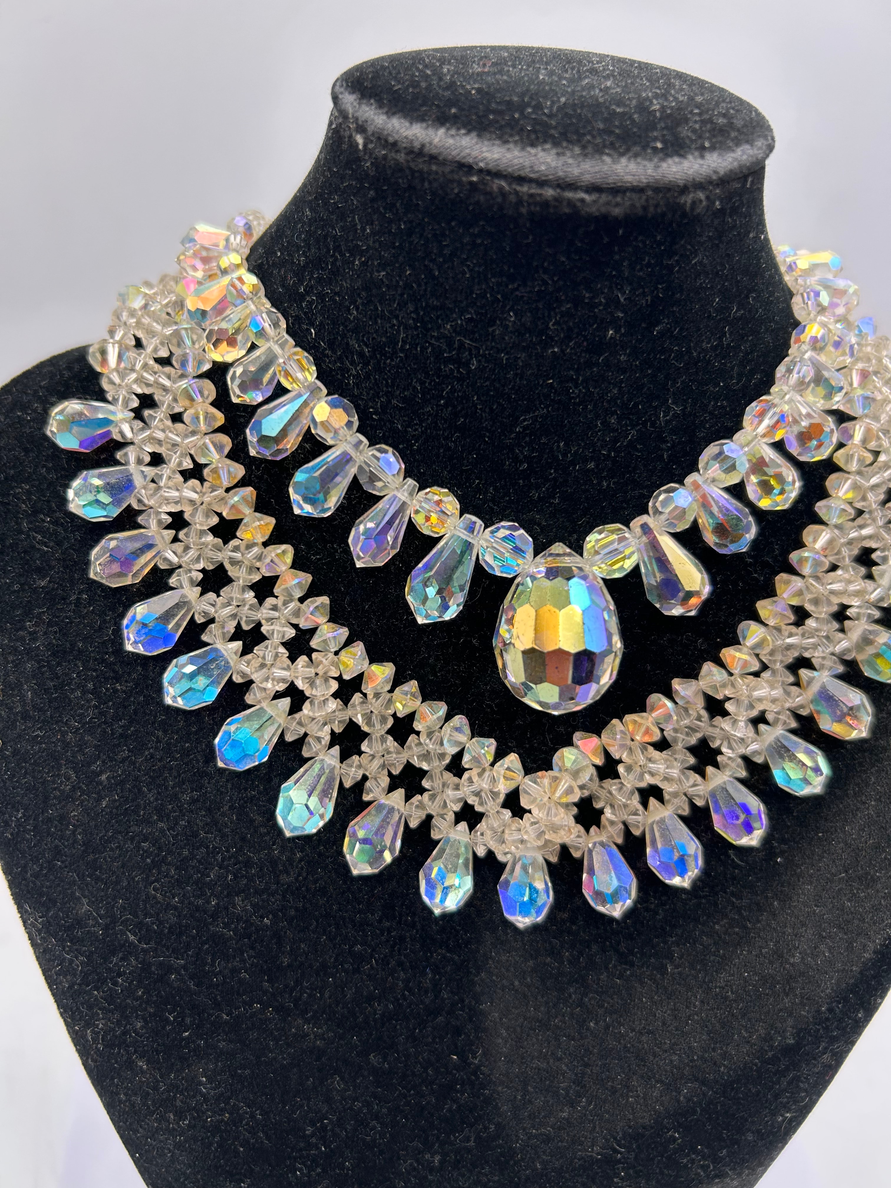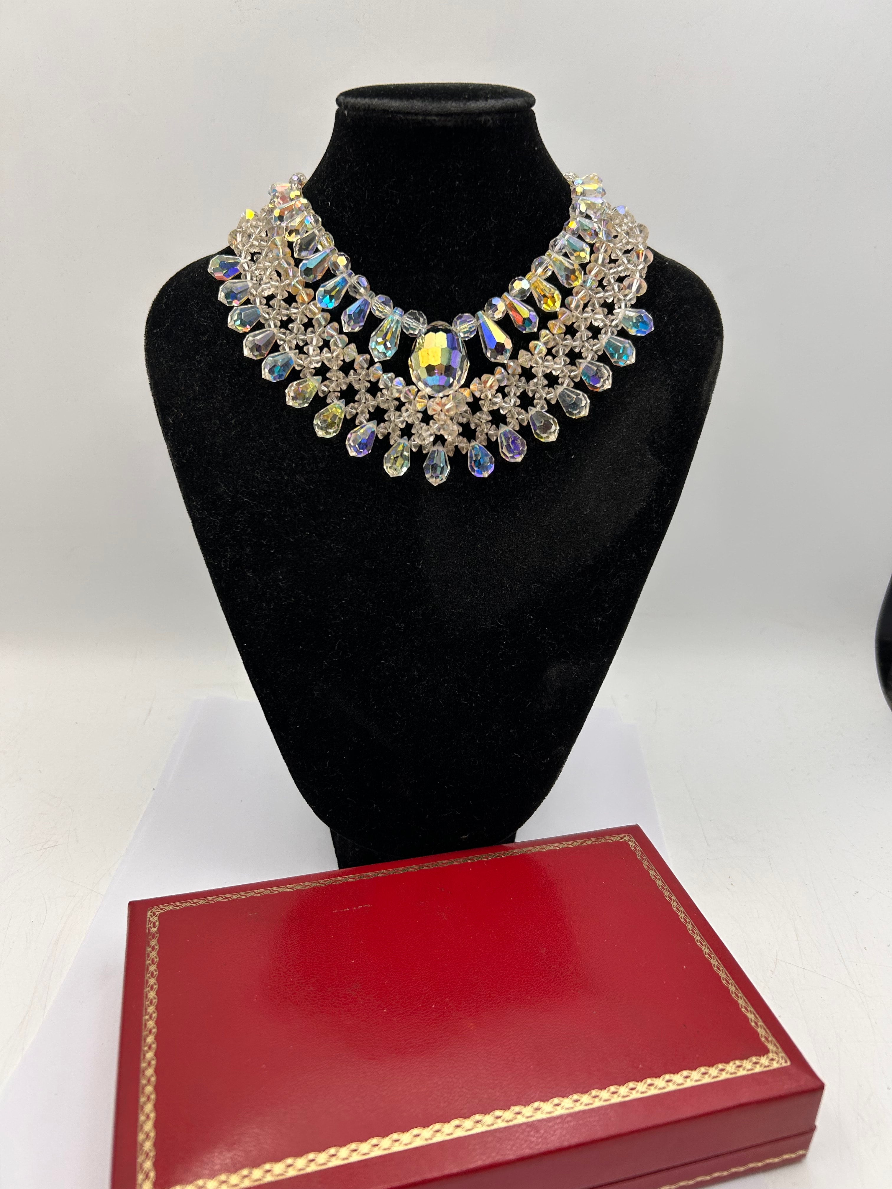 A pair elaborate bib-style necklaces, likely mid-to-late 20th century, comprised of numerous clear, faceted crystal beads, many featuring an iridescent “Aurora Borealis” coating that reflects a spectrum of colors. The design presents a multi-tiered construction with smaller round beads forming a delicate lattice, accented by larger tear-drop shaped beads and a prominent central faceted pear-shaped drop. The necklace is accompanied by a red presentation box with gold trim, which bears no visible text or markings.