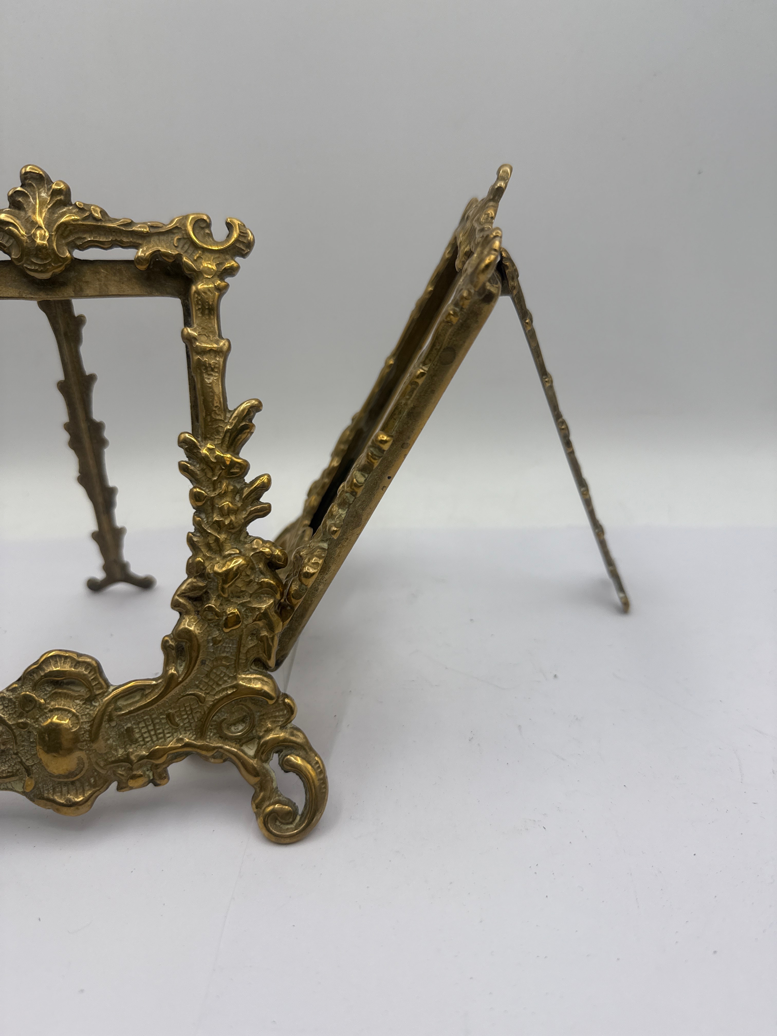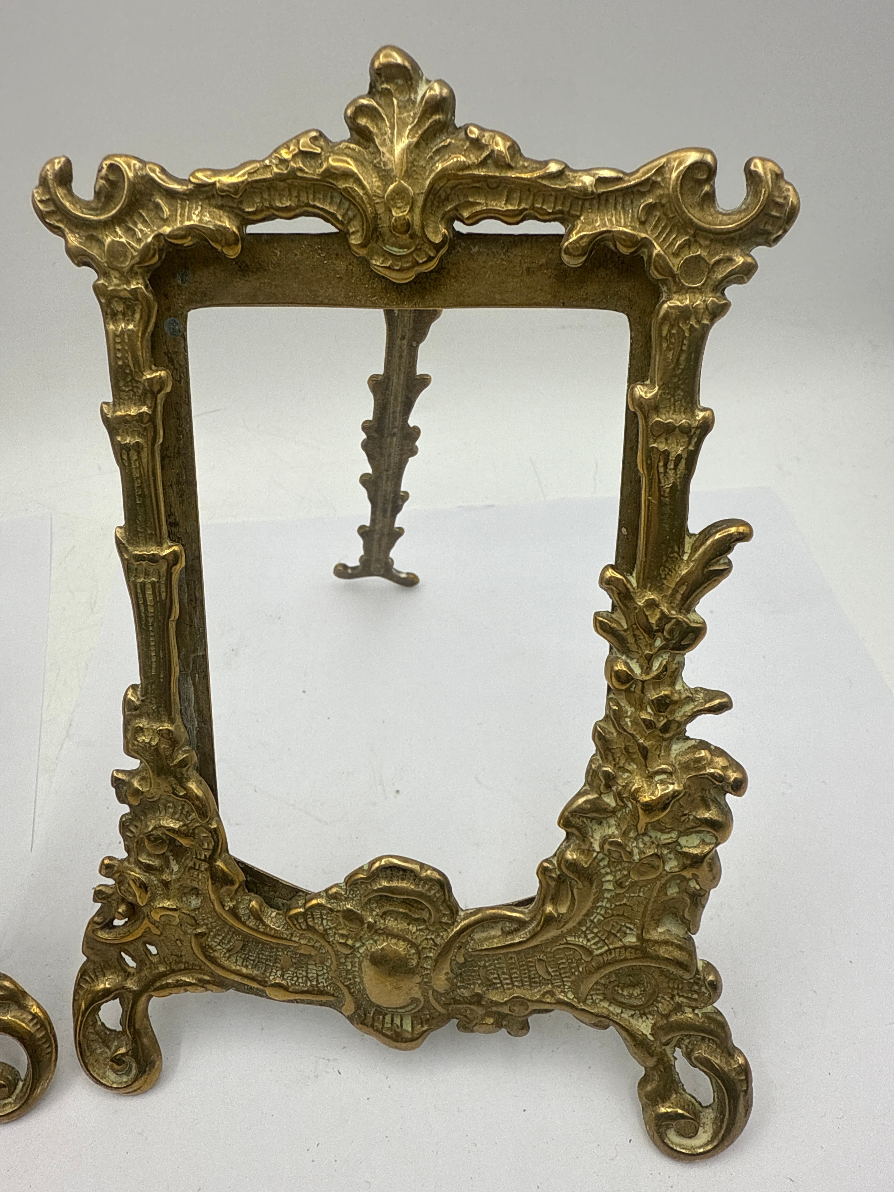 A pair of Art Nouveau brass easel-back picture frames. Crafted from patinated brass, exhibiting an ornate style characterized by elaborate scrolling acanthus leaves, C-scrolls, and shell-like motifs adorning the rectangular borders and prominent crests. Each frame features an integrated easel stand.