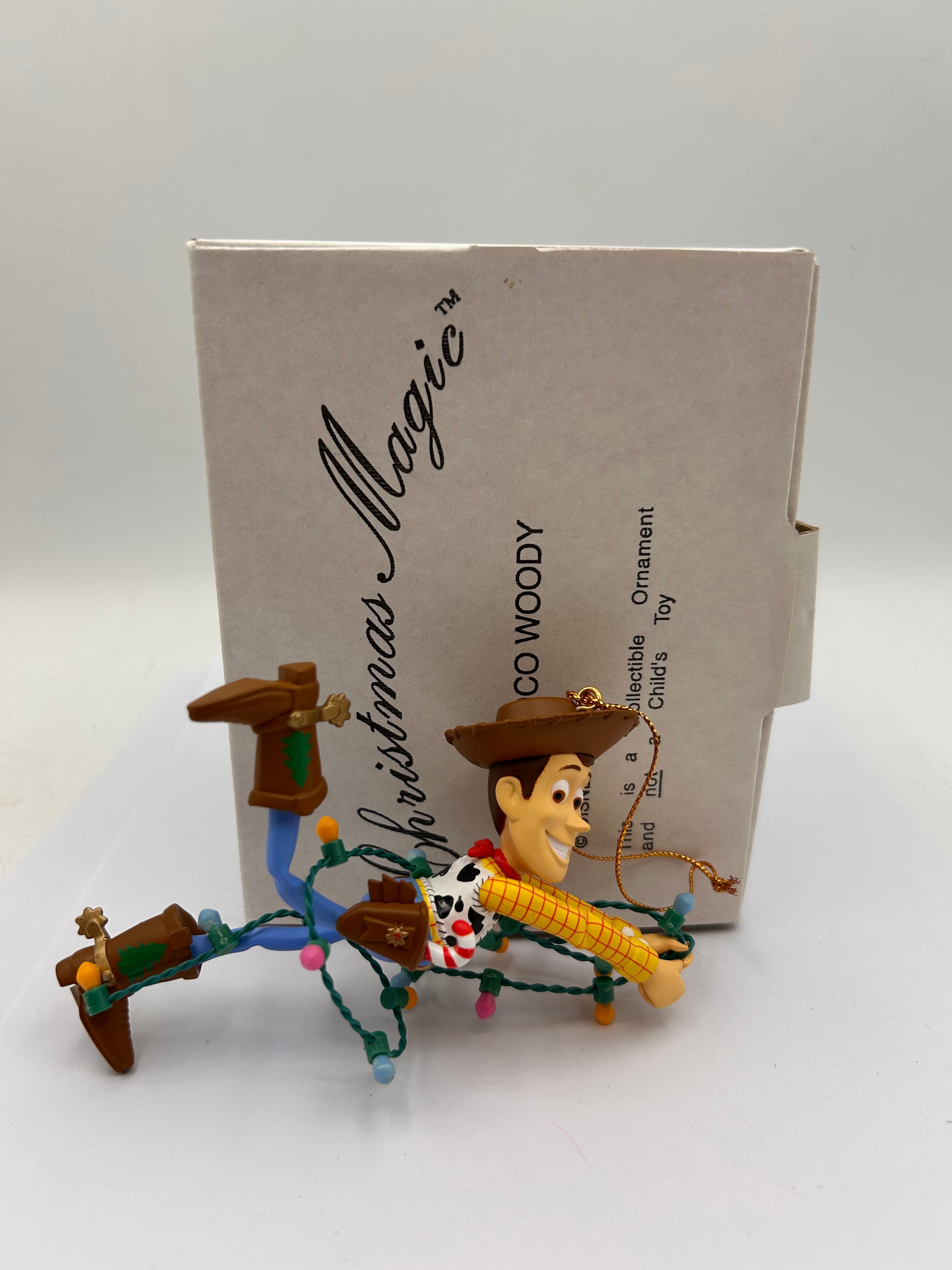 A Grolier Disney Christmas Magic ‘Toy Story’ Woody ornament, depicting the Disney/Pixar character Woody, sculpted in plastic or resin and painted, entangled in a string of Christmas lights. The ornament is suspended by a gold-colored cord. Presented with its original beige cardboard box, marked with “Christmas Magic™”, “CO WOODY”, “Collectible Ornament”, and “© DISNEY”, along with a warning stating, “This is a […] not a Child’s Toy”.