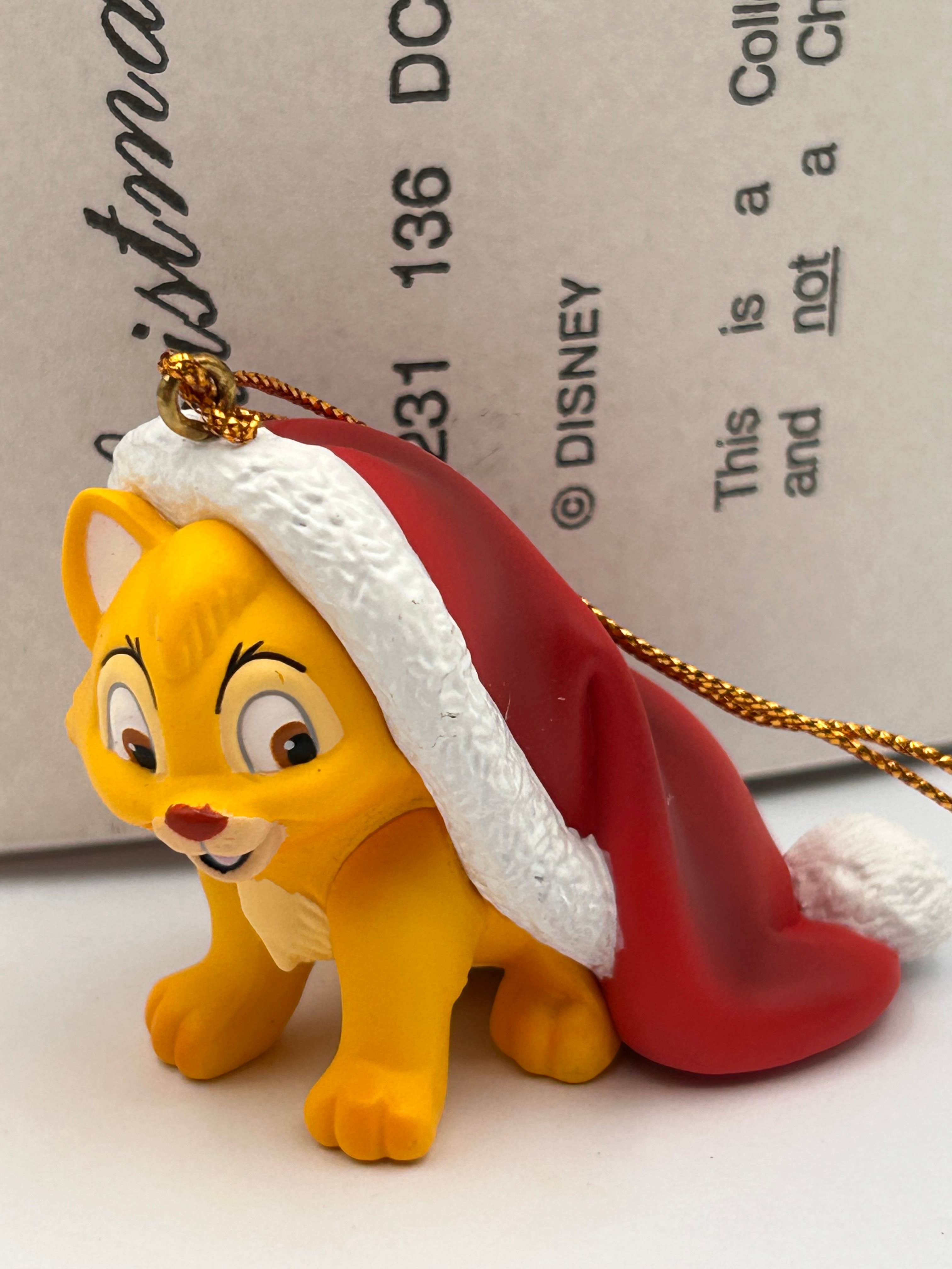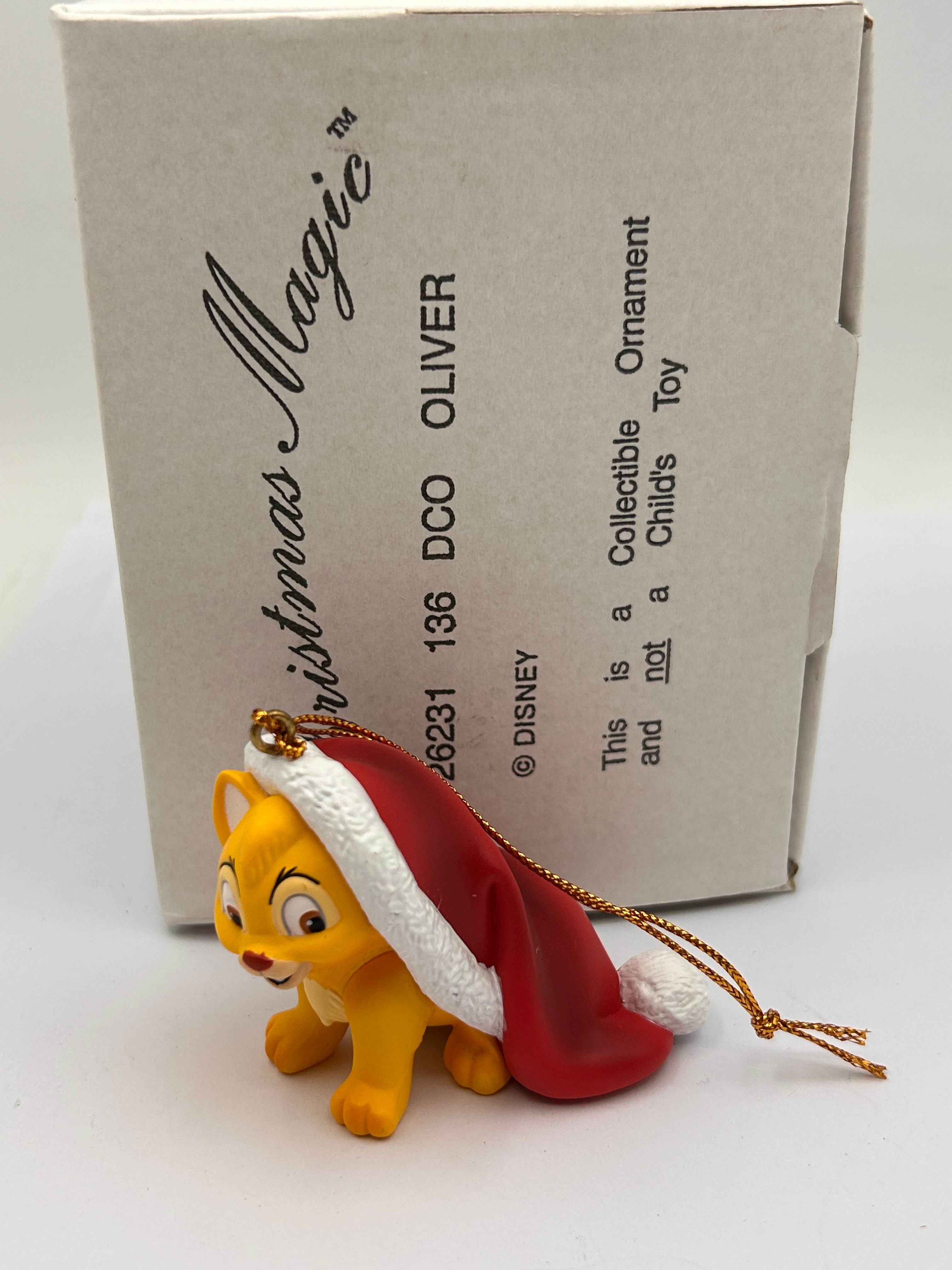 A Grolier Disney Oliver Cat Christmas Magic hanging ornament, depicting the character Oliver from Disney’s ‘Oliver & Company’. The small yellow/orange figurine shows Oliver wearing a red and white Santa hat, fitted with a golden hanging loop. Crafted from plastic or resin, it is accompanied by its original light brown cardboard box. The box is printed with “Christmas Magic™”, “26231 136 DCO OLIVER”, and “© DISNEY”. The box also explicitly states: “This is a Collectible Ornament and not a Child’s Toy.”