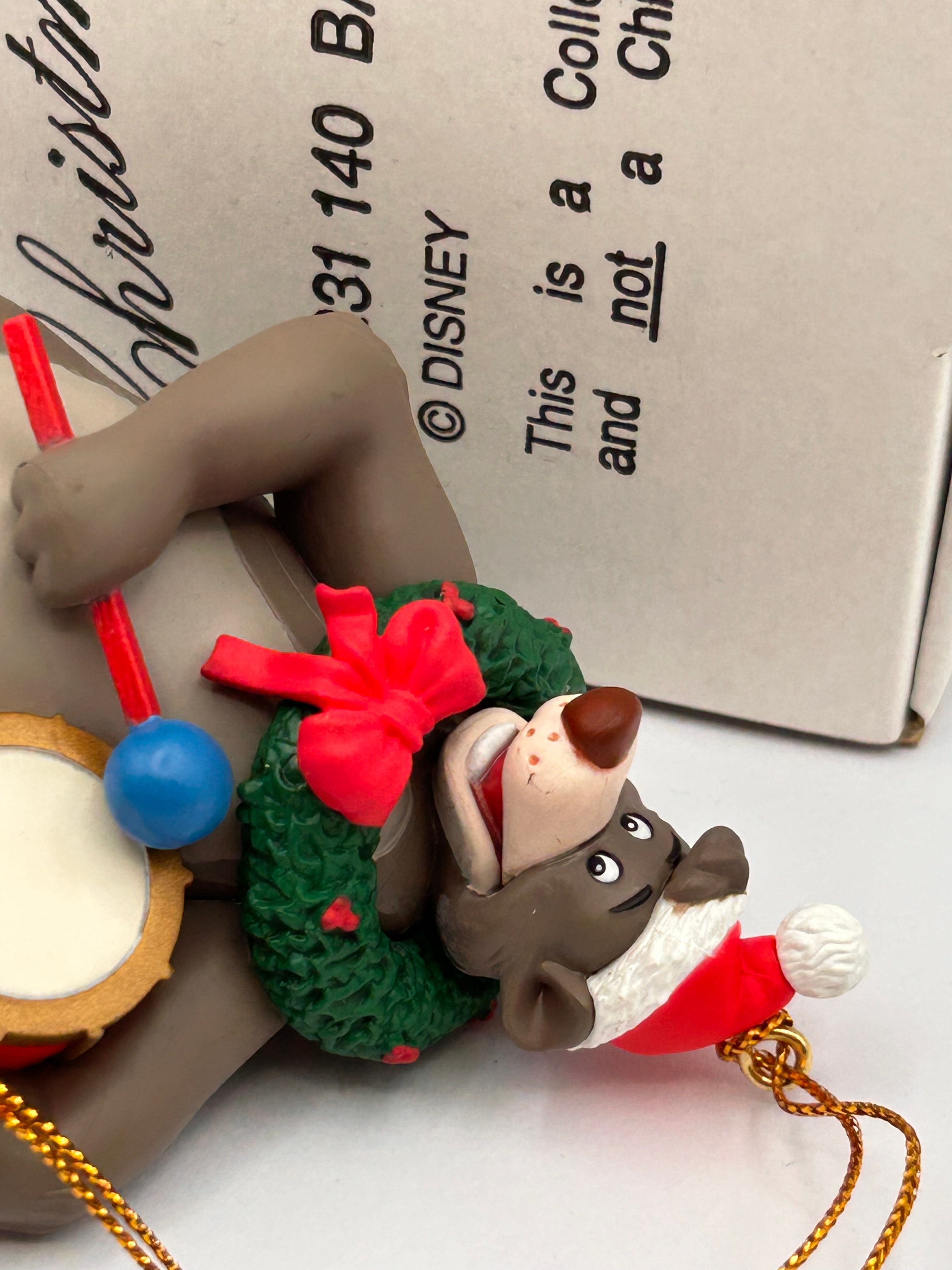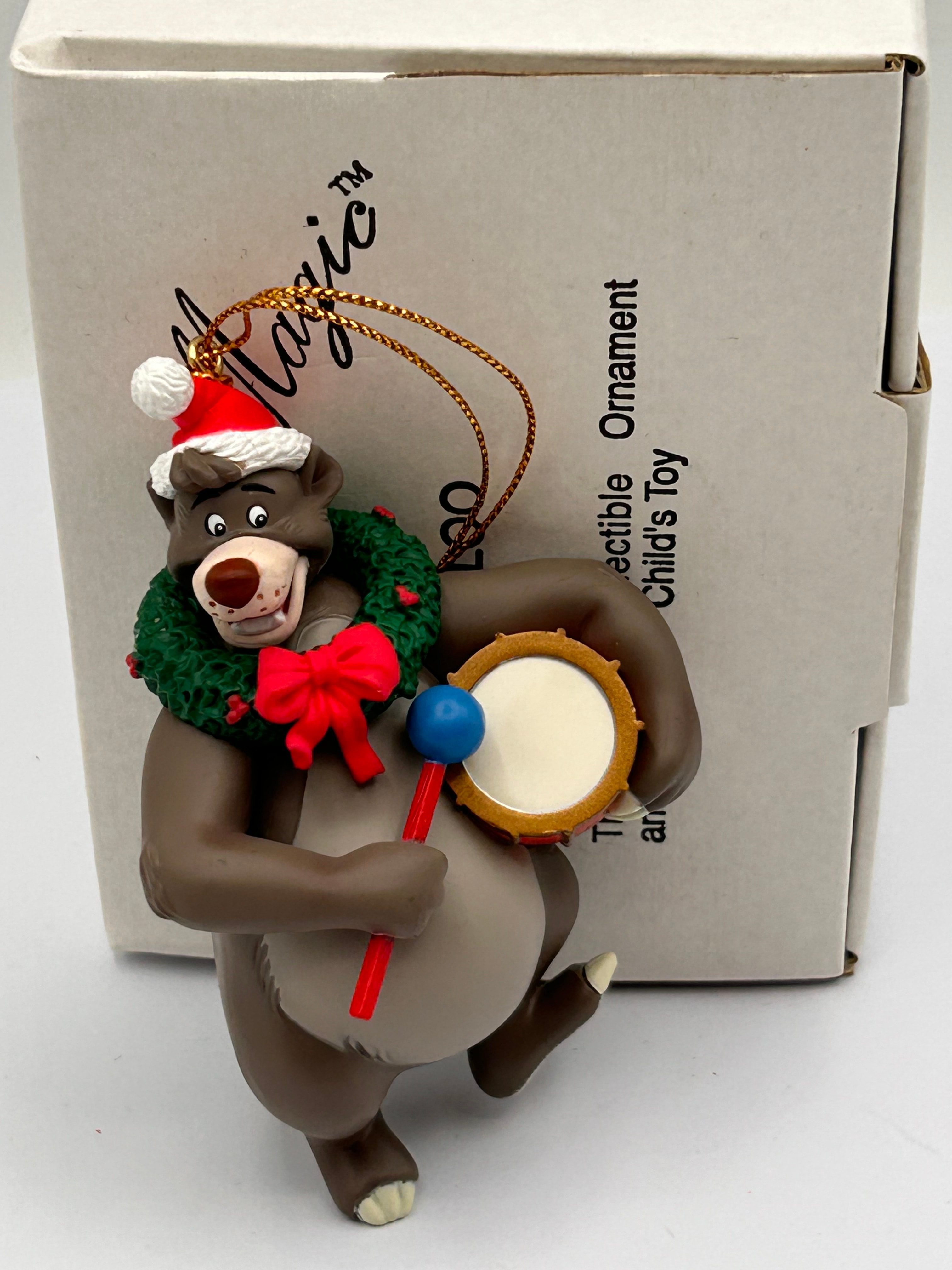 A Grolier Collectibles Disney The Jungle Book Baloo Christmas Magic Ornament, dated 1996. This painted resin or plastic collectible Christmas ornament depicts the Disney character Baloo from The Jungle Book. Baloo is shown wearing a Santa hat and a green wreath with a red bow, holding a drum and drumstick. It is suspended by a gold-tone cord. The attached cardboard packaging includes visible markings such as “Magic™”, “Collectible Ornament”, “© DISNEY”, and the clear statement “This is a Collectible Ornament and not a Child’s Toy”.