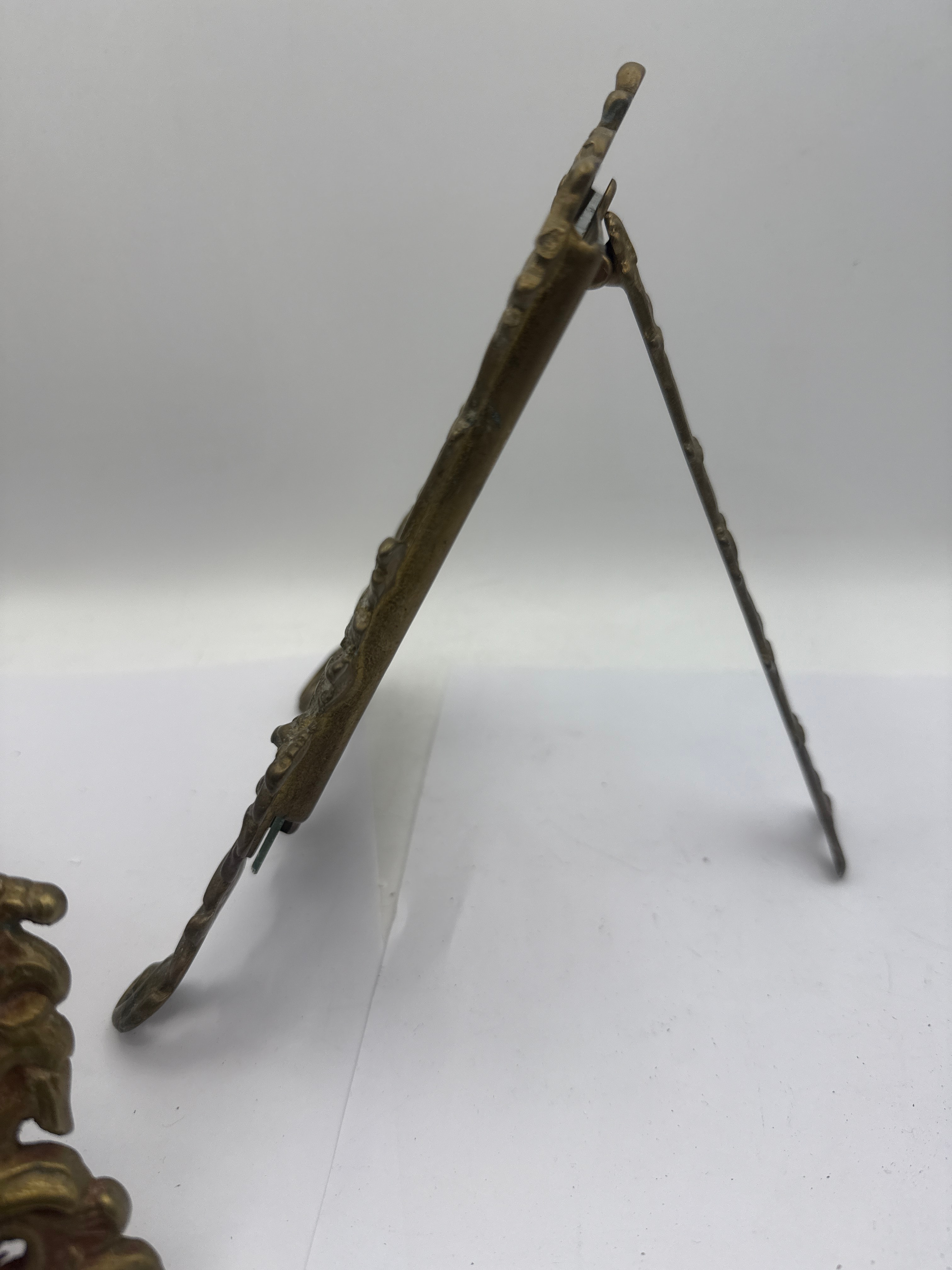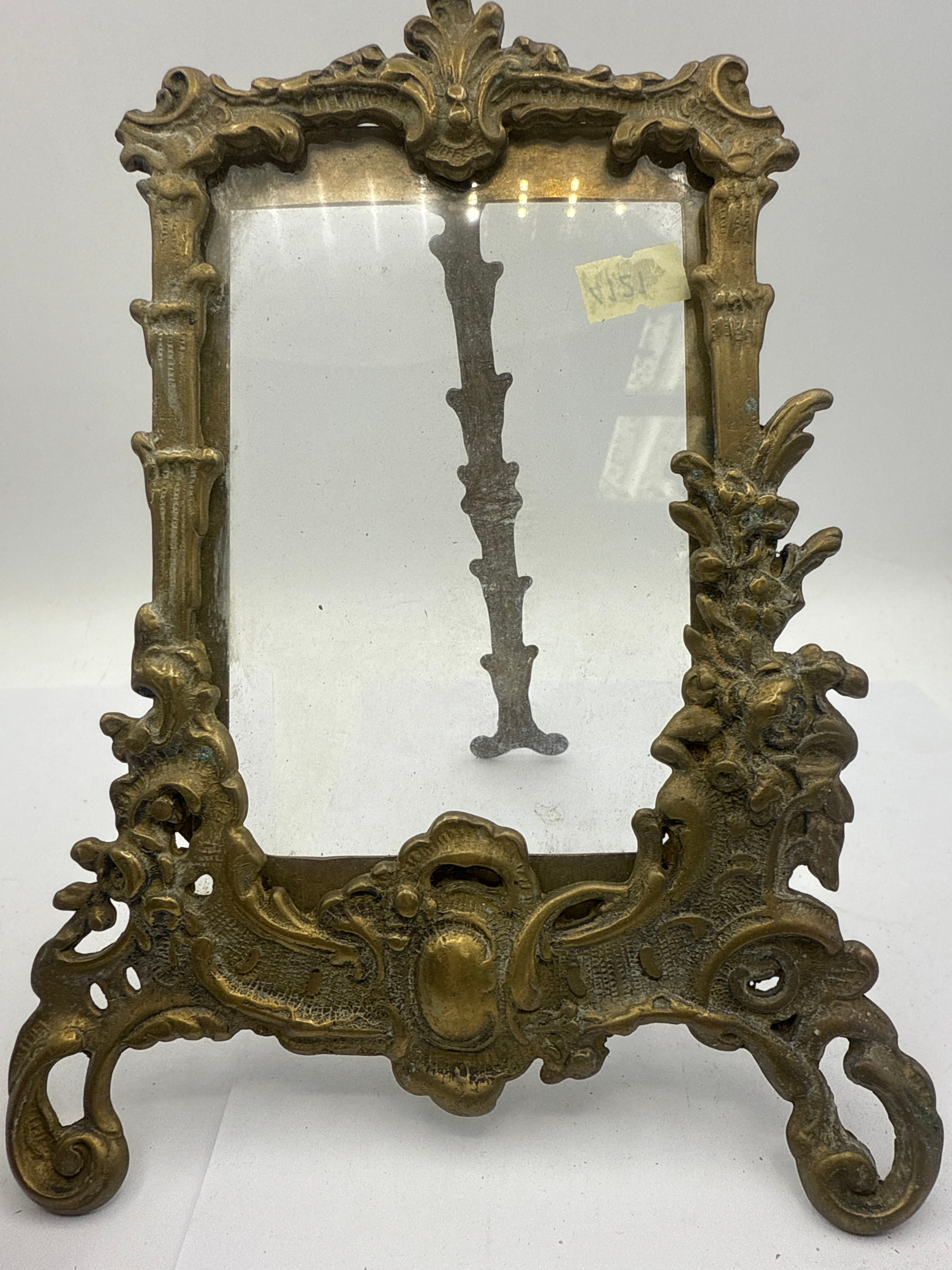 A pair of Rococo-style brass photo frames. Crafted from cast brass, each frame exhibits an elaborate Rococo-revival design featuring scrolling foliate and shell motifs. Both frames retain a darkened, patinated finish, consistent with age. One frame contains a plain, off-white insert, while the other holds glass. Both are equipped with hinged easel backs for tabletop display. A yellow sticker marked ‘4121’ is visible on the lower left of one frame.