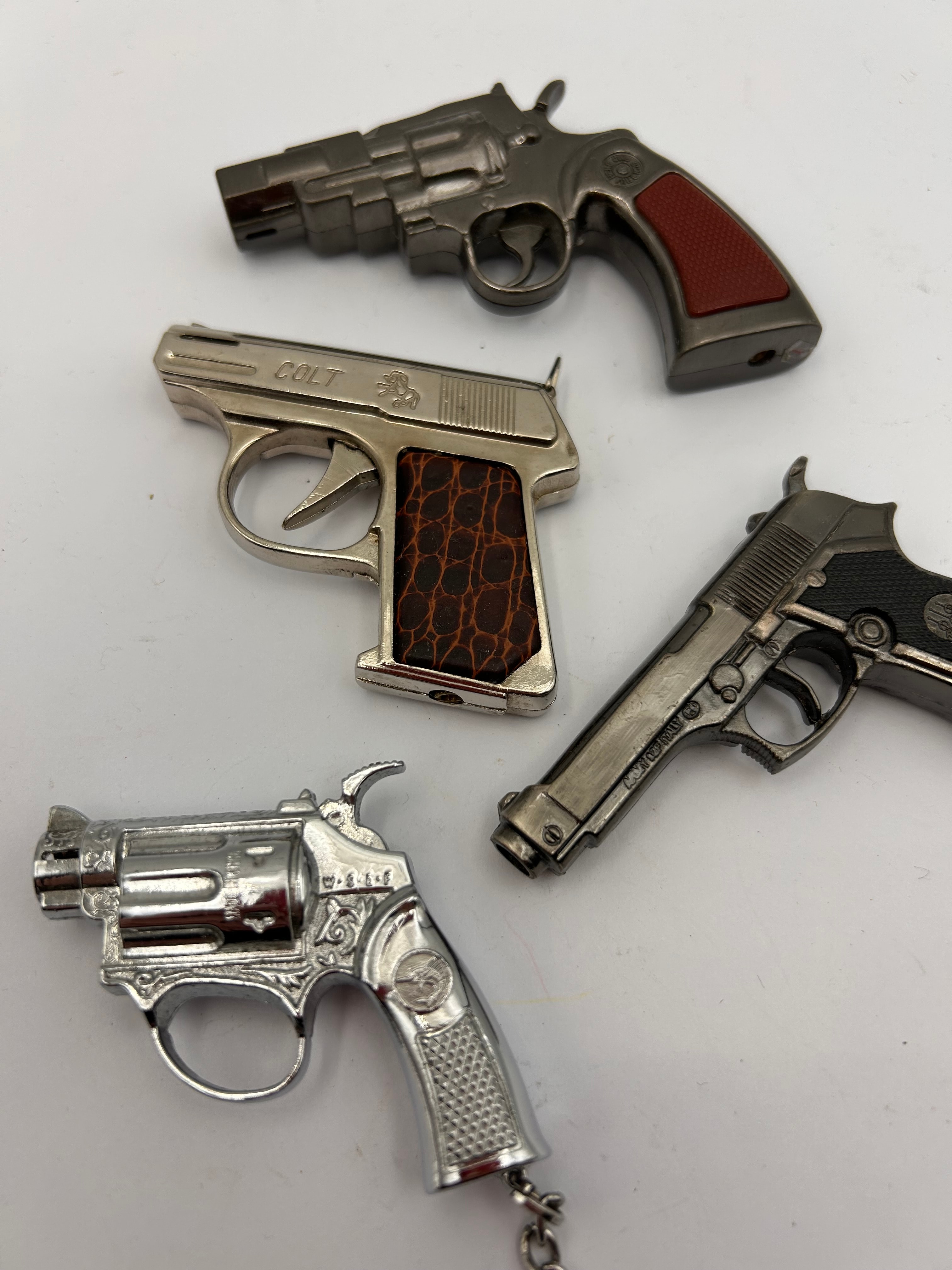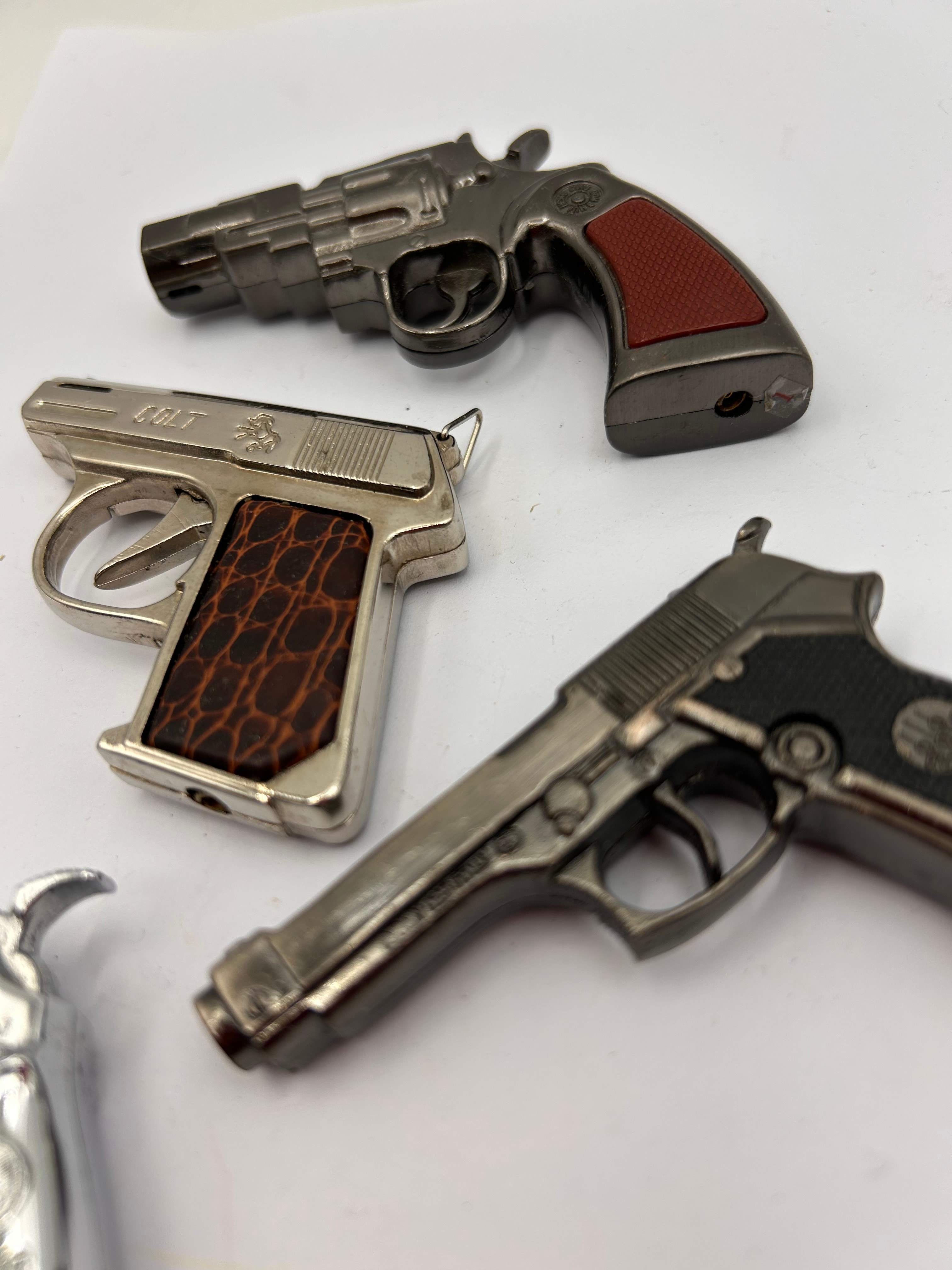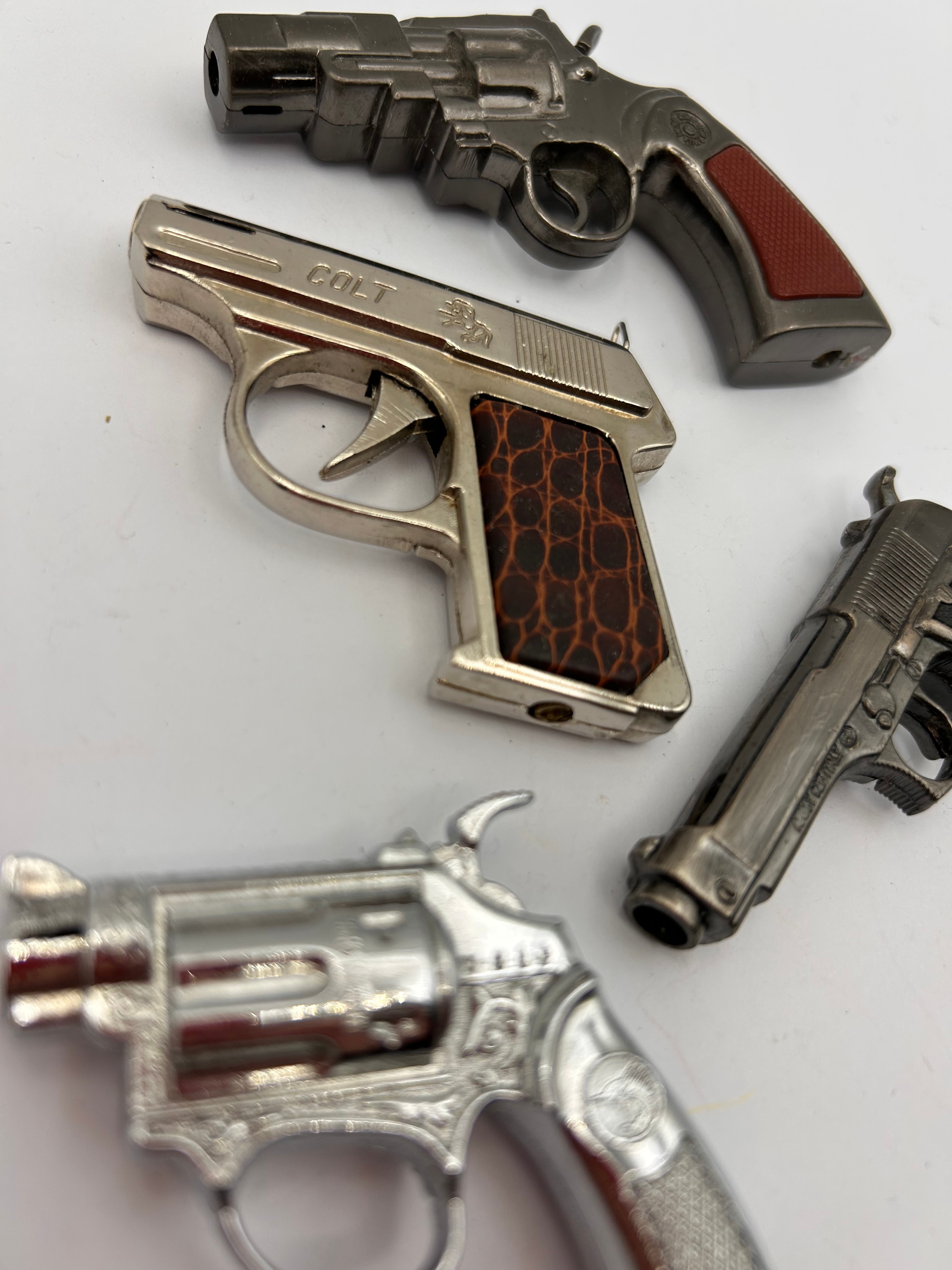 A group of four miniature, non-firing replica handguns, including one clearly marked “COLT” on its slide, functioning as novelty utility items such as lighters and keychains. The collection comprises two revolver-style and two semi-automatic pistol-style pieces, predominantly crafted from silver-tone or dark gray metal with textured grip accents in red, brown faux-crocodilian, and black plastic. Visible features like fill valves and keychain loops confirm their functional, non-firearm nature.