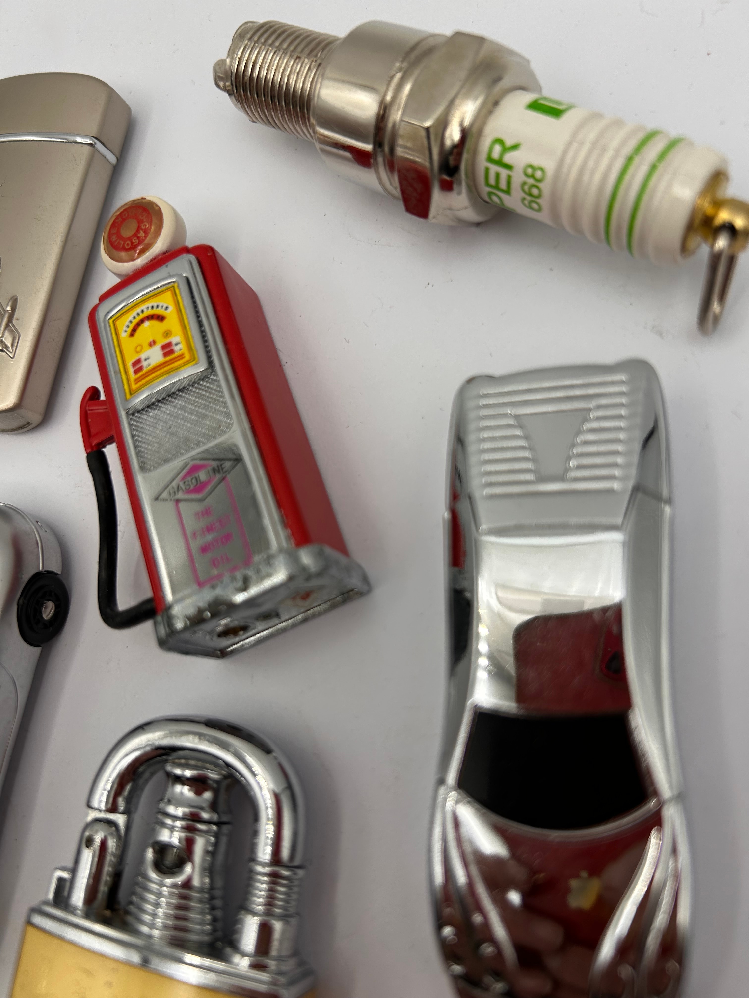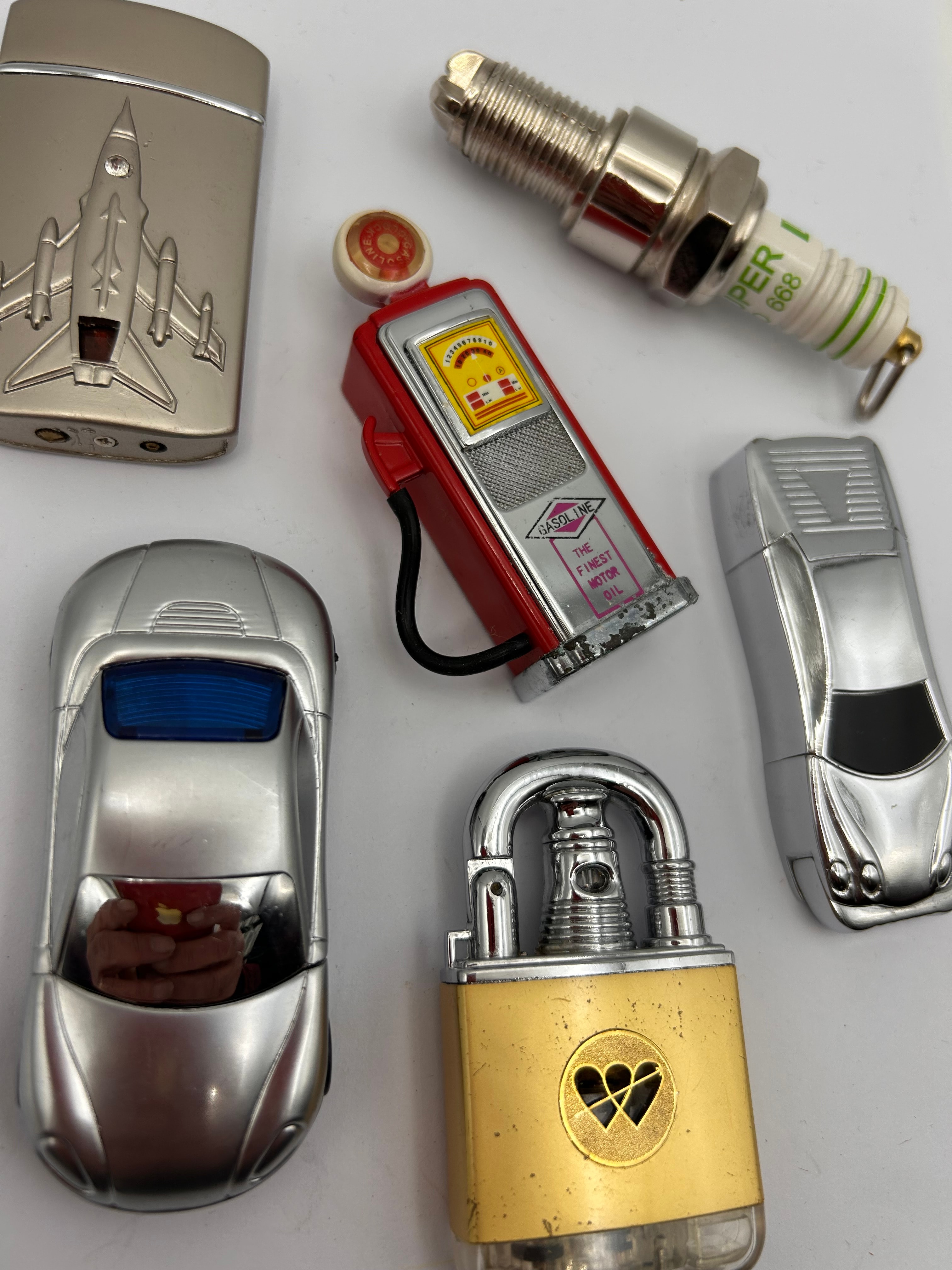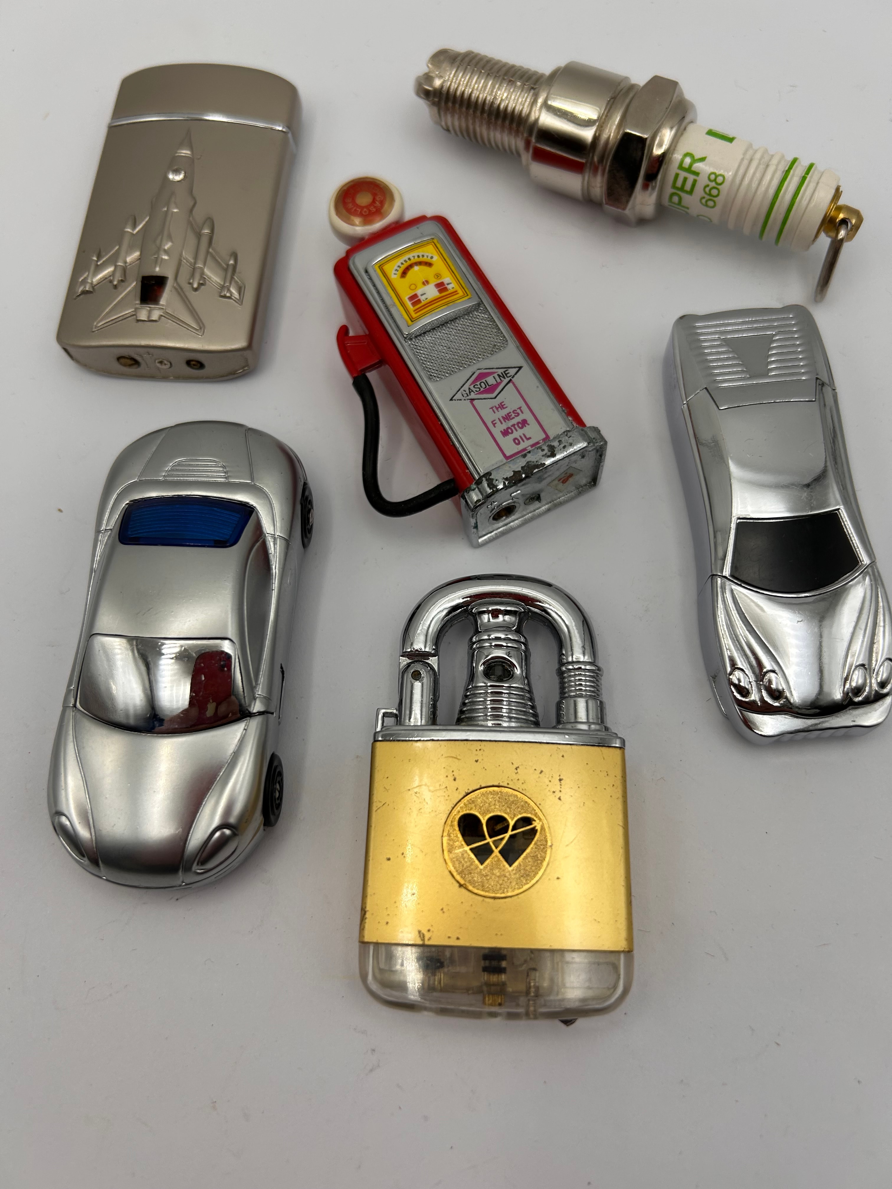 A group of six items, comprising five novelty lighters and a Puzzle Master Trick Lock. The lighters are constructed from chrome-plated or polished base metal, with some plastic or ceramic accents, and include forms such as a rectangular lighter with a raised jet plane motif; two distinct silver-toned lighters shaped like classic cars; a red miniature gasoline pump featuring a black hose and marked “GASOLINE” and “THE FINEST MOTOR OIL”; and a lighter replicating a spark plug, with a silver-toned threaded base and a white ceramic-like body prominently marked in green with “PER I 888”. The padlock-shaped item, identified as a Puzzle Master Trick Lock, features a gold-toned body, silver-toned shackle, and a heart-shaped cut-out. These items are consistent with a modern or contemporary production period.