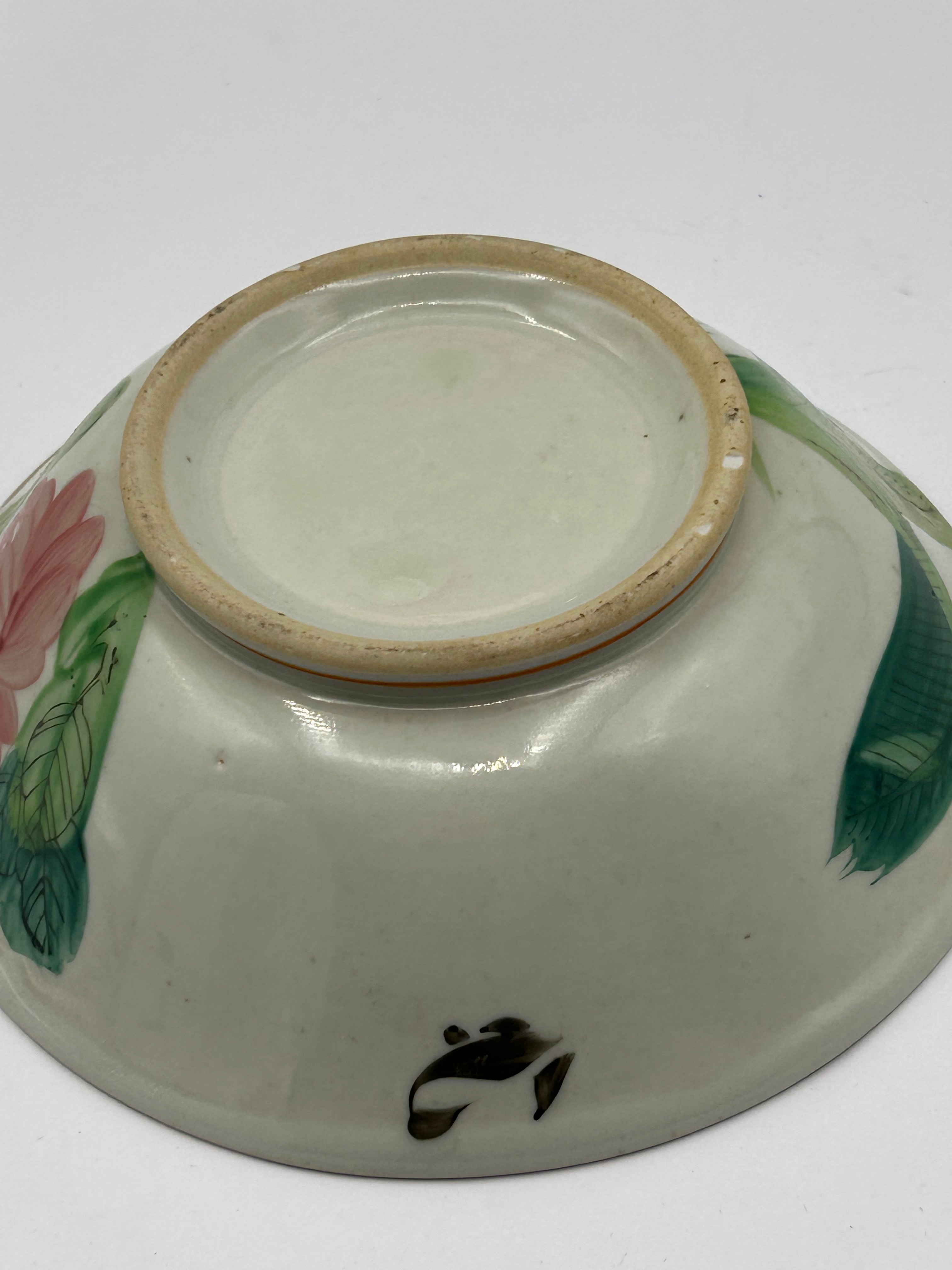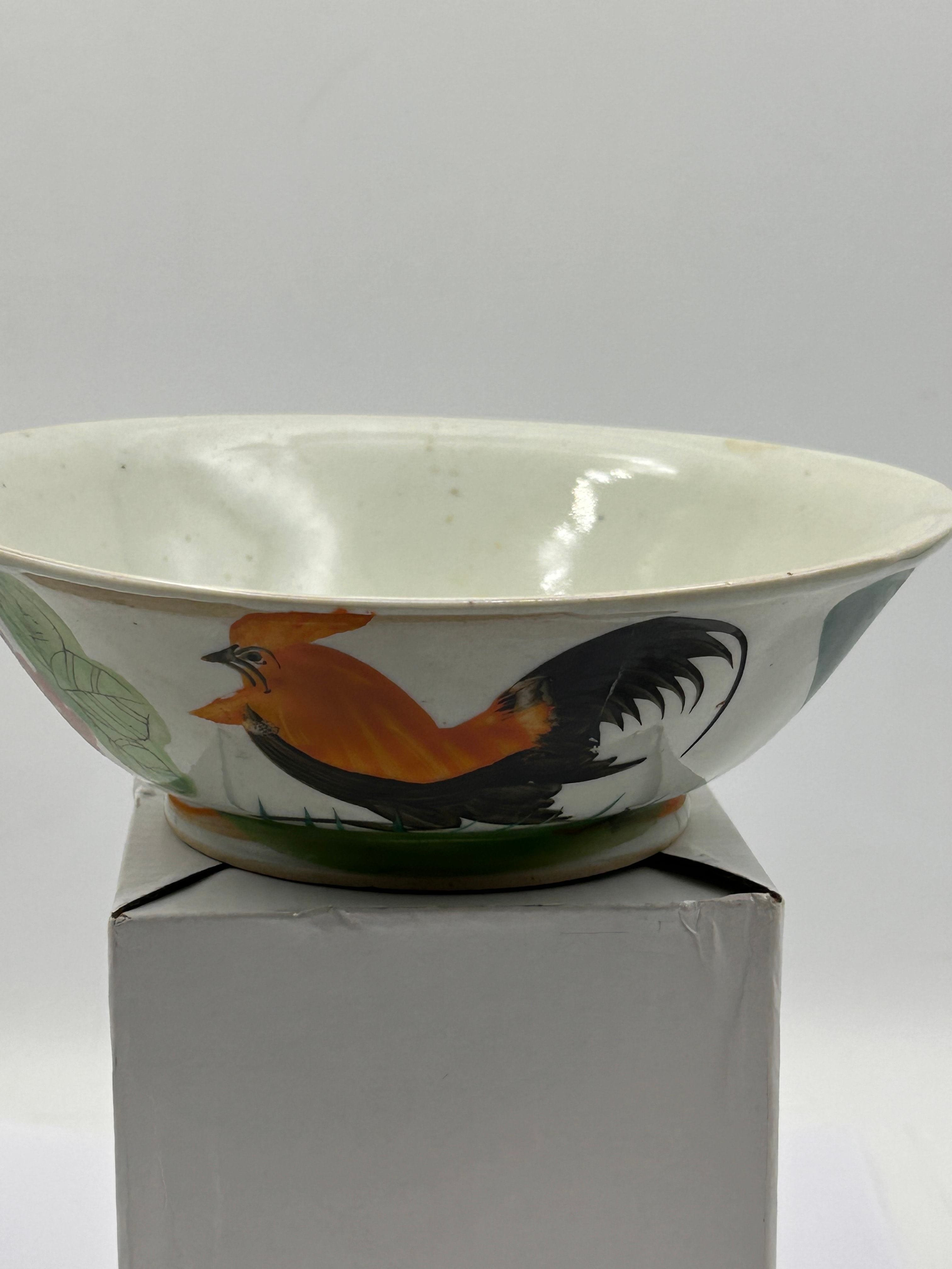 A hand-painted glazed ceramic bowl, identified as a Chinese Rooster Bowl. The exterior is adorned with stylized orange and black roosters, interspersed with green leafy motifs and pink flowers. The interior is predominantly off-white with a small central pink and green floral design. The material appears to be glazed porcelain or earthenware, with an unglazed, bisque-colored foot rim. No visible text, maker’s marks, or period indicators are present.