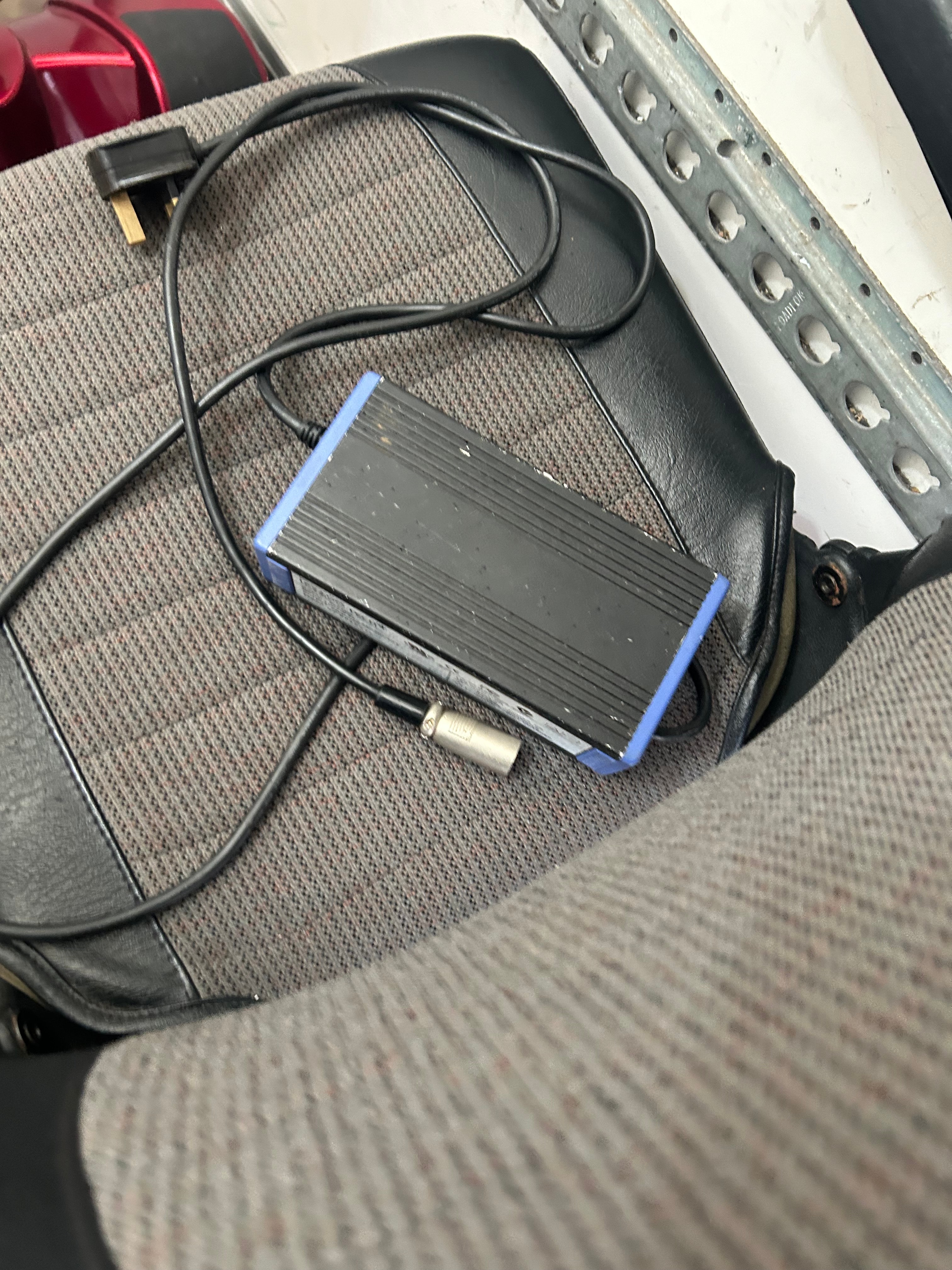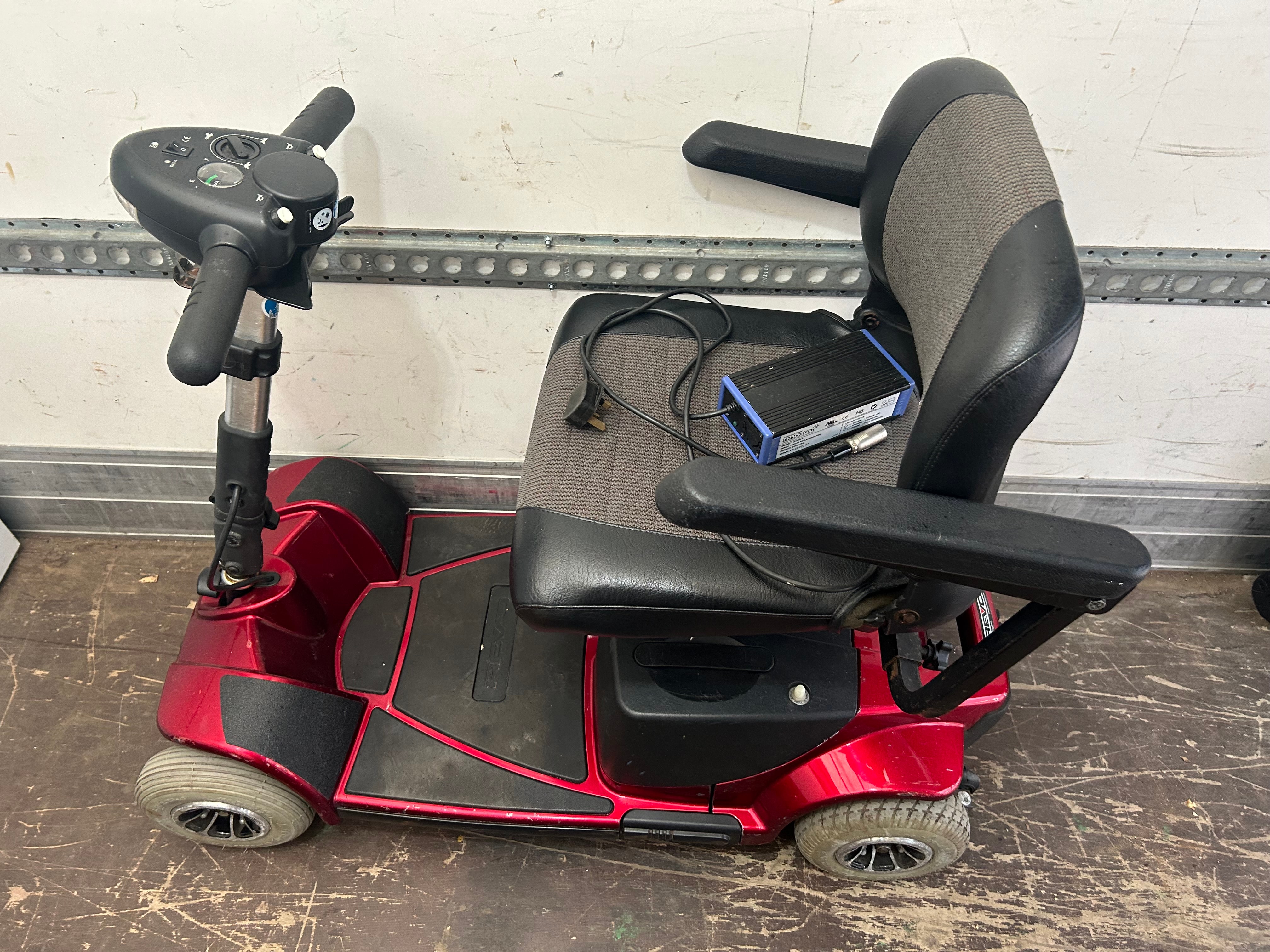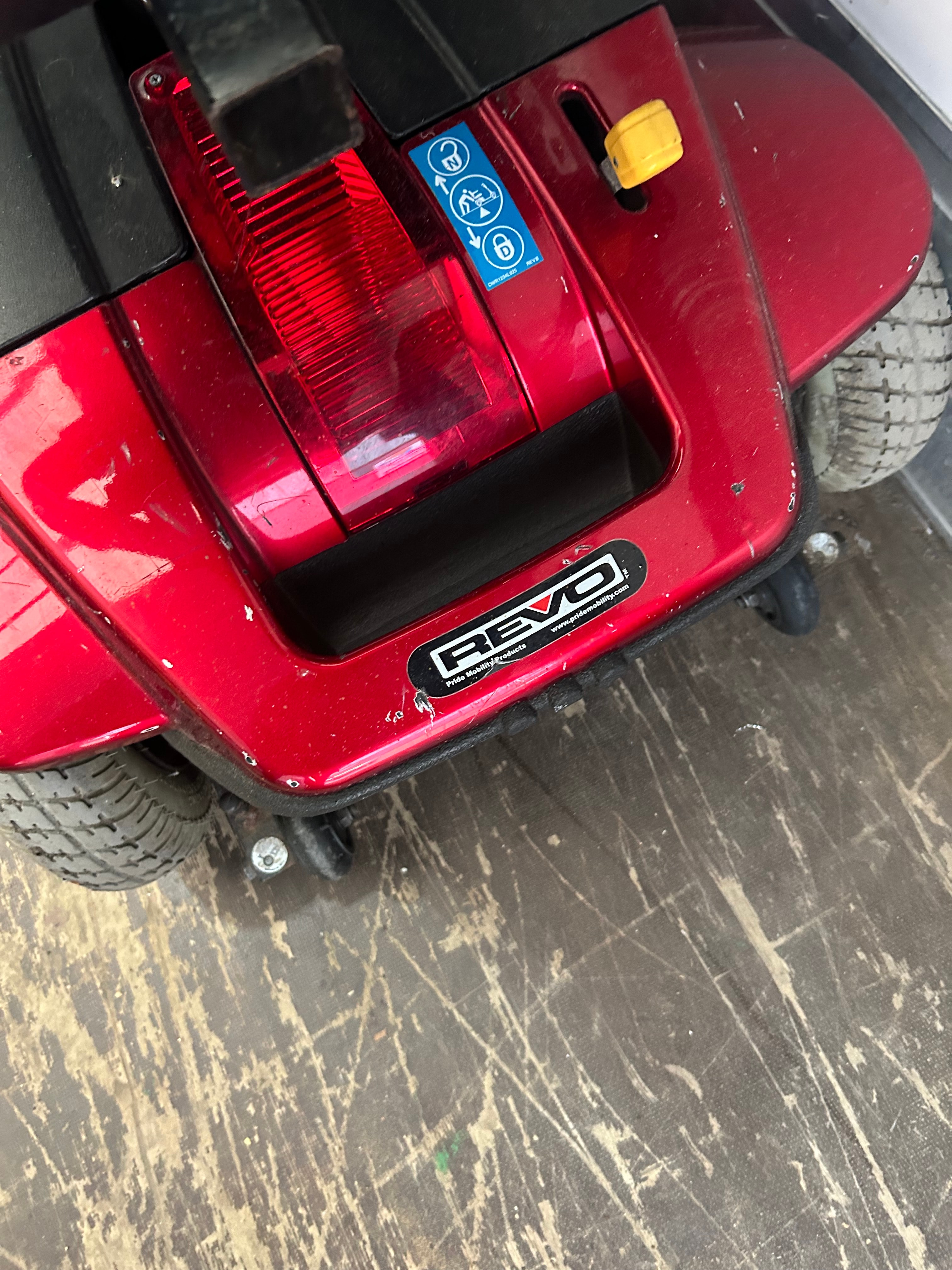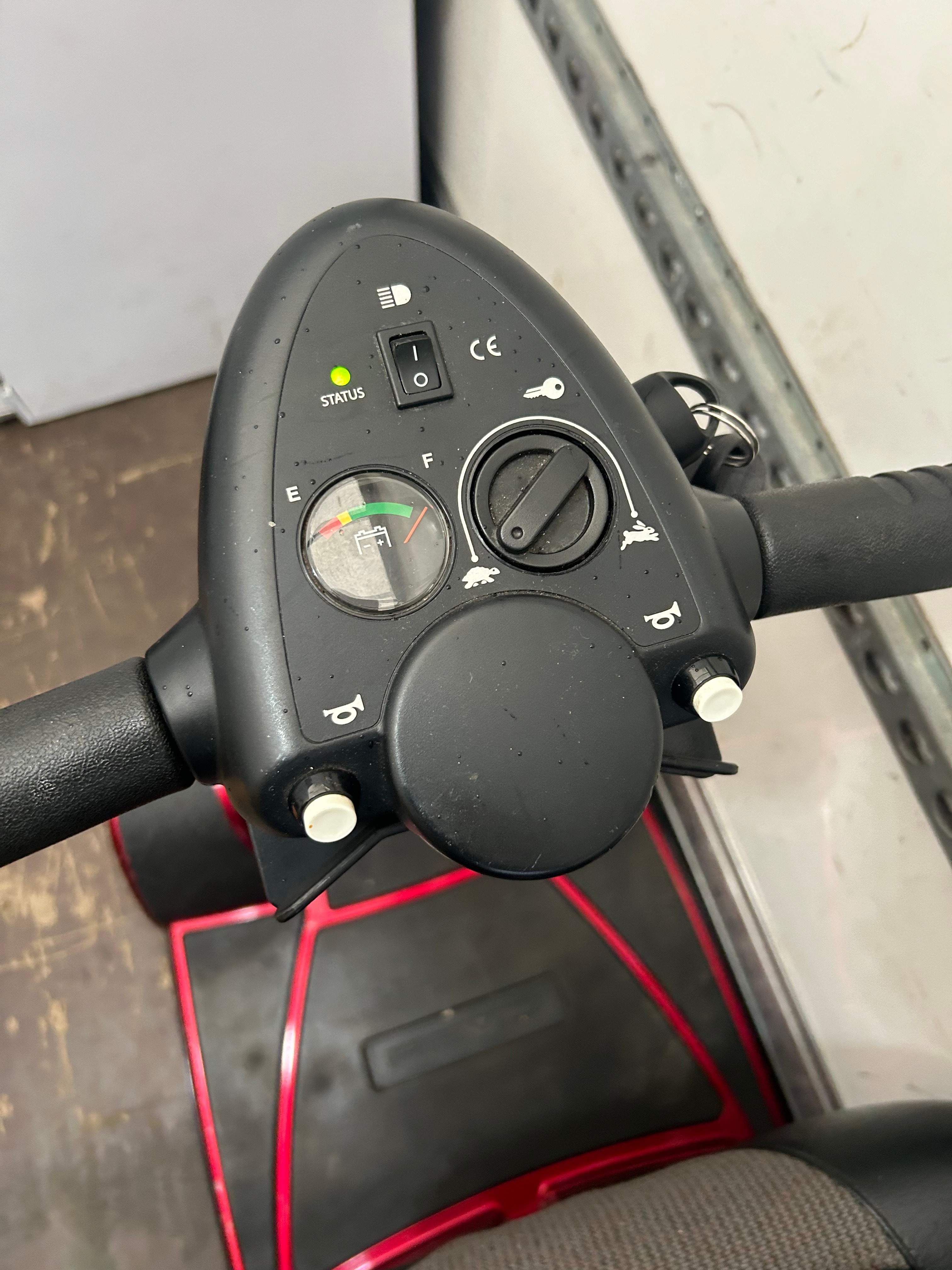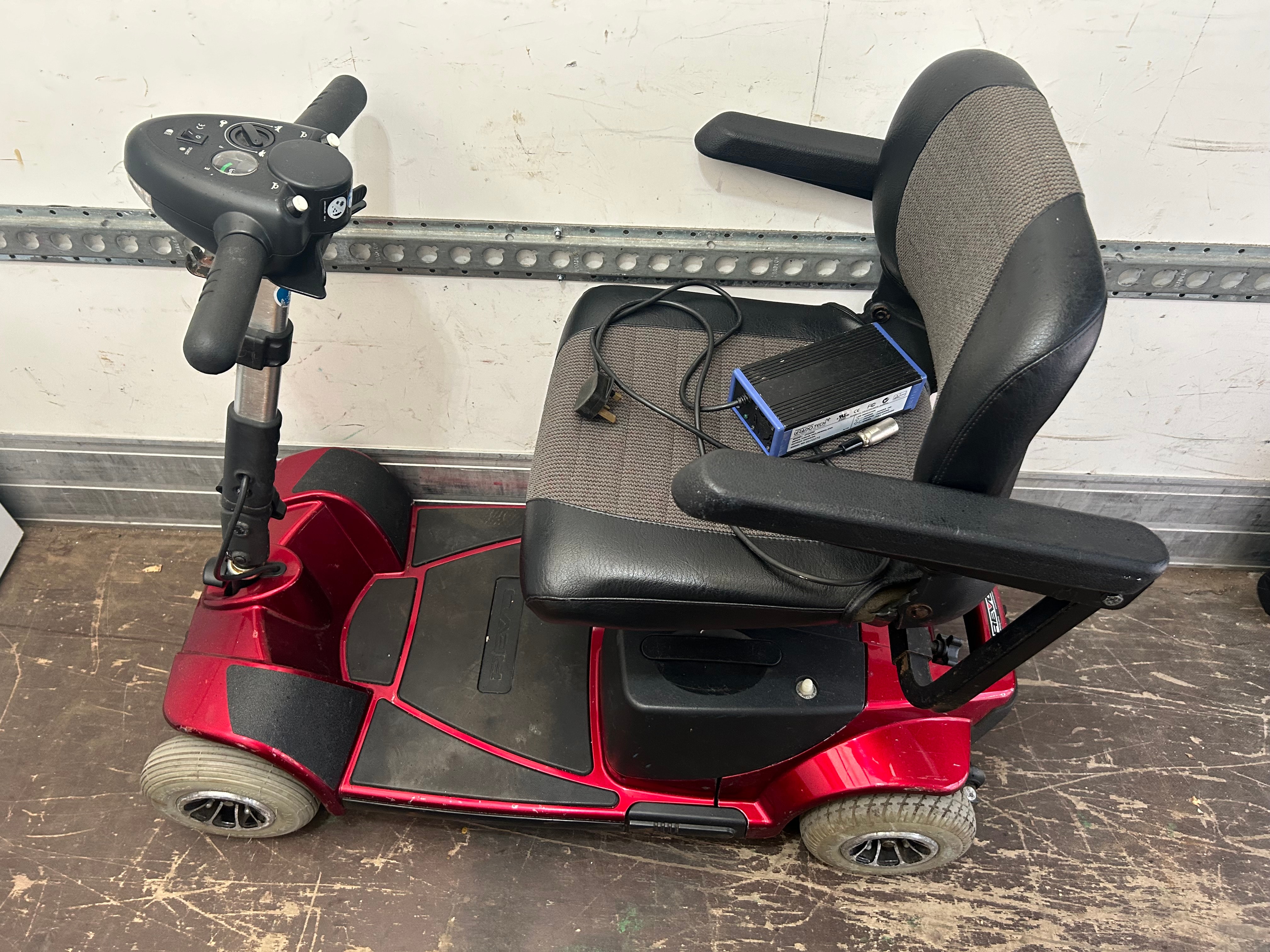 A Pride Revo 2.0 4-Wheel Electric Mobility Scooter, in working order. This modern, four-wheeled electric mobility scooter features a molded red plastic body with black accents, a metal steering column, and black rubberized handlebars. The seat is upholstered in a combination of black faux leather and grey patterned fabric, complete with armrests. The control panel includes a key ignition, a battery gauge marked ‘F’ (Full) and ‘E’ (Empty), a headlight switch, speed selector icons (rabbit for fast, turtle for slow), and horn buttons, along with a ‘STATUS’ light and ‘CE’ marking. Branding on the rear of the scooter identifies it as a “REVO” model by “Pride Mobility Products”. A black portable charger with a blue base, also bearing a “PRIDE” logo and various technical specifications, is included.