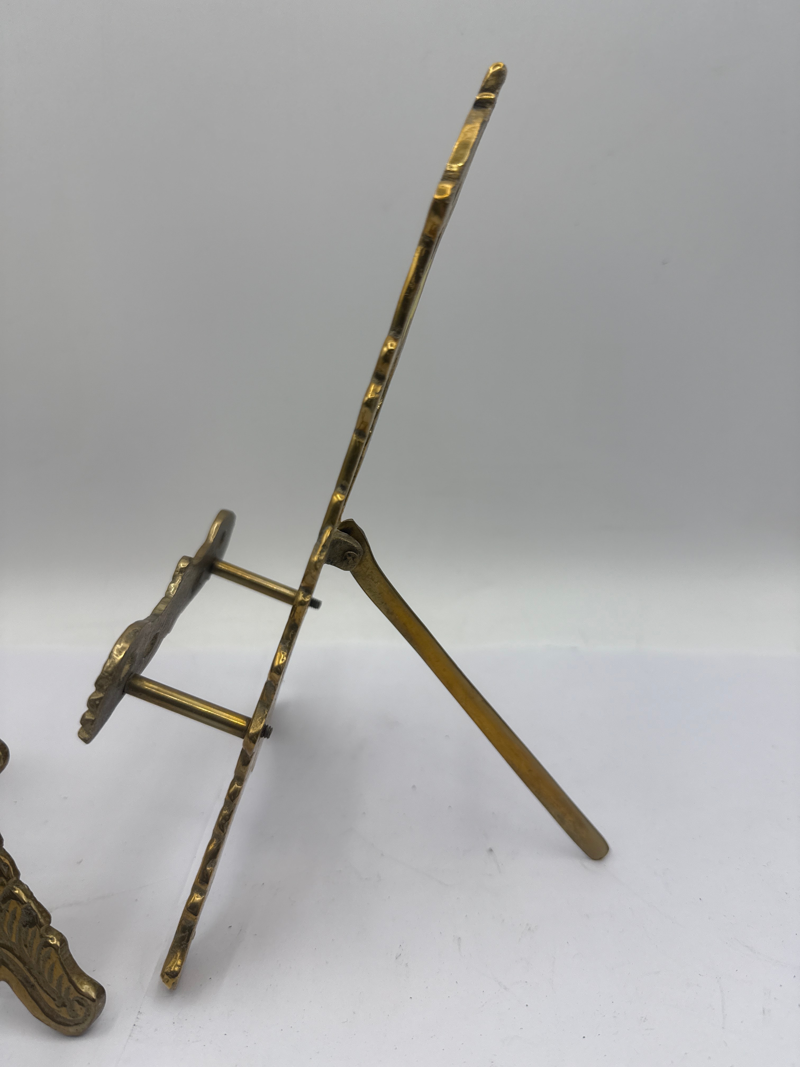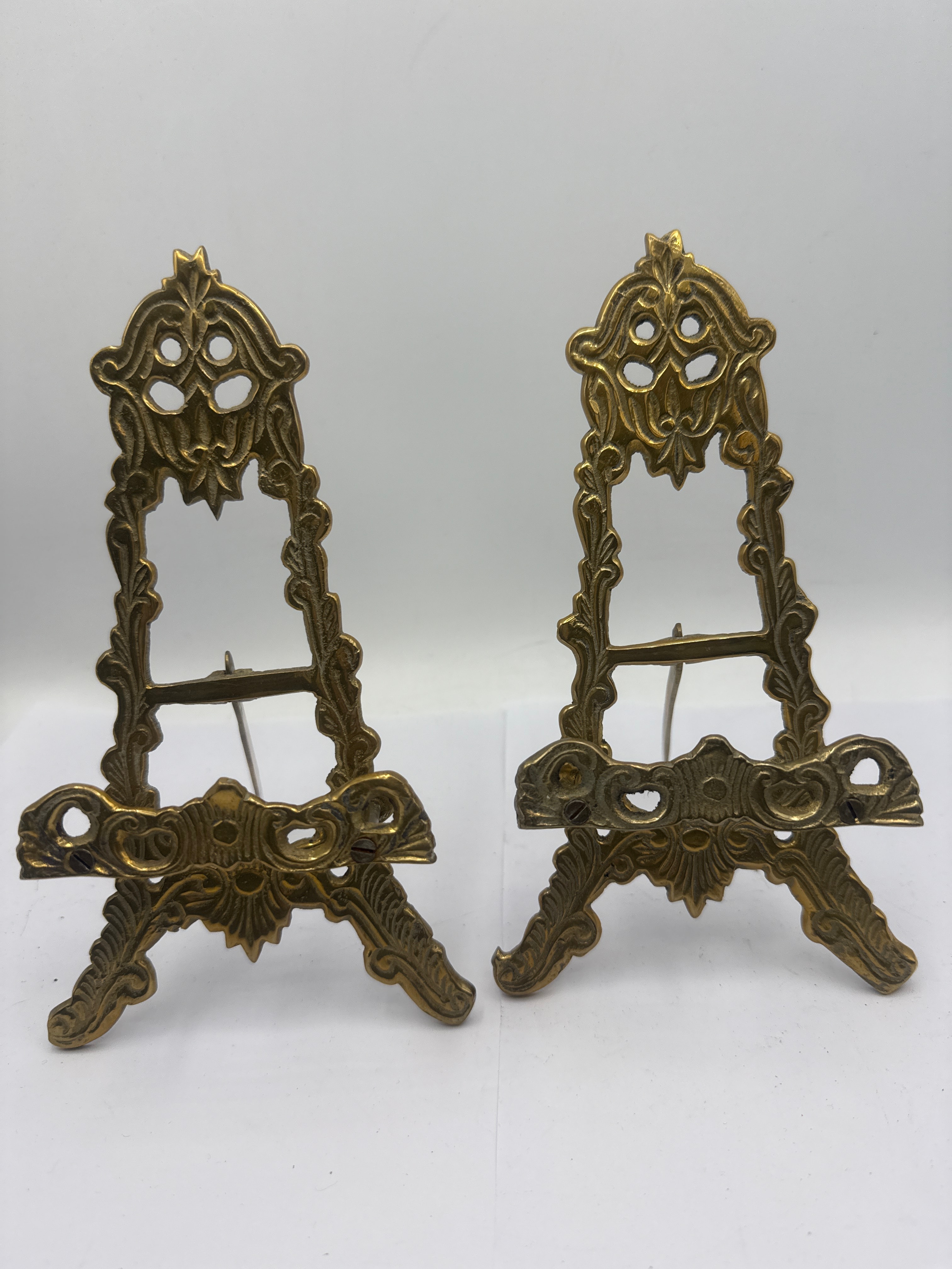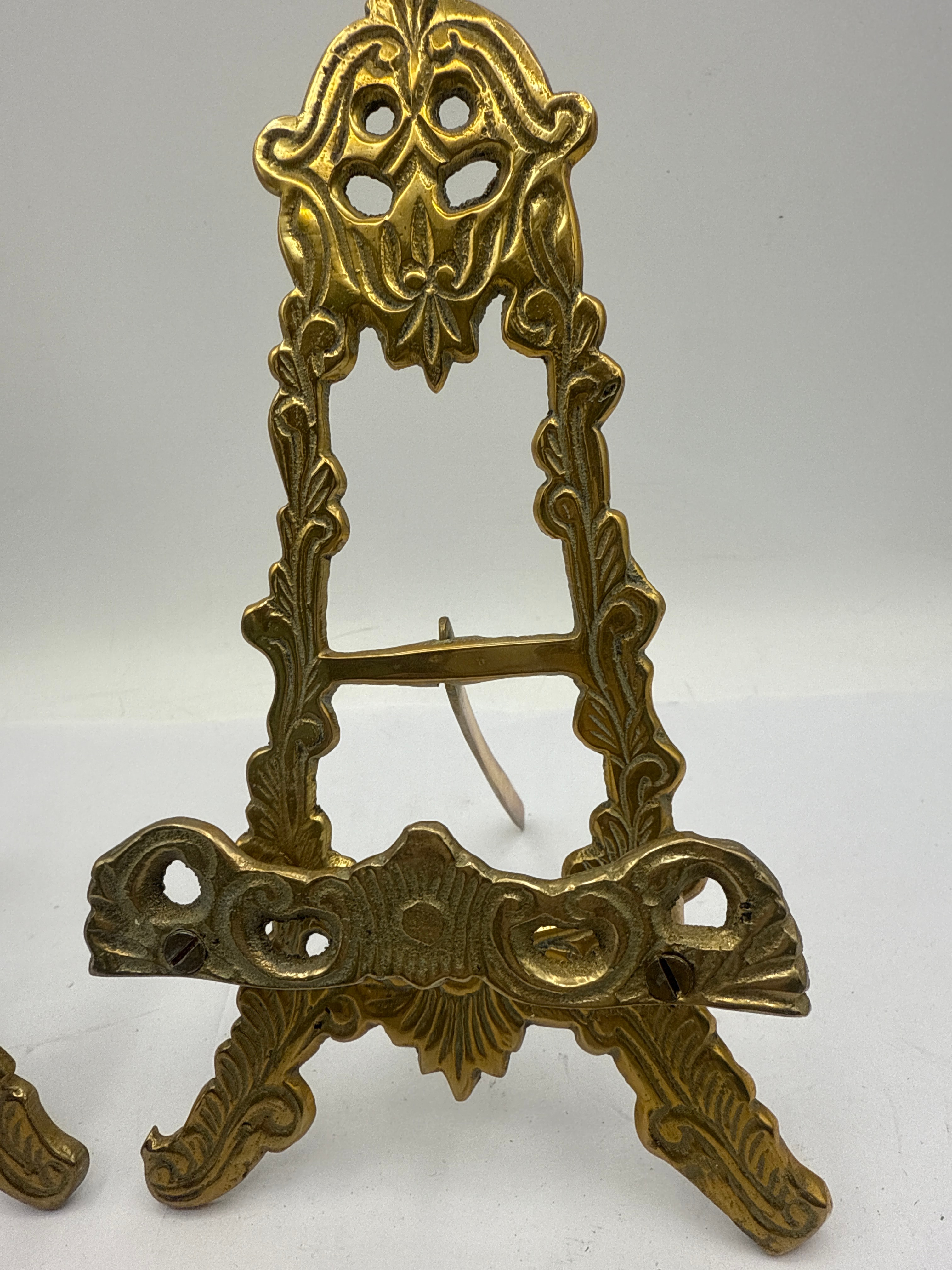 A pair of vintage ornate brass table top display easels. Each easel is crafted from cast brass or brass-toned metal, featuring an ornate, openwork design with scrolling foliage, acanthus leaves, and rocaille-like motifs, consistent with Rococo or Victorian Revival styles. They are designed with a hinged back support leg and two small horizontal arms on the front to hold an item. No visible text or manufacturer’s markings are discernible.