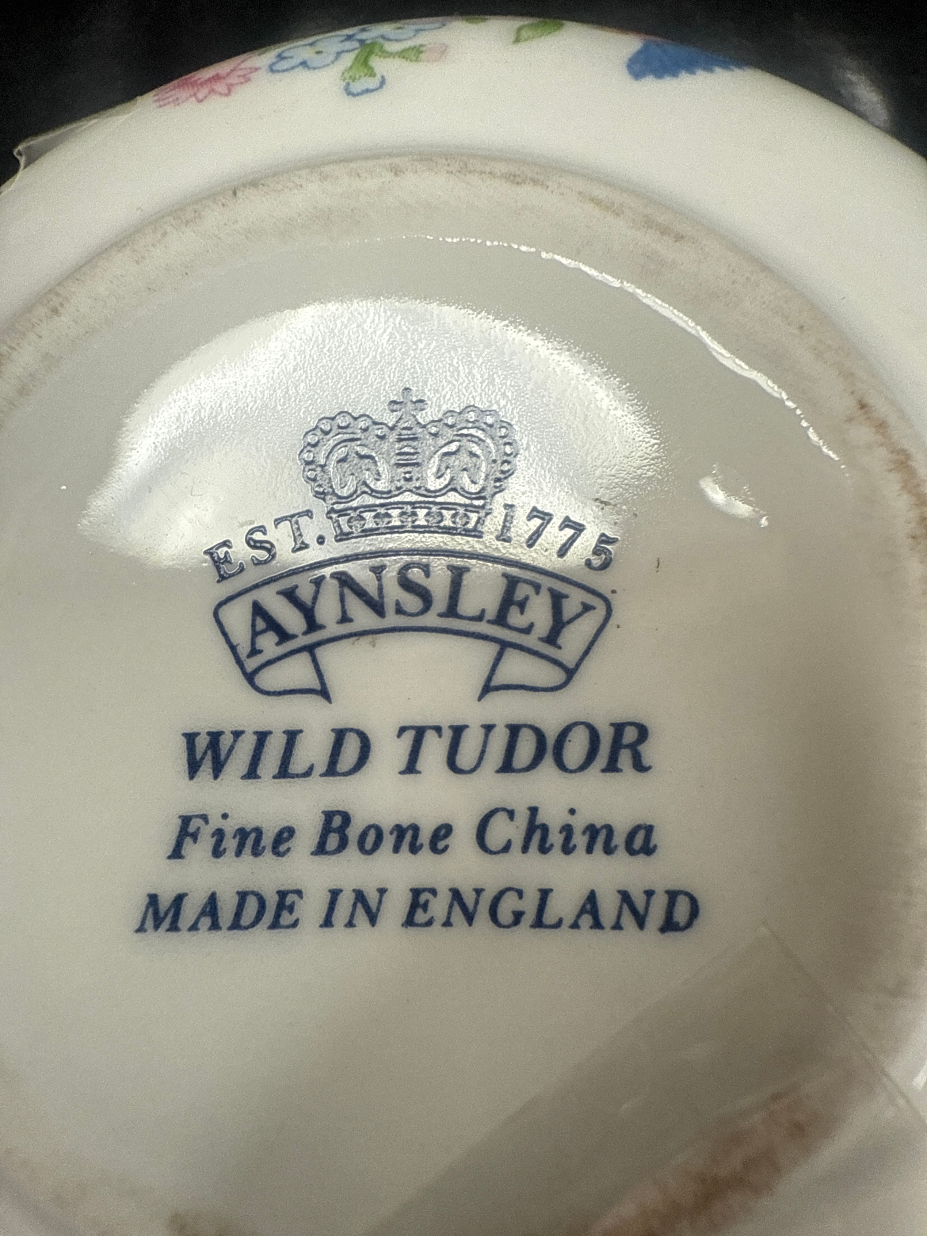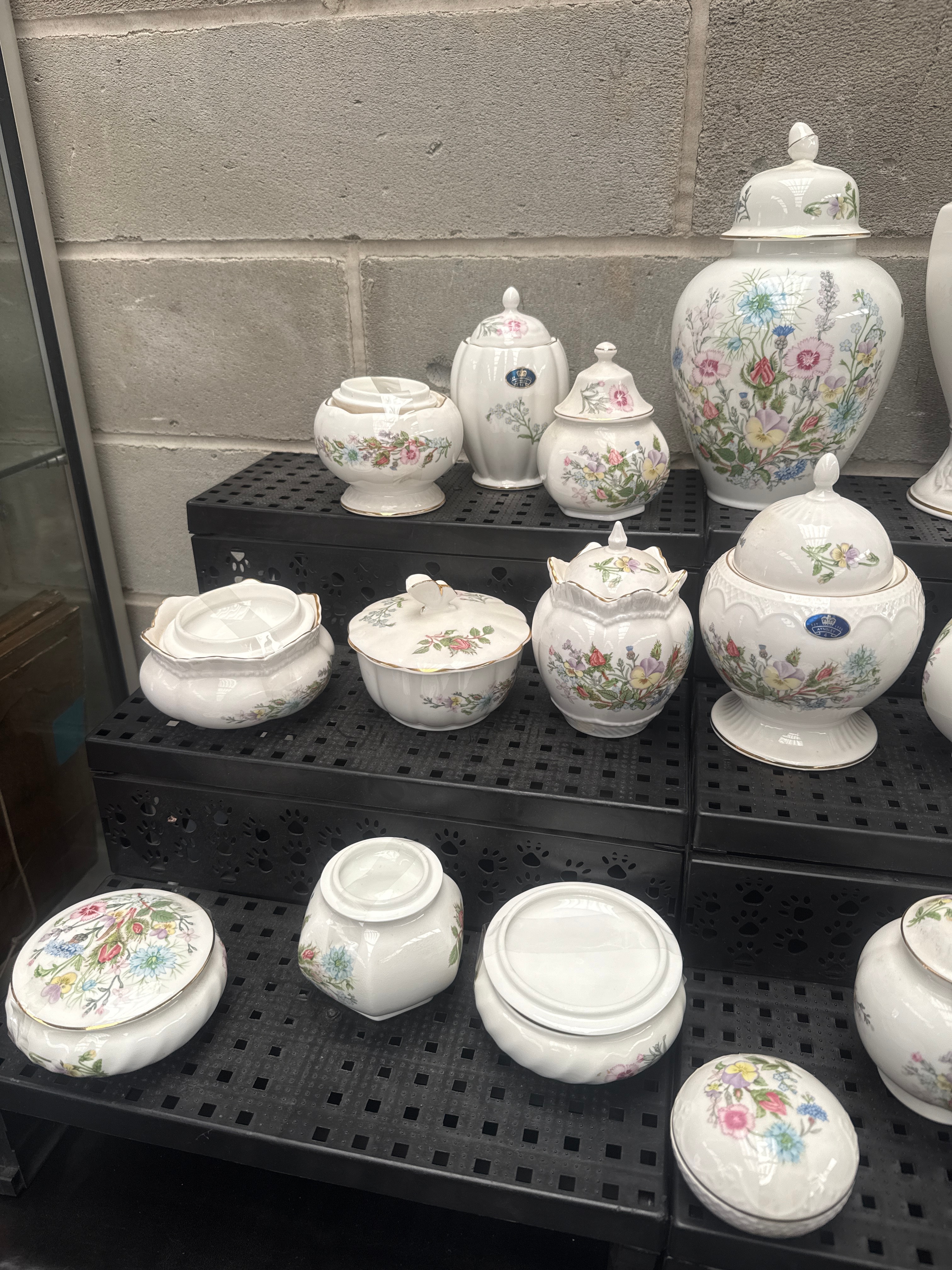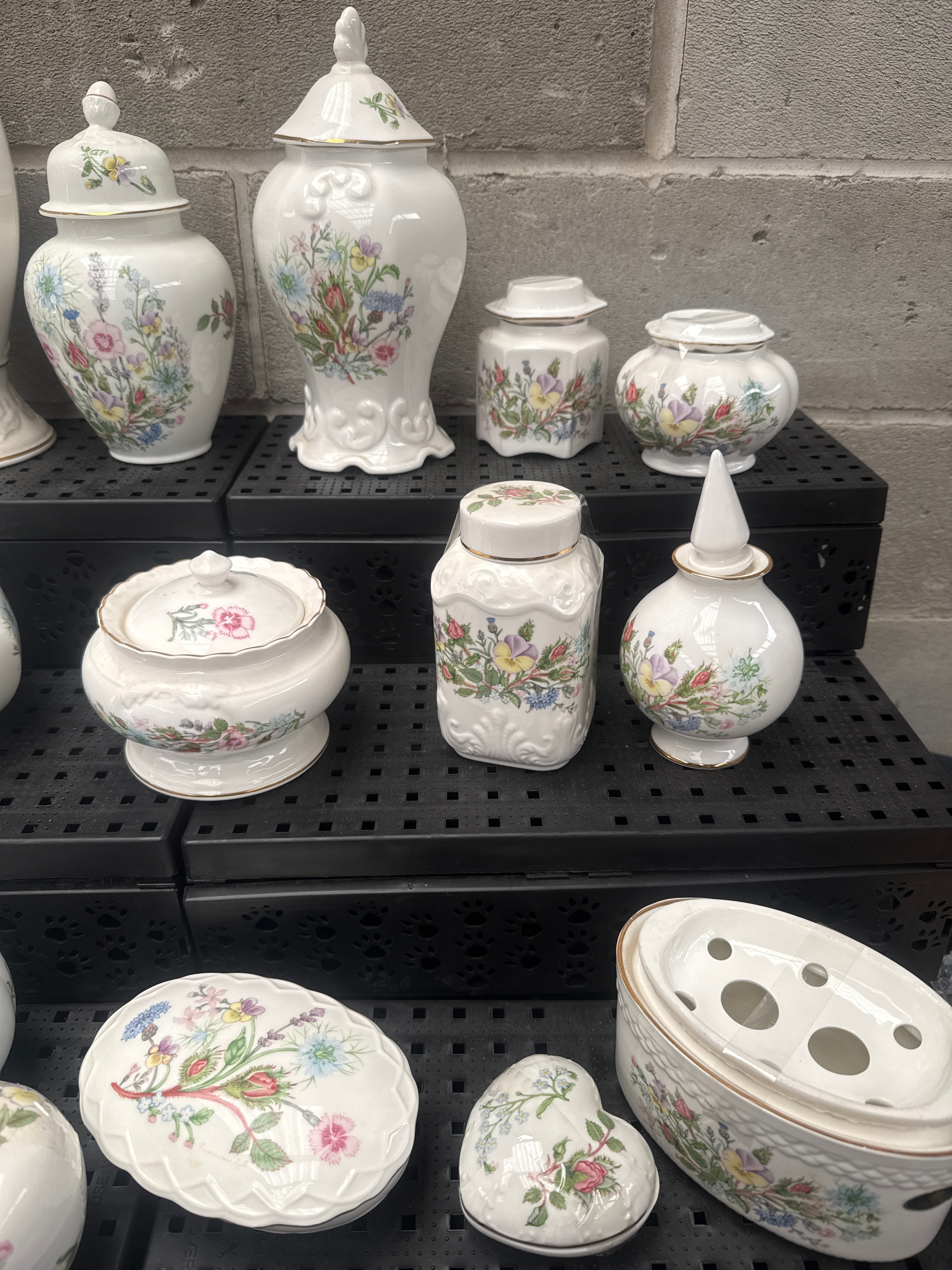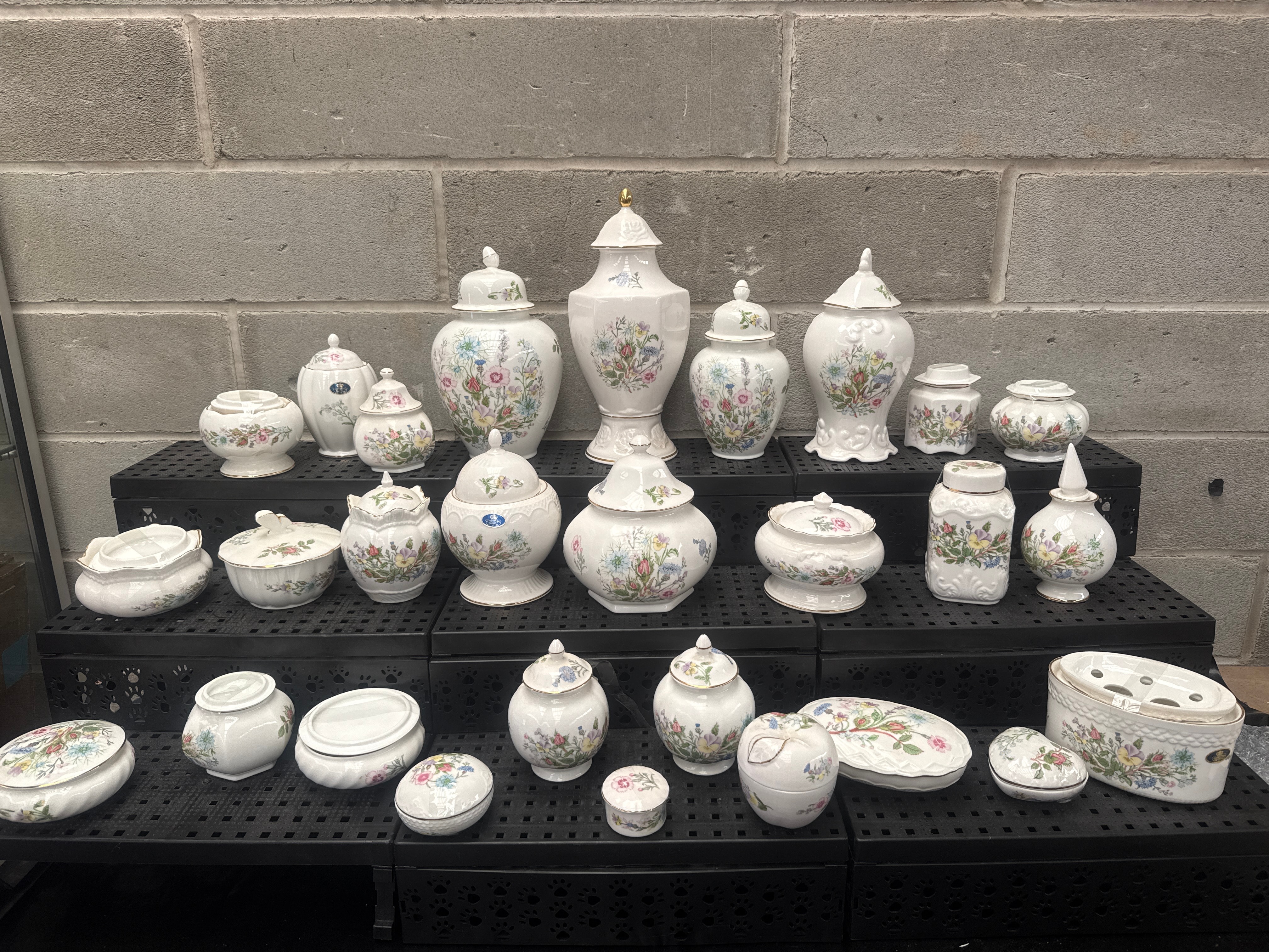 A collection of 28 pieces of Aynsley Wild Tudor fine bone china. This extensive collection features decorative and functional wares, including various lidded jars, vases, bowls, and dishes. Each item is adorned with a vibrant, multi-colored floral motif, often resembling wildflowers, and is frequently accented with gold-colored trim. Visible backstamps confirm the manufacturer as “Aynsley,” indicating the “Wild Tudor” pattern, established in 1775 and “Made in England.”