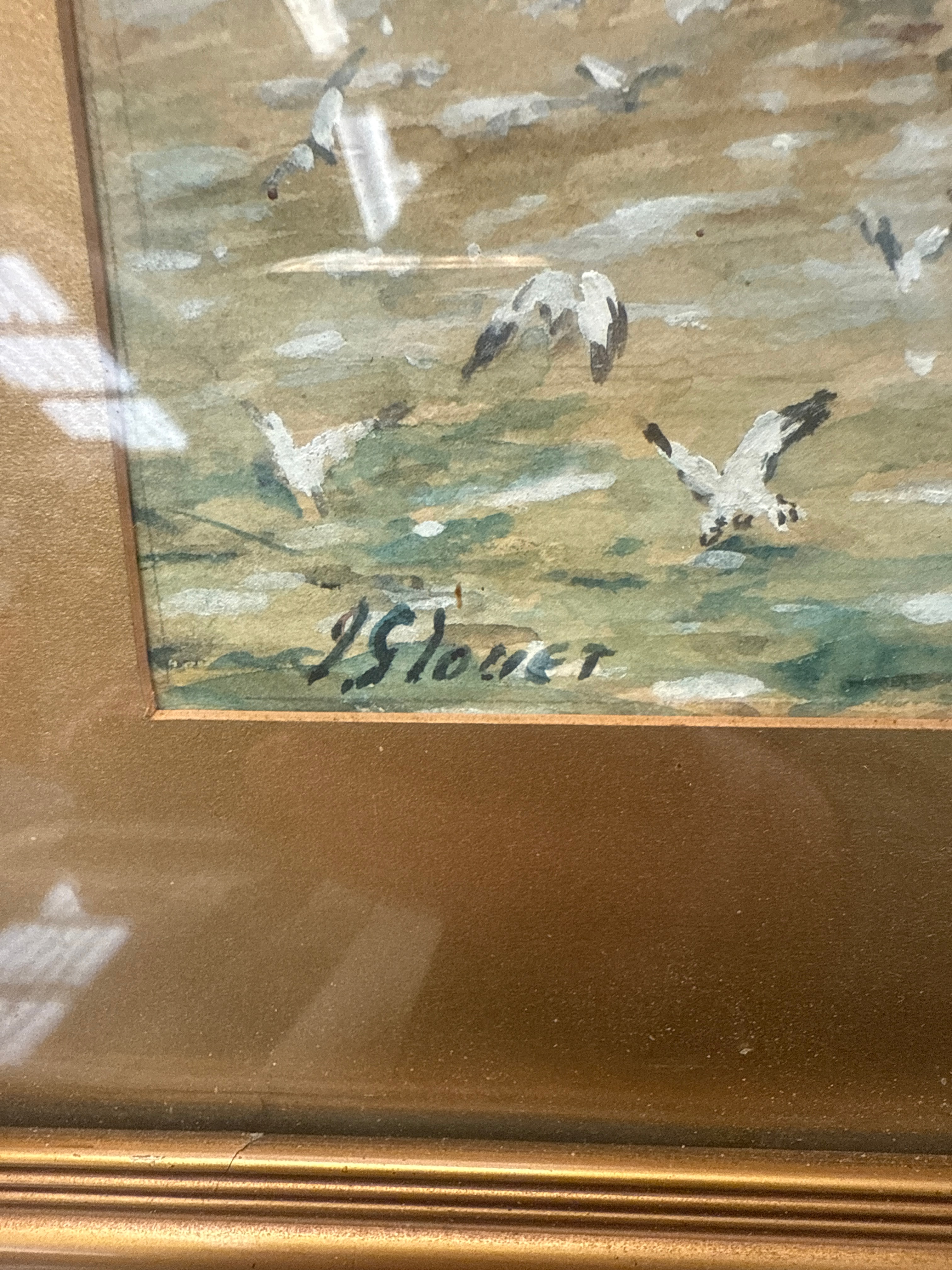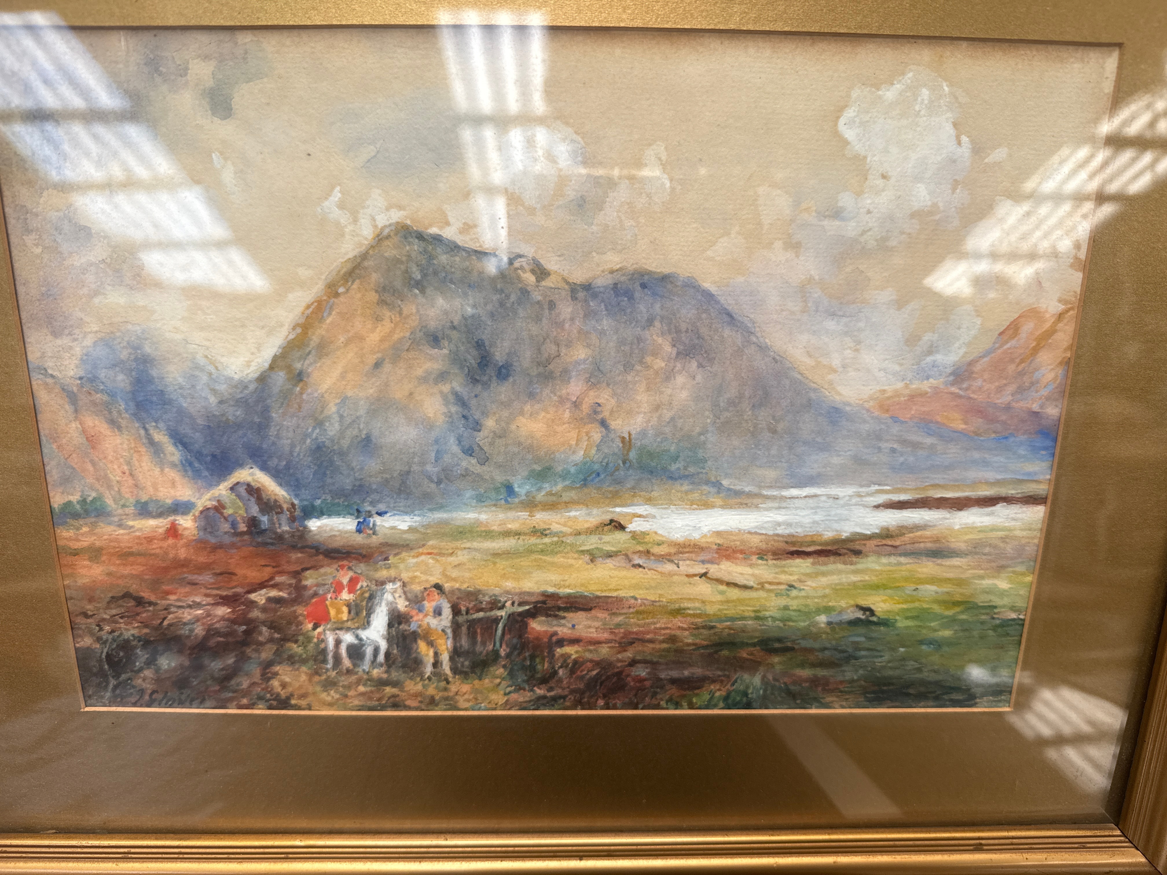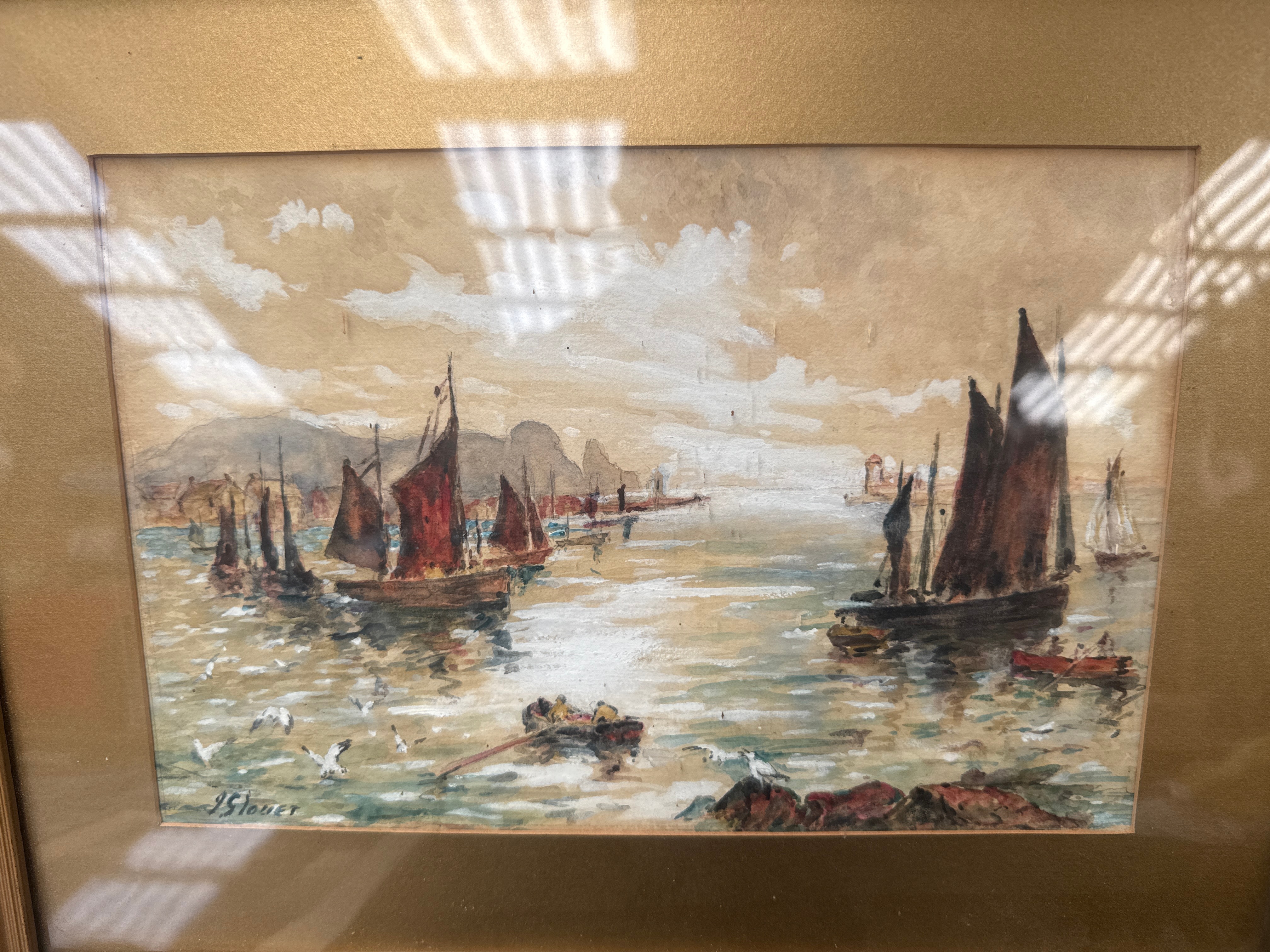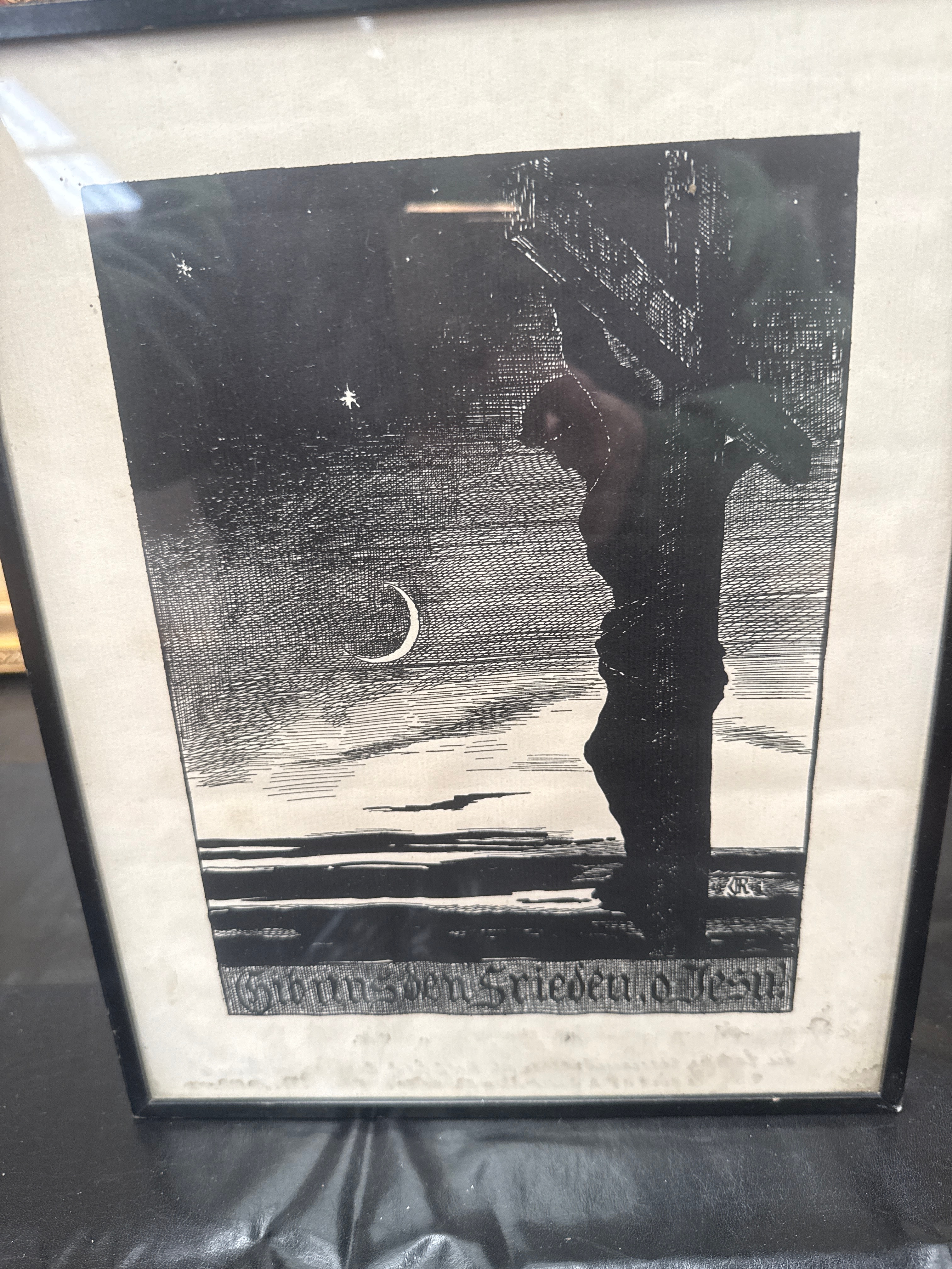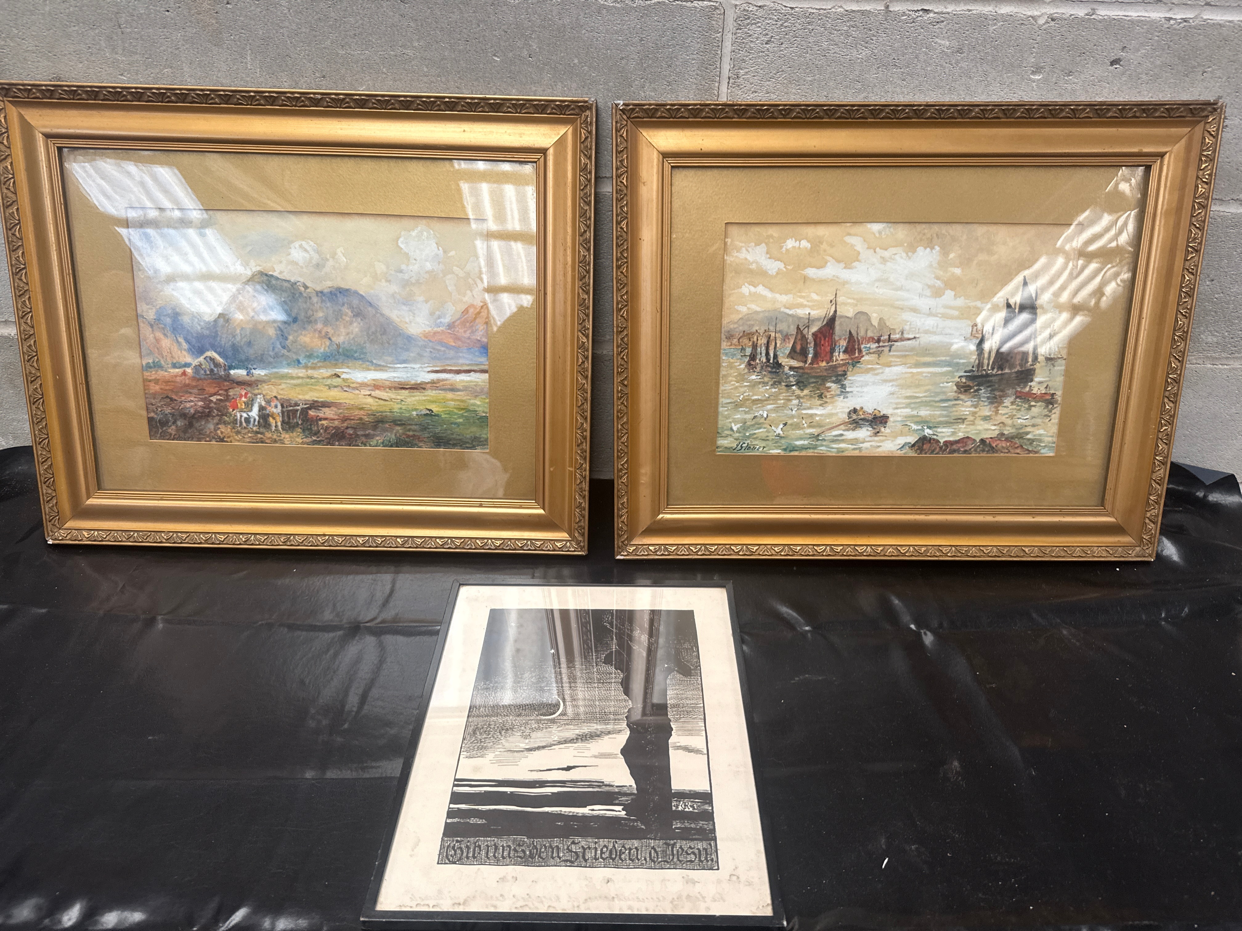 A lot comprising three framed artworks. The first two are watercolors, presented in matching gold-toned frames under glass. One watercolor depicts a mountain landscape with figures and a small settlement. The second watercolor portrays a bustling harbor scene with numerous sailing vessels, signed “J. Stoner” in the lower left corner, executed in a style indicative of late 19th to early 20th-century landscape or marine painting. The third item is a monochrome print, framed in black under glass, depicting a stylized nocturnal crucifixion scene featuring a crescent moon and stars. This print includes an apparent artist’s monogram (possibly ‘RK’ or ‘ER’) in the lower right of the image, and the German inscription “Bring uns den Frieden o Jesu” (Bring us peace, O Jesus) beneath the image.