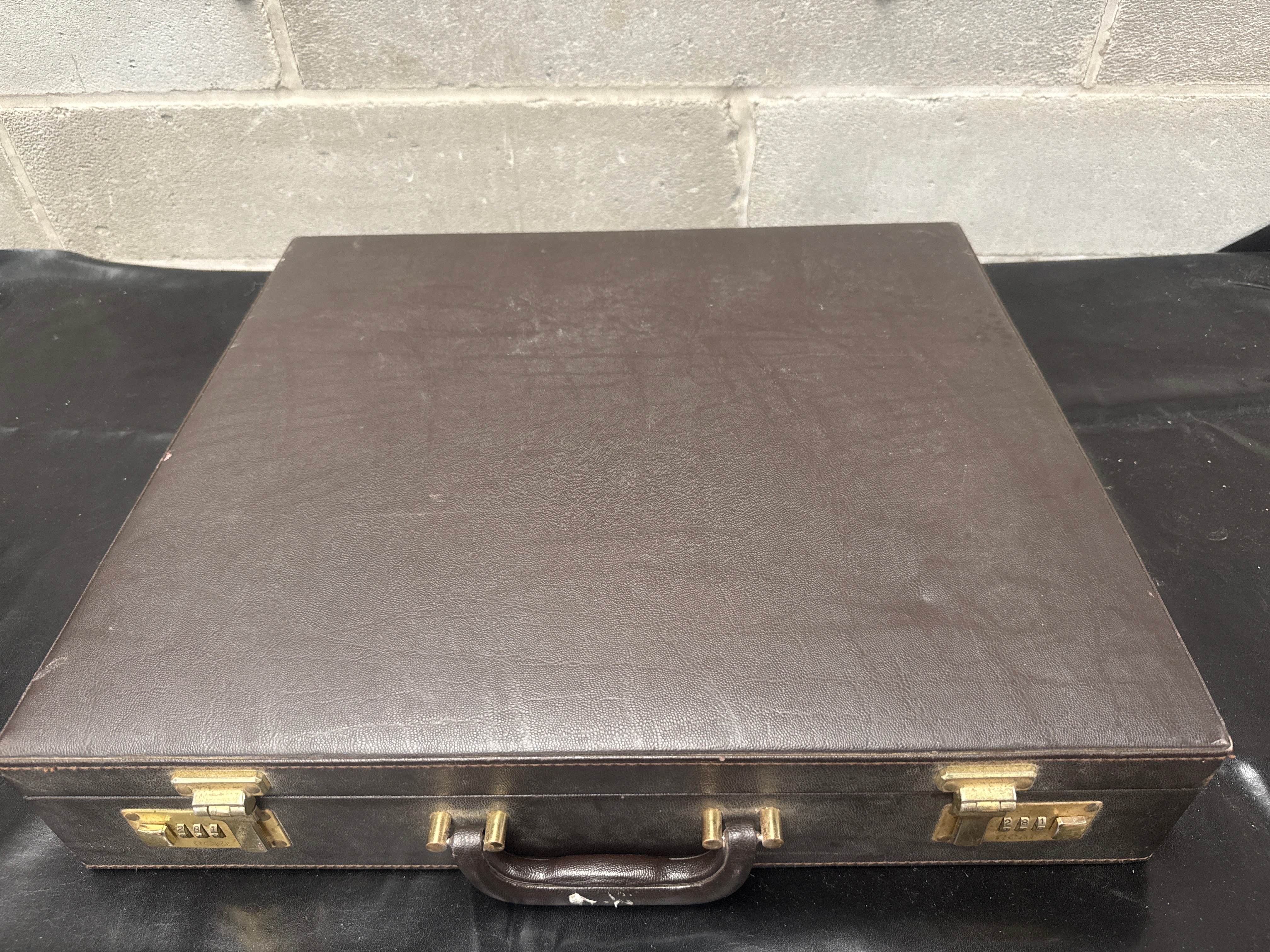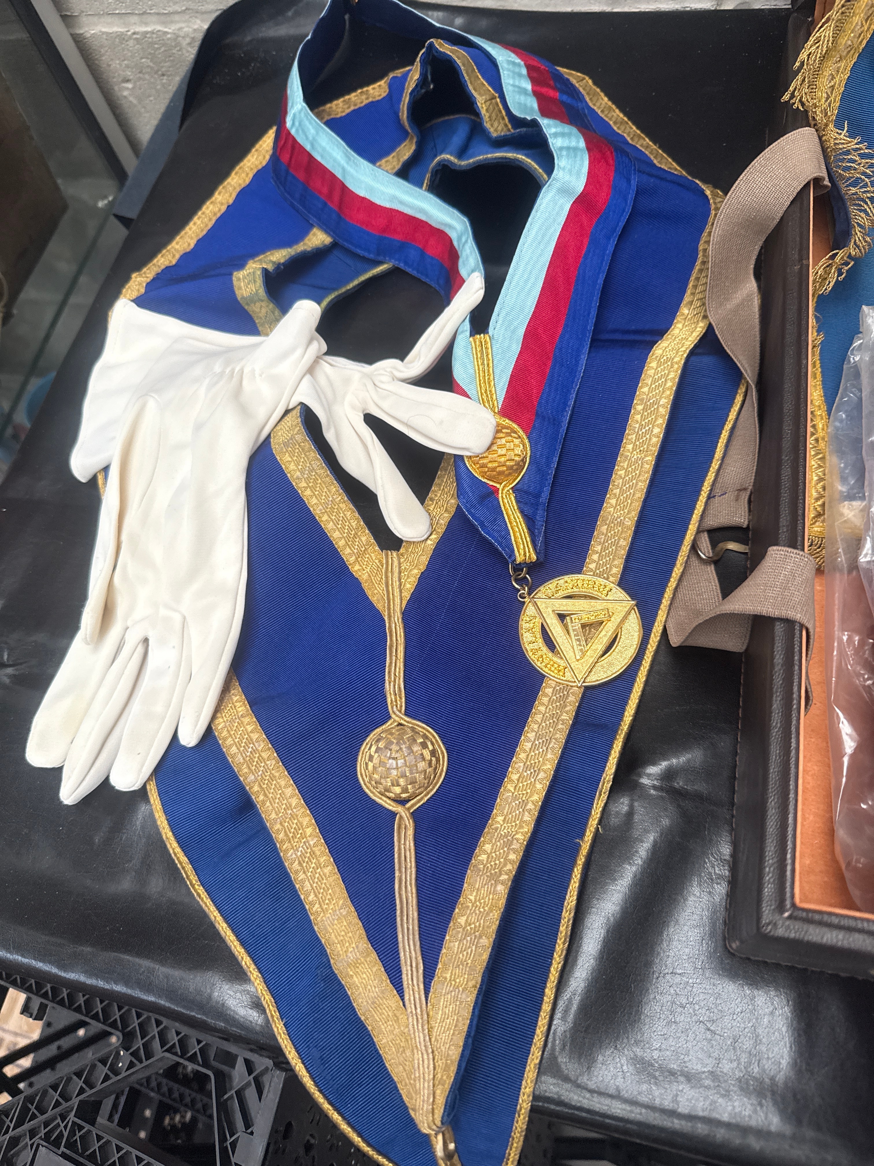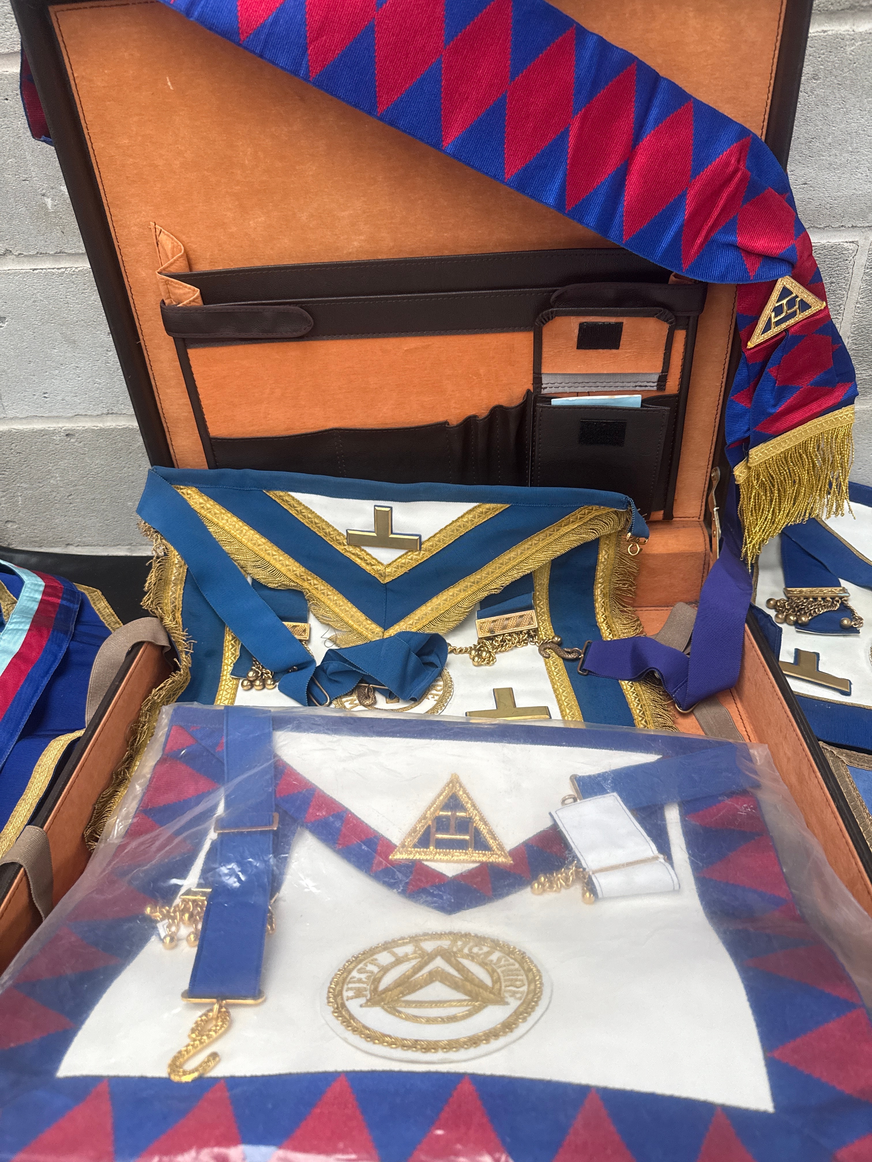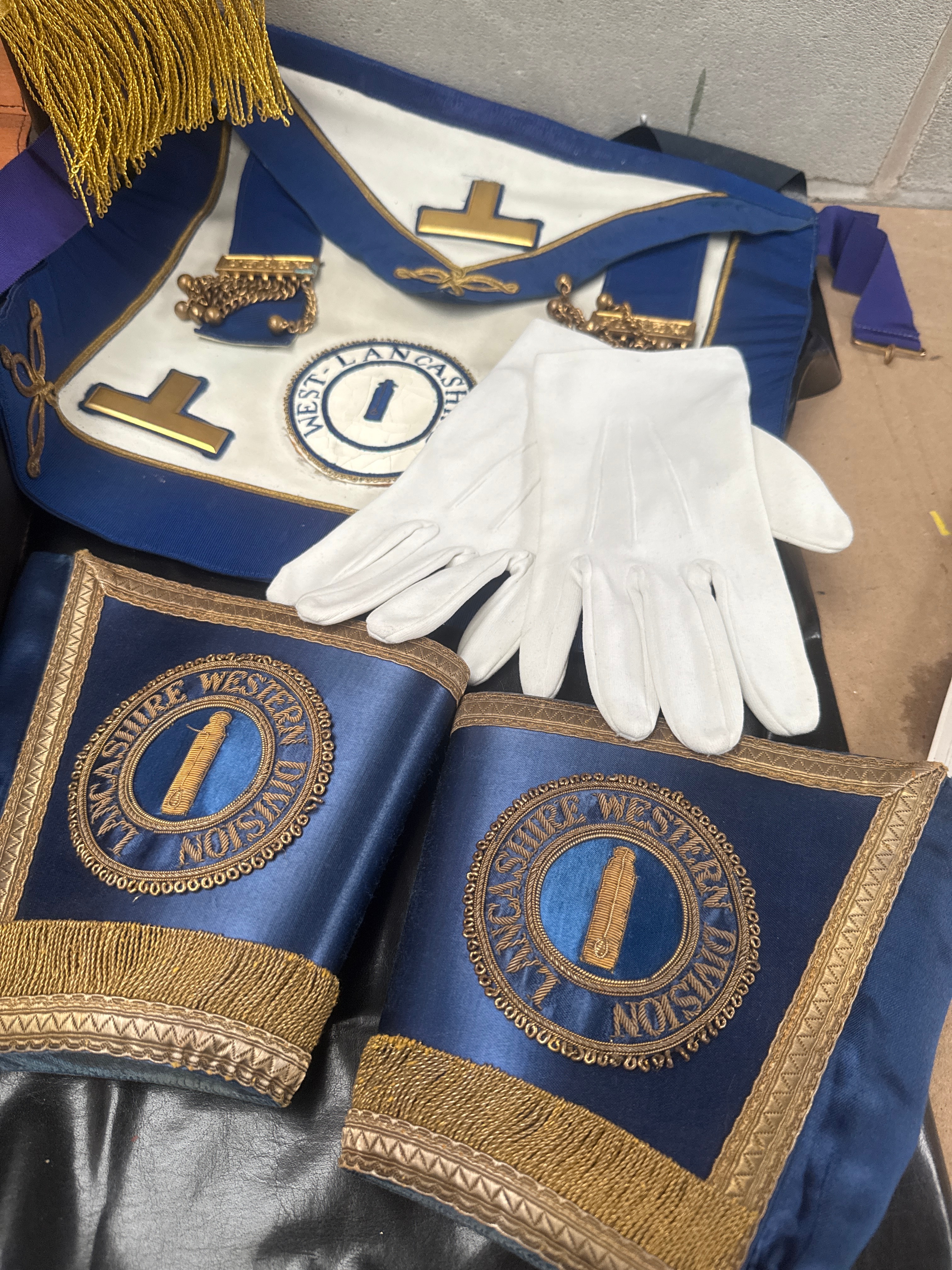 A collection of Masonic Royal Arch Provincial regalia, likely dating from the mid-to-late 20th century. The ensemble comprises multiple ornate aprons, sashes, and collars, predominantly crafted from blue, white, and red fabrics with intricate gold-colored embroidery and fringe. Attached gold-colored metal medallions are present on several items. Distinctive symbols such as a triangle enclosing a circle, cross-like emblems, a stylized ‘T’ over ‘H’, and a plumb bob device are visible throughout the regalia. Embroidered text includes “WEST LANCASHIRE WESTERN DIVISION” and “WEST LANCS I”, indicating a specific regional affiliation. The collection also includes multiple pairs of plain white gloves. All items are arranged around an open, dark brown briefcase-style carrying case with brass-toned combination locks and a tan fabric-lined interior.