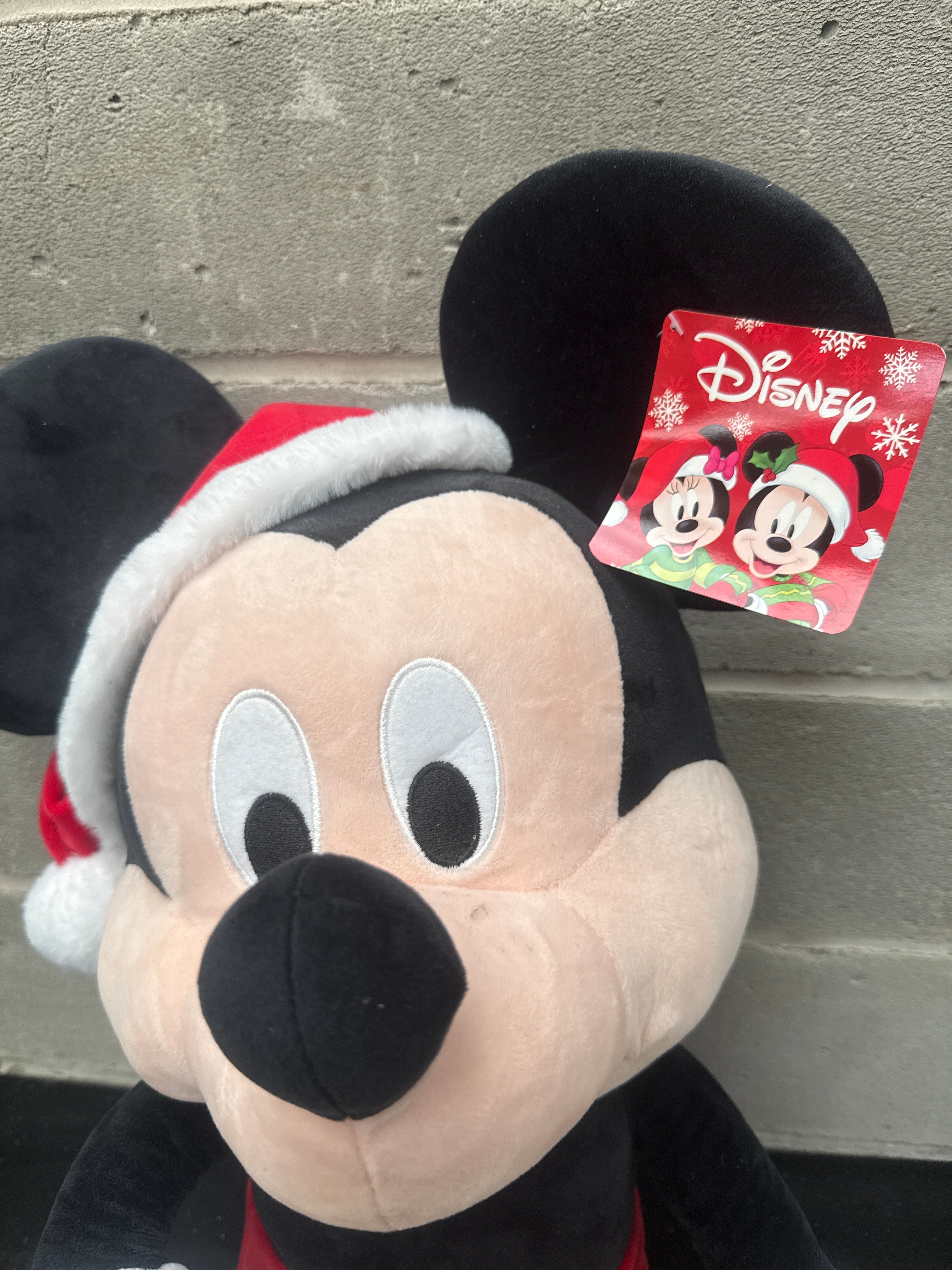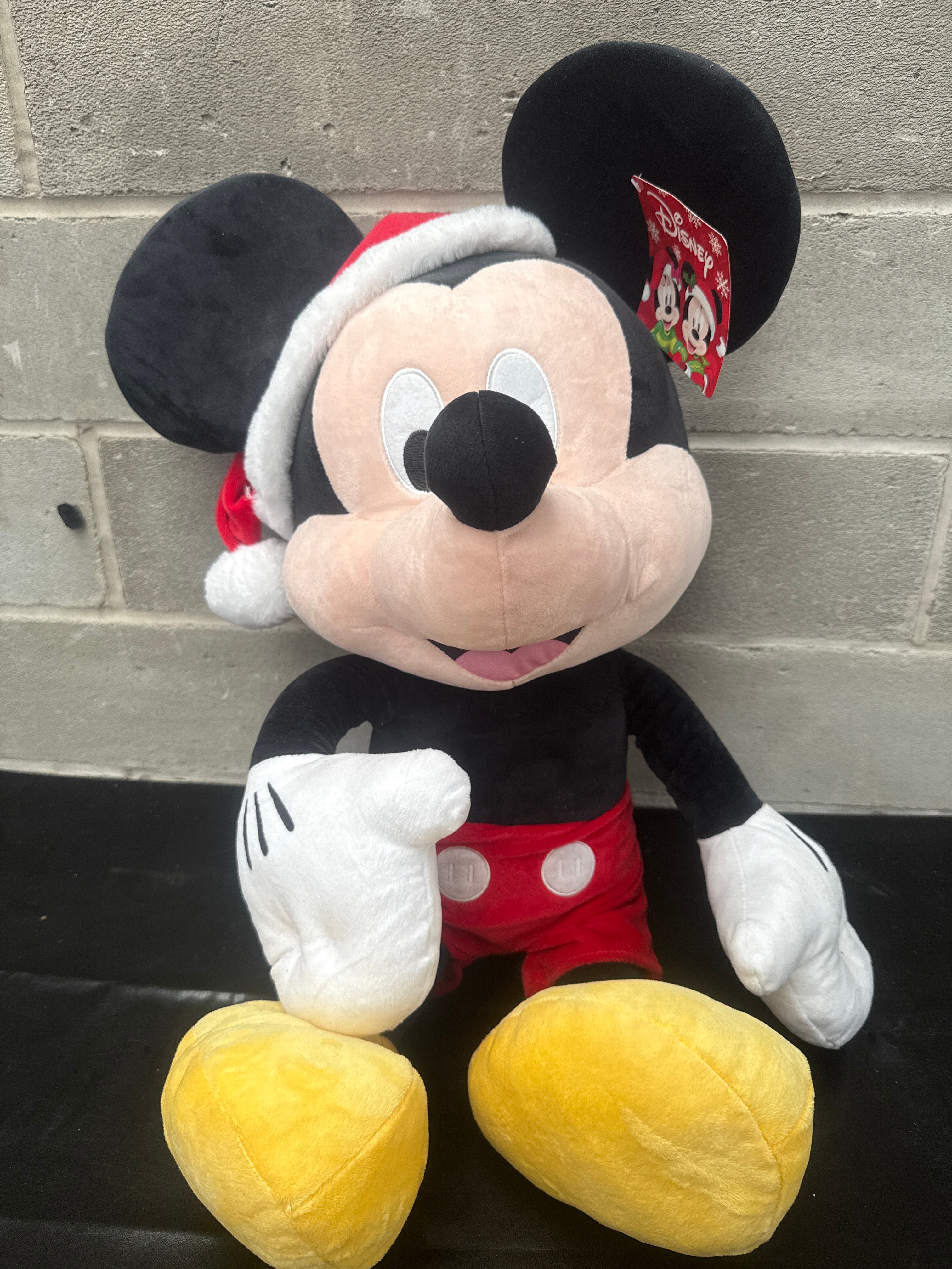A Disney Mickey Mouse Holiday Plush. This large, contemporary plush toy depicts the Disney character Mickey Mouse, presented in a holiday or Christmas theme with a red and white Santa hat. The figure is constructed from soft, stuffed fabric in black, red, yellow, and beige, with embroidered facial features. A red rectangular paper tag bearing the “Disney” logo and images of Mickey and Minnie Mouse in festive attire is attached to its left ear.