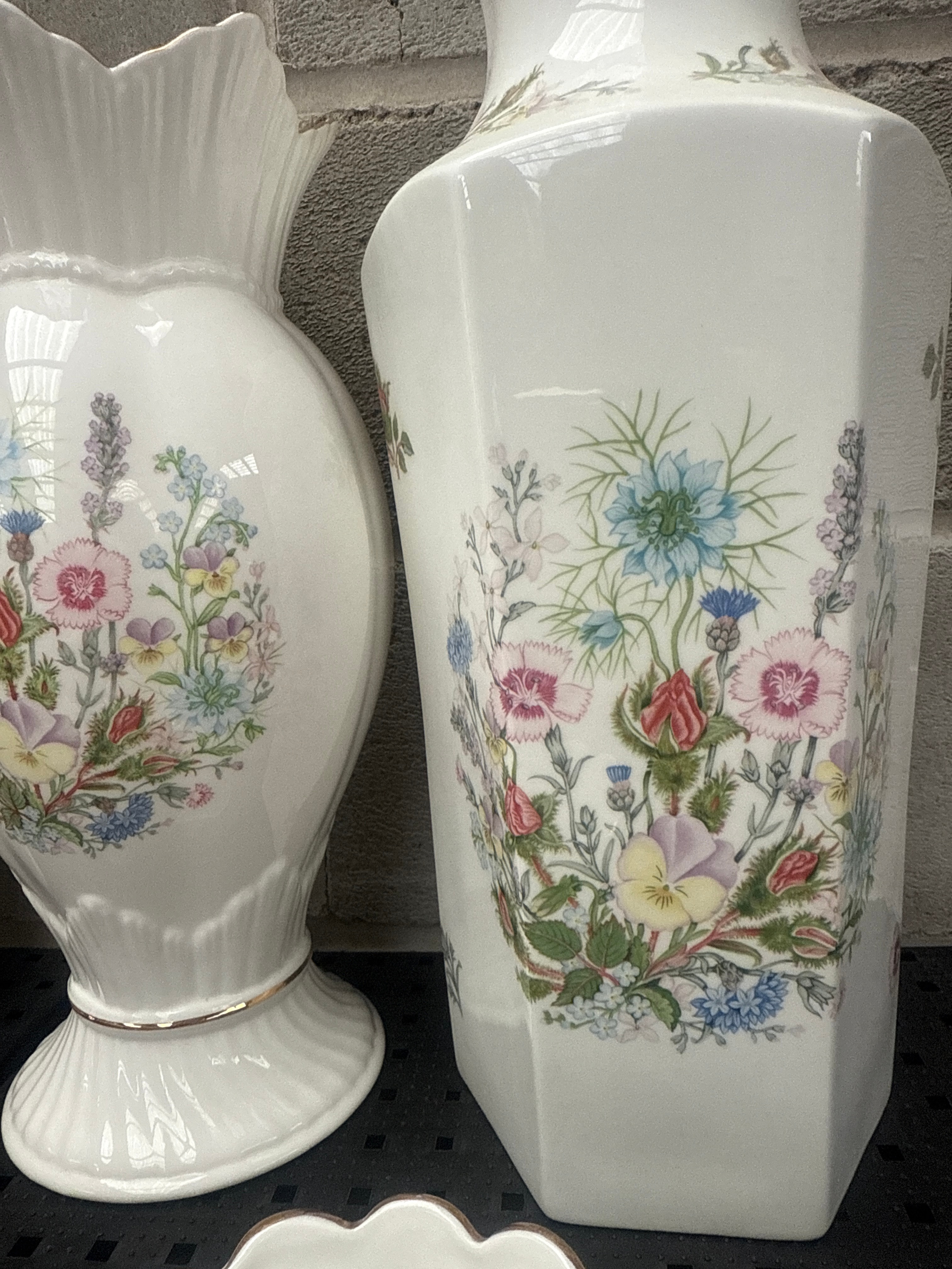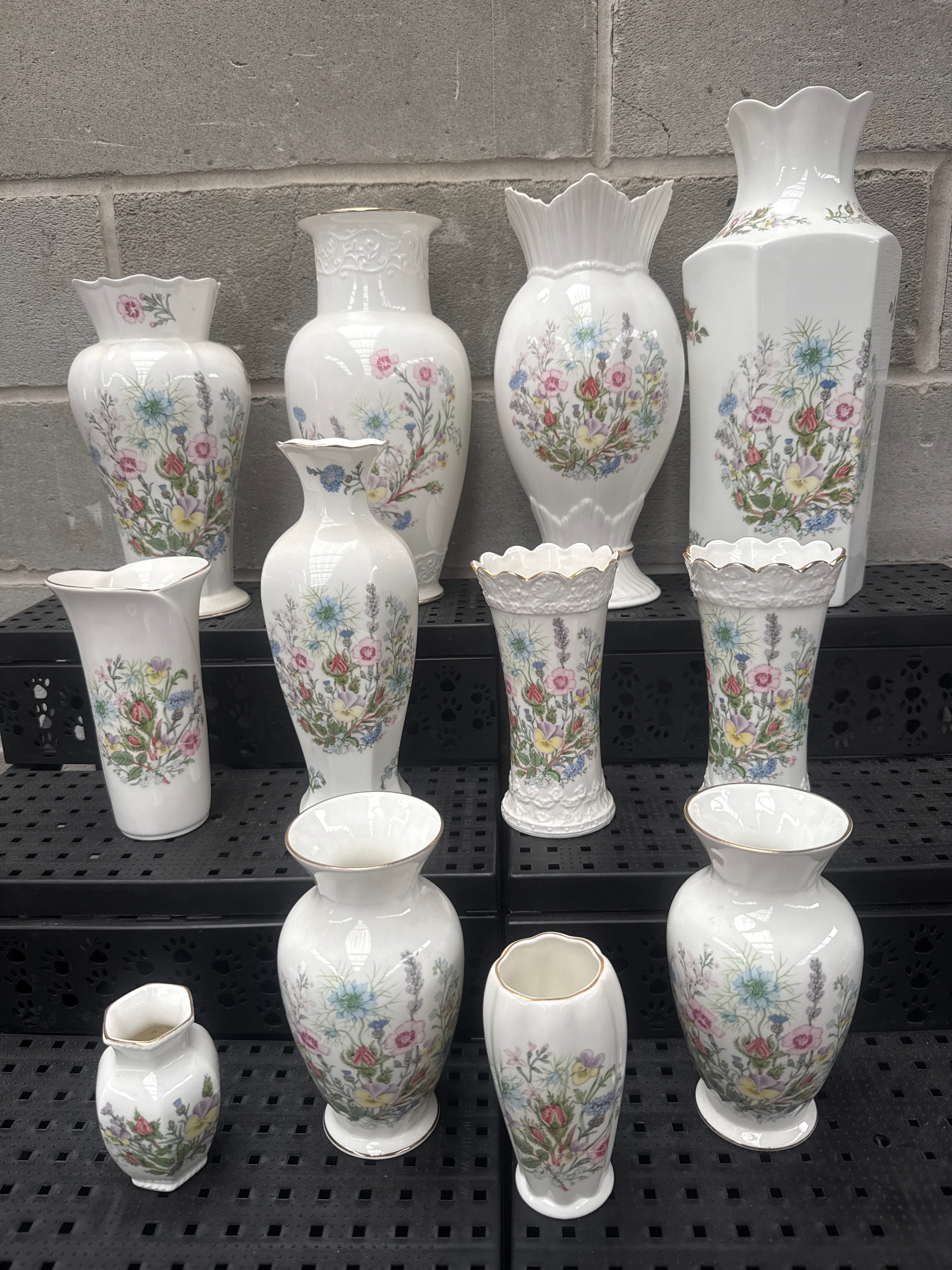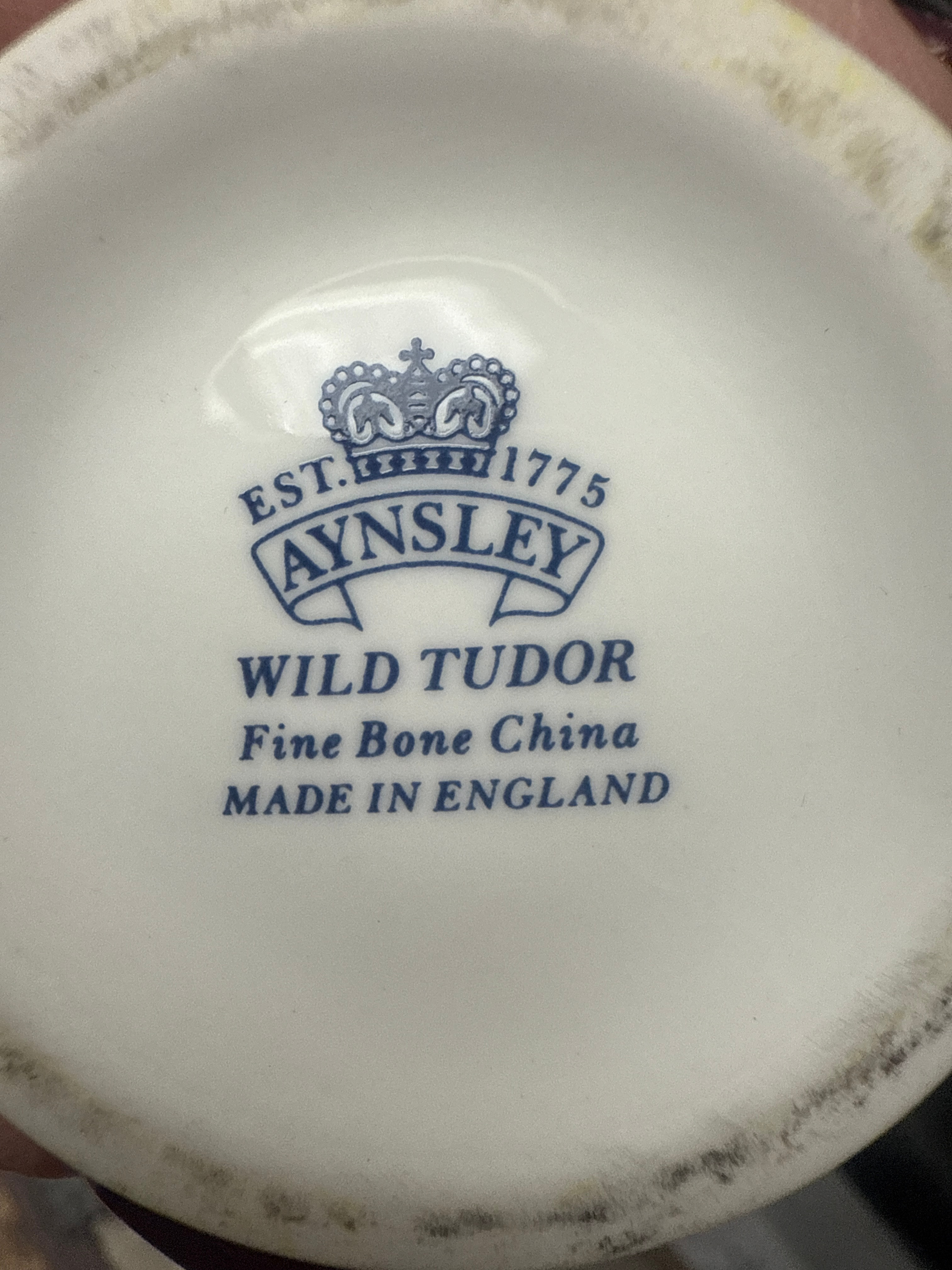 A collection of twelve Aynsley ‘Wild Tudor’ fine bone china vases, varying in height and form from small bud vases to larger urn-shaped, fluted, and octagonal examples. Each is uniformly decorated with the vibrant ‘Wild Tudor’ floral pattern, depicting colorful mixed wildflowers and foliage. Several vases feature gold-colored accents on their rims or bases. The underside of one item clearly displays a blue printed manufacturer’s mark, featuring a crown emblem with ‘EST. 1775 AYNSLEY’ in a banner, alongside ‘WILD TUDOR,’ ‘Fine Bone China,’ and ‘MADE IN ENGLAND’.