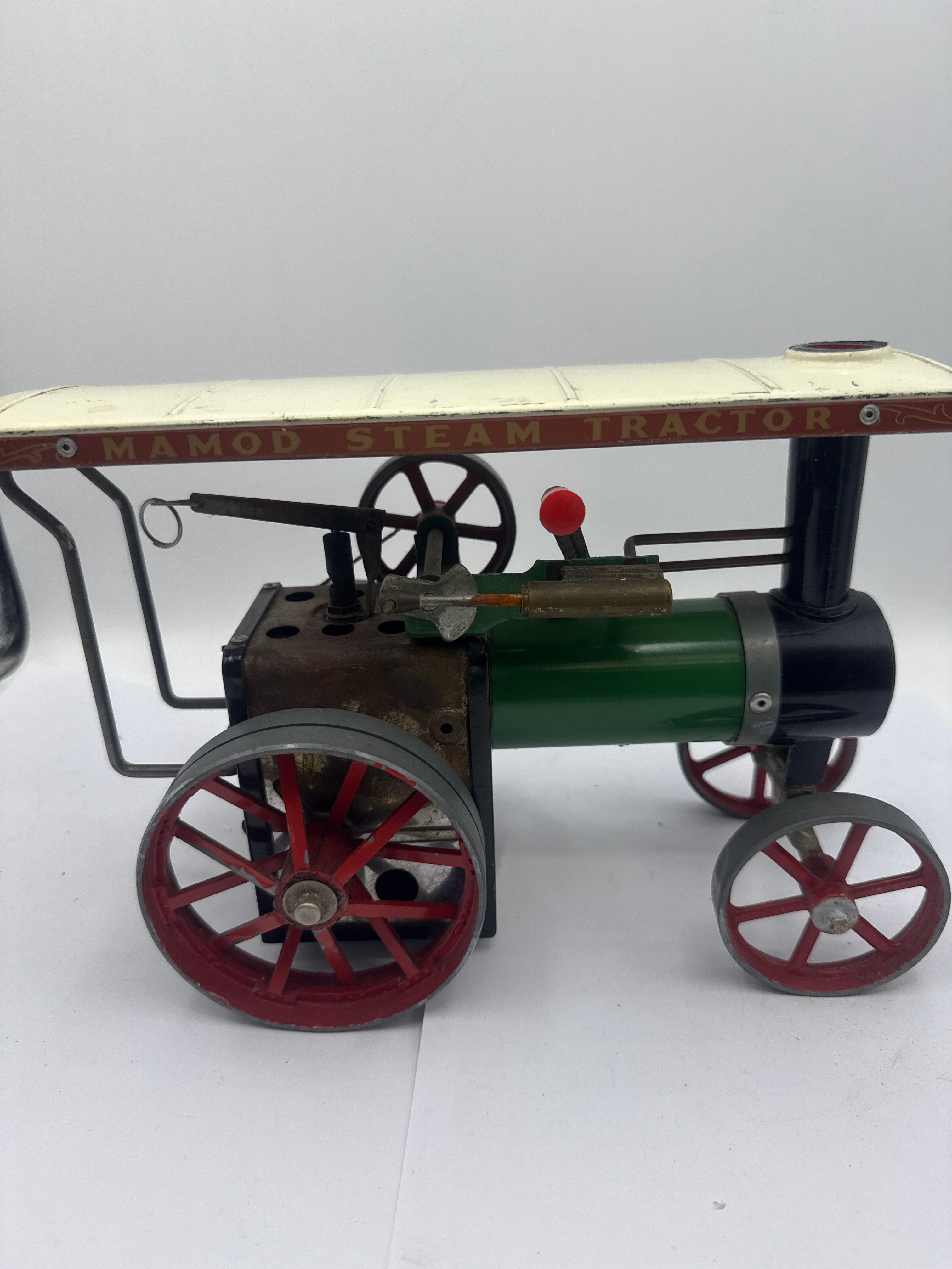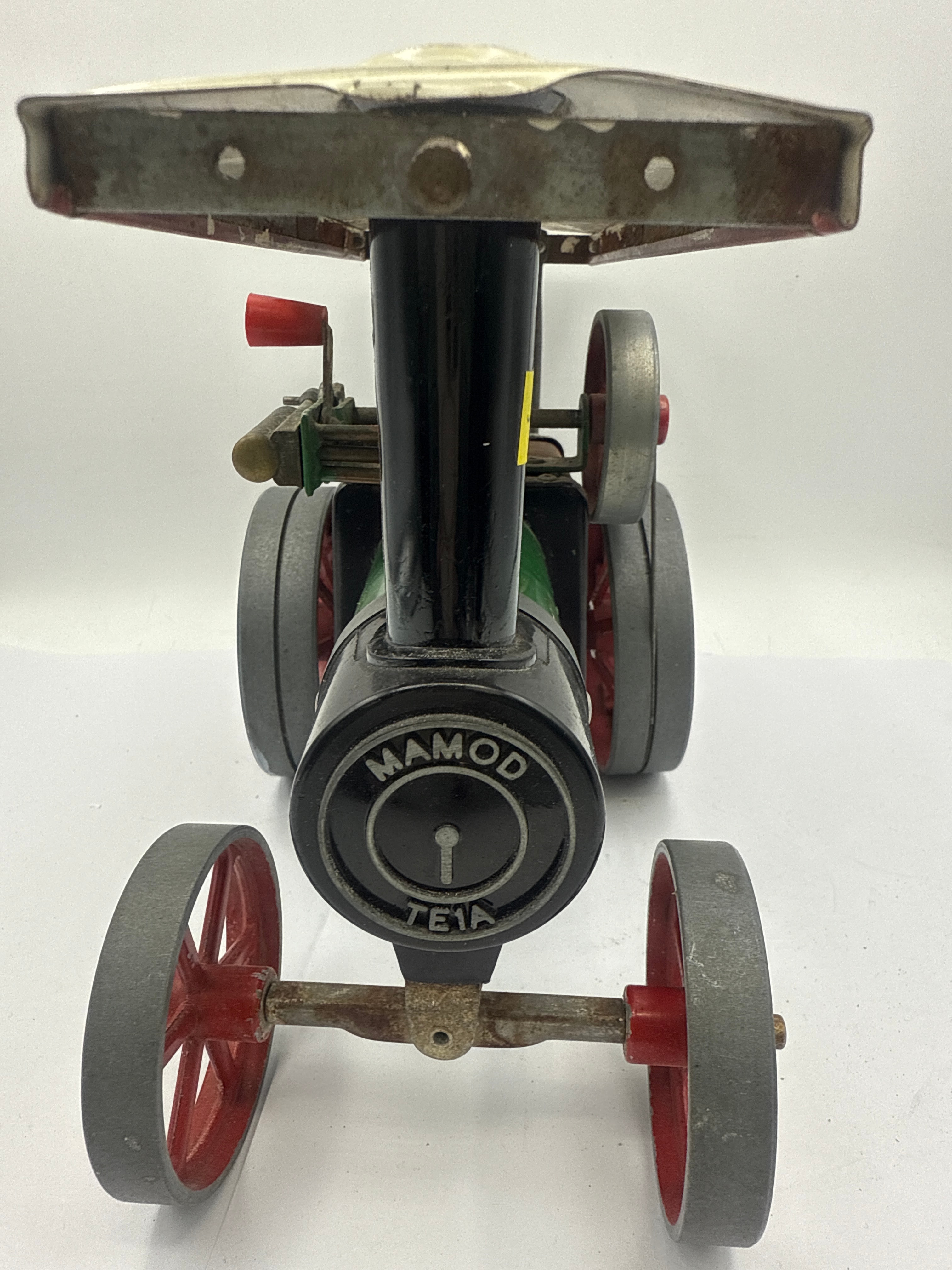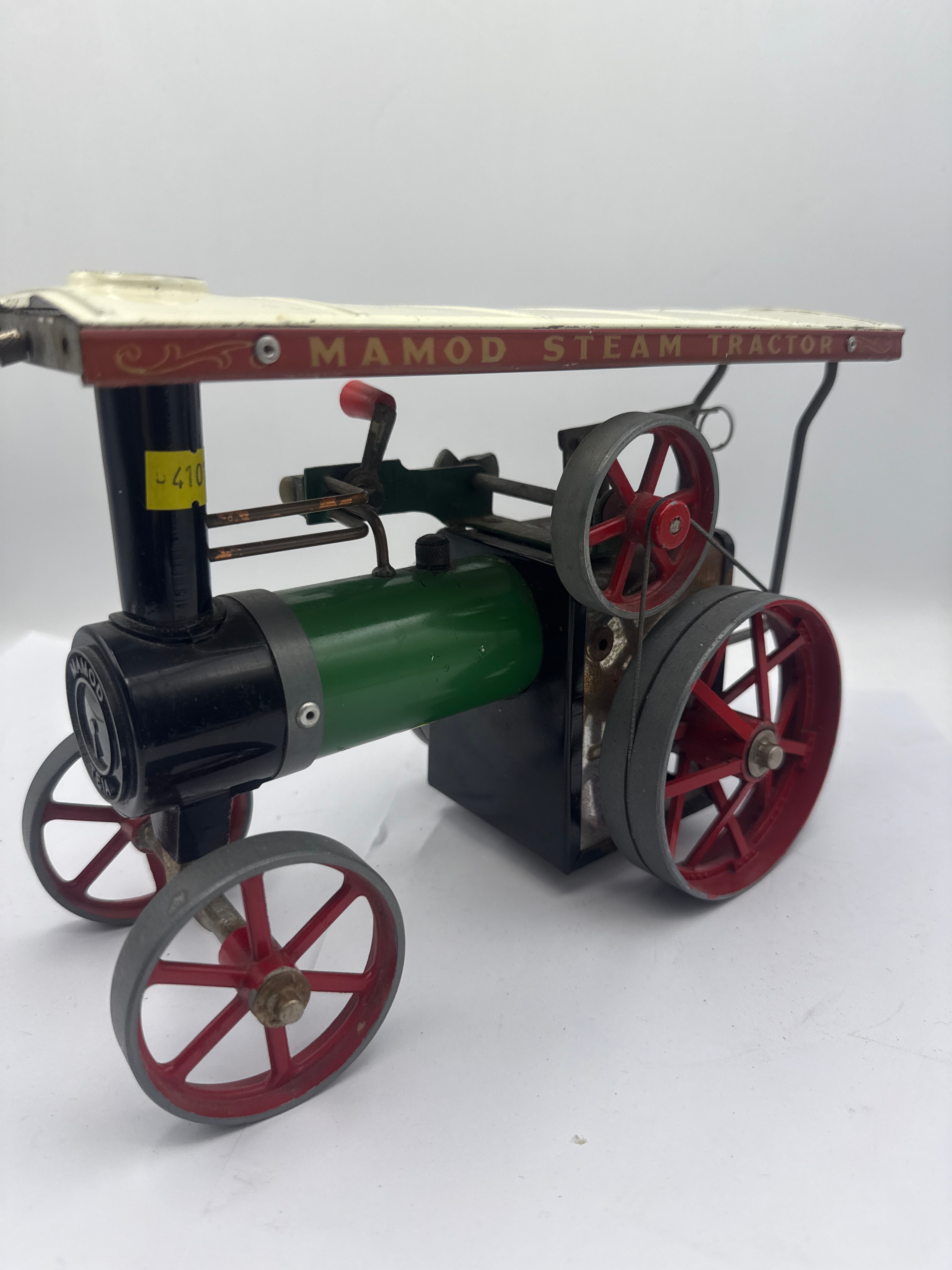 A Mamod TE1A Steam Tractor. This vintage-style live steam model tractor is primarily constructed from painted metal components. It features a green boiler, black engine block and chimney, and red spoked wheels with grey tires, all beneath a cream-colored metal canopy. The canopy prominently displays the text ‘MAMOD STEAM TRACTOR,’ and the front of the boiler is marked ‘MAMOD TE1A.’ A yellow sticker with the number ‘-410’ is affixed to the chimney. All primary components appear present and intact.