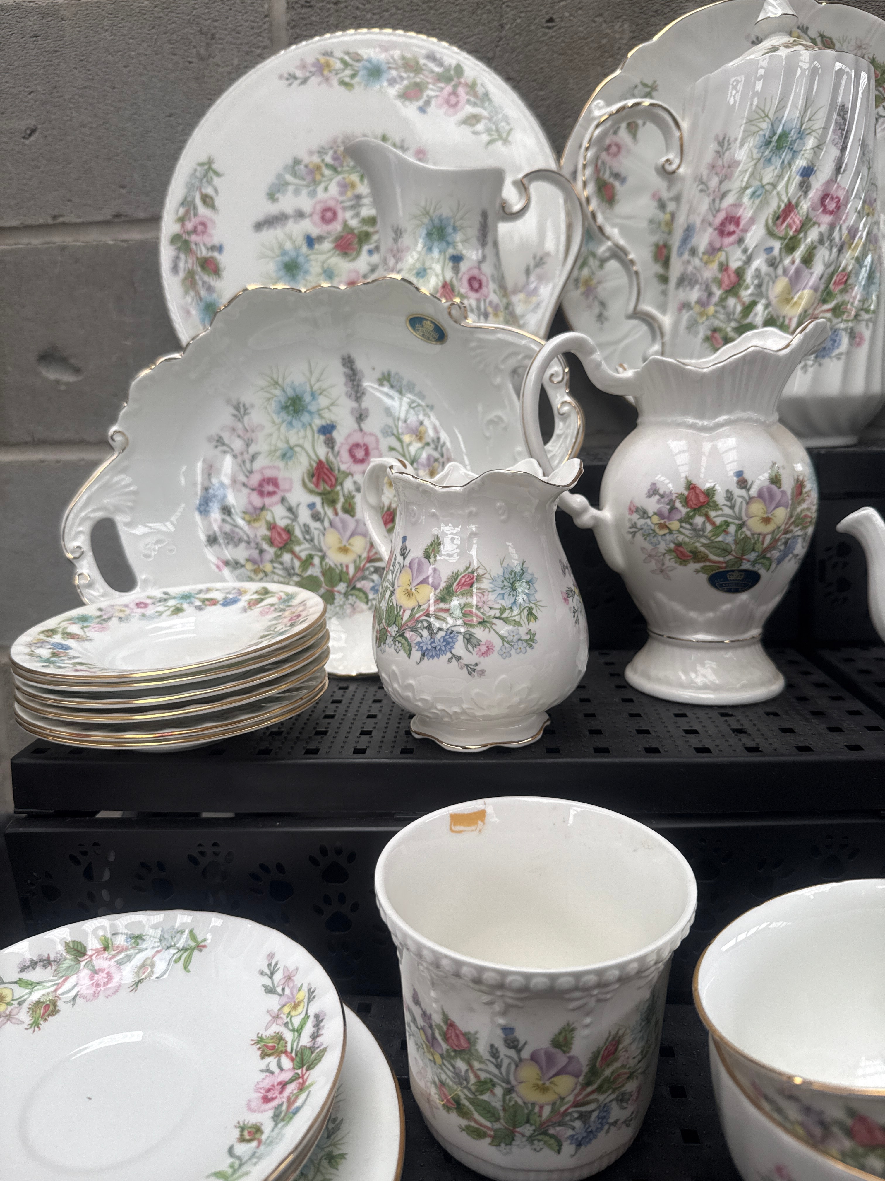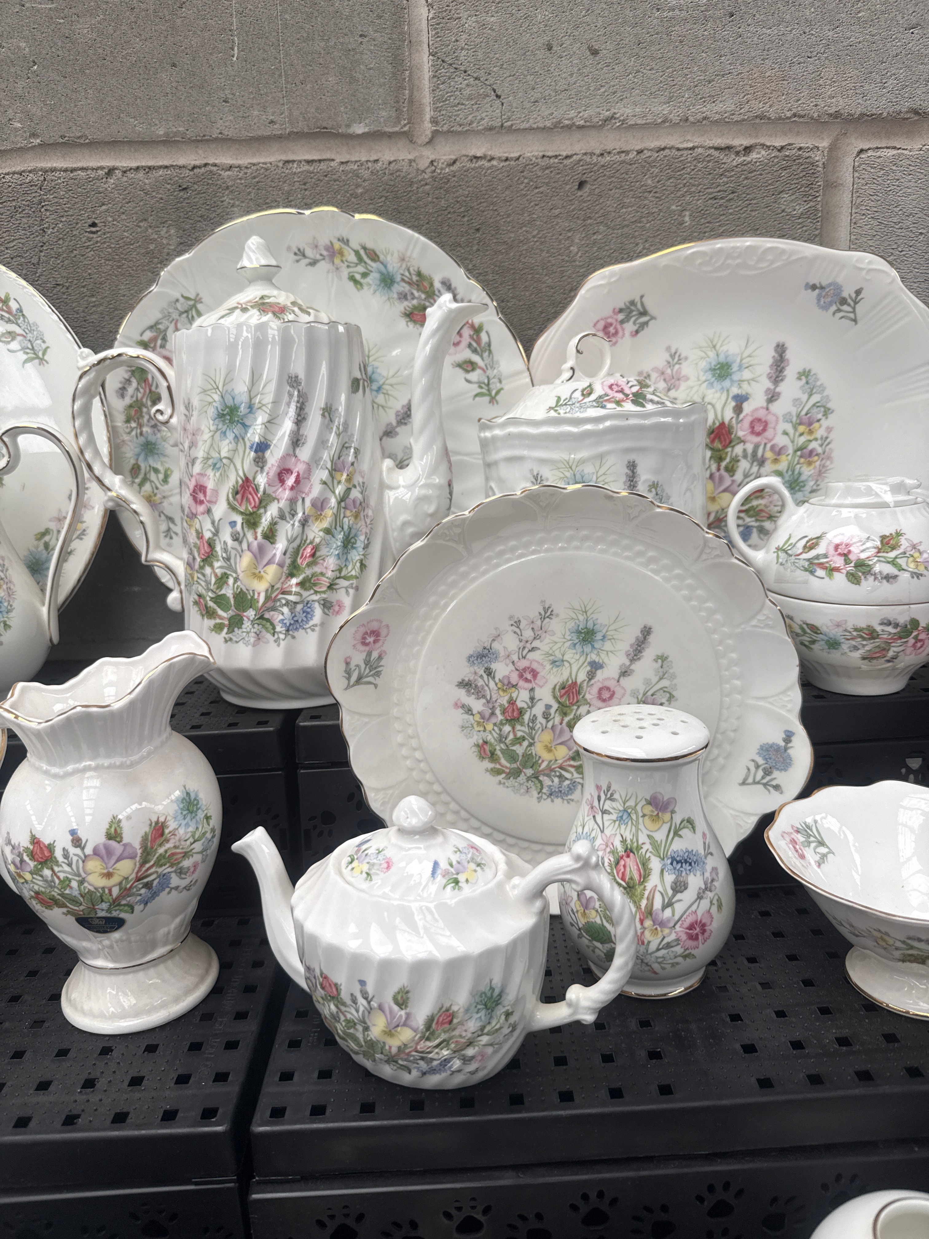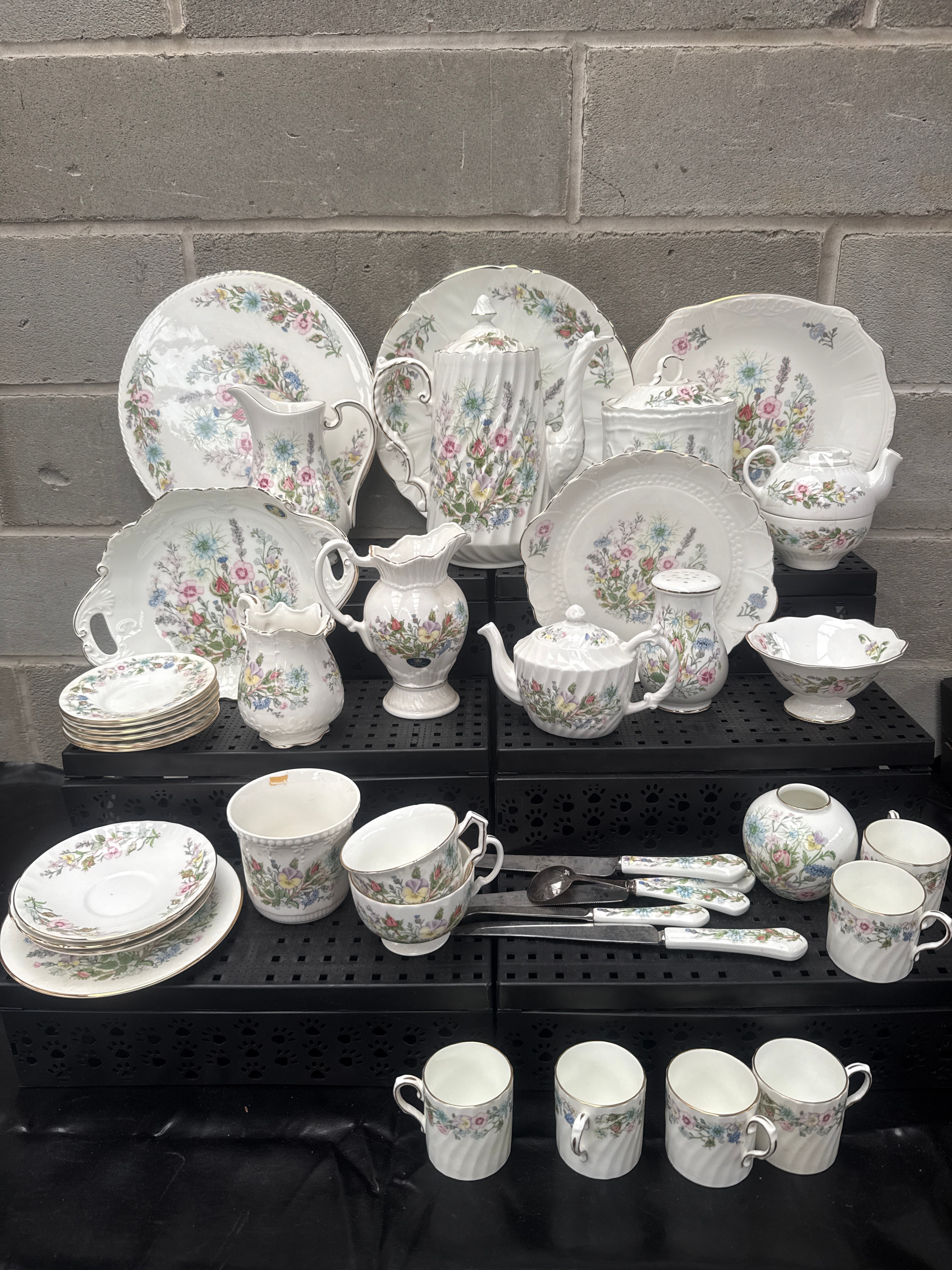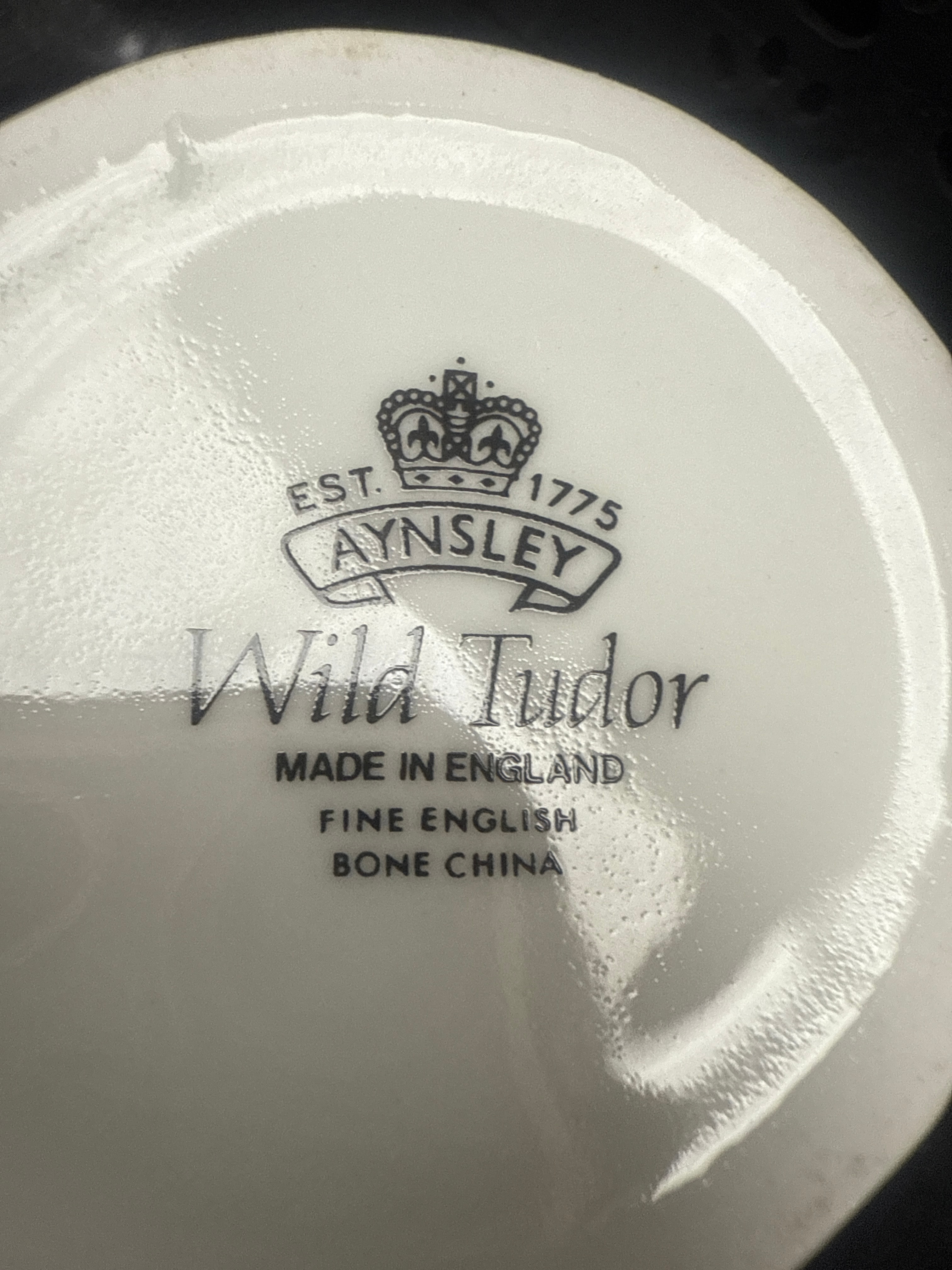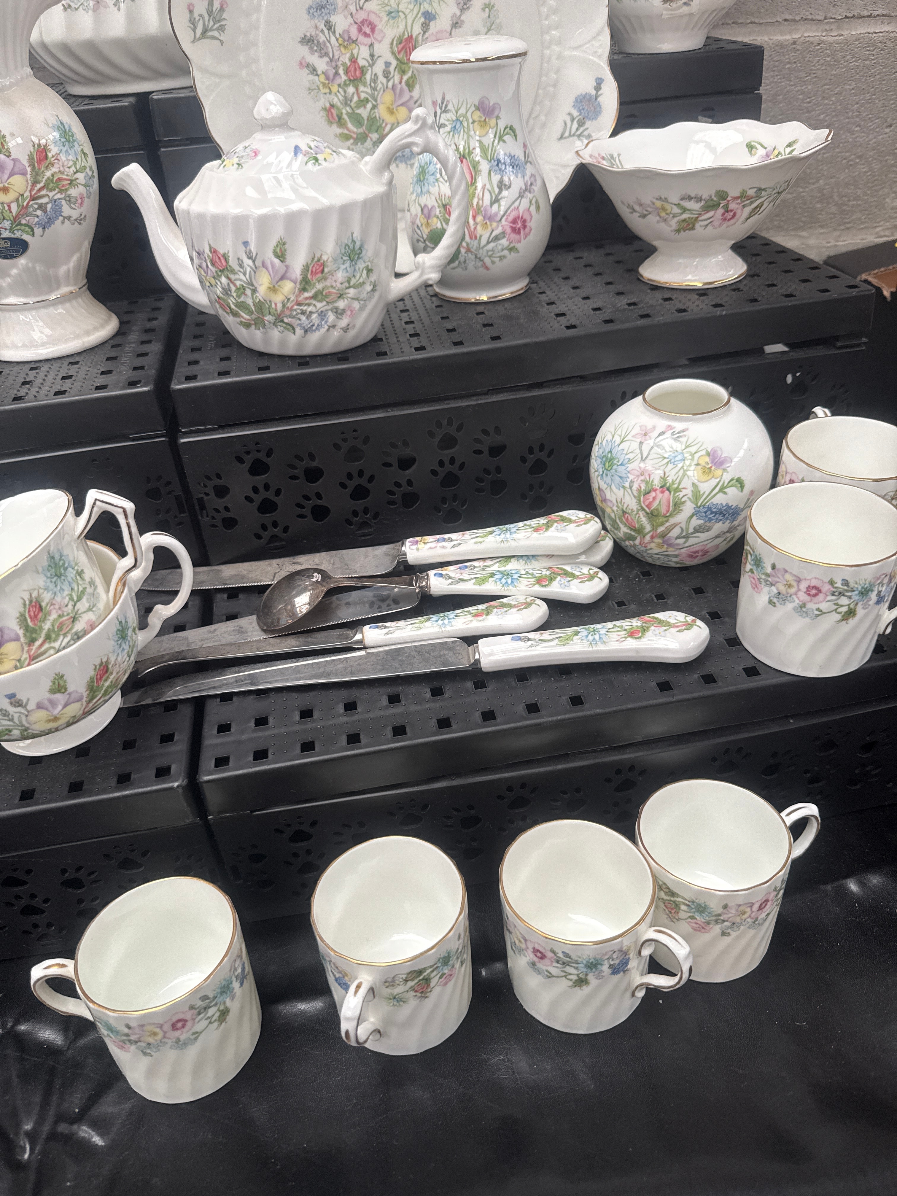 A 39-piece collection of Aynsley ‘Wild Tudor’ Fine English Bone China dinnerware and tea/coffee service, complemented by a set of flatware with matching ceramic handles. Each ceramic item is crafted from white fine English bone china, featuring scalloped edges, gold trim, and a vibrant, multi-color wildflower motif. The collection exhibits a cohesive traditional floral style. A prominent backstamp identifies the manufacturer as Aynsley, established 1775, with the pattern name “Wild Tudor” and indicating “MADE IN ENGLAND.”