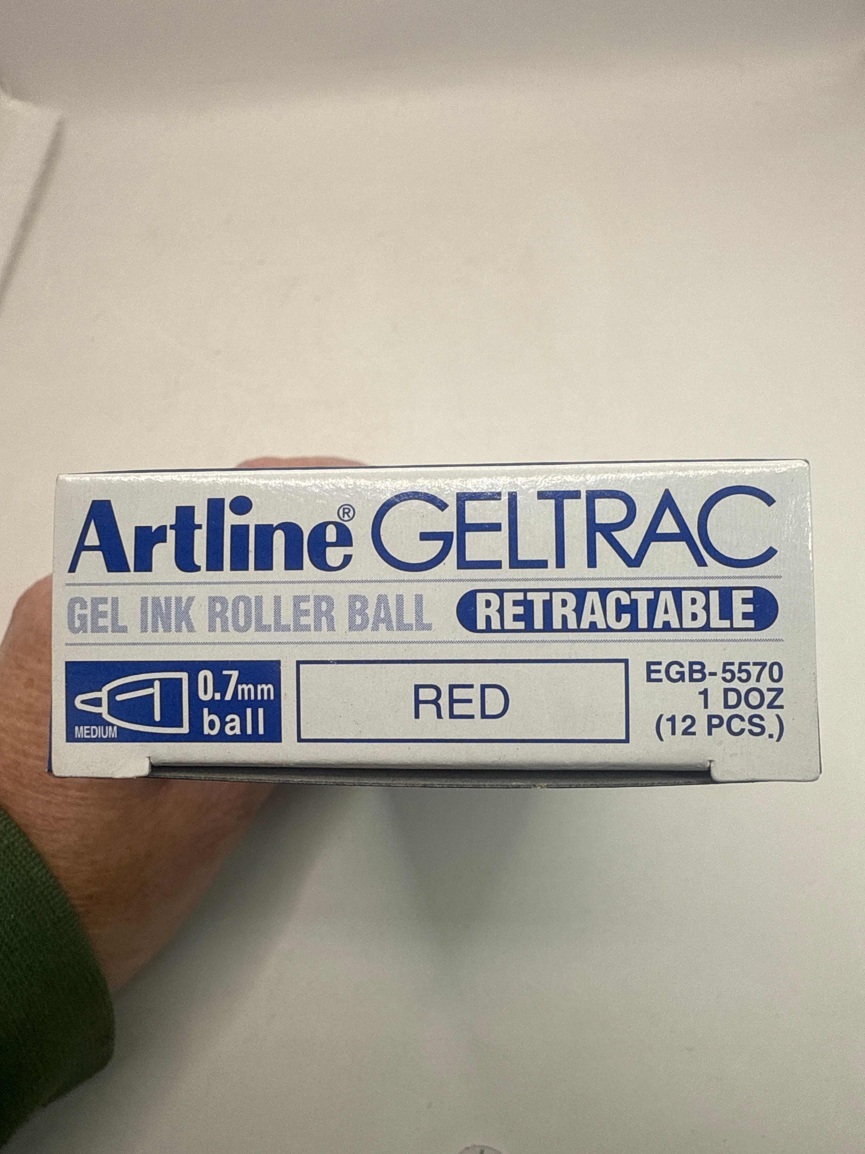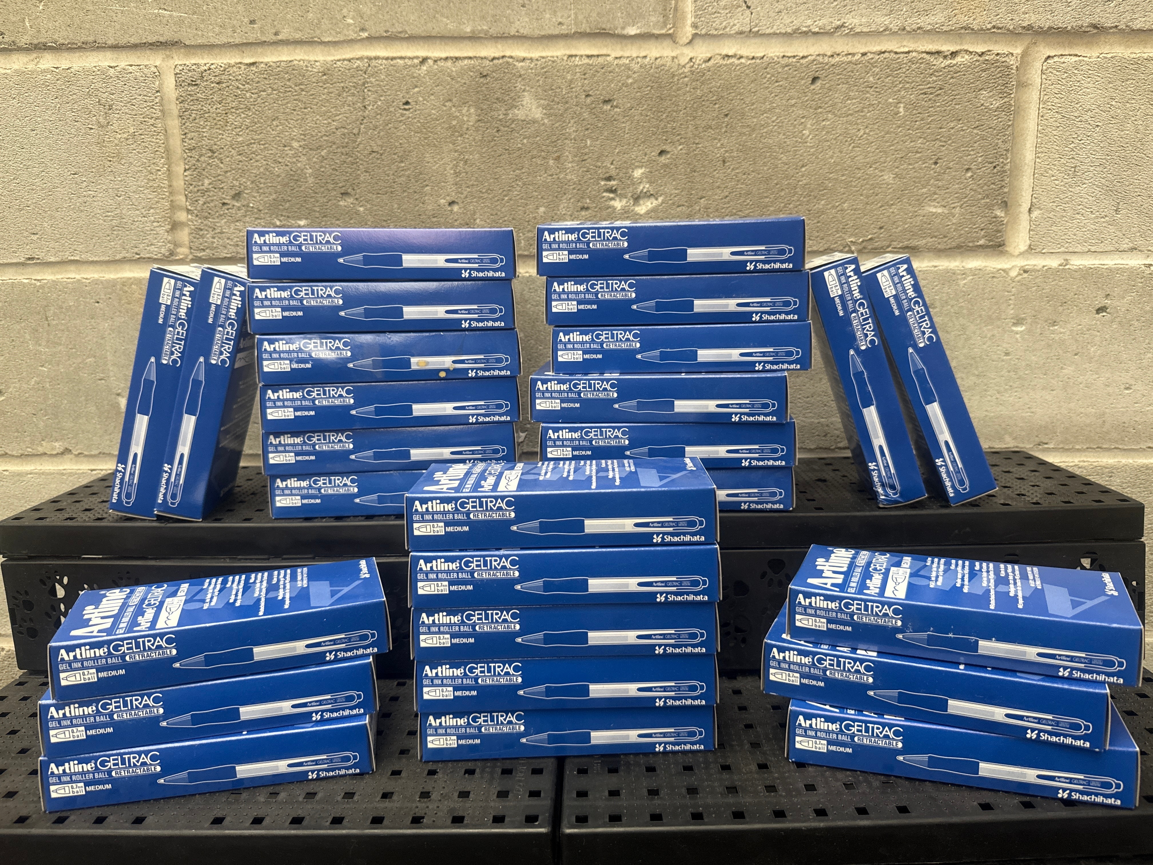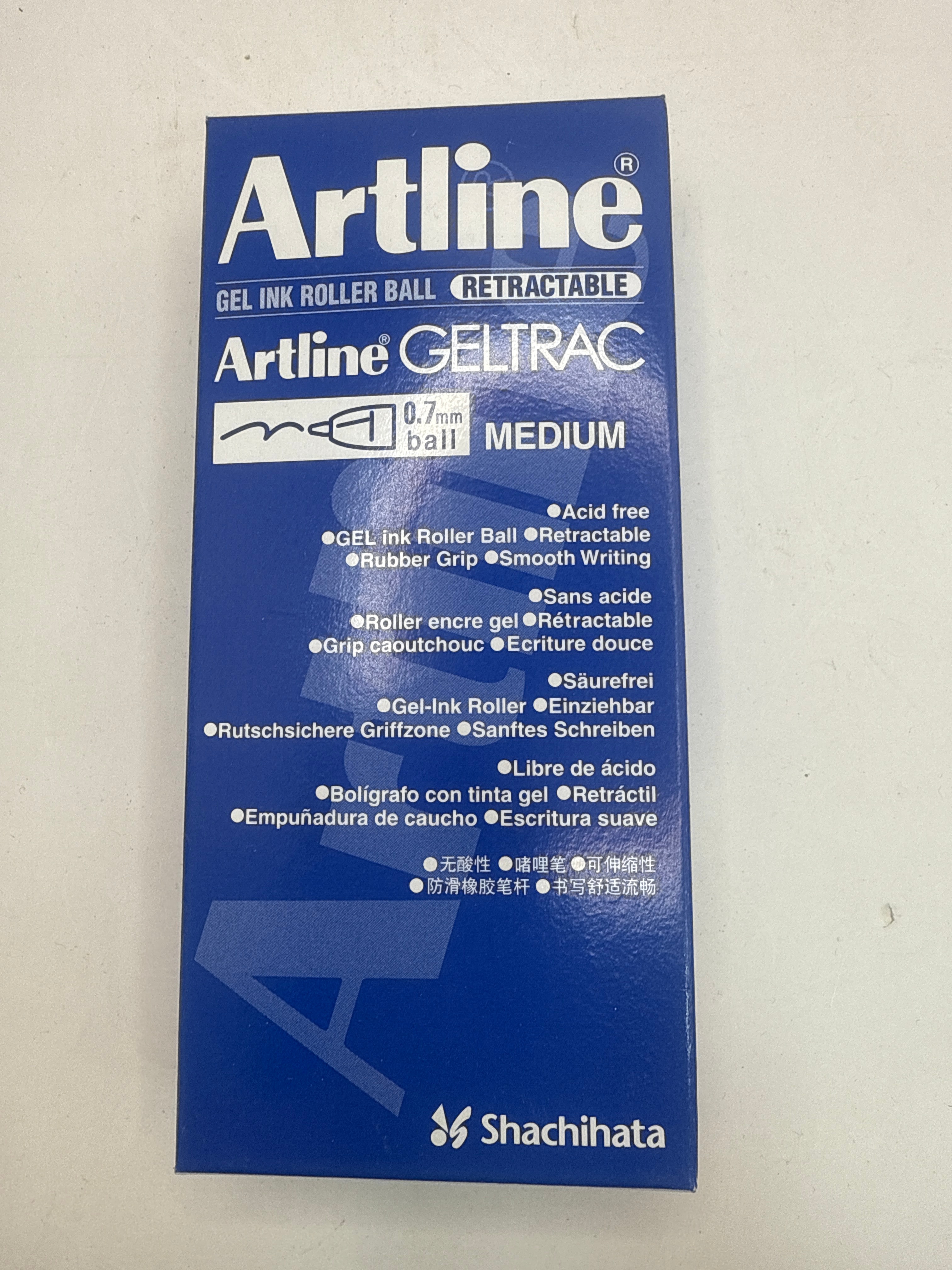 This lot comprises 27 individual Shachihata Artline GELTRAC retractable gel ink rollerball pens. Each pen features a 0.7mm medium ball. The pens are presented in their original cardboard packaging, predominantly blue in color, with most indicating blue ink. One box explicitly states ‘RED’ ink. Each box is marked with the model number EGB-5570 and is designed to contain ‘1 DOZ (12 PCS.)’. The packaging identifies Shachihata as the manufacturer and includes multilingual feature descriptions such as ‘Acid free,’ ‘Rubber Grip,’ and ‘Smooth Writing’ in English, French, German, Spanish, and Chinese.