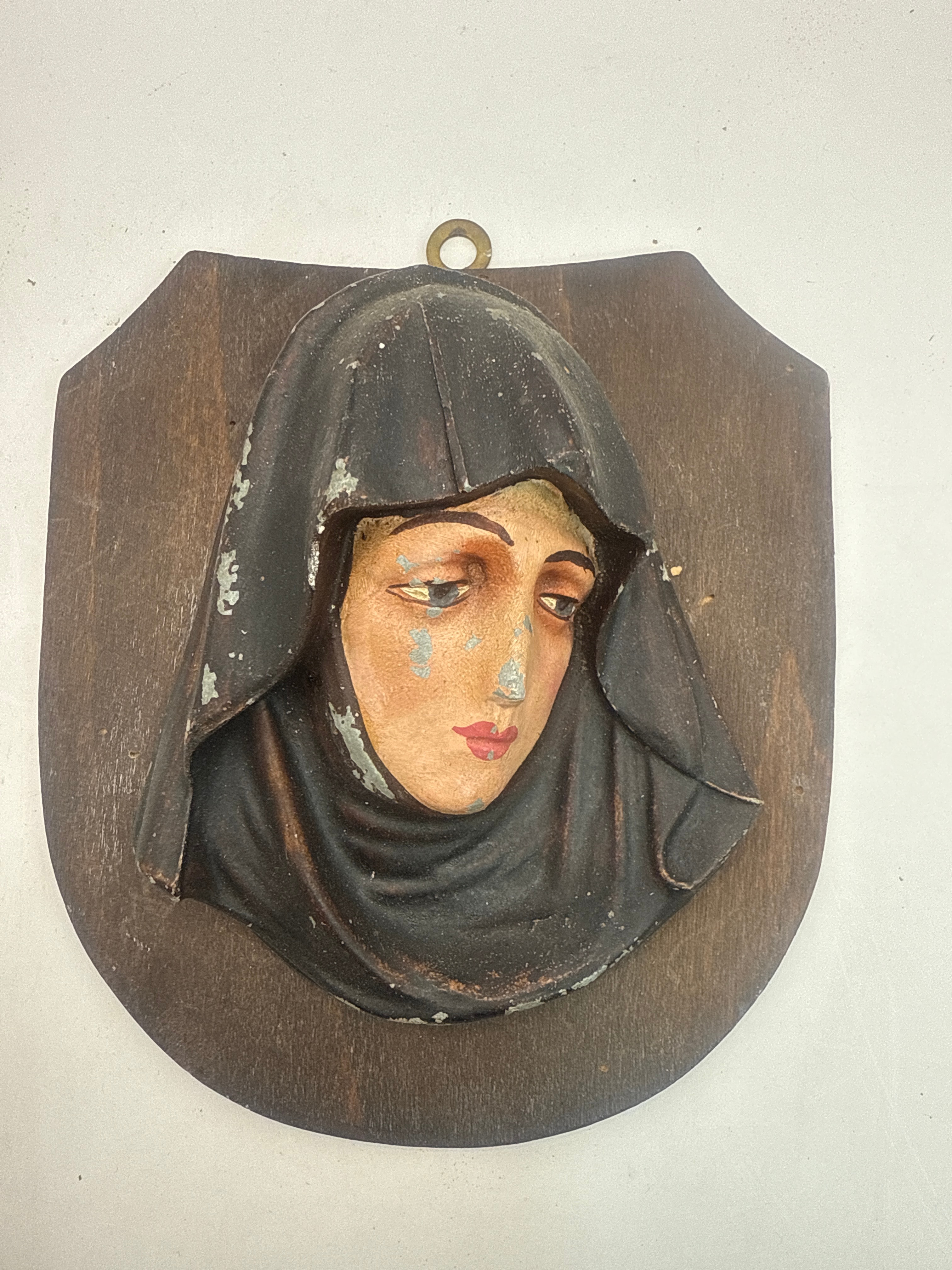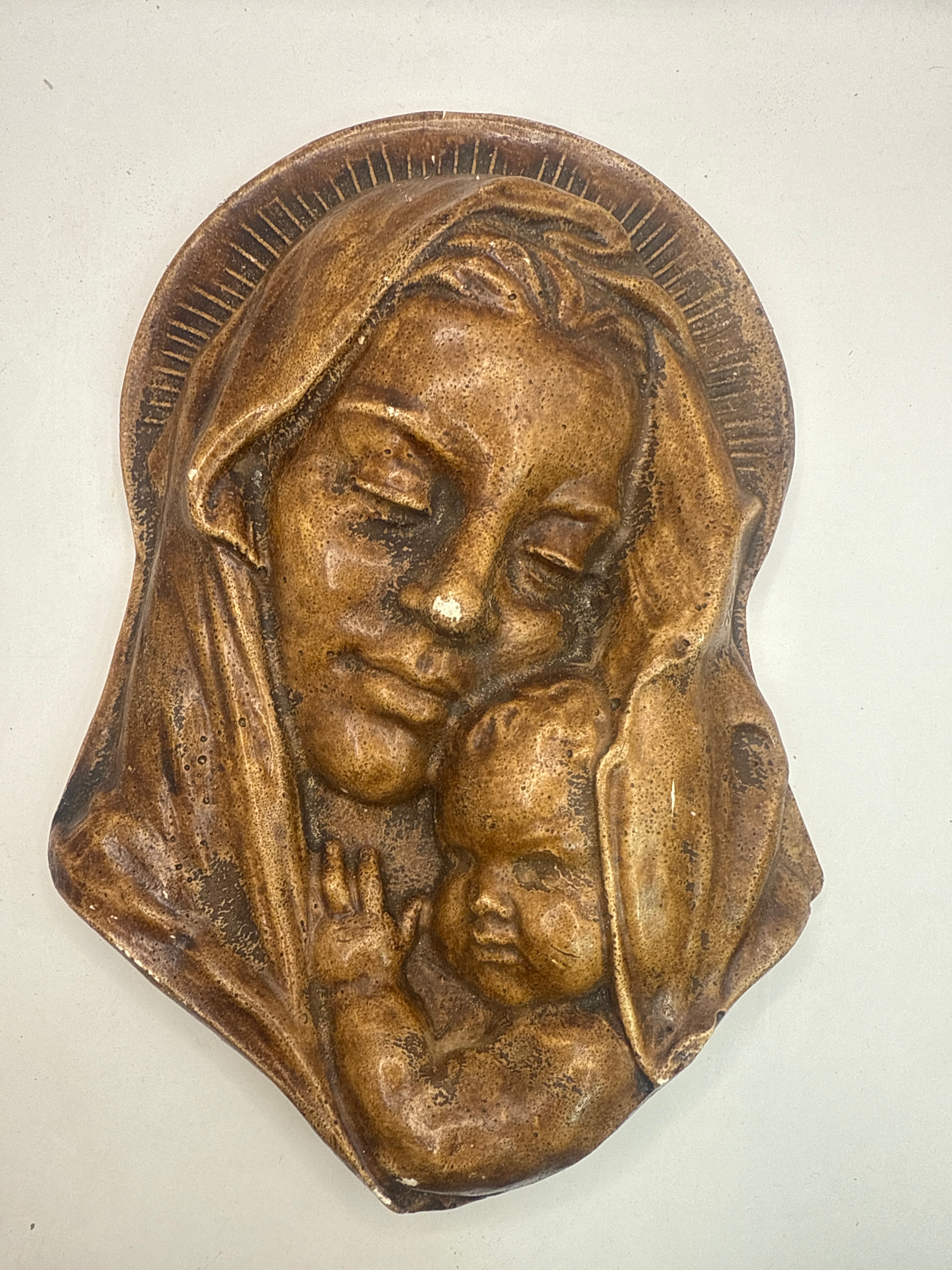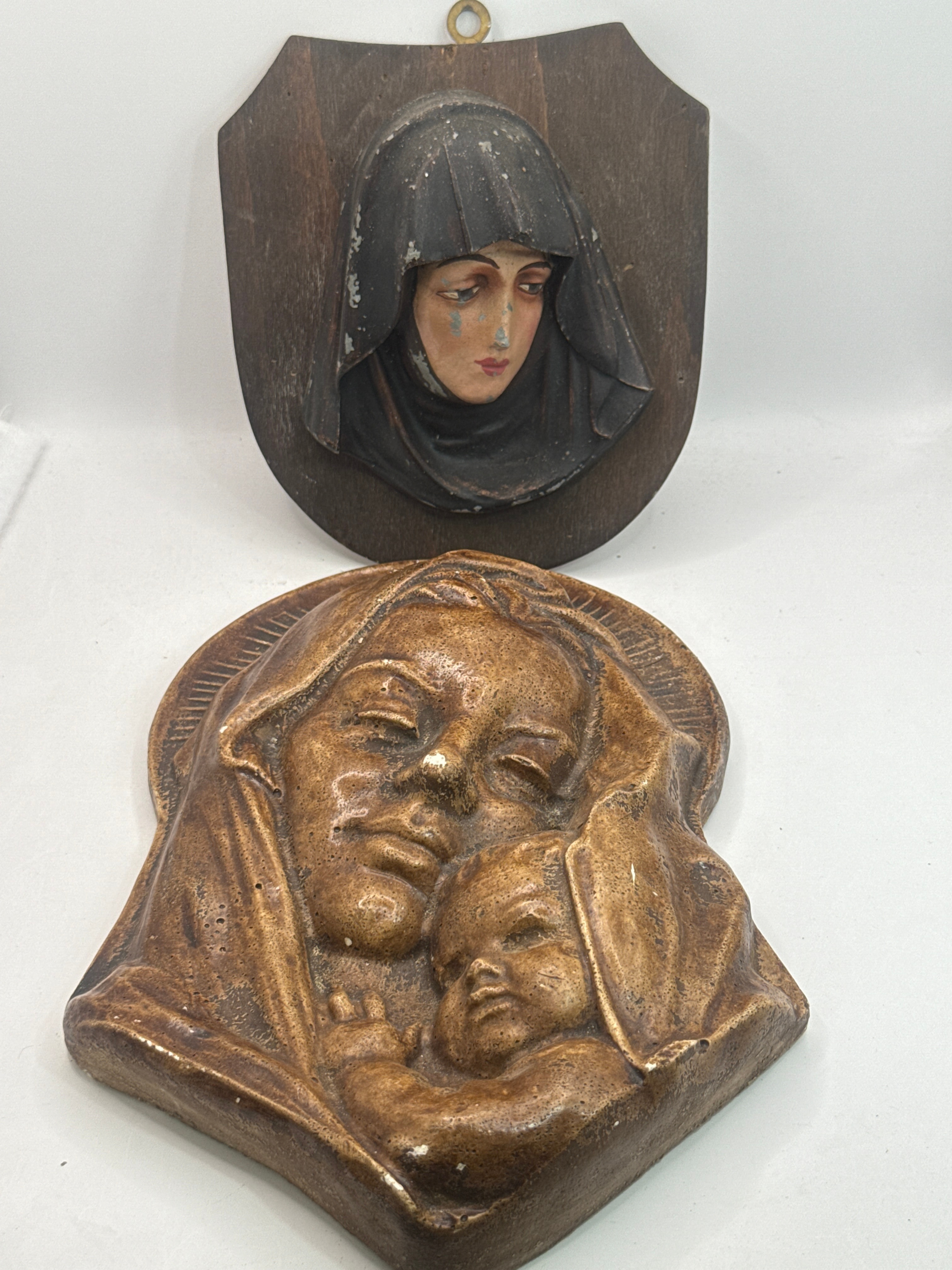 This lot comprises two vintage religious wall plaques. The upper item features a polychrome sculpted bust, likely plaster or composition, depicting a sorrowful veiled woman (Mater Dolorosa), mounted on a shield-shaped wooden plaque with a brass hanging loop. The lower item is a cast relief, likely plaster or composite, portraying the Madonna and Child in a tender embrace, finished with a bronzed or metallic effect.