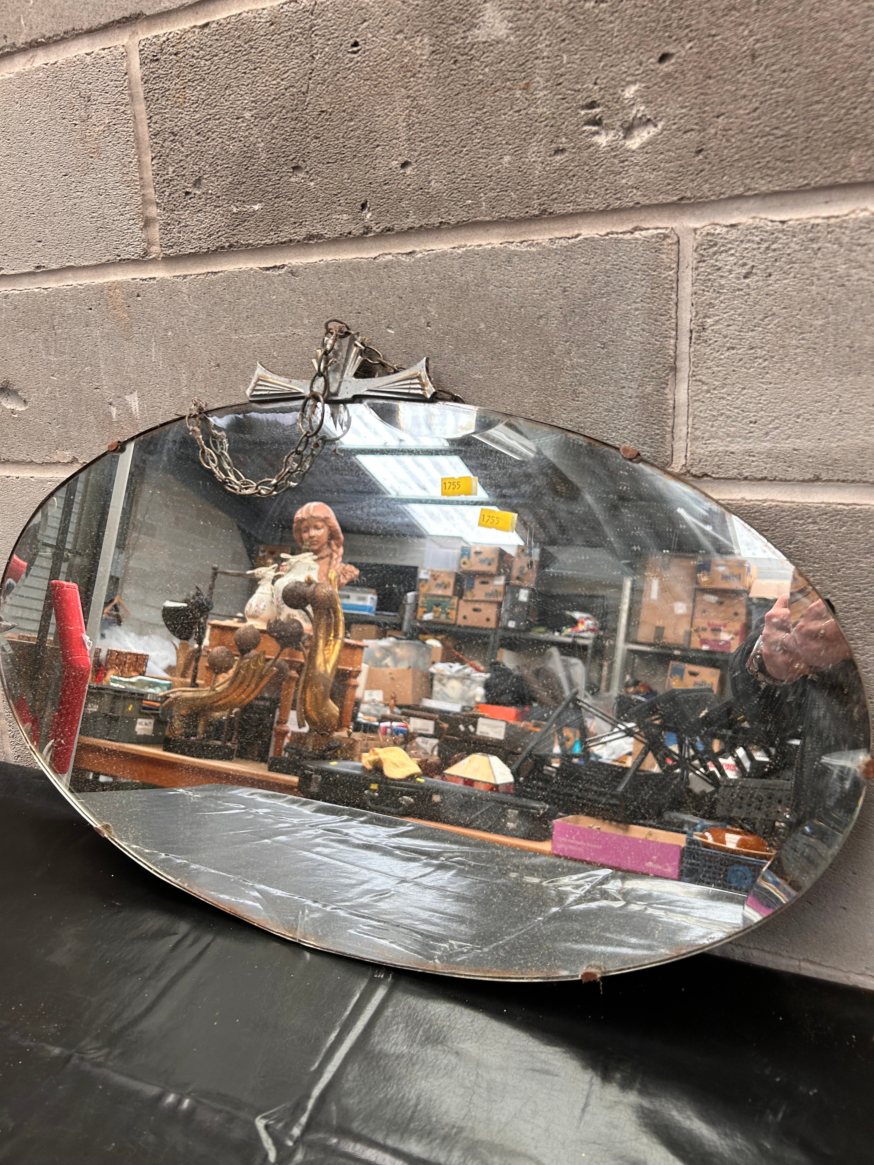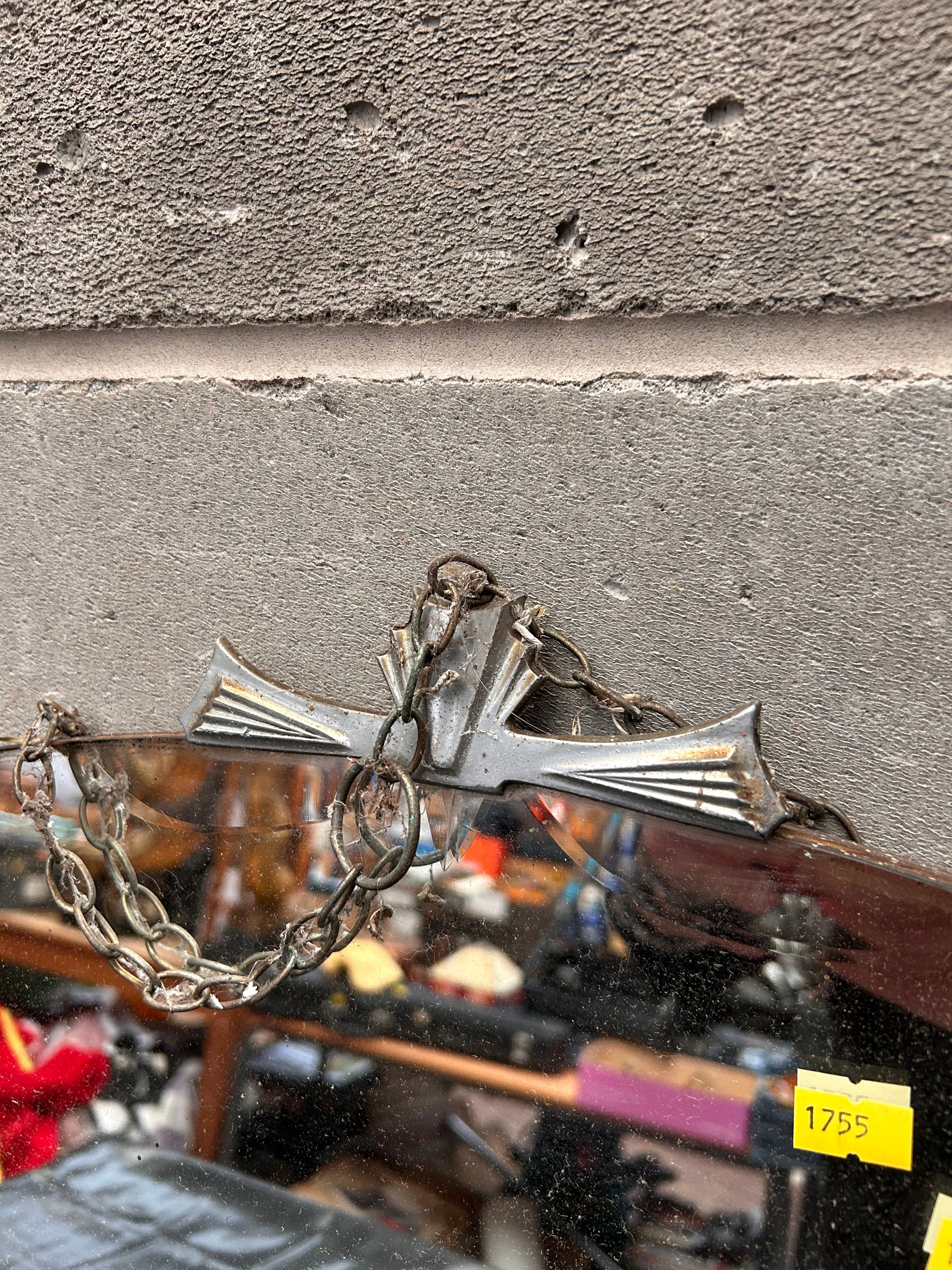 A Gio Ponti Style Mid-Century Modern Italian Oval Wall Mirror. This oval wall mirror features a stylized geometric metal hanger with a metal chain, suggestive of an Art Deco or mid-20th century aesthetic. A yellow sticker bearing the number “1755” is attached to the lower right corner of the glass.